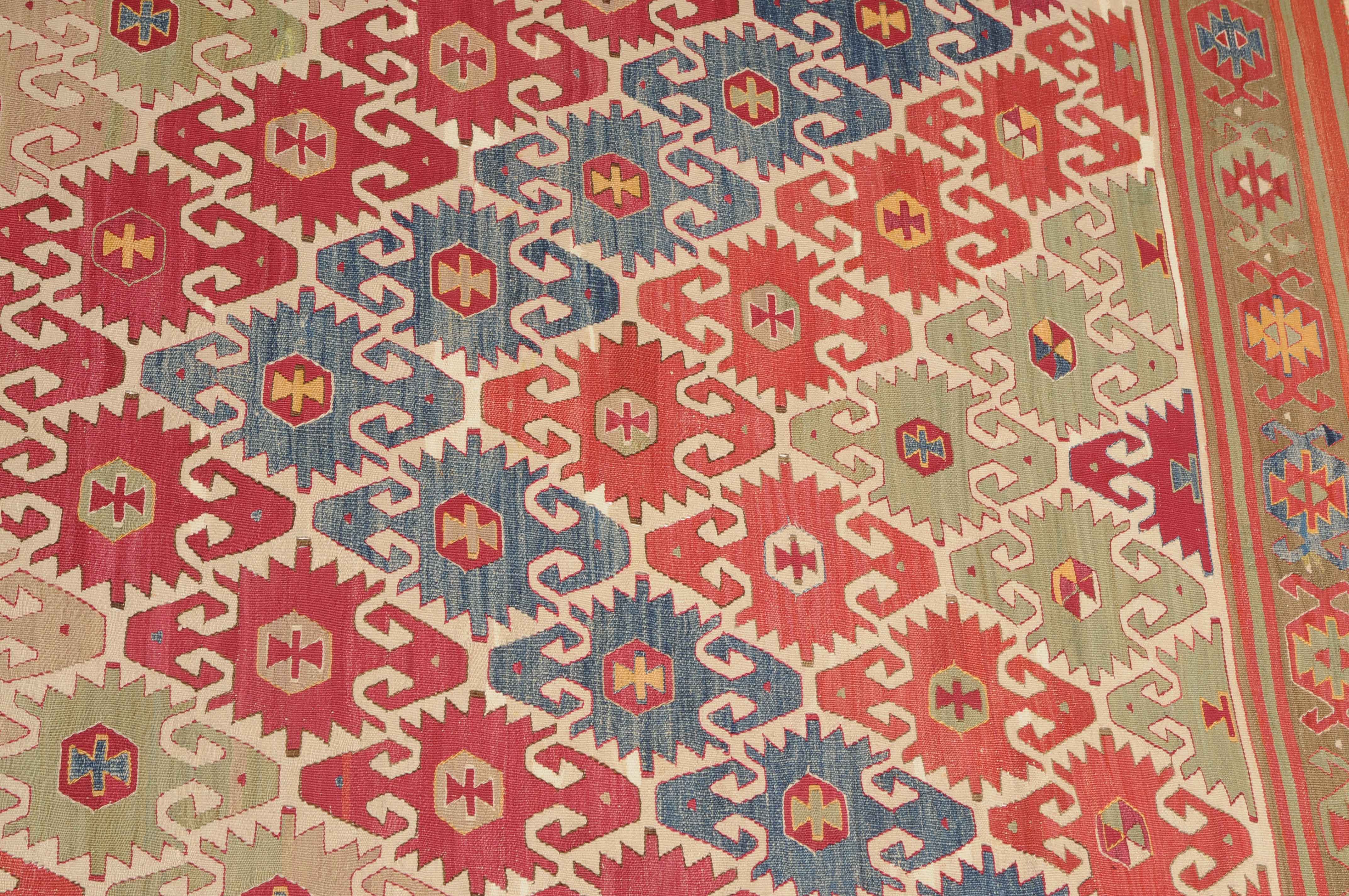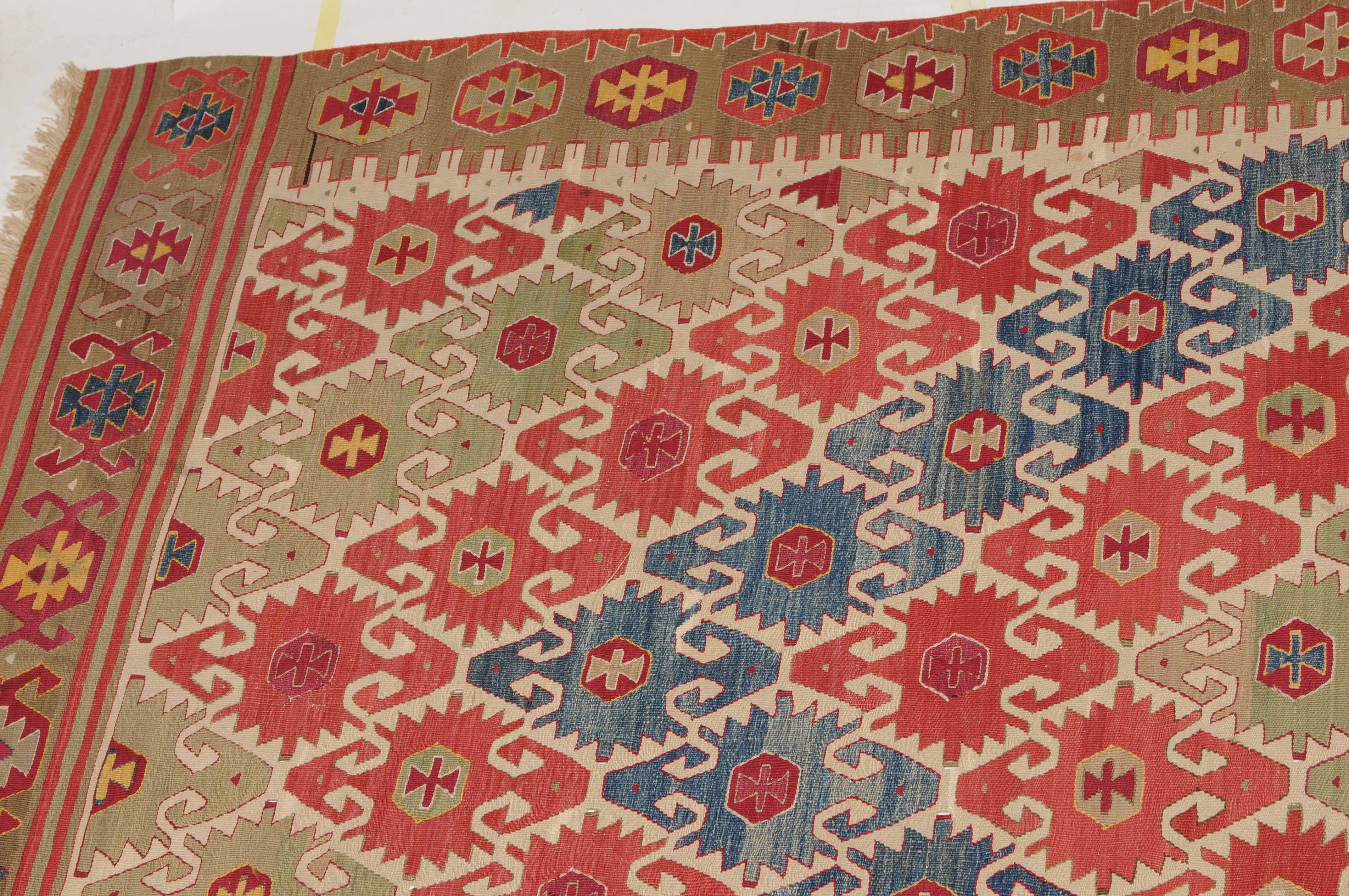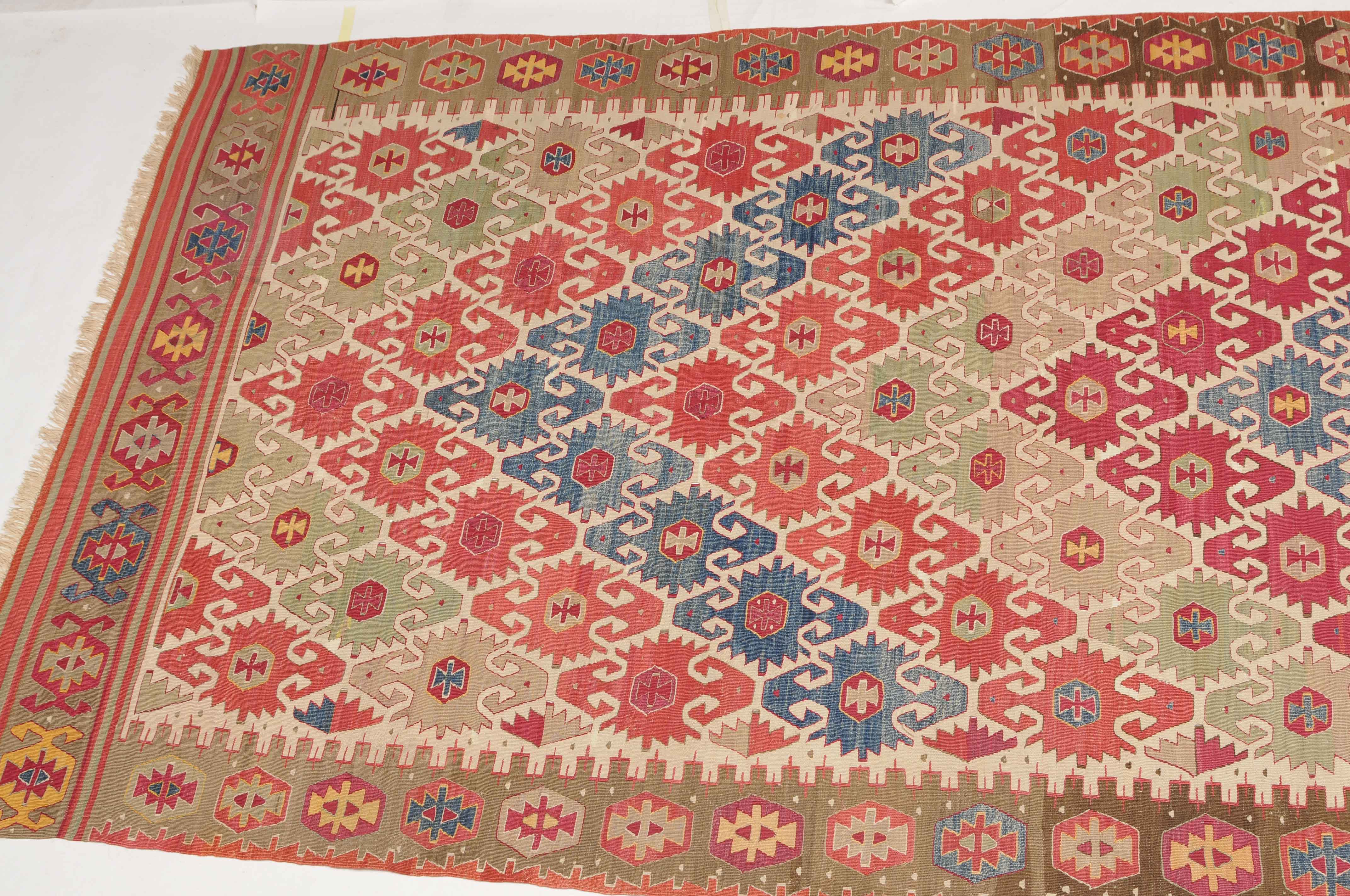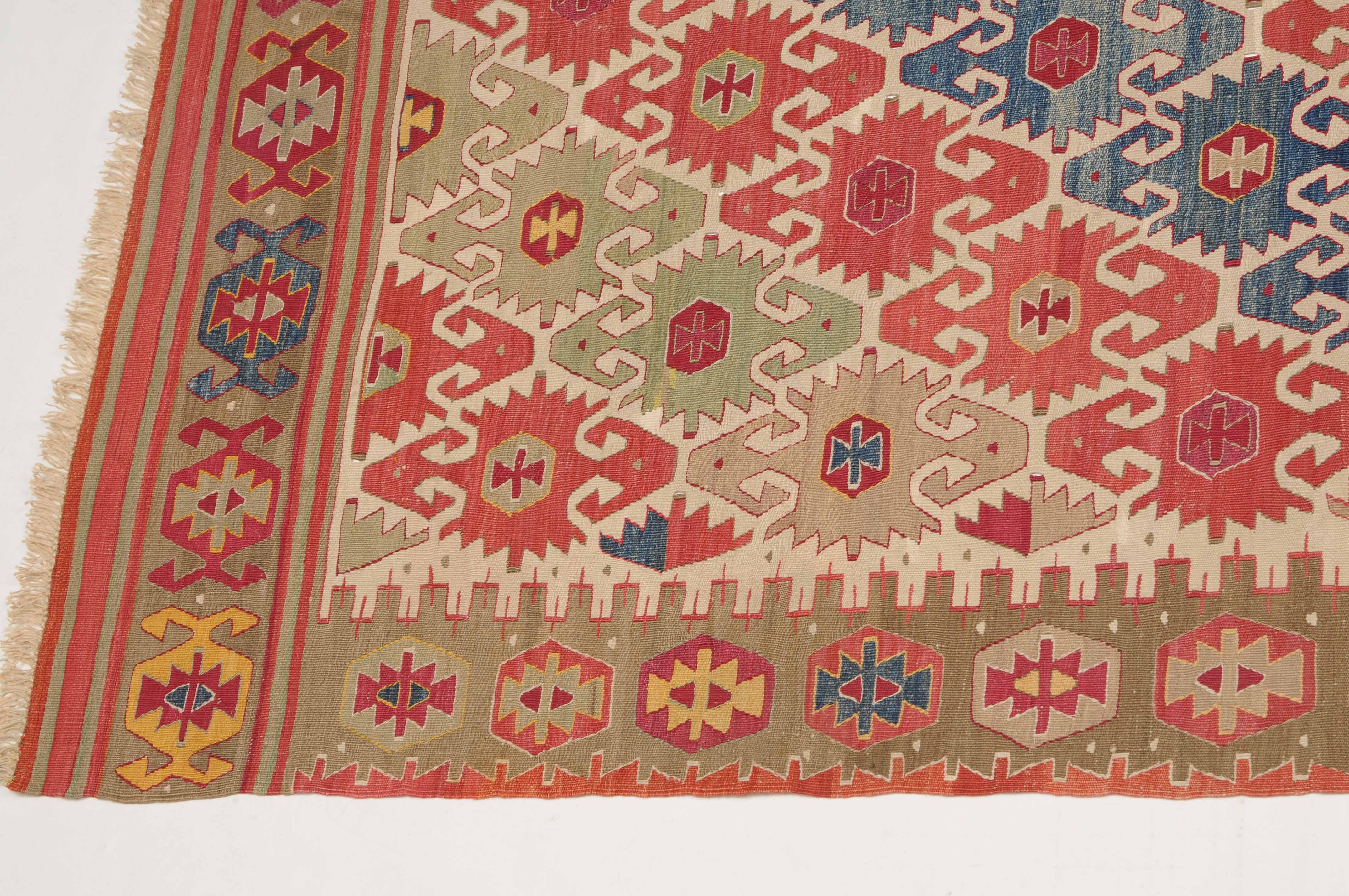 NW-Türkei, um 1910. Das weisse Mittelfeld ist mit spitzförmig angeordneten alternierenden Pfeilornamenten durchgehend verziert. Breite Hexagone belegen dekorativ die braune Hauptbordüre. Sehr gute Erhaltung. 163x285 cm (ft. 5.4x9.4).