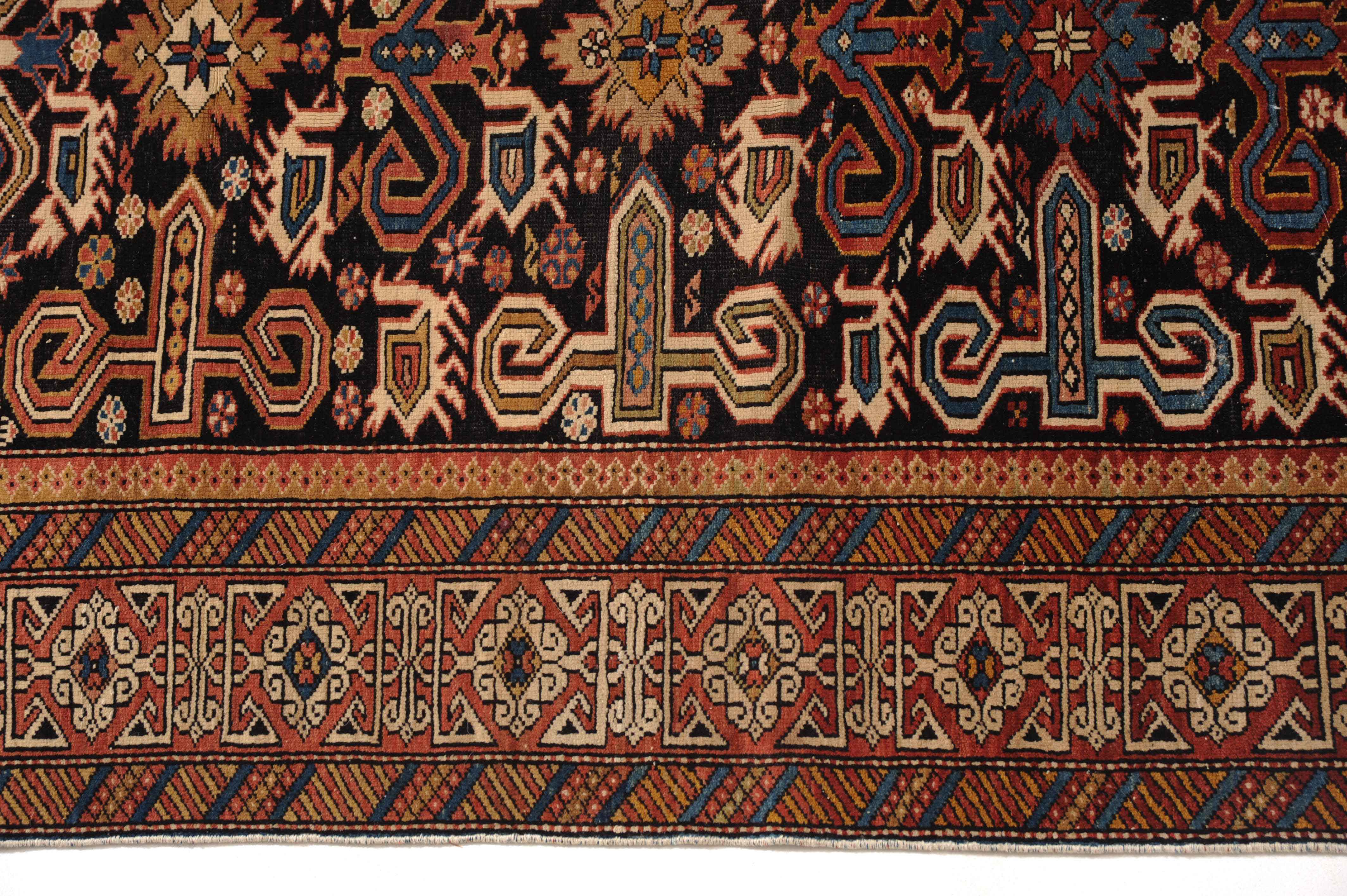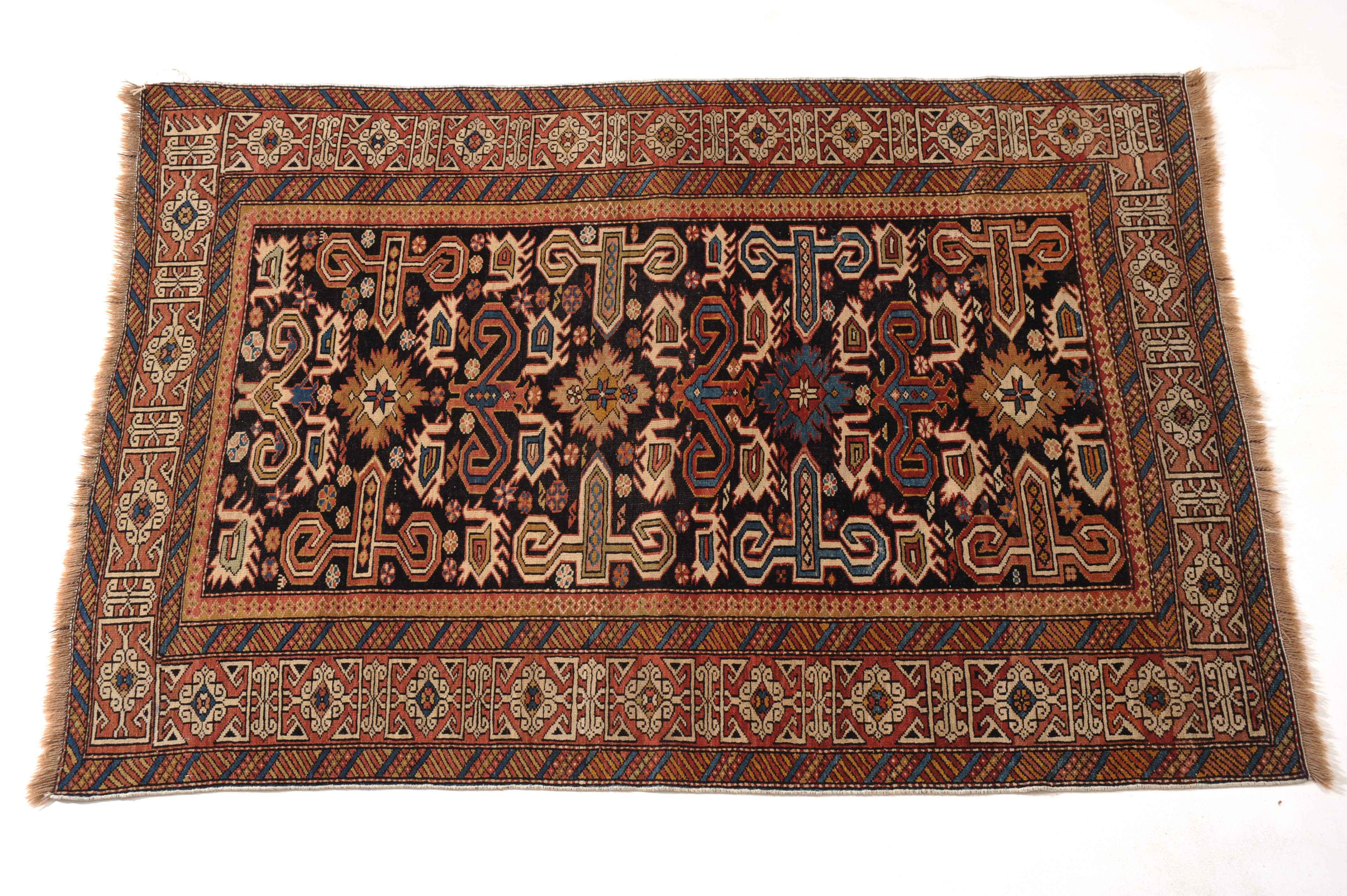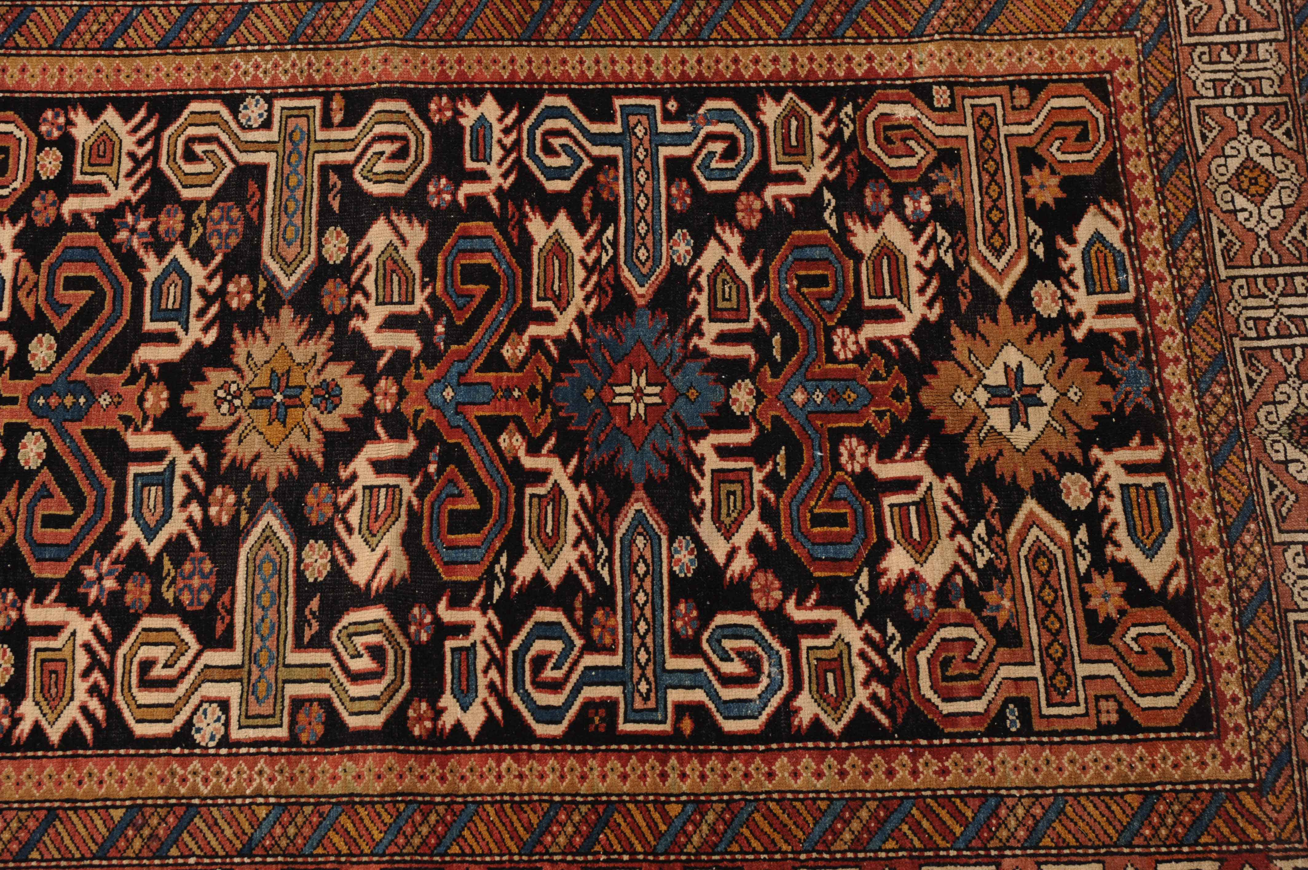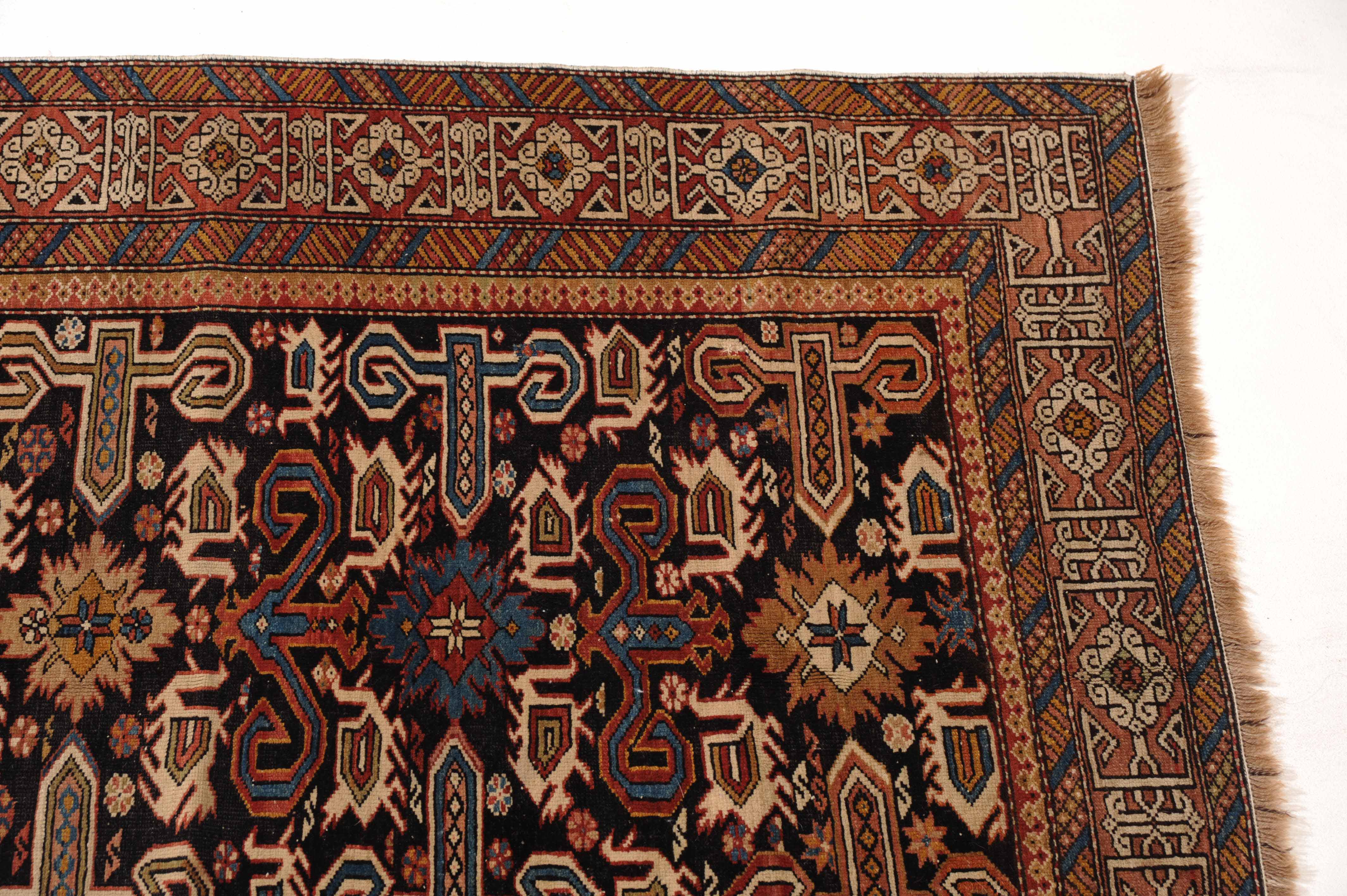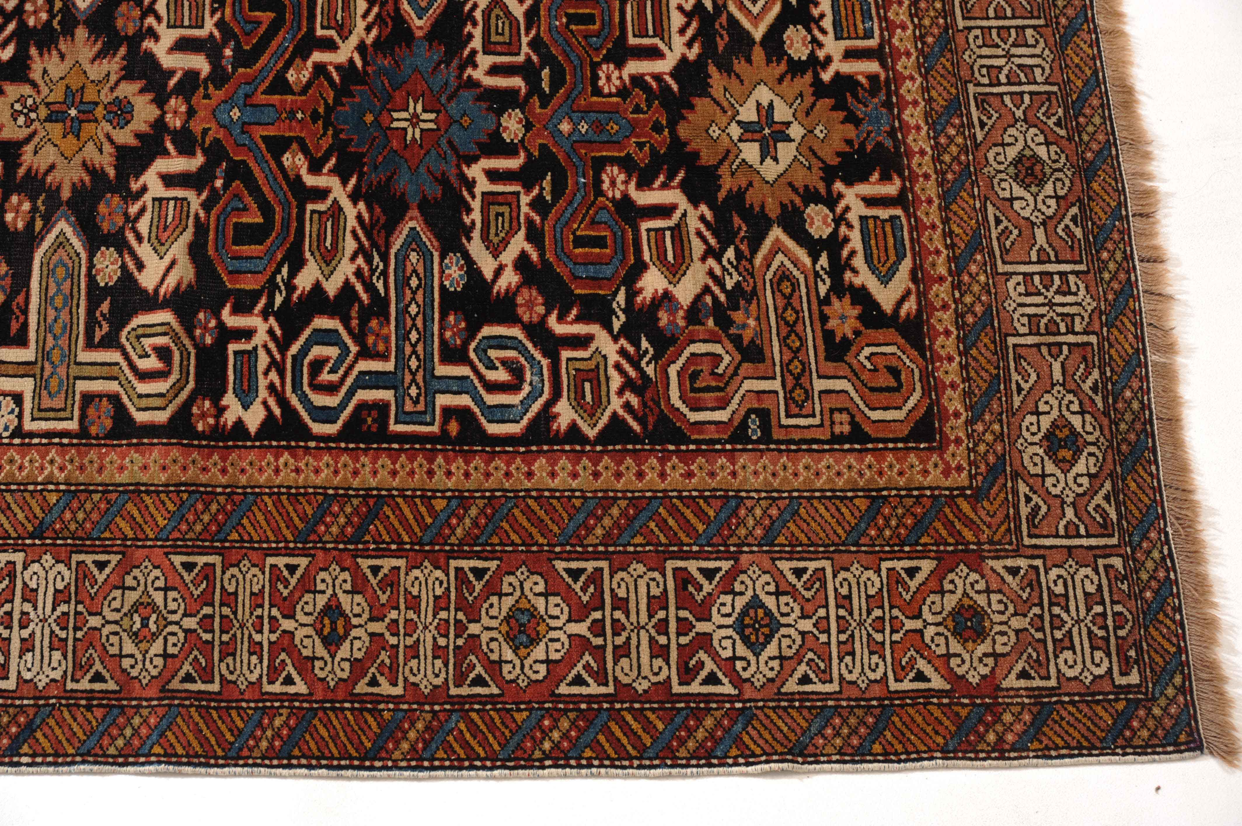 N-Kaukasus, um 1910. Auf nachtblauem Grund figuriert eine typische Prepedil-Vogel-Musterung, flankiert von dekorativ angelegten Blüten und Vögeln. Die rote charakteristische Konagend-Bordüre wird von 2 Streifen-Nebenbordüren in alternierenden Farben umfasst. Gebrauchsspuren. 106x150 cm (ft. 3.5x5).