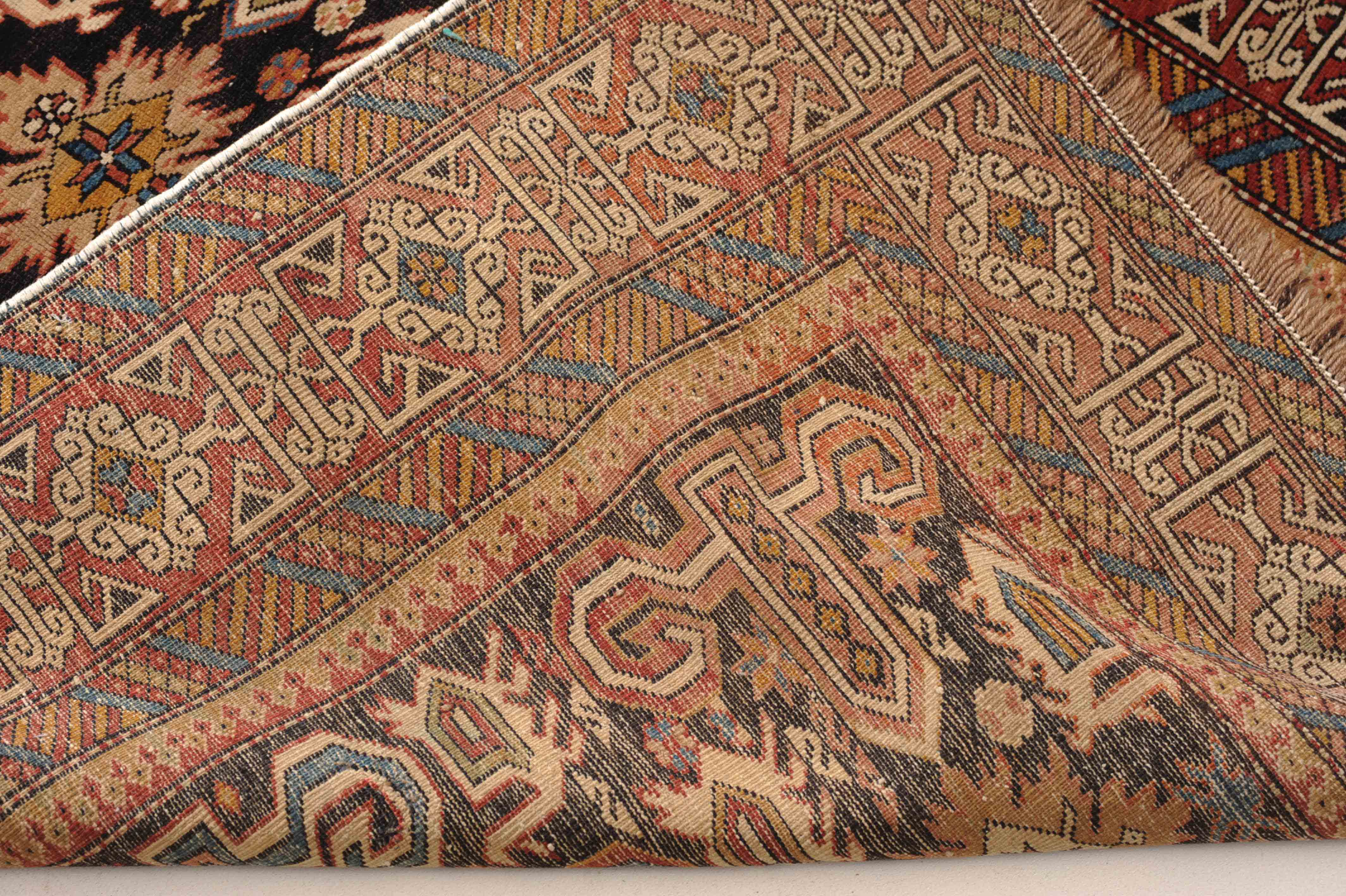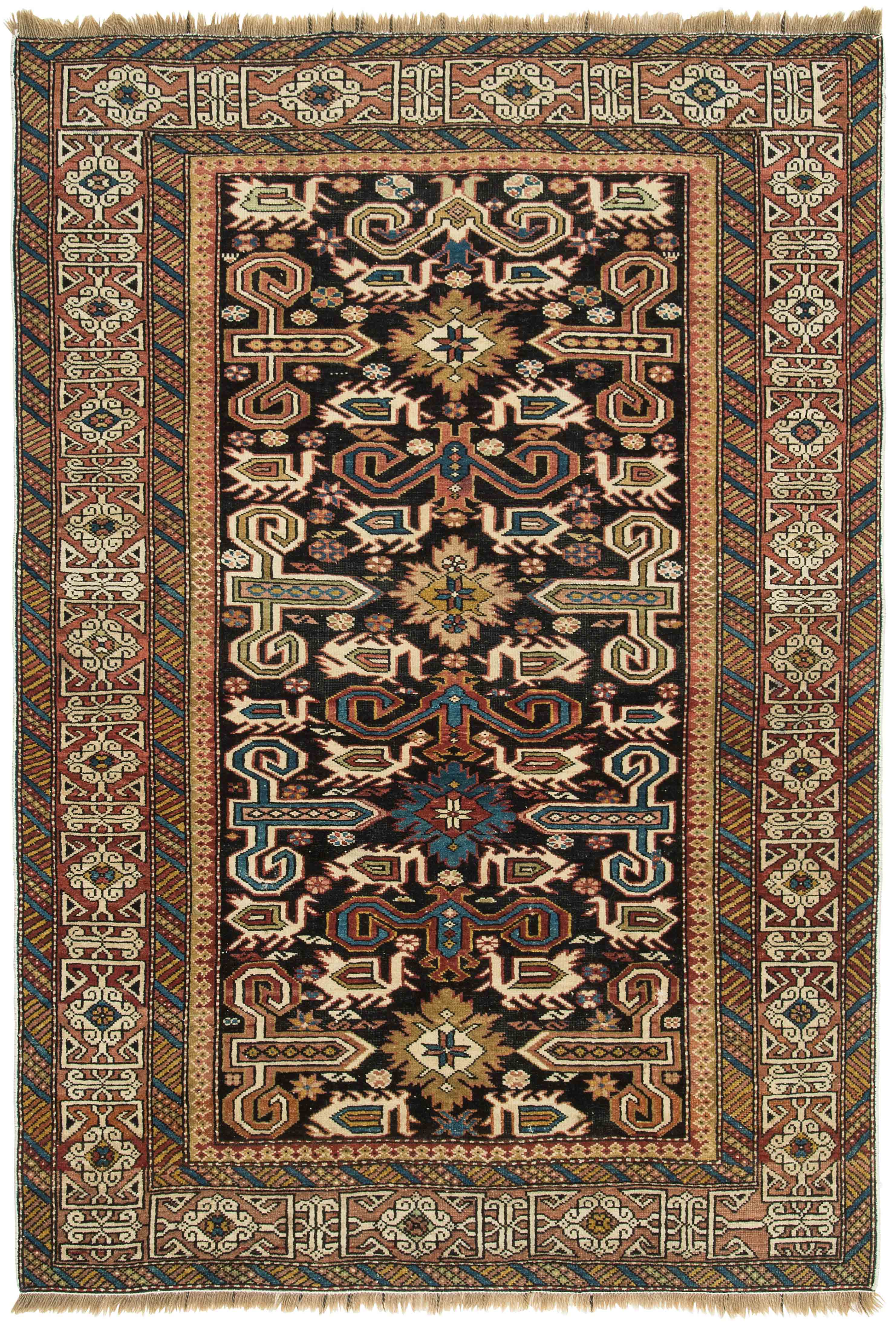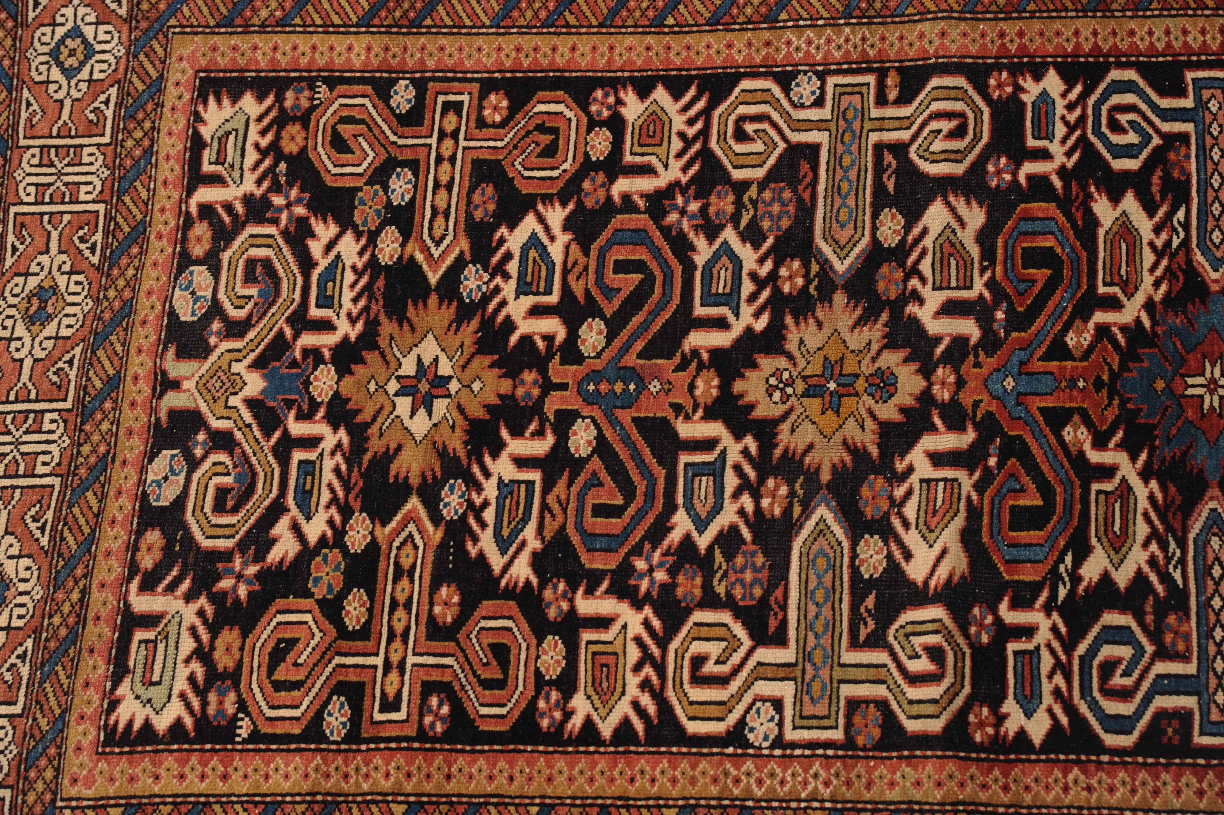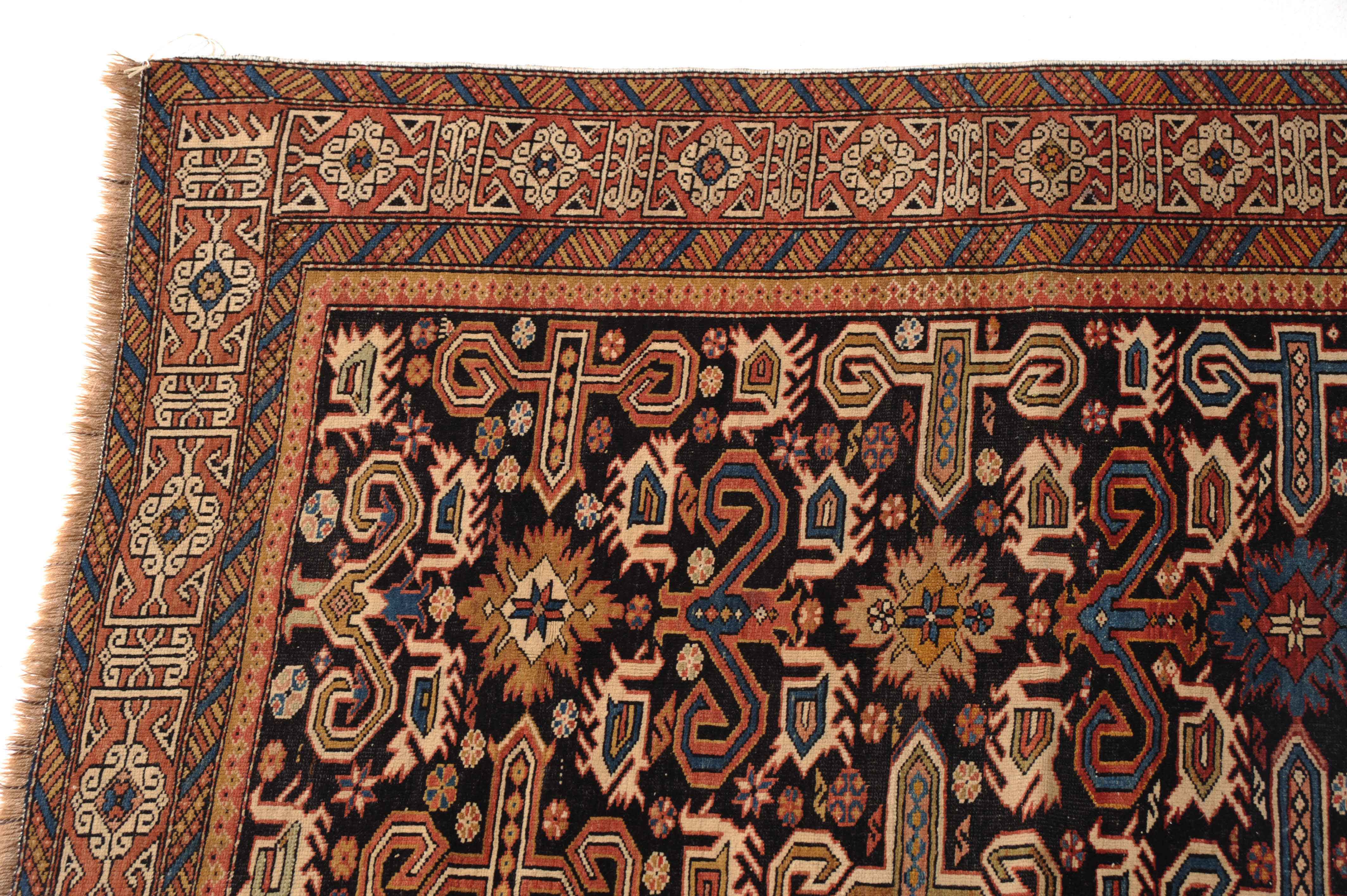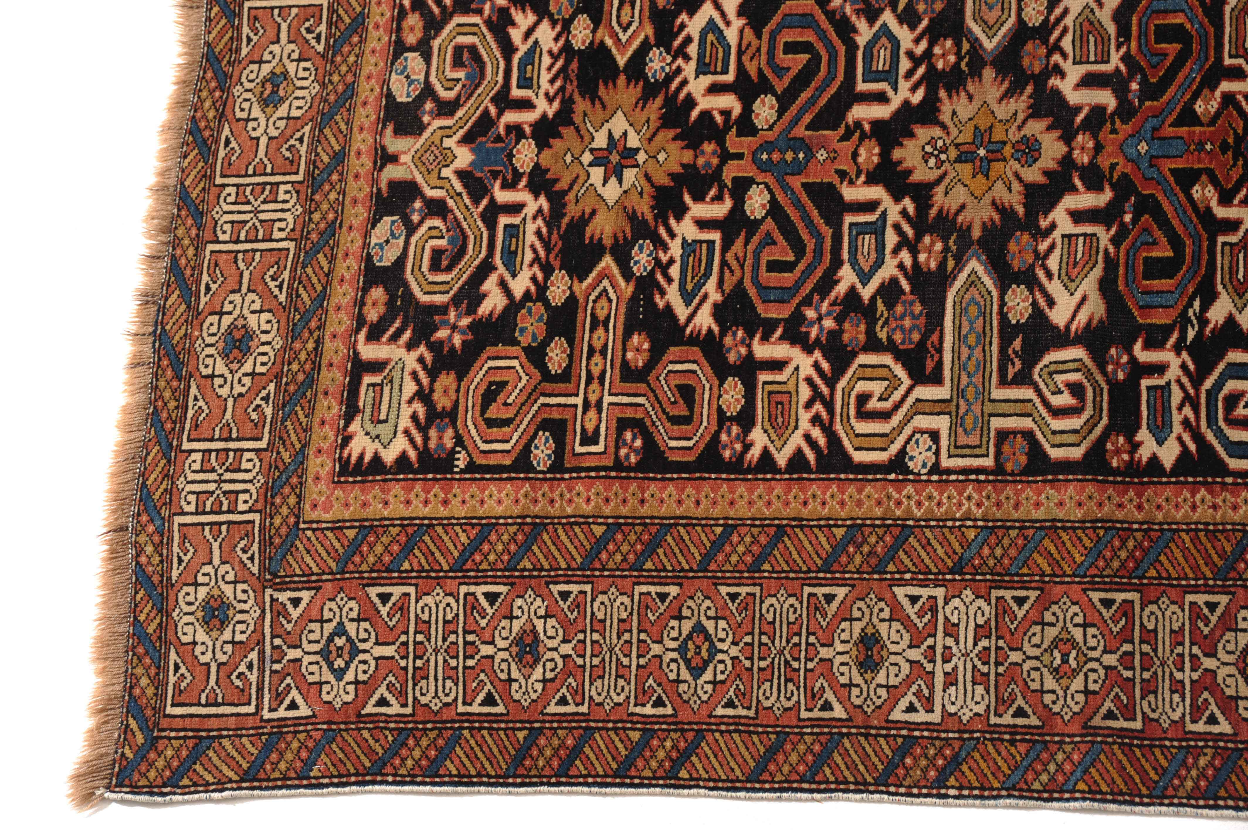 N-Kaukasus, um 1910. Auf nachtblauem Grund figuriert eine typische Prepedil-Vogel-Musterung, flankiert von dekorativ angelegten Blüten und Vögeln. Die rote charakteristische Konagend-Bordüre wird von 2 Streifen-Nebenbordüren in alternierenden Farben umfasst. Gebrauchsspuren. 106x150 cm (ft. 3.5x5).