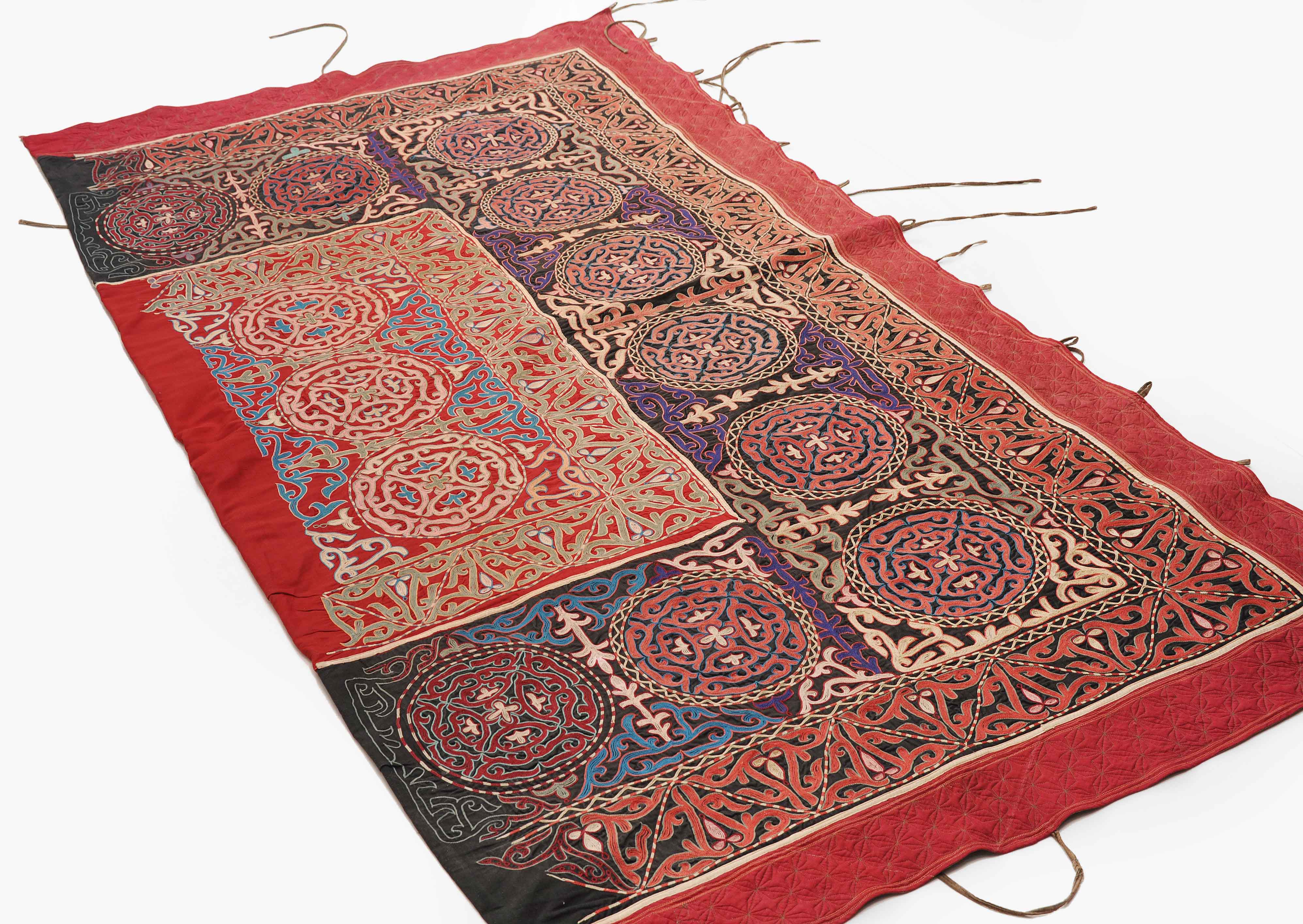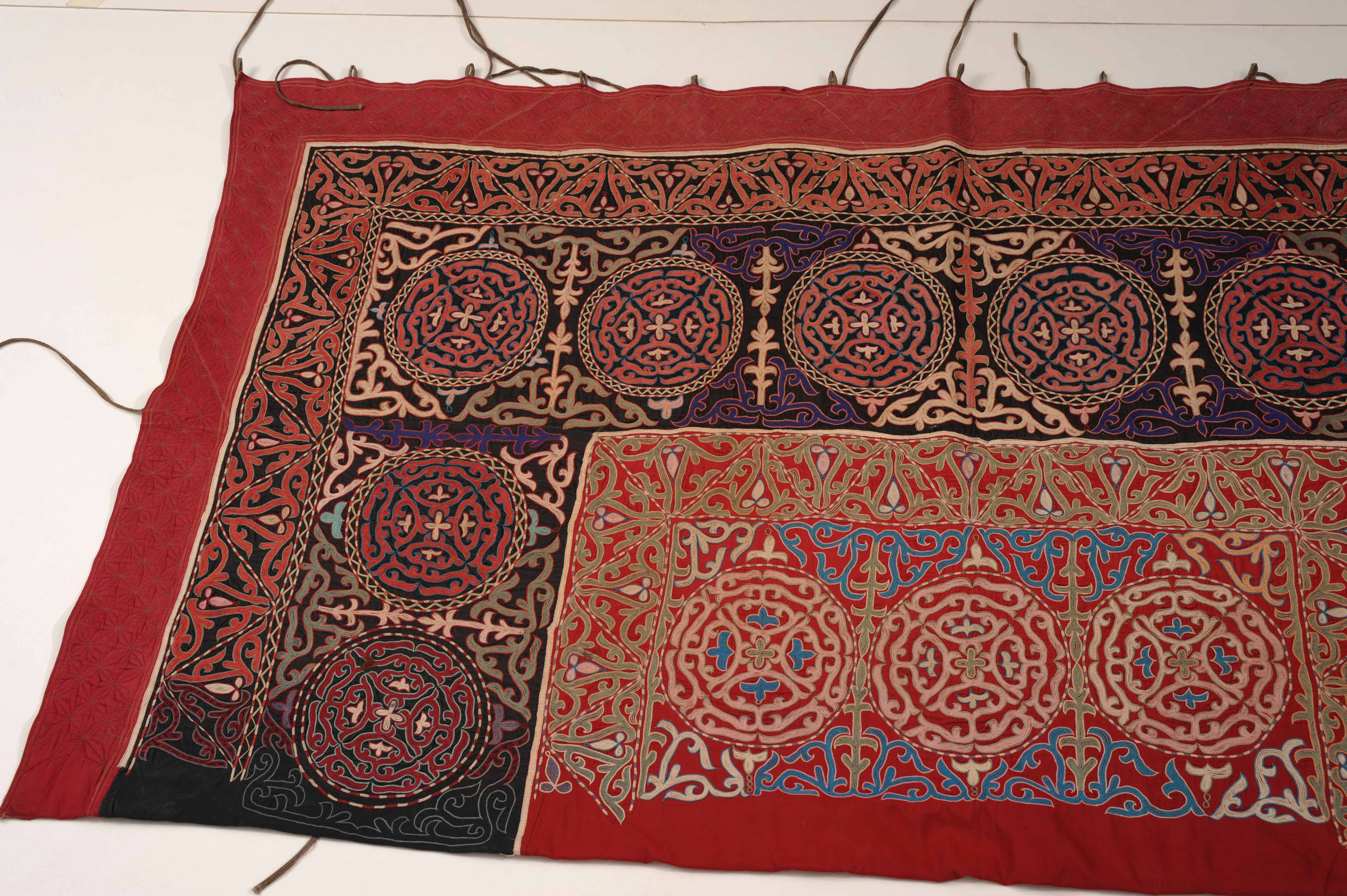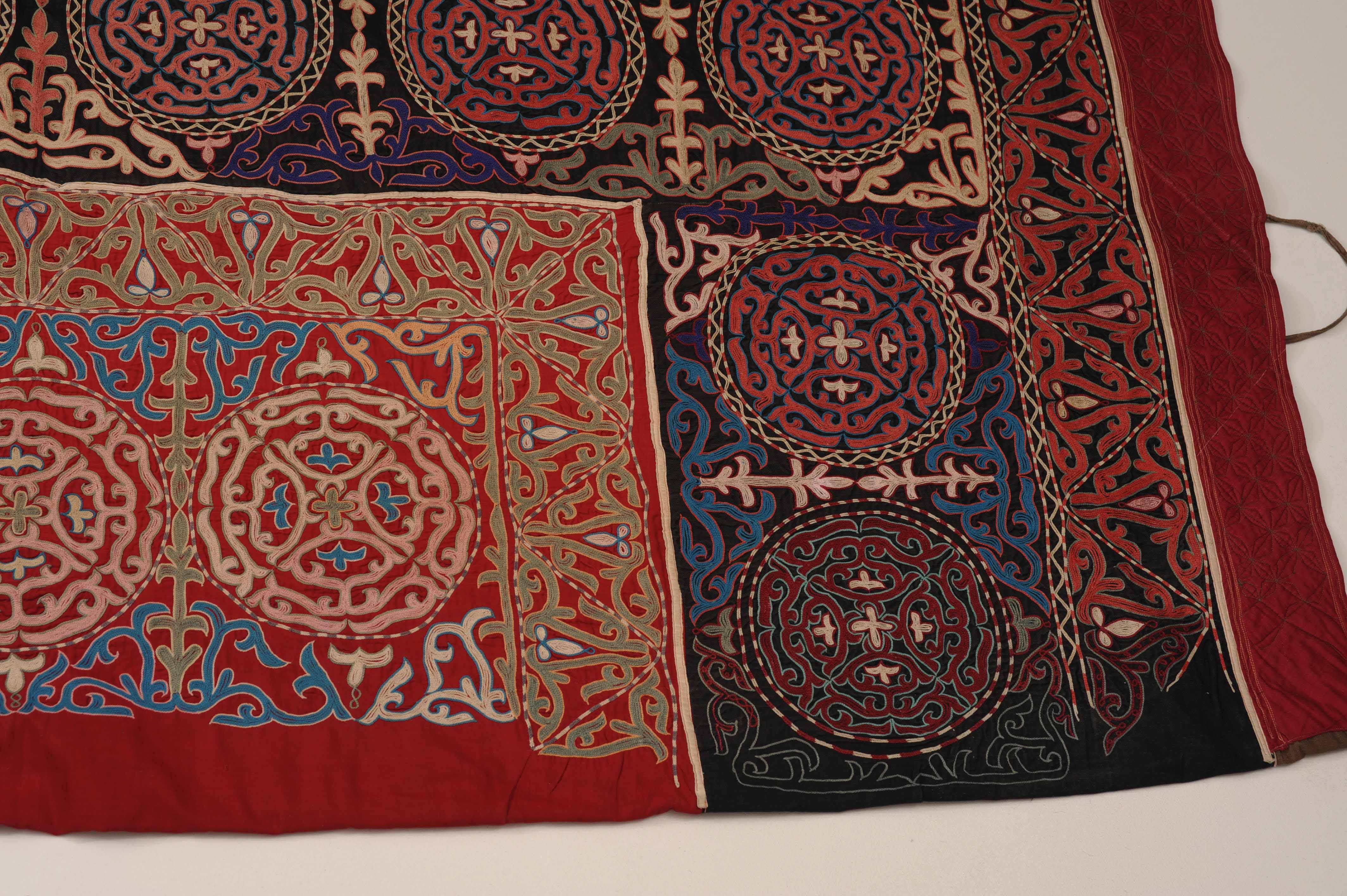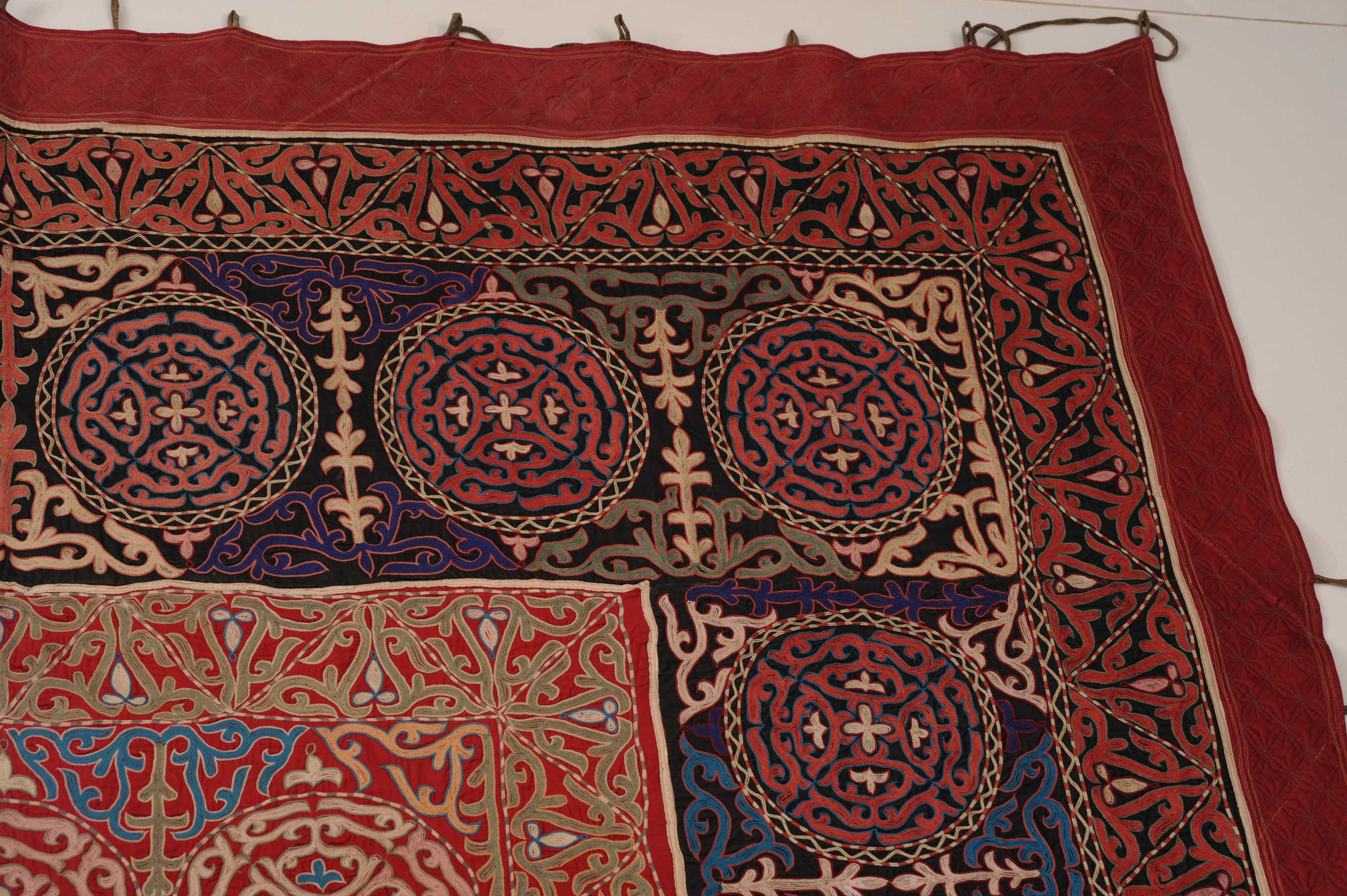 Usbekistan, um 1900. Wandbehang, der hinter einem Stuhl befestigt wird. Feine Nadelarbeit. Auf rotem Grund figurieren in Reihen angelegte Rundmedaillons, die engmaschig von girlandenartig angelegten Borten flankiert werden. Das gesamte Feld wird von einer Blattranken-Bordüre umrahmt. Gute Erhaltung. 120x225 cm (ft. 4x7.4).