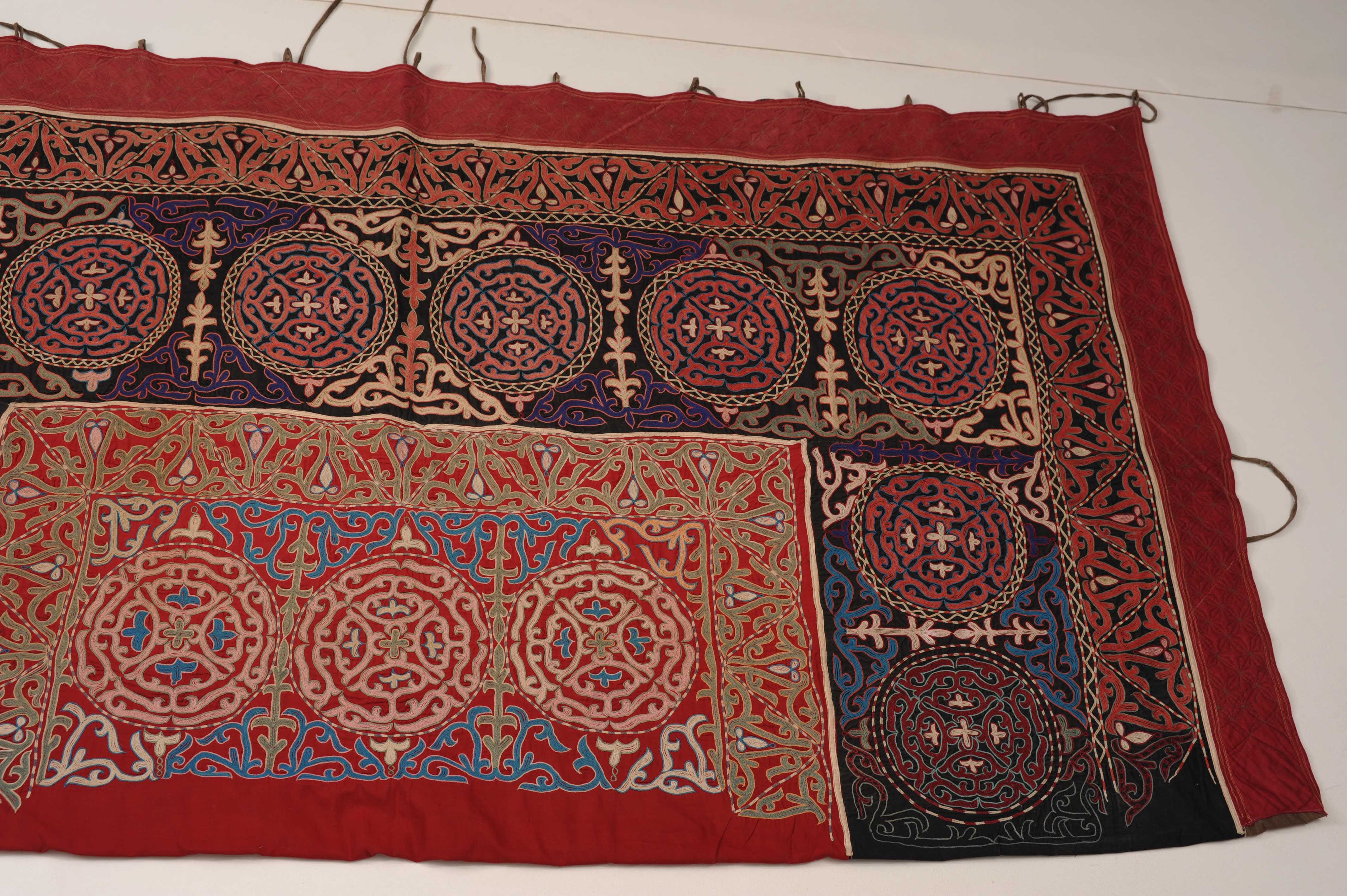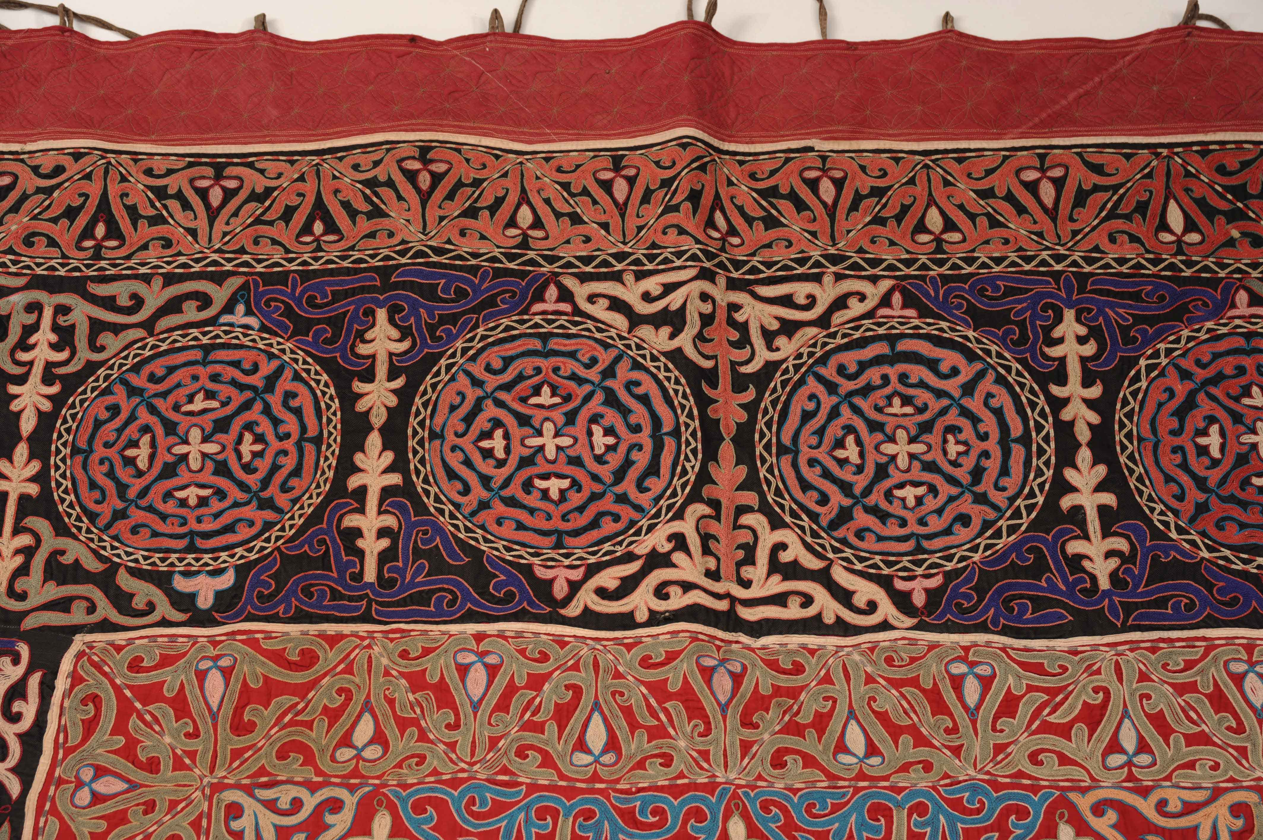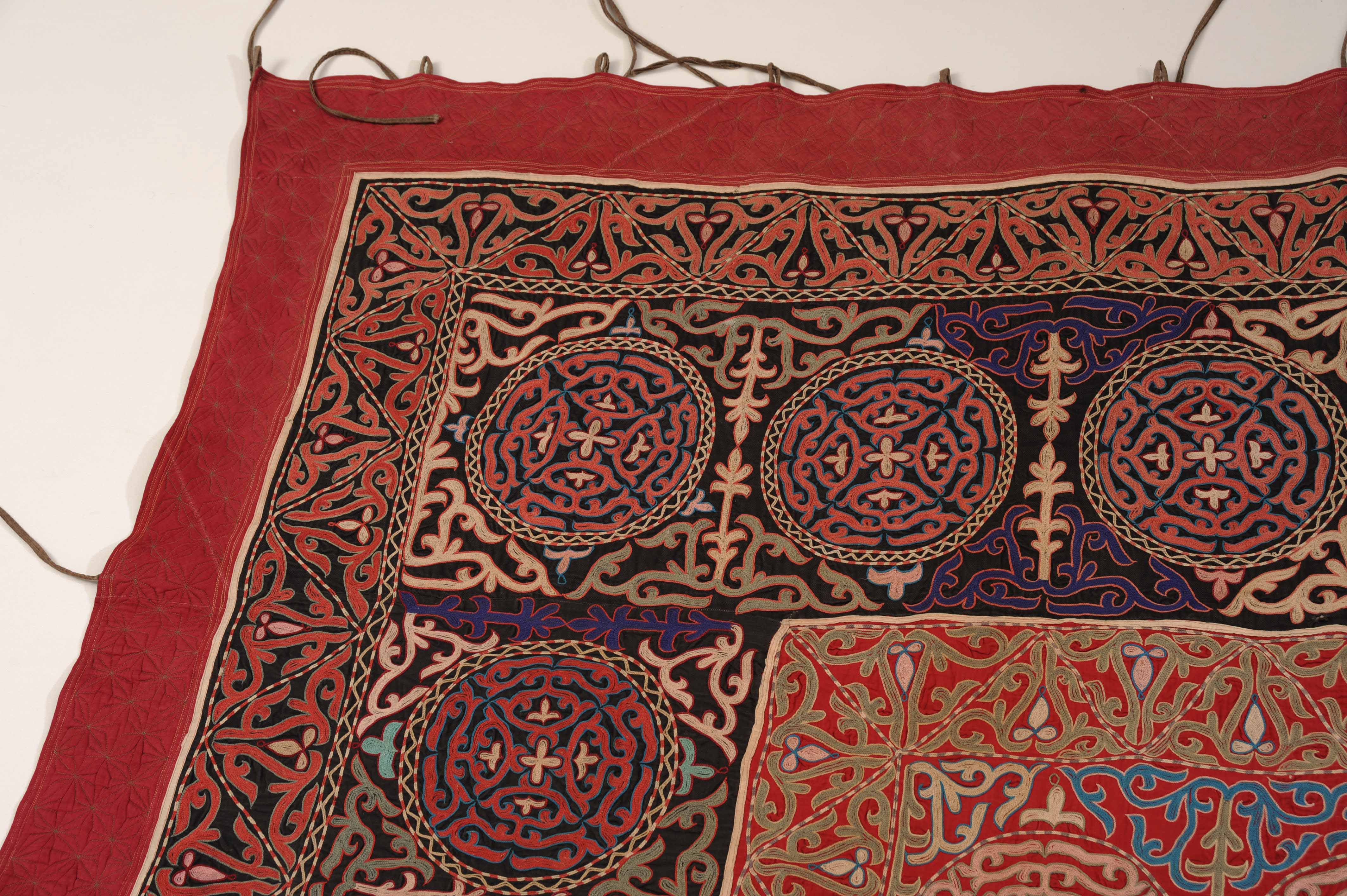 Usbekistan, um 1900. Wandbehang, der hinter einem Stuhl befestigt wird. Feine Nadelarbeit. Auf rotem Grund figurieren in Reihen angelegte Rundmedaillons, die engmaschig von girlandenartig angelegten Borten flankiert werden. Das gesamte Feld wird von einer Blattranken-Bordüre umrahmt. Gute Erhaltung. 120x225 cm (ft. 4x7.4).