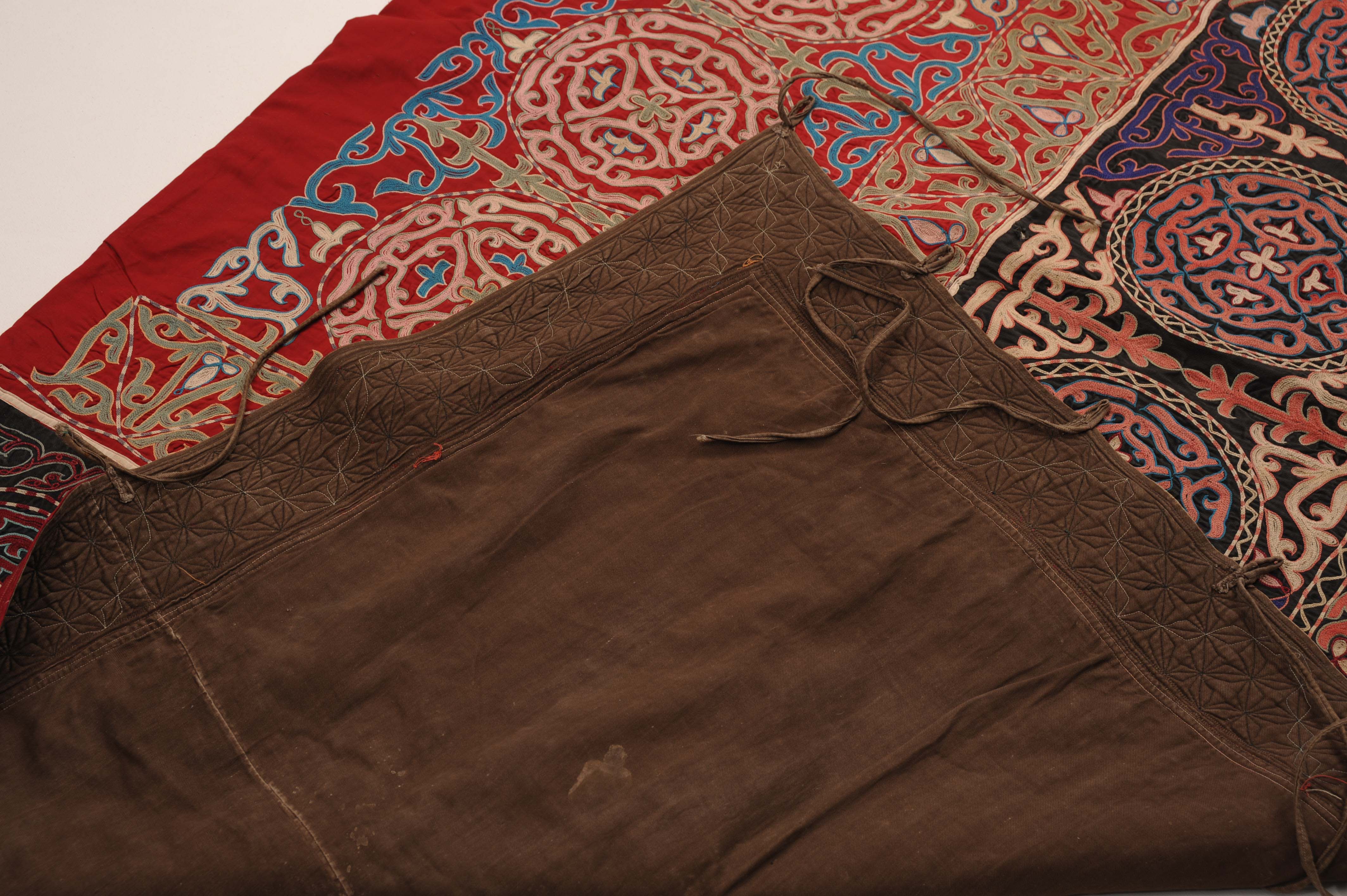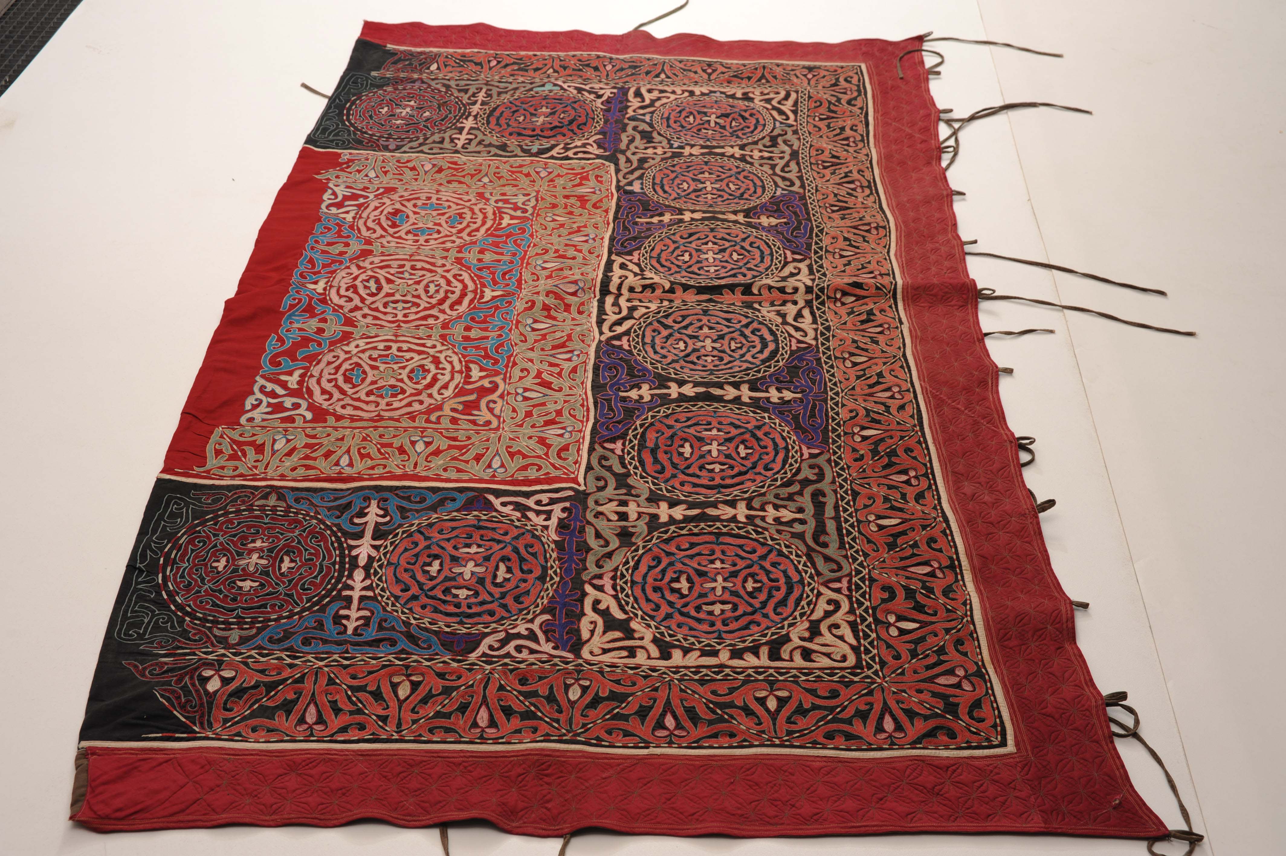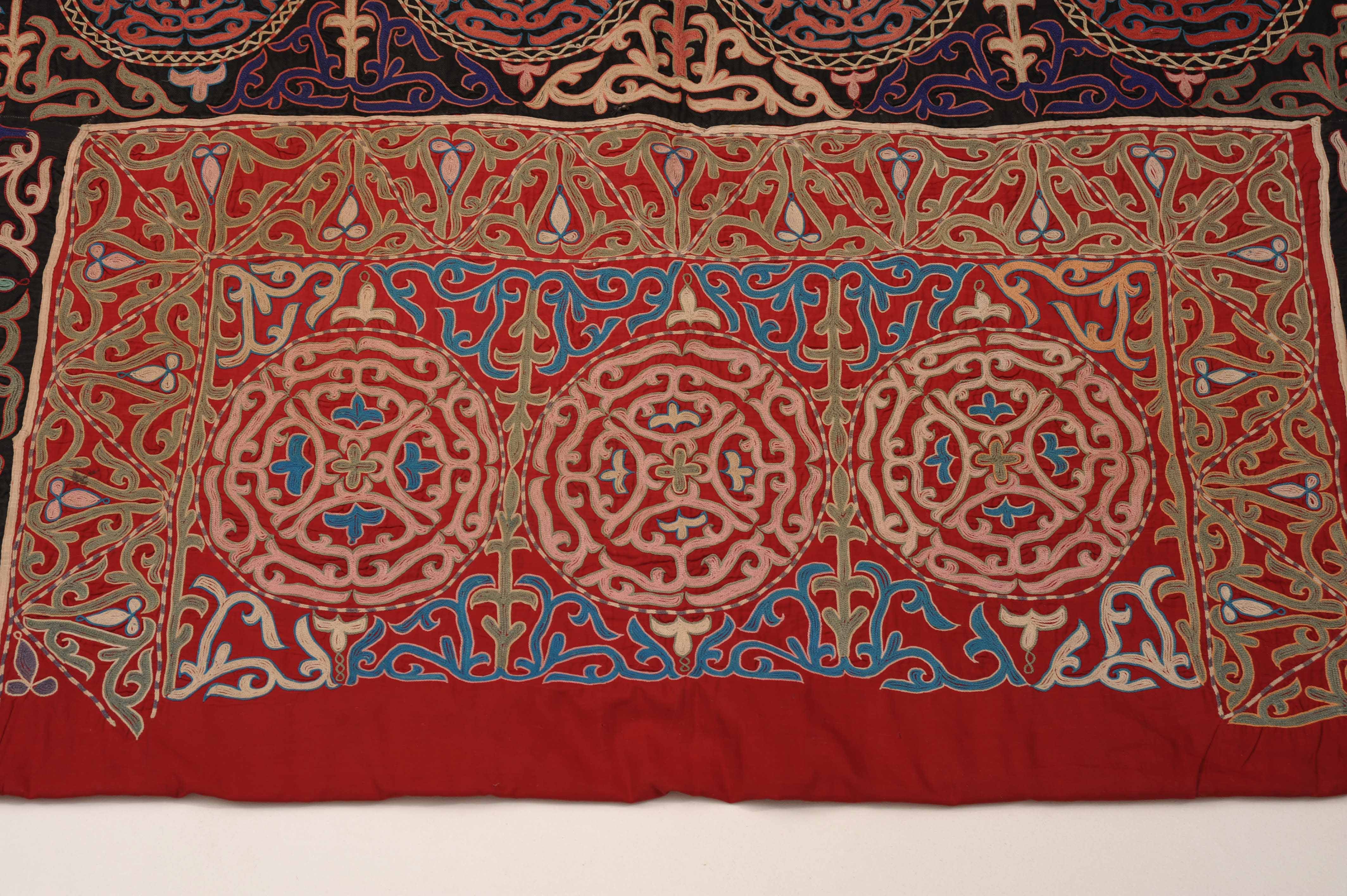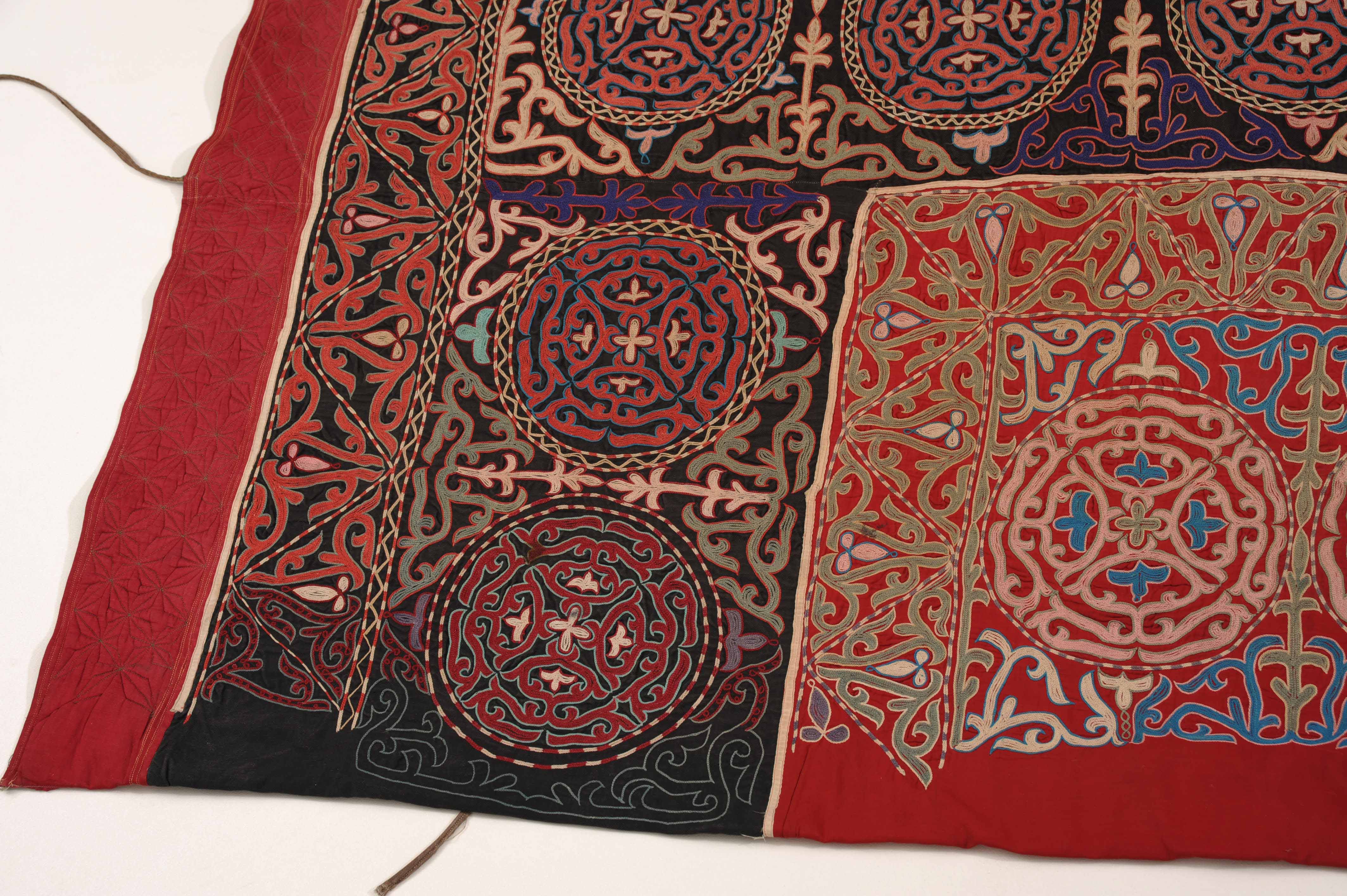 Usbekistan, um 1900. Wandbehang, der hinter einem Stuhl befestigt wird. Feine Nadelarbeit. Auf rotem Grund figurieren in Reihen angelegte Rundmedaillons, die engmaschig von girlandenartig angelegten Borten flankiert werden. Das gesamte Feld wird von einer Blattranken-Bordüre umrahmt. Gute Erhaltung. 120x225 cm (ft. 4x7.4).