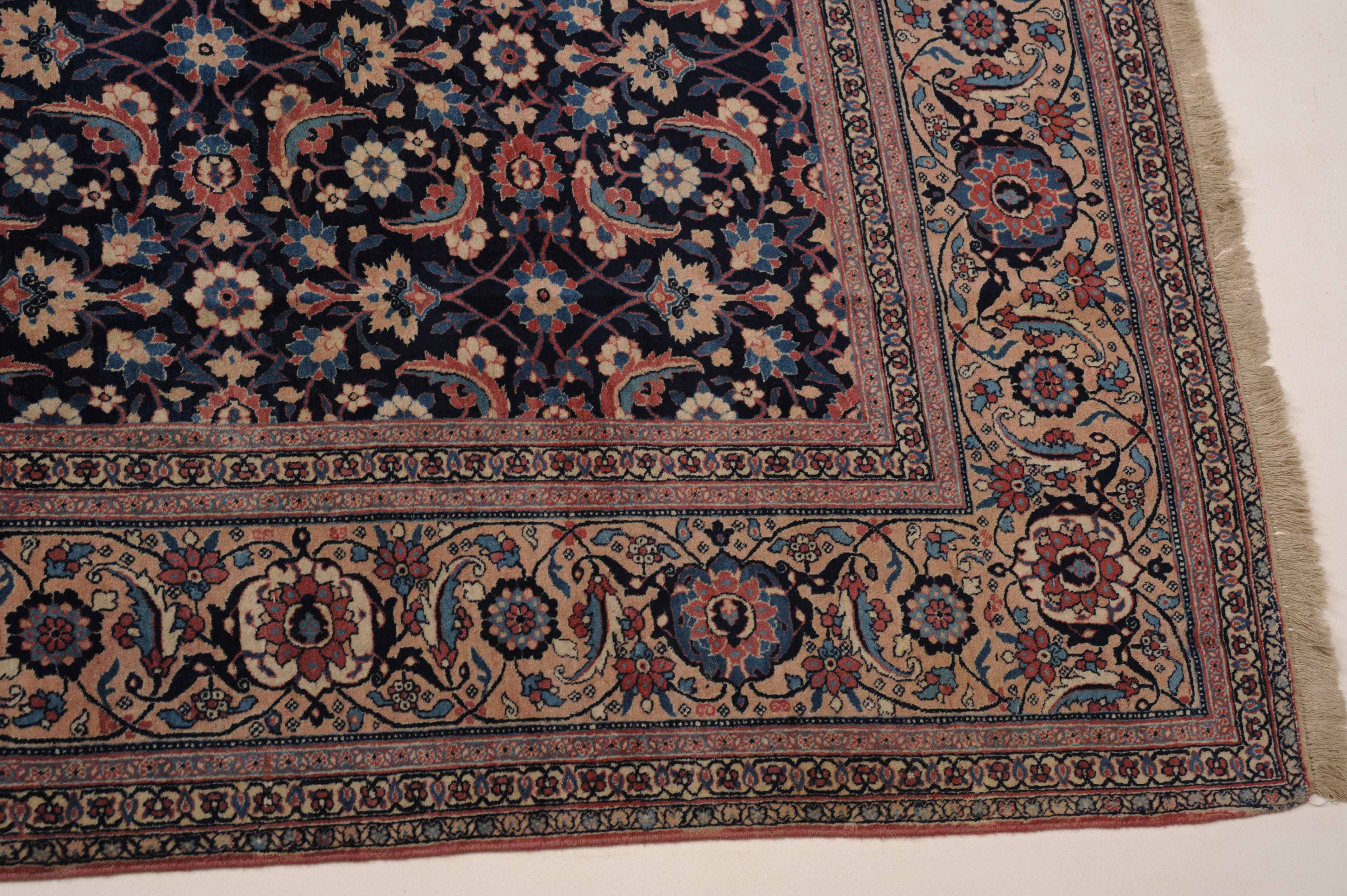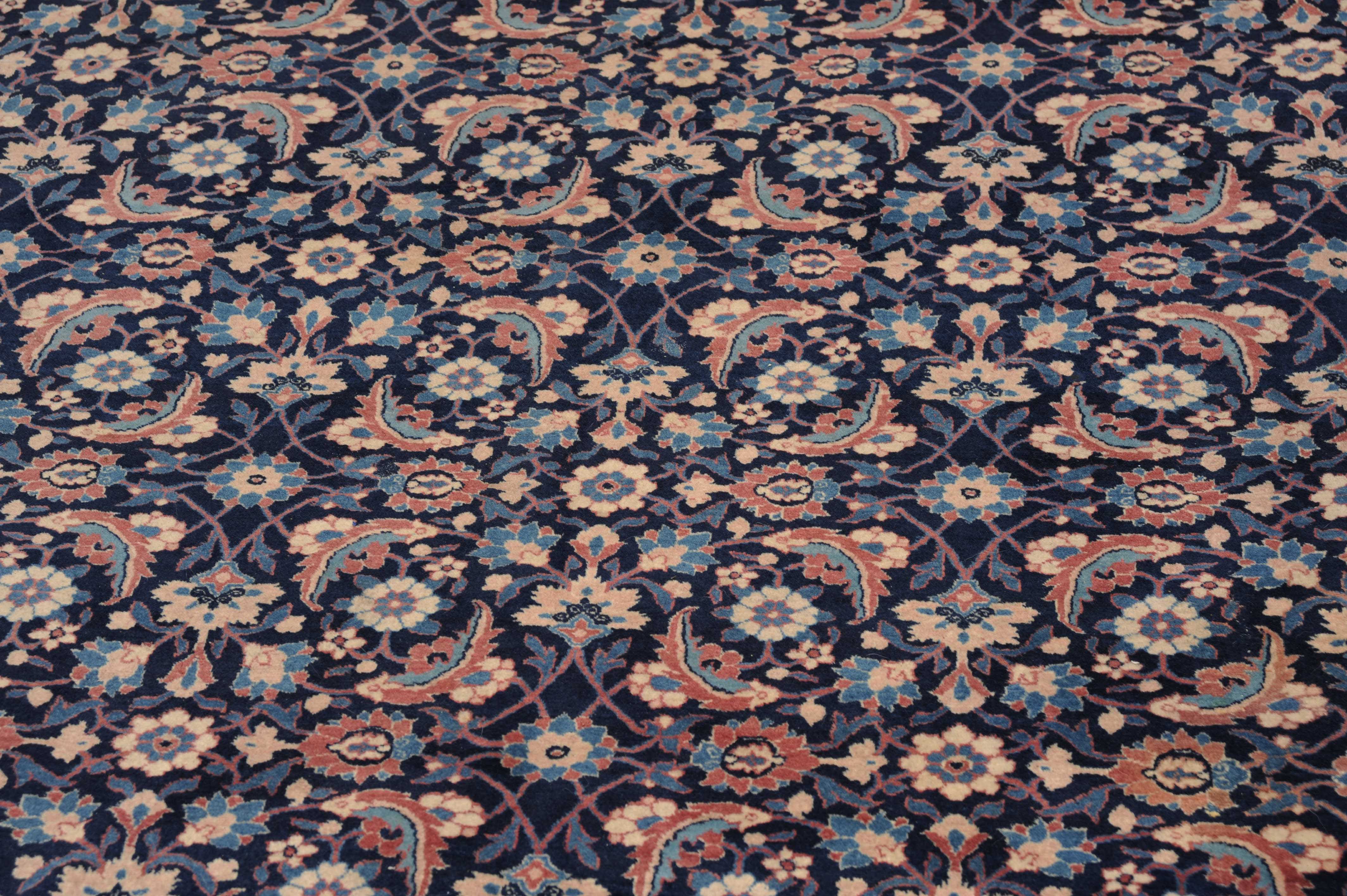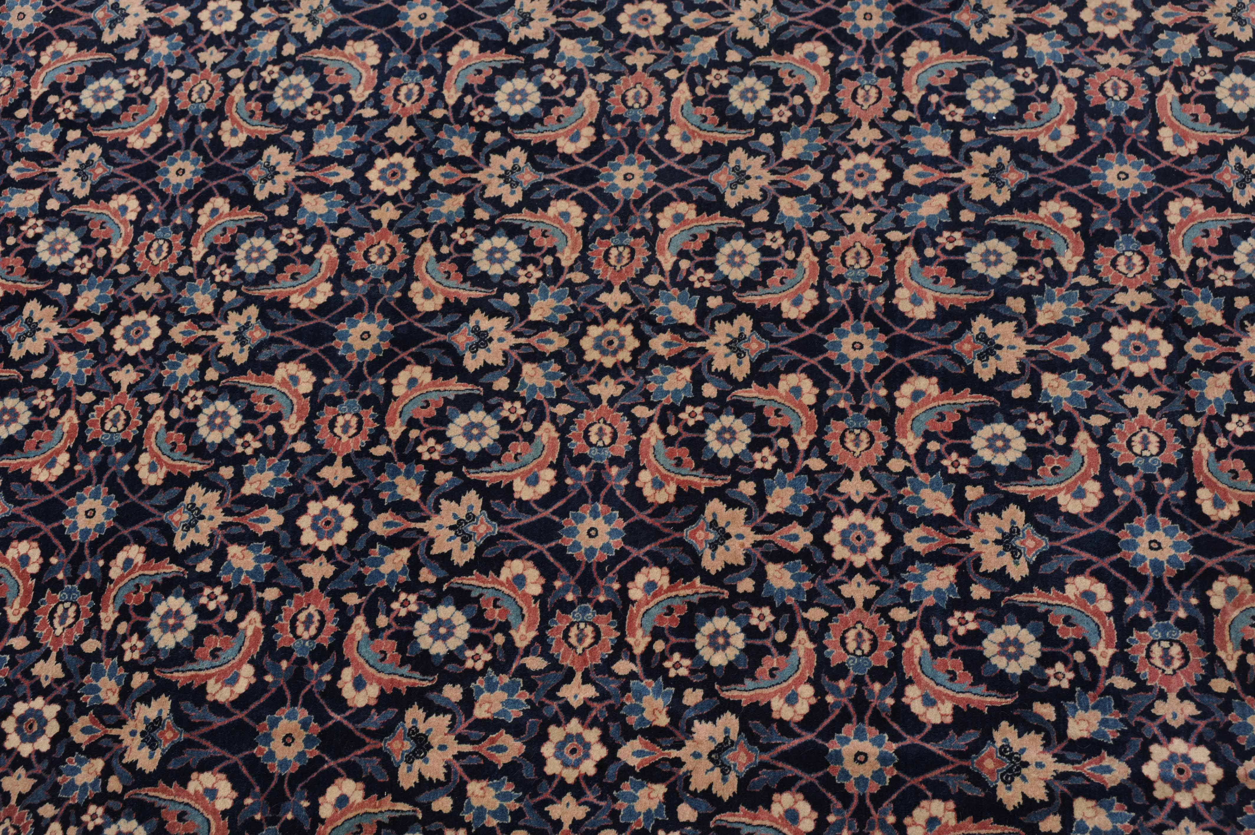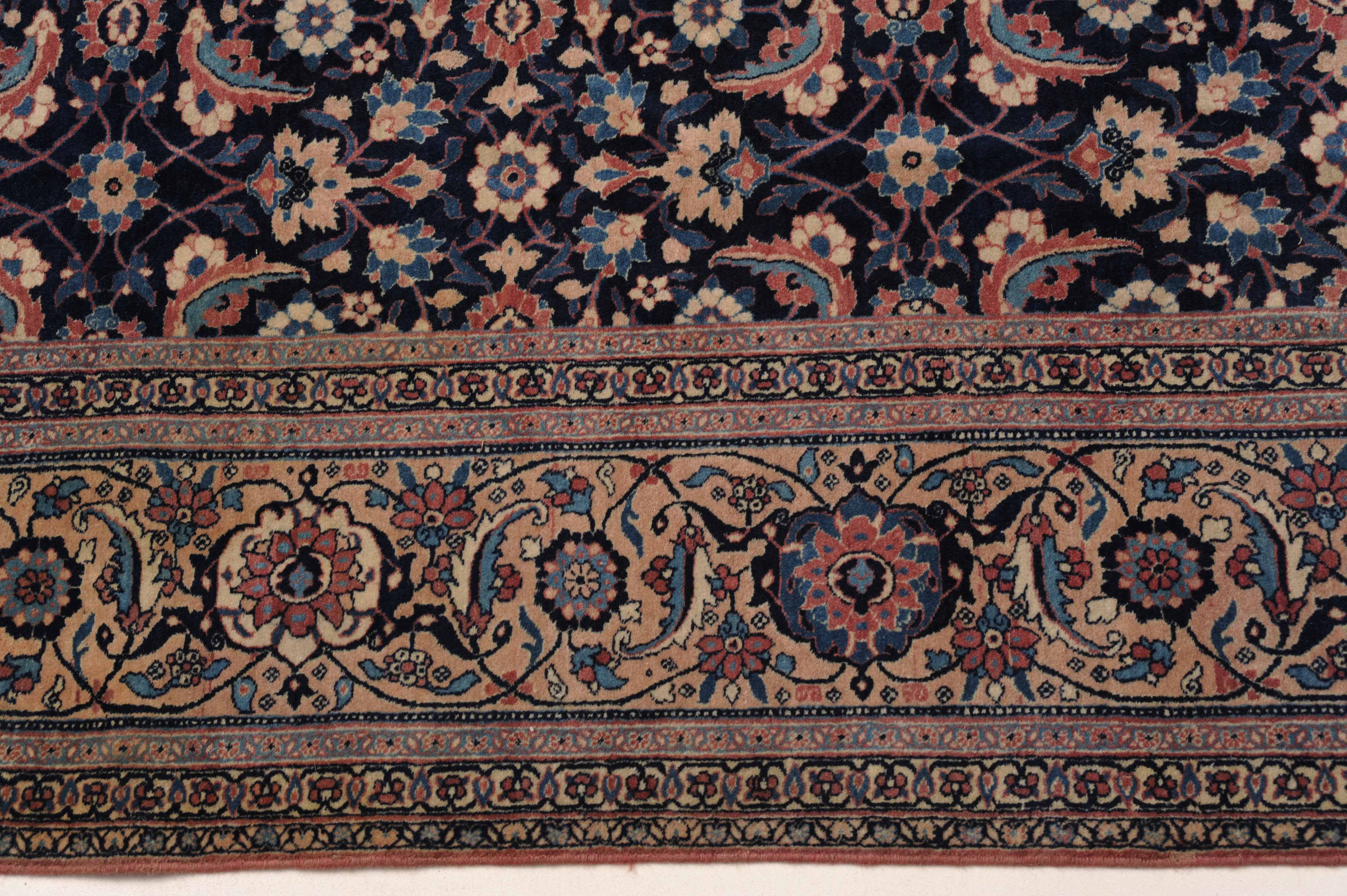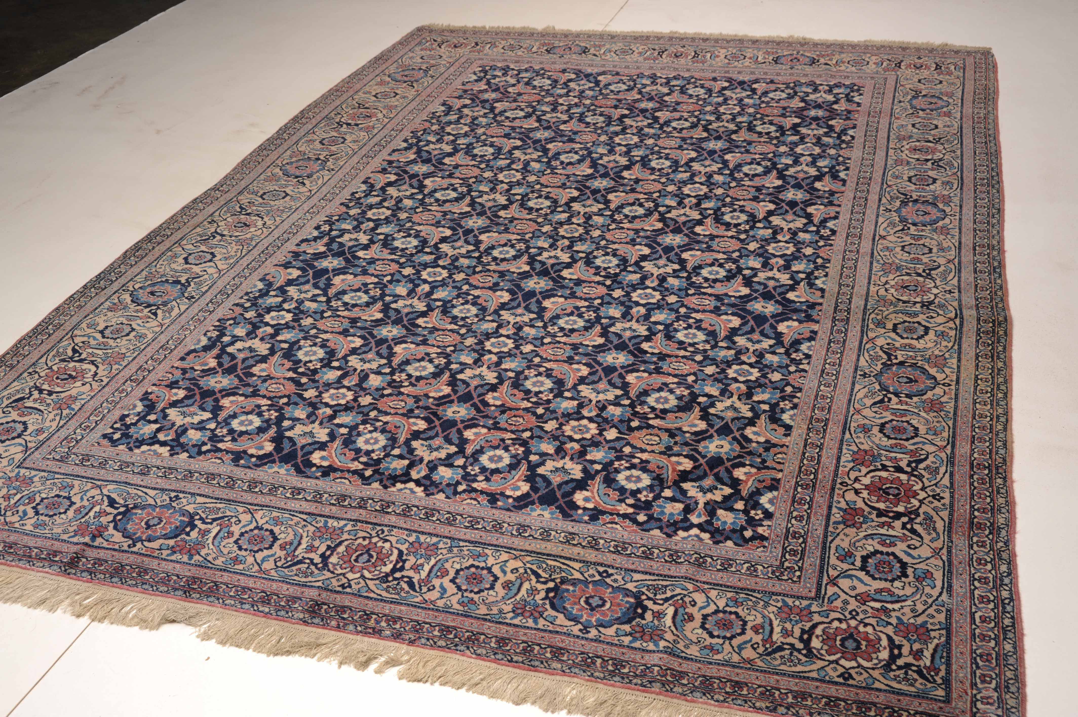 NW-Persien, um 1910. Das nachtblaue Mittelfeld ist flächendeckend mit einem lebhaften Herati-Streudekor belegt. Mehrere hellblaue Nebenbordüren umranden die reich verzierte Herati-Hauptbordüre. Sehr gute Erhaltung. 230x335 cm (ft. 7.6x11.1).