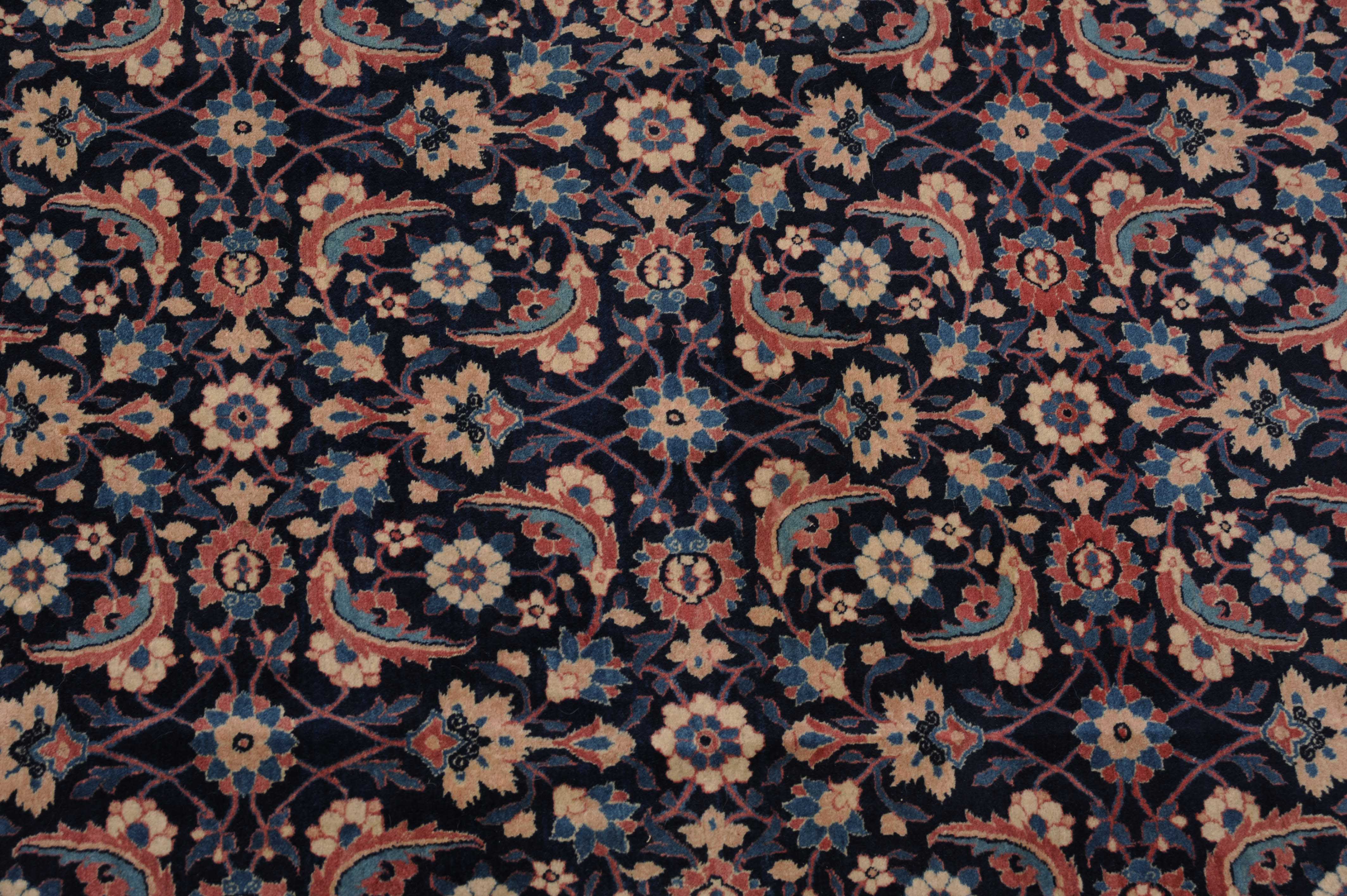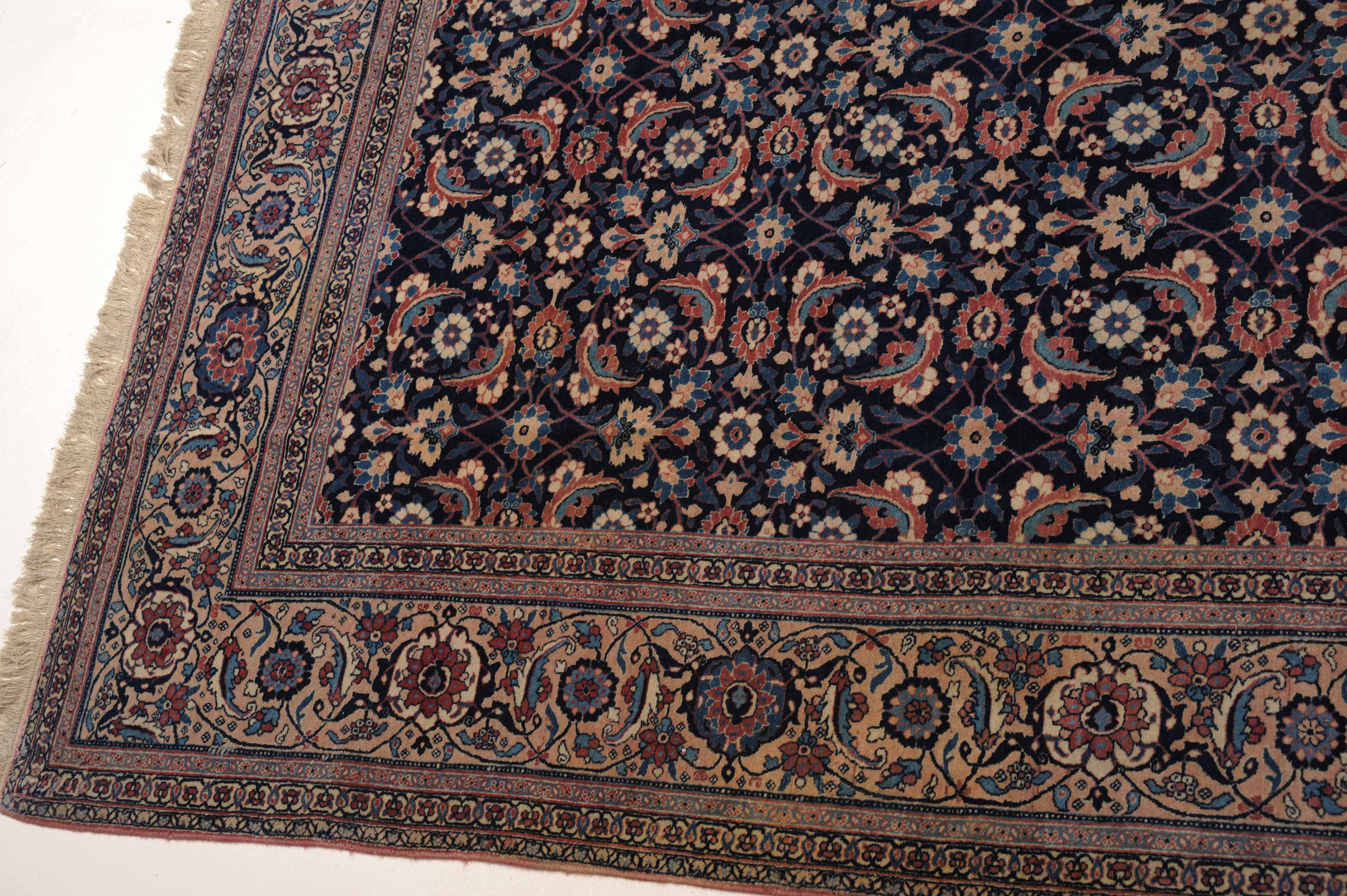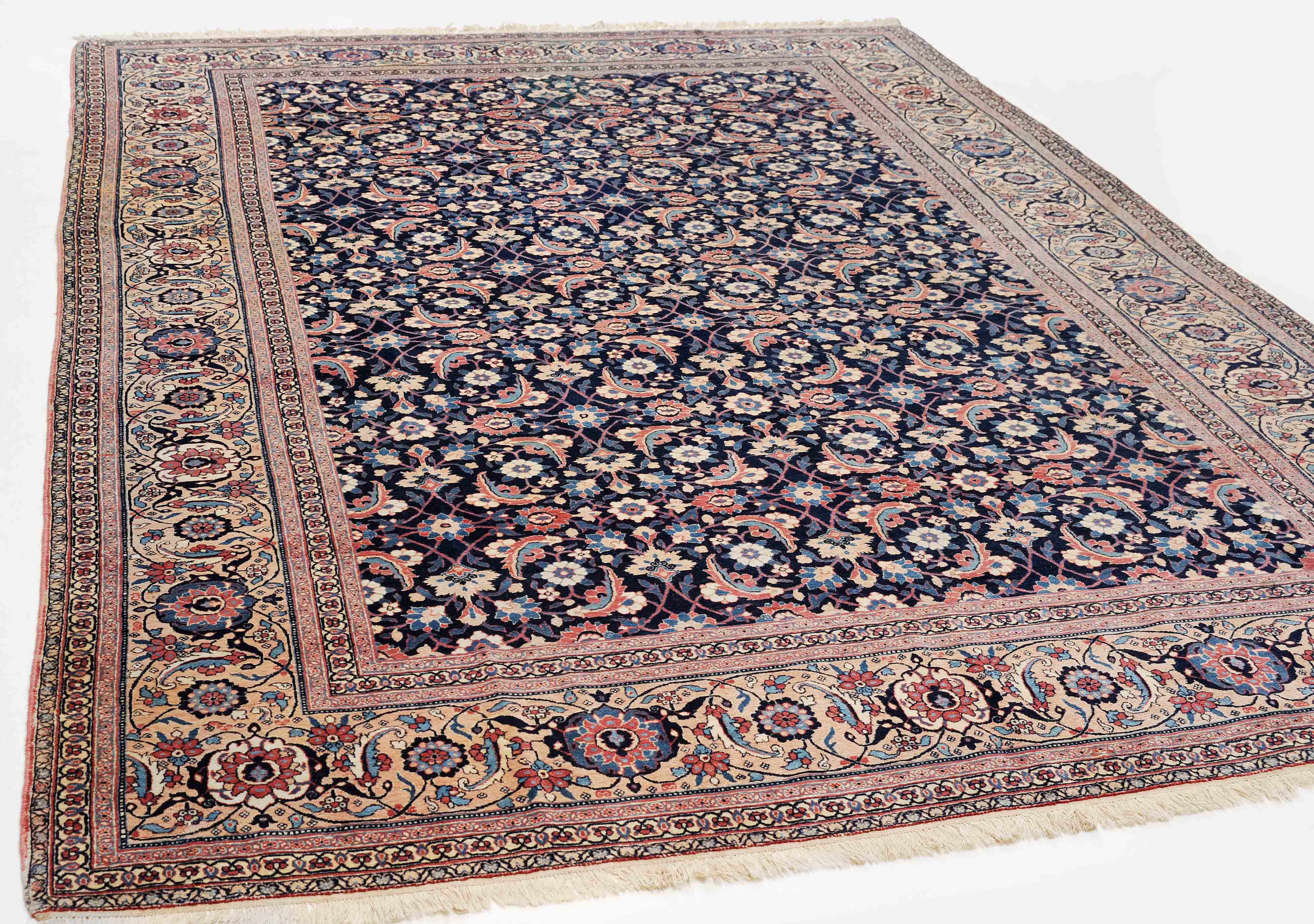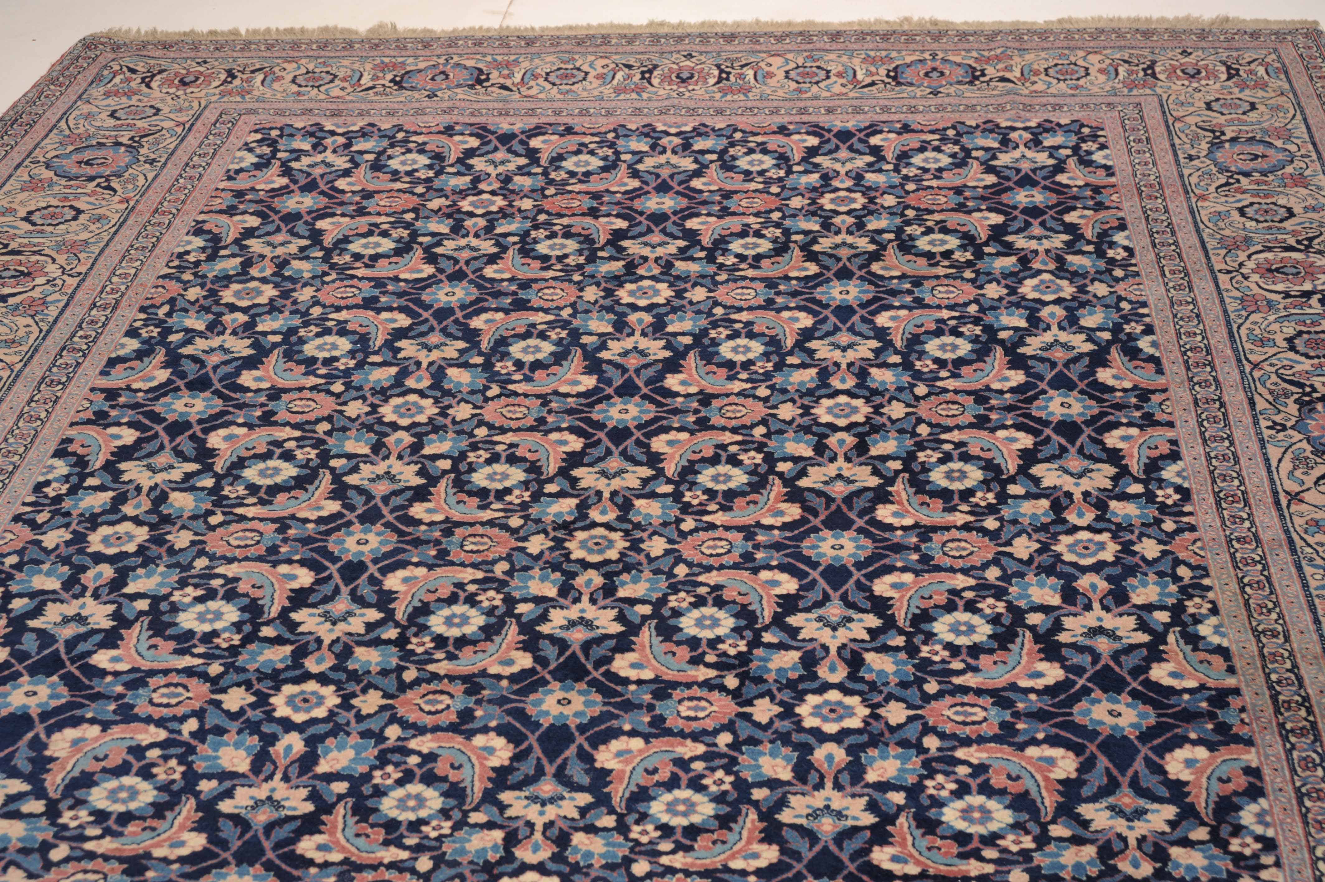 NW-Persien, um 1910. Das nachtblaue Mittelfeld ist flächendeckend mit einem lebhaften Herati-Streudekor belegt. Mehrere hellblaue Nebenbordüren umranden die reich verzierte Herati-Hauptbordüre. Sehr gute Erhaltung. 230x335 cm (ft. 7.6x11.1).