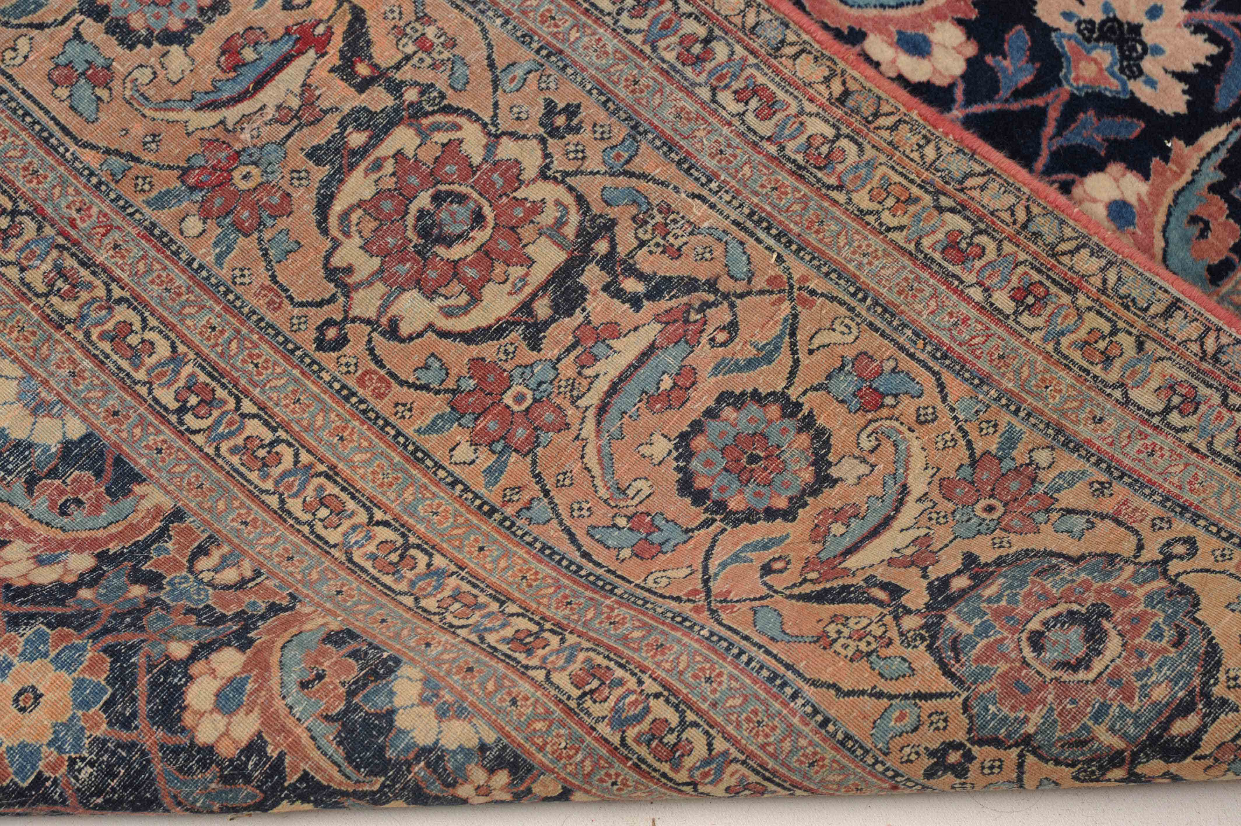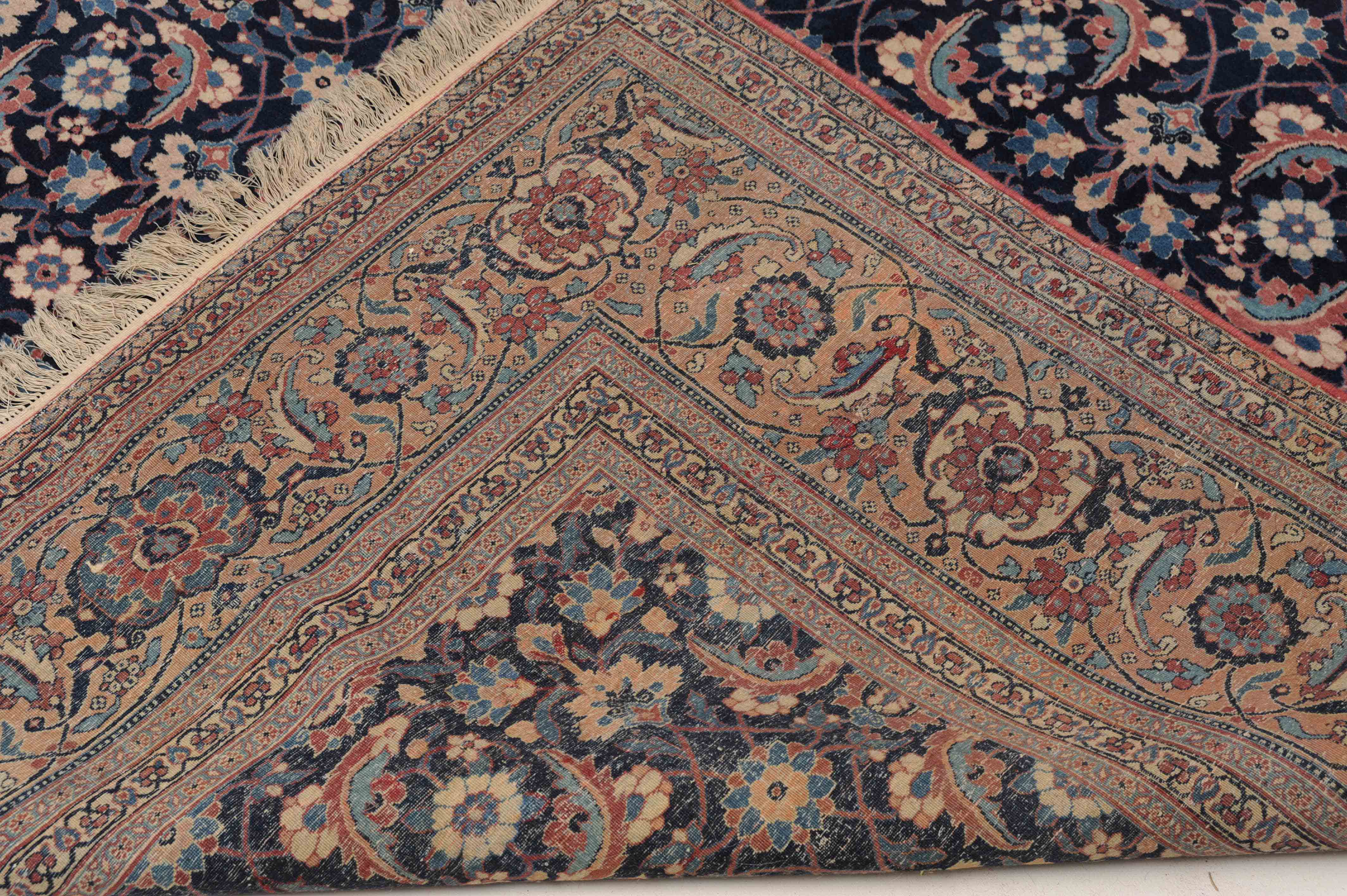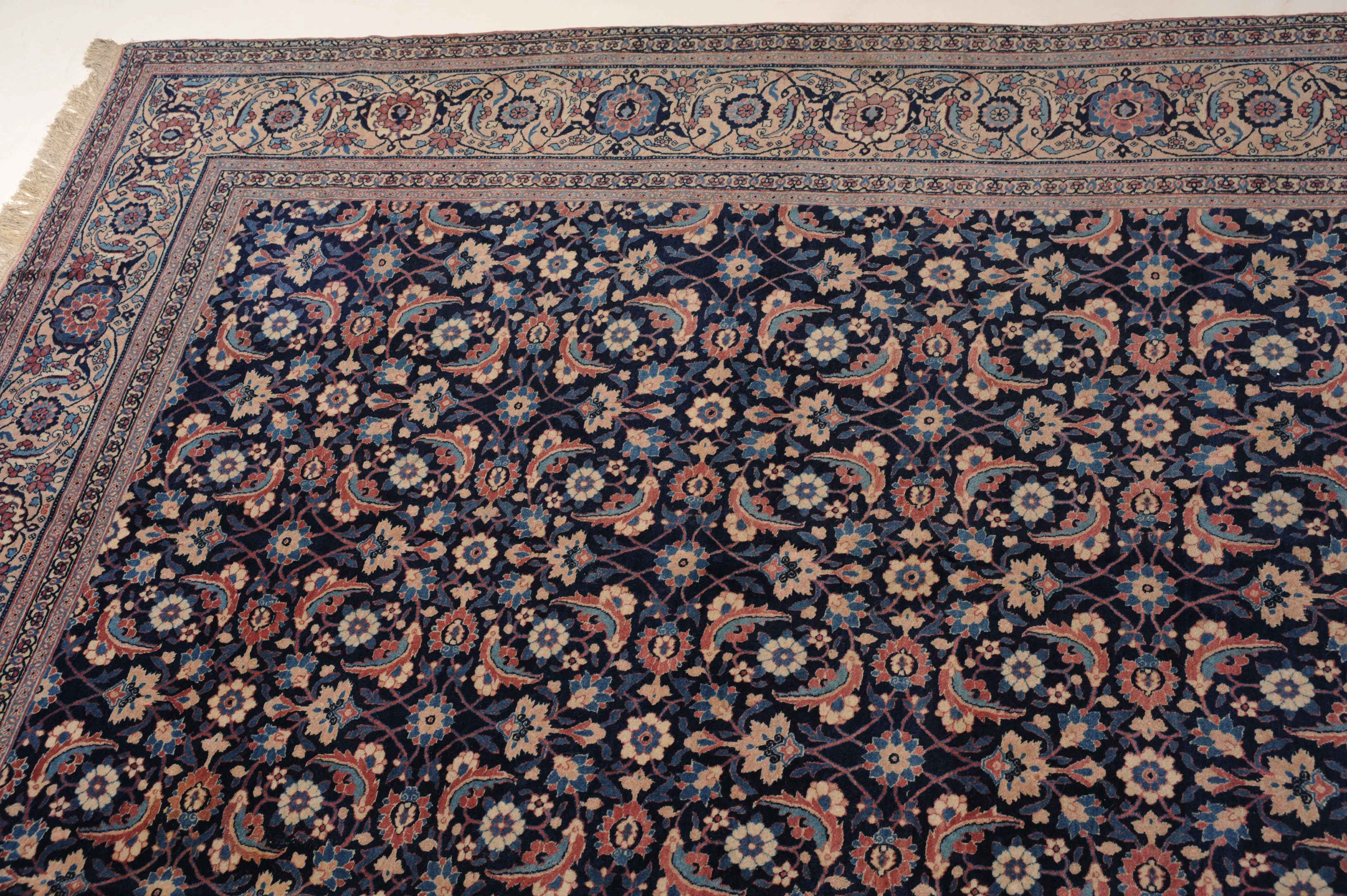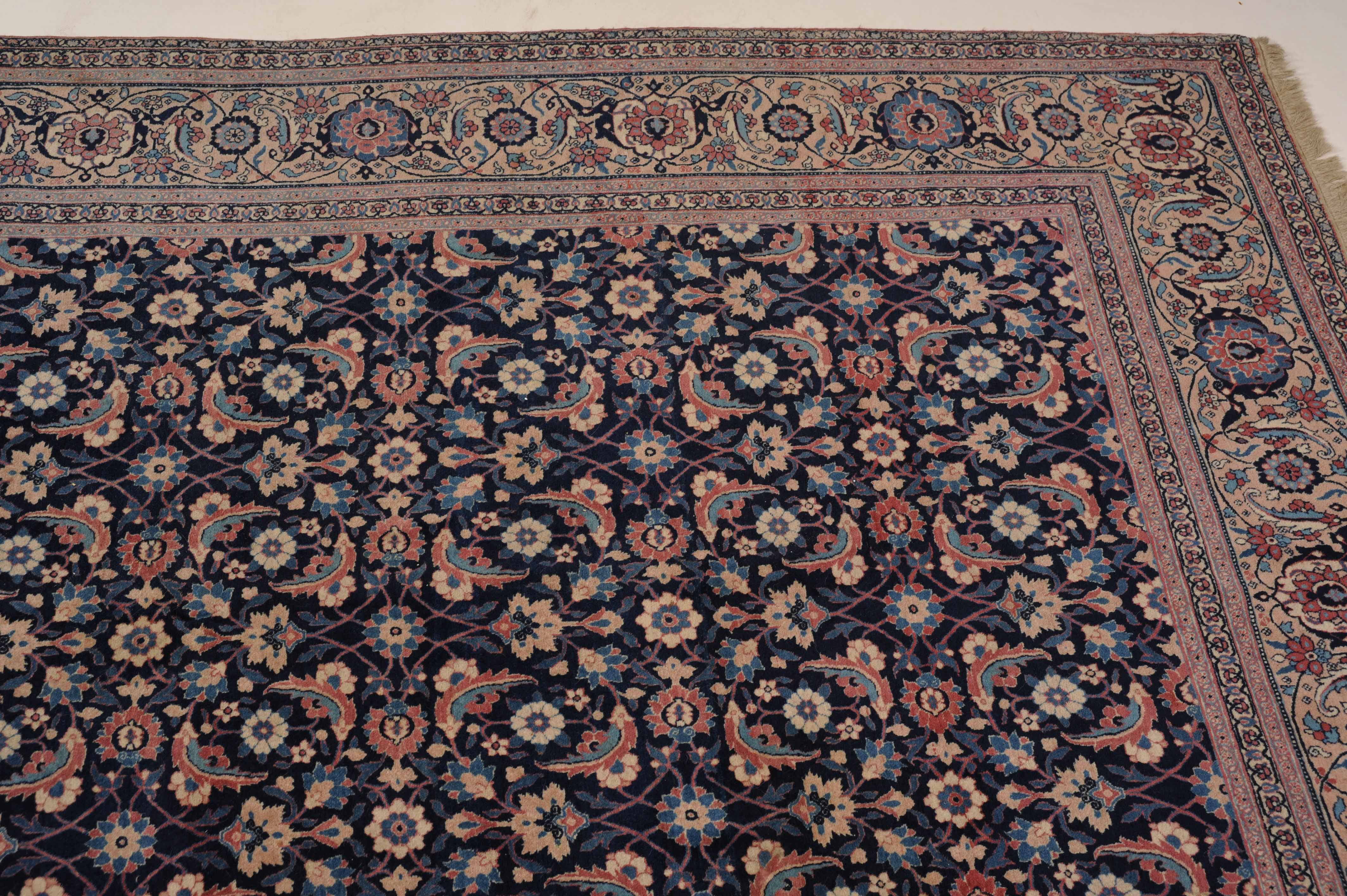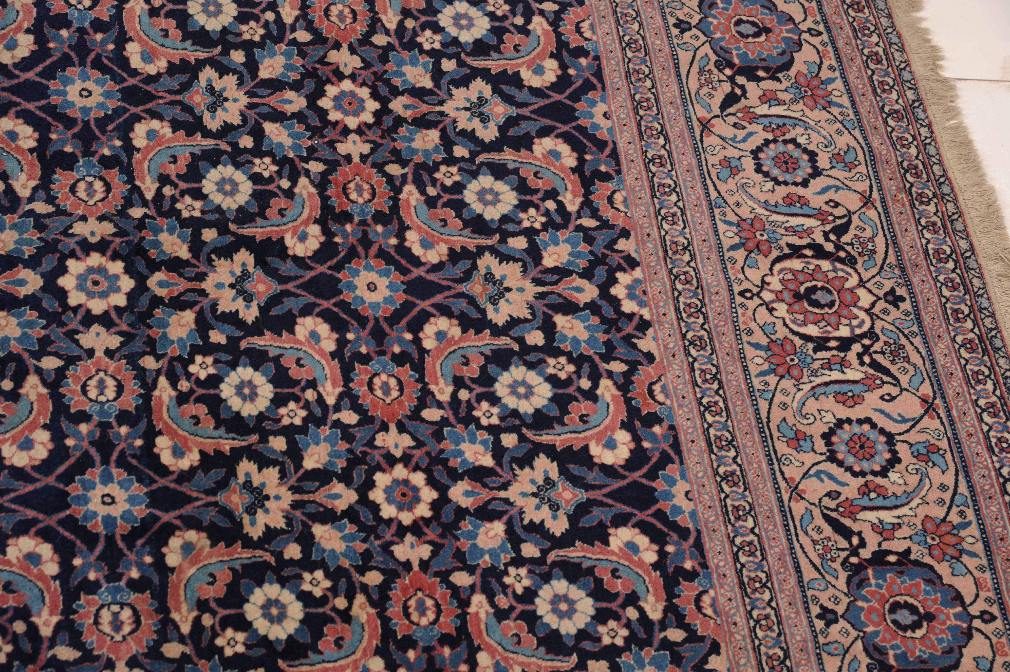 NW-Persien, um 1910. Das nachtblaue Mittelfeld ist flächendeckend mit einem lebhaften Herati-Streudekor belegt. Mehrere hellblaue Nebenbordüren umranden die reich verzierte Herati-Hauptbordüre. Sehr gute Erhaltung. 230x335 cm (ft. 7.6x11.1).