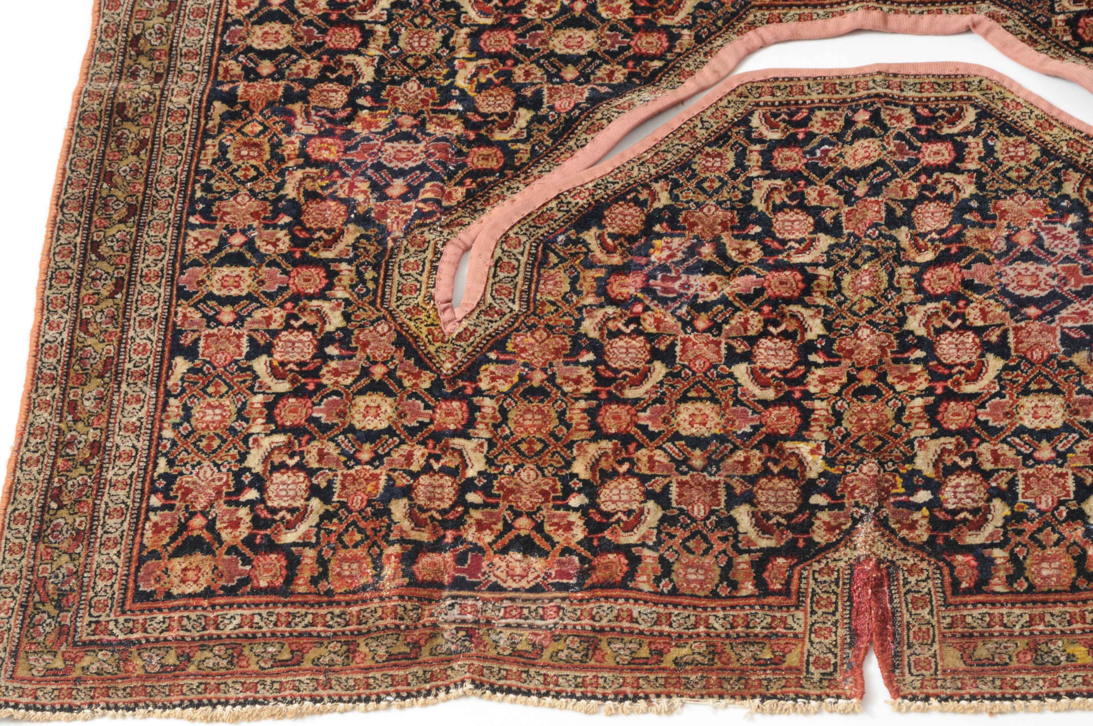 W-Persien, um 1900. Feine Knüpfung. Der tiefblaue Grund ist durchgehend mit einem dekorativen Senne-Streudekor überzogen, mit einem für Satteldecken üblichen Spalt in der Mitte. 2 Rosettenborten säumen die schmale, für Senne-Teppiche charakteristische Bordüre. Mehrere alte reparierte Stellen, ansonsten sehr gute Erhaltung. 95x110 cm (ft. 3.1x3.6).