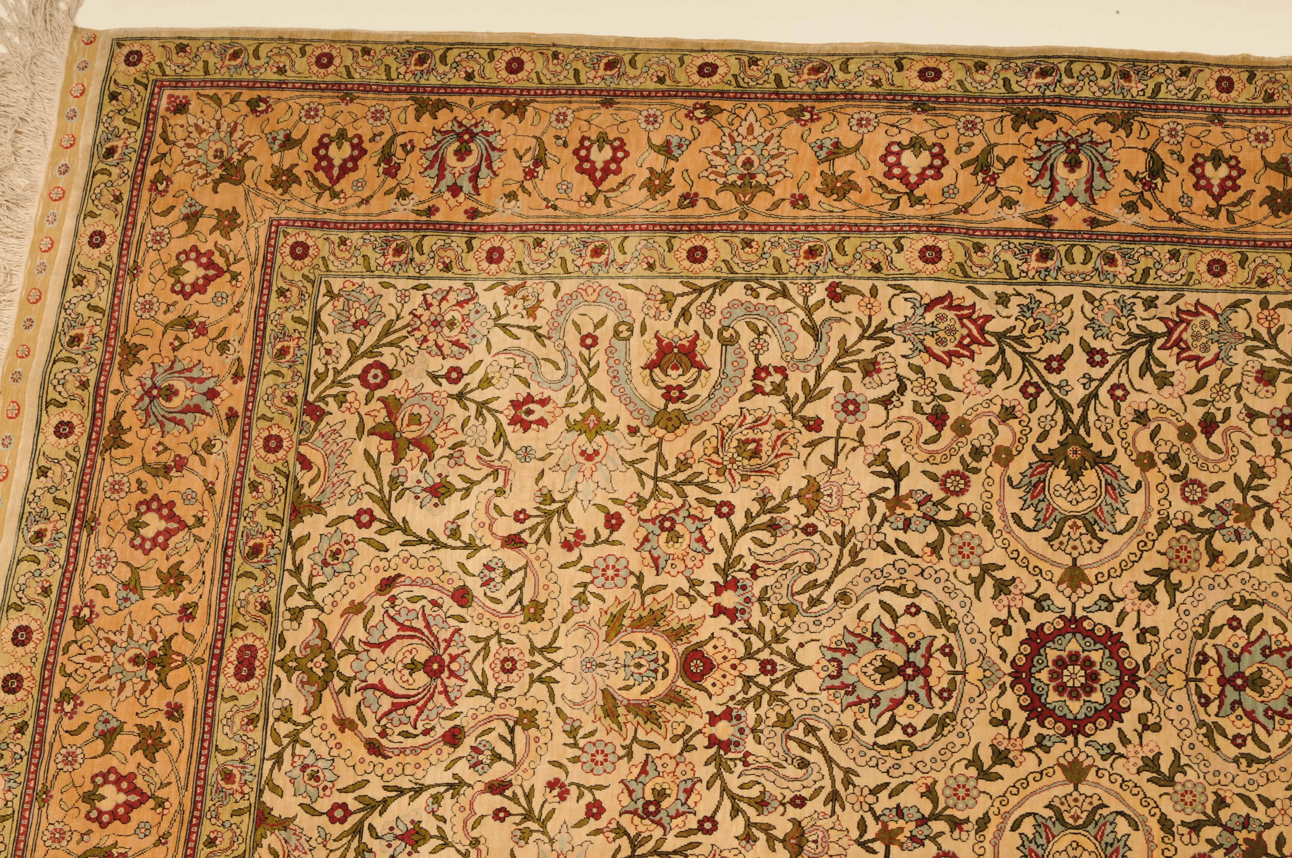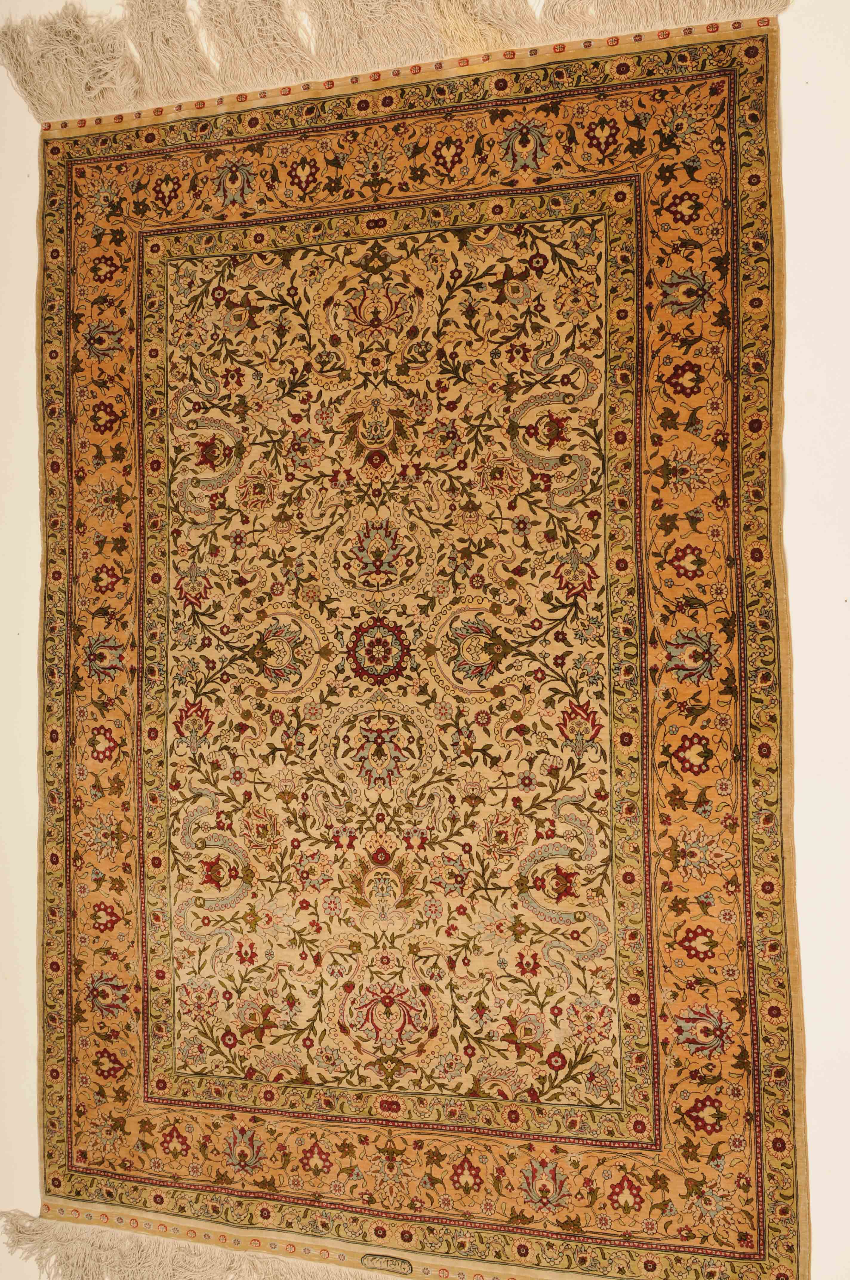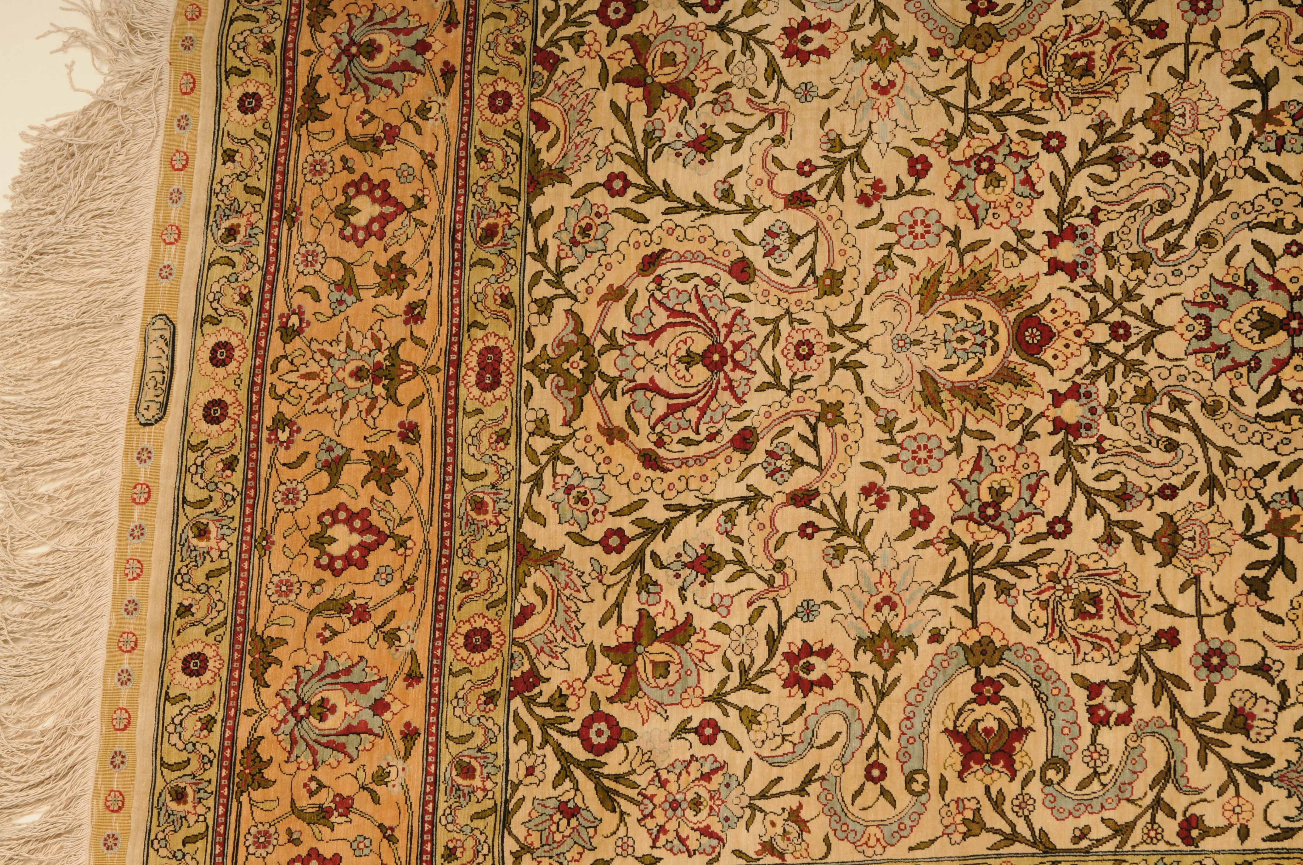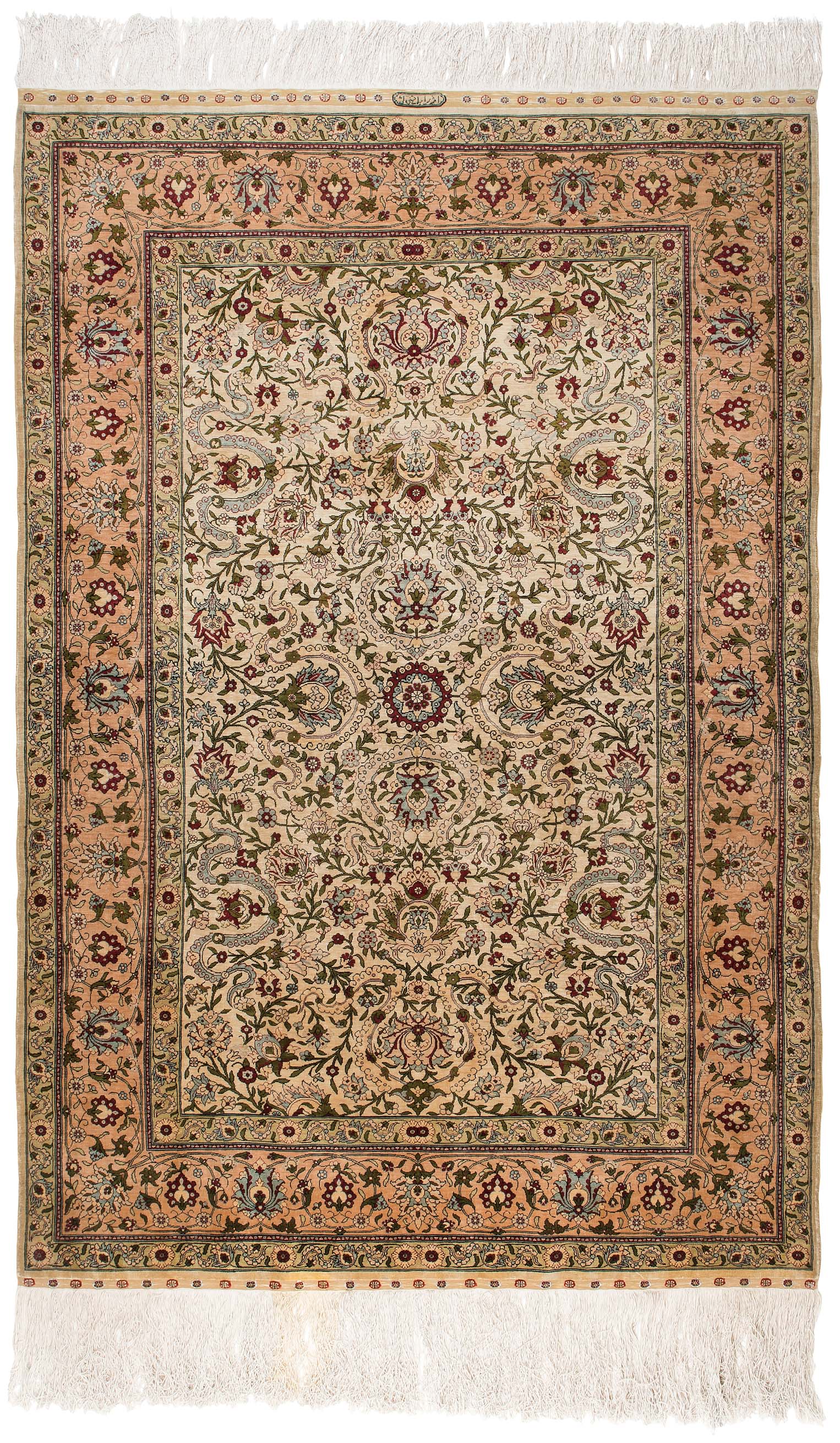 N-Türkei, um 1970. Sehr feine Knüpfung. Oben in der Mitte signiert mit "Hereke Ozbek Hereke". Dichtes florales Werk. Im hellen Mittelfeld figurieren flächendeckend filigran gearbeitete Blüten, Ranken, Palmetten und Wolkenbänder. Rosarote florale Hauptbordüre, die von 2 gelben Nebenbordüren und Borten begleitet wird. Sehr gute Erhaltung. 110x157 cm (ft. 3.6x5.2).