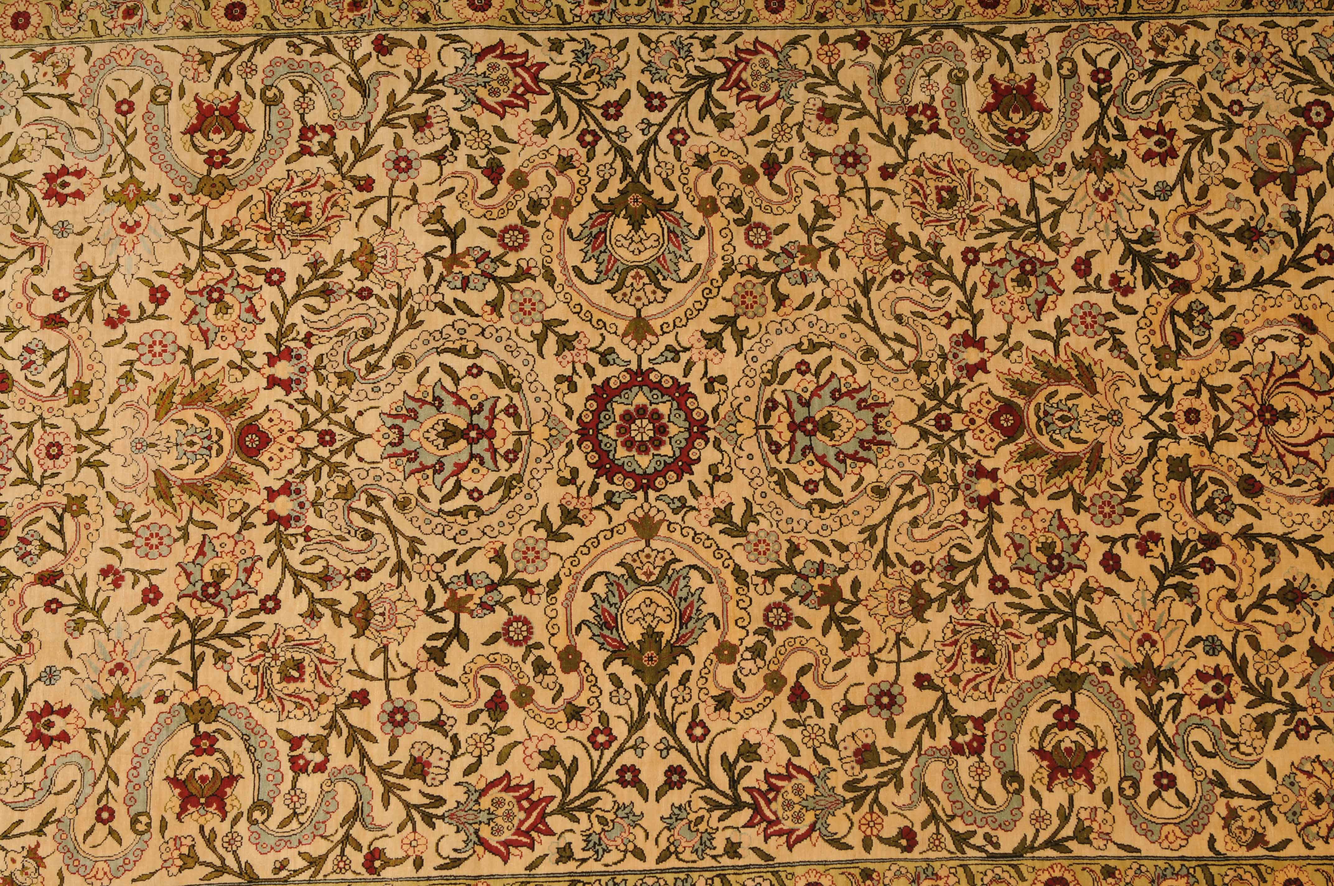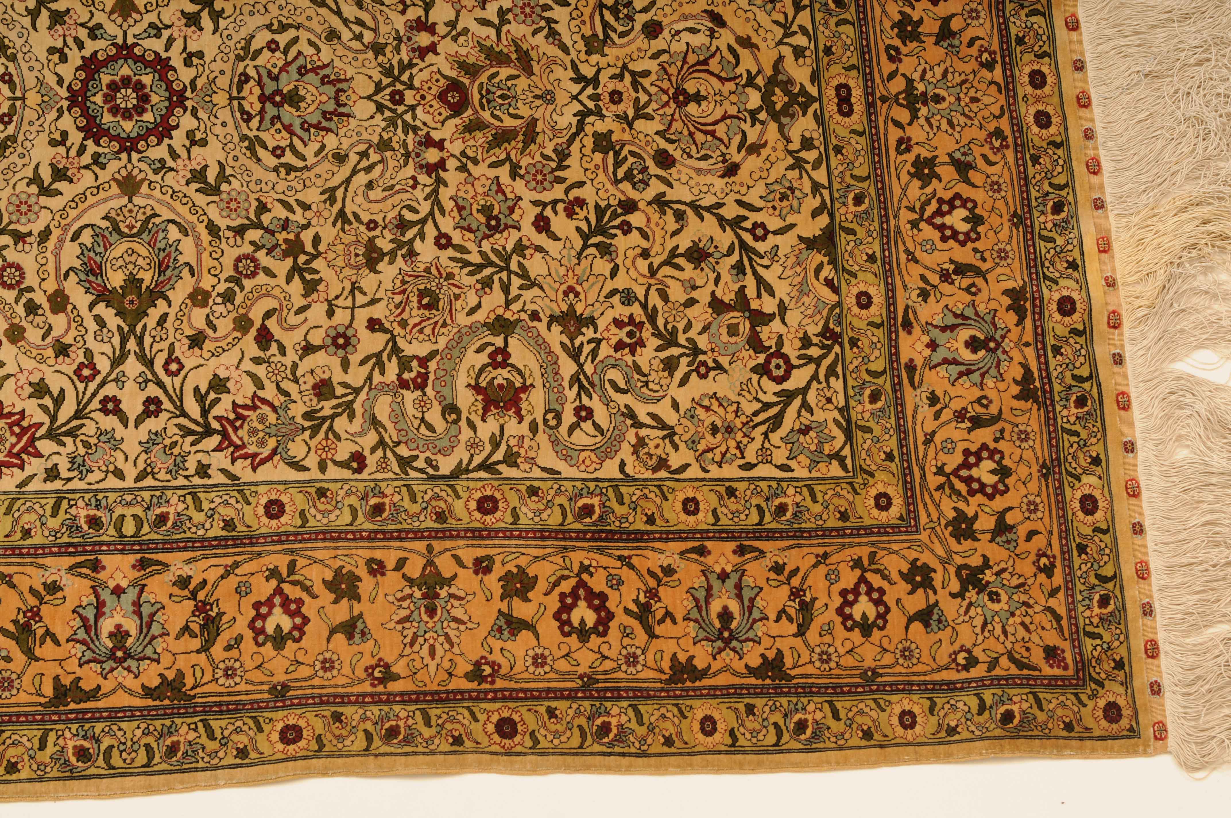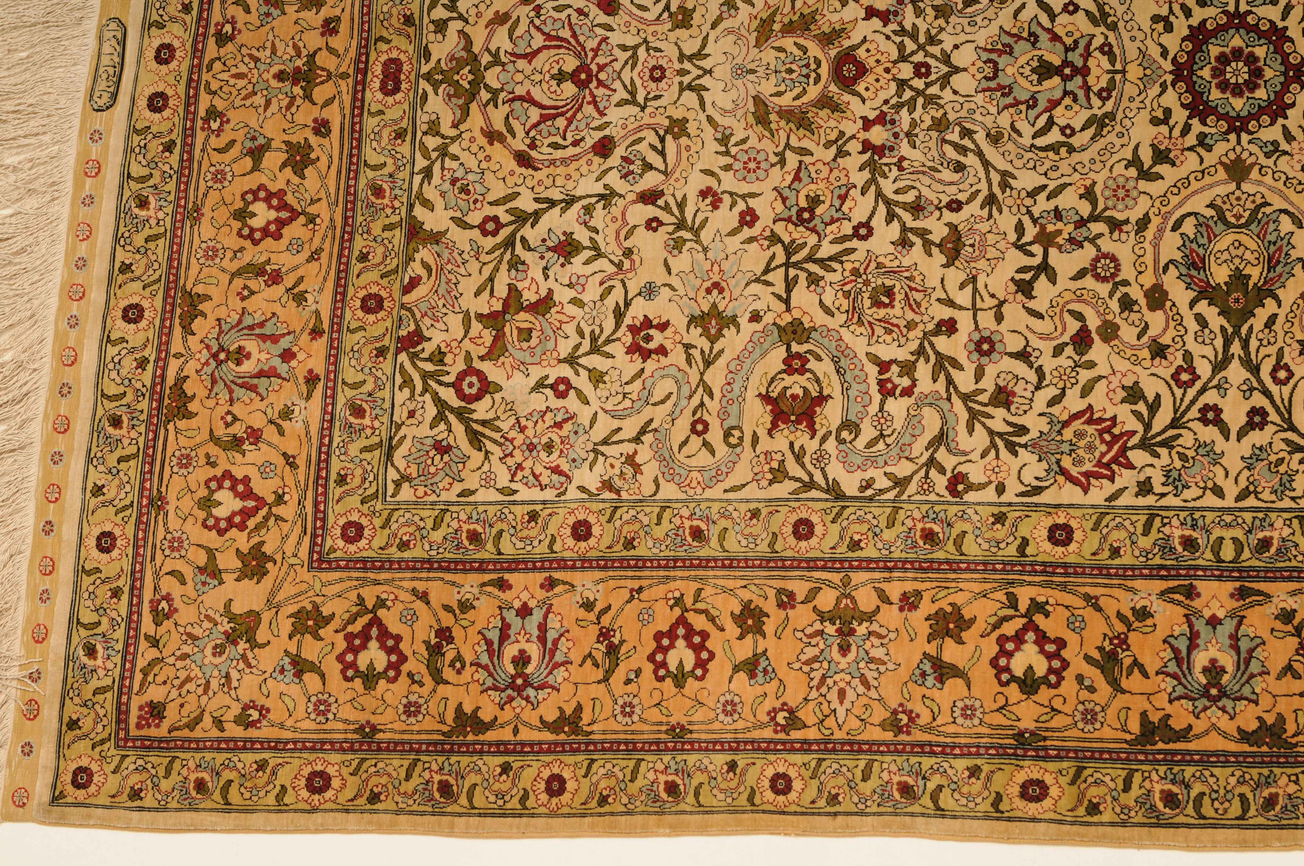 N-Türkei, um 1970. Sehr feine Knüpfung. Oben in der Mitte signiert mit "Hereke Ozbek Hereke". Dichtes florales Werk. Im hellen Mittelfeld figurieren flächendeckend filigran gearbeitete Blüten, Ranken, Palmetten und Wolkenbänder. Rosarote florale Hauptbordüre, die von 2 gelben Nebenbordüren und Borten begleitet wird. Sehr gute Erhaltung. 110x157 cm (ft. 3.6x5.2).