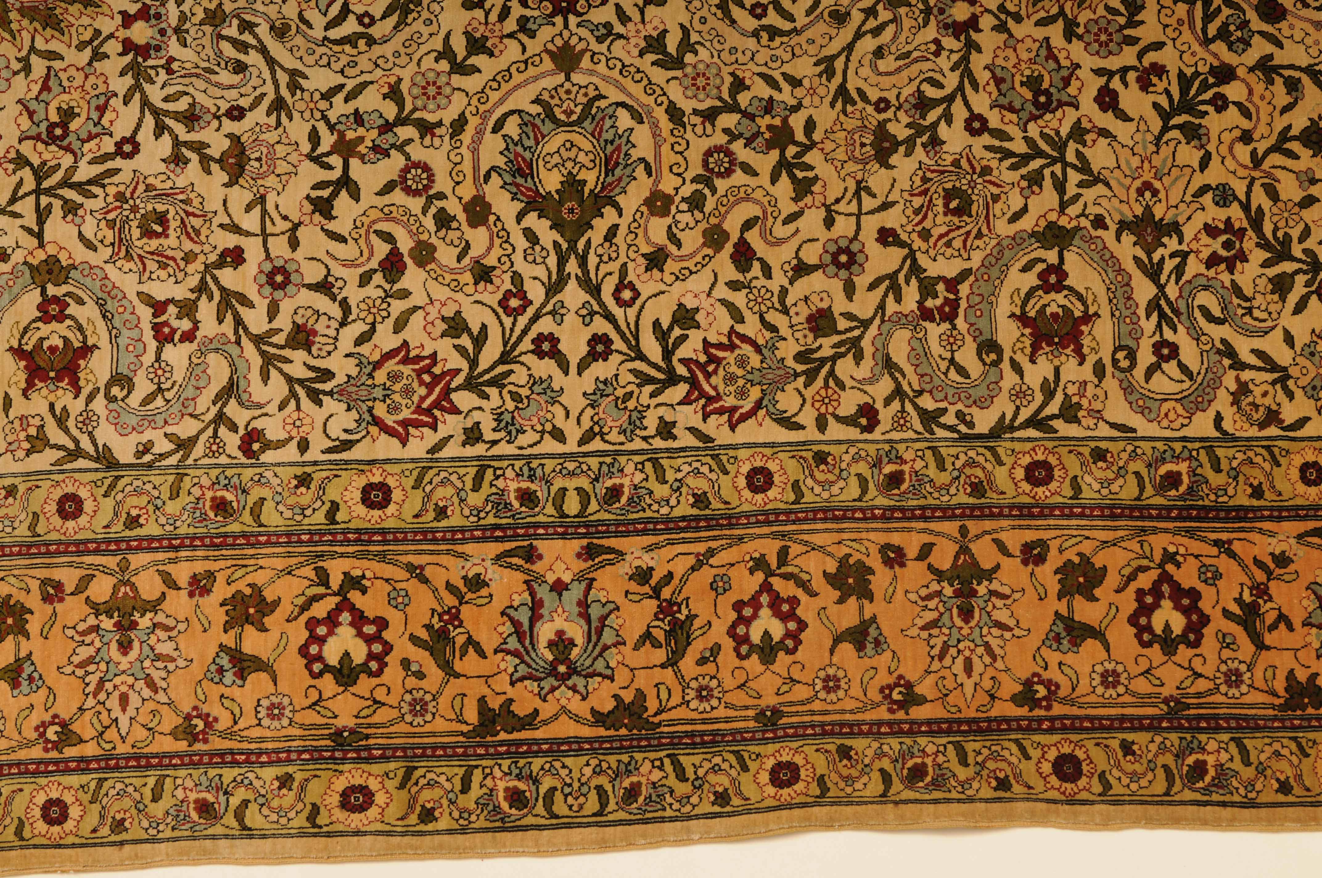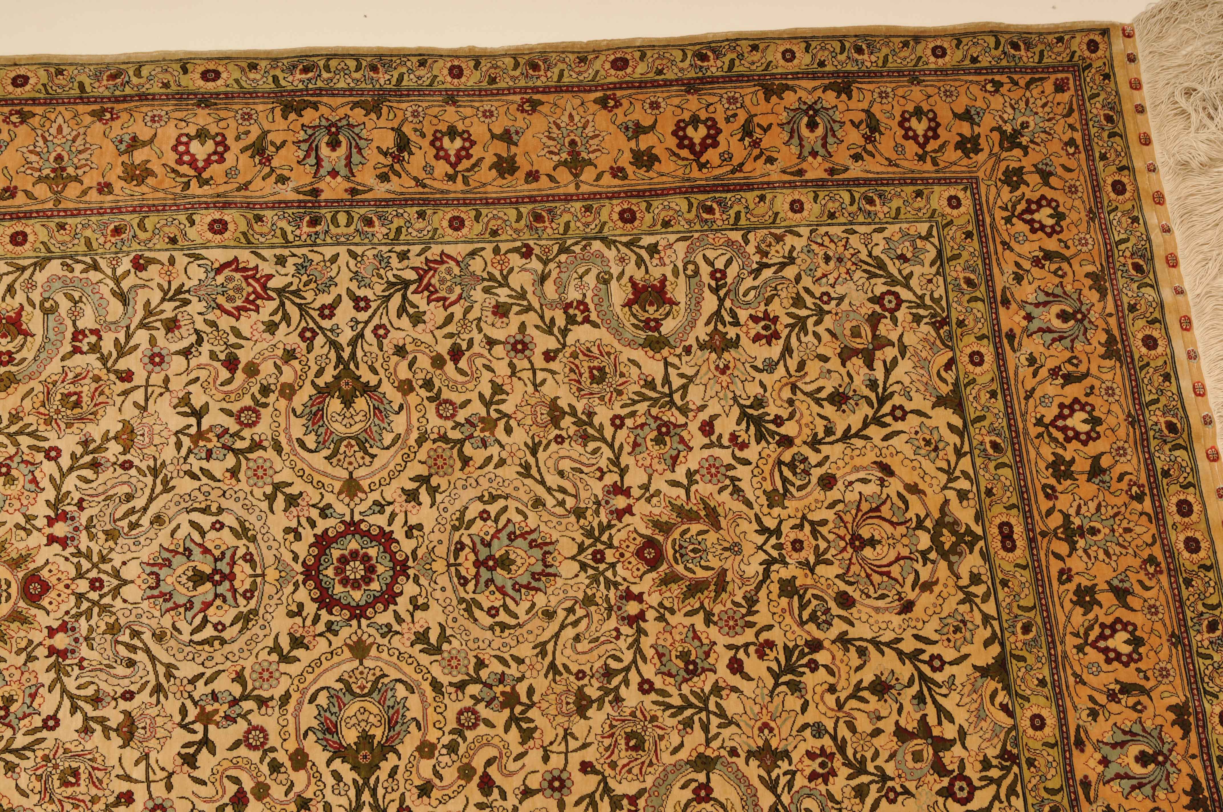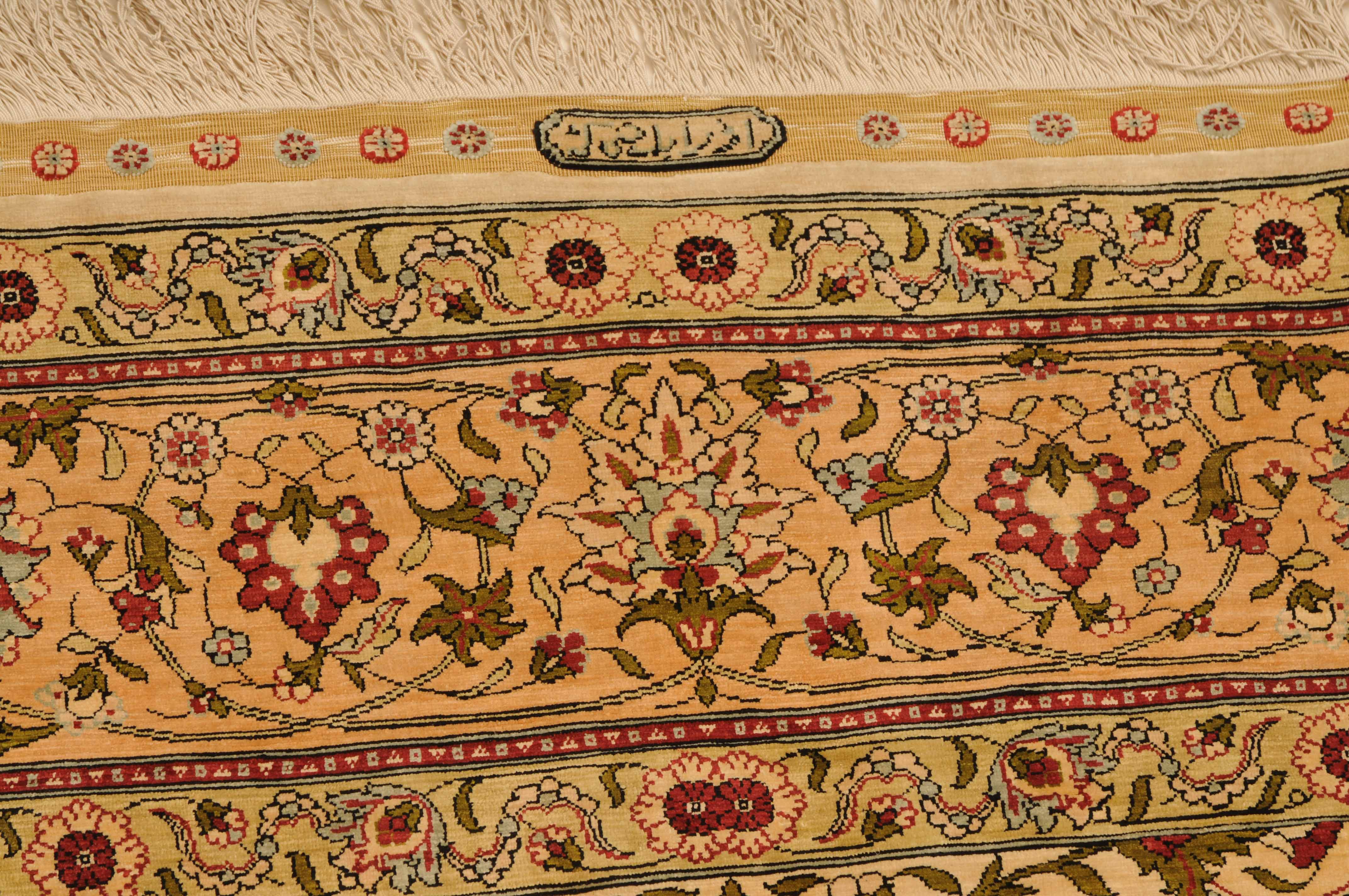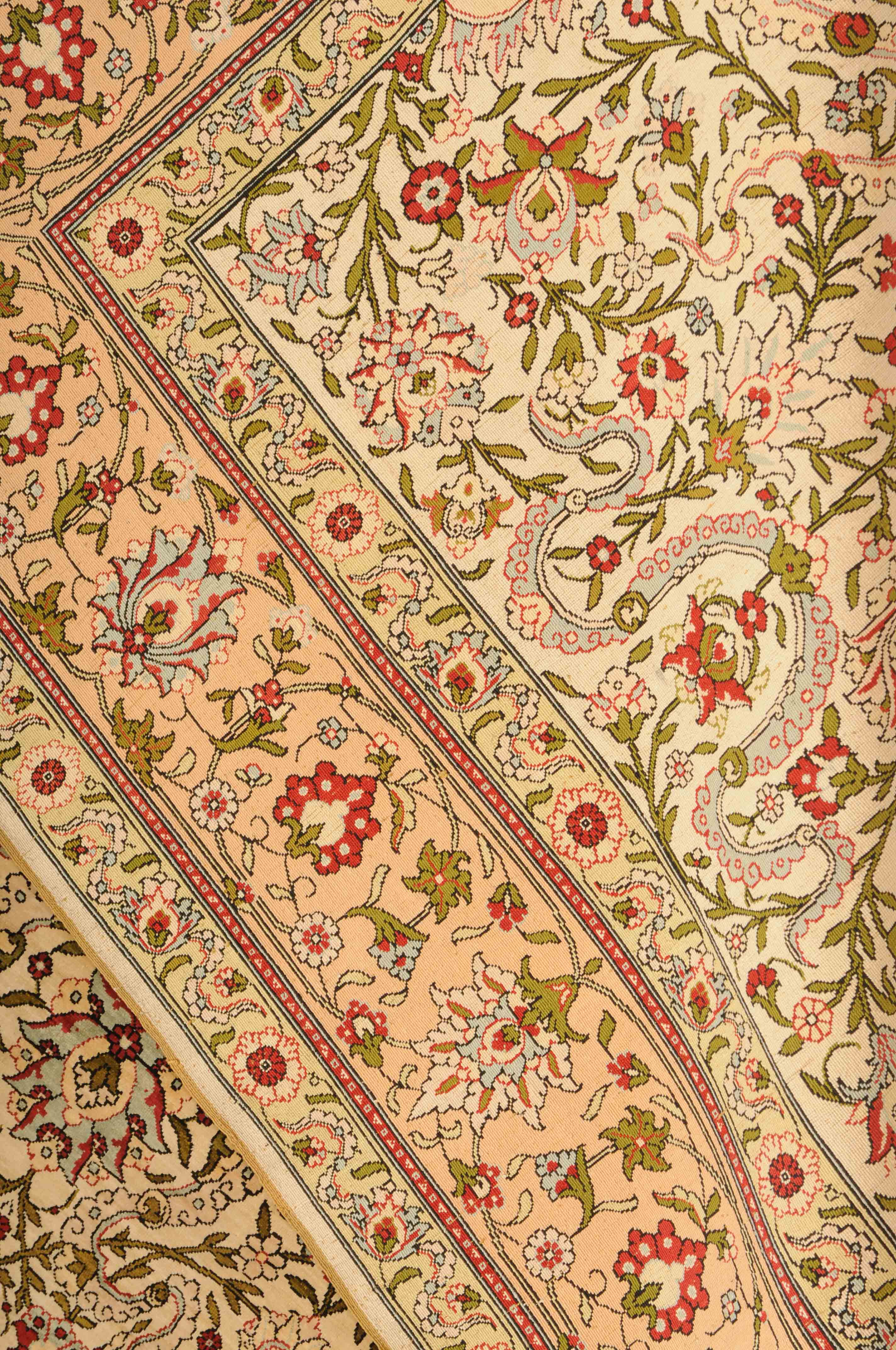 N-Türkei, um 1970. Sehr feine Knüpfung. Oben in der Mitte signiert mit "Hereke Ozbek Hereke". Dichtes florales Werk. Im hellen Mittelfeld figurieren flächendeckend filigran gearbeitete Blüten, Ranken, Palmetten und Wolkenbänder. Rosarote florale Hauptbordüre, die von 2 gelben Nebenbordüren und Borten begleitet wird. Sehr gute Erhaltung. 110x157 cm (ft. 3.6x5.2).