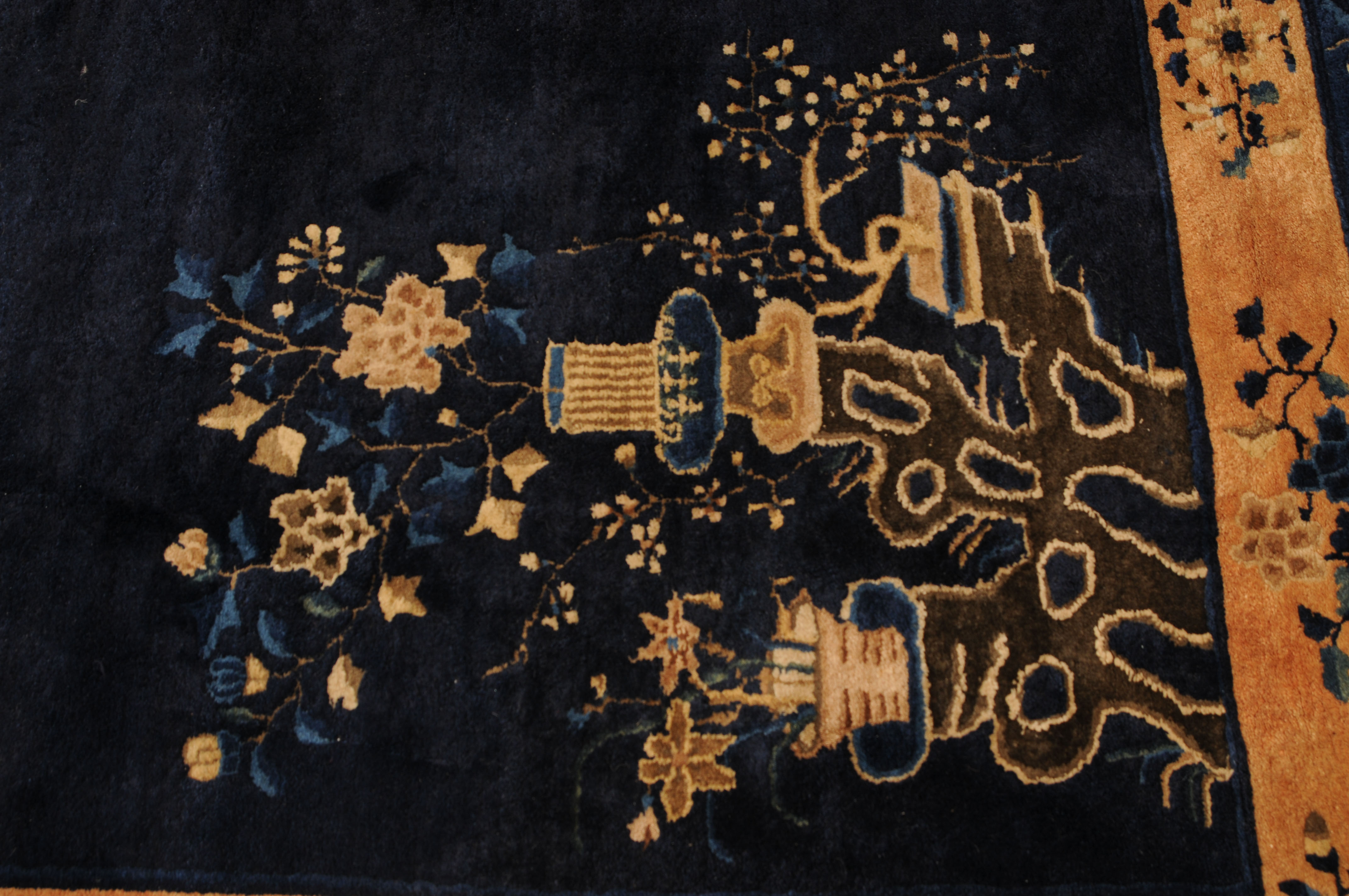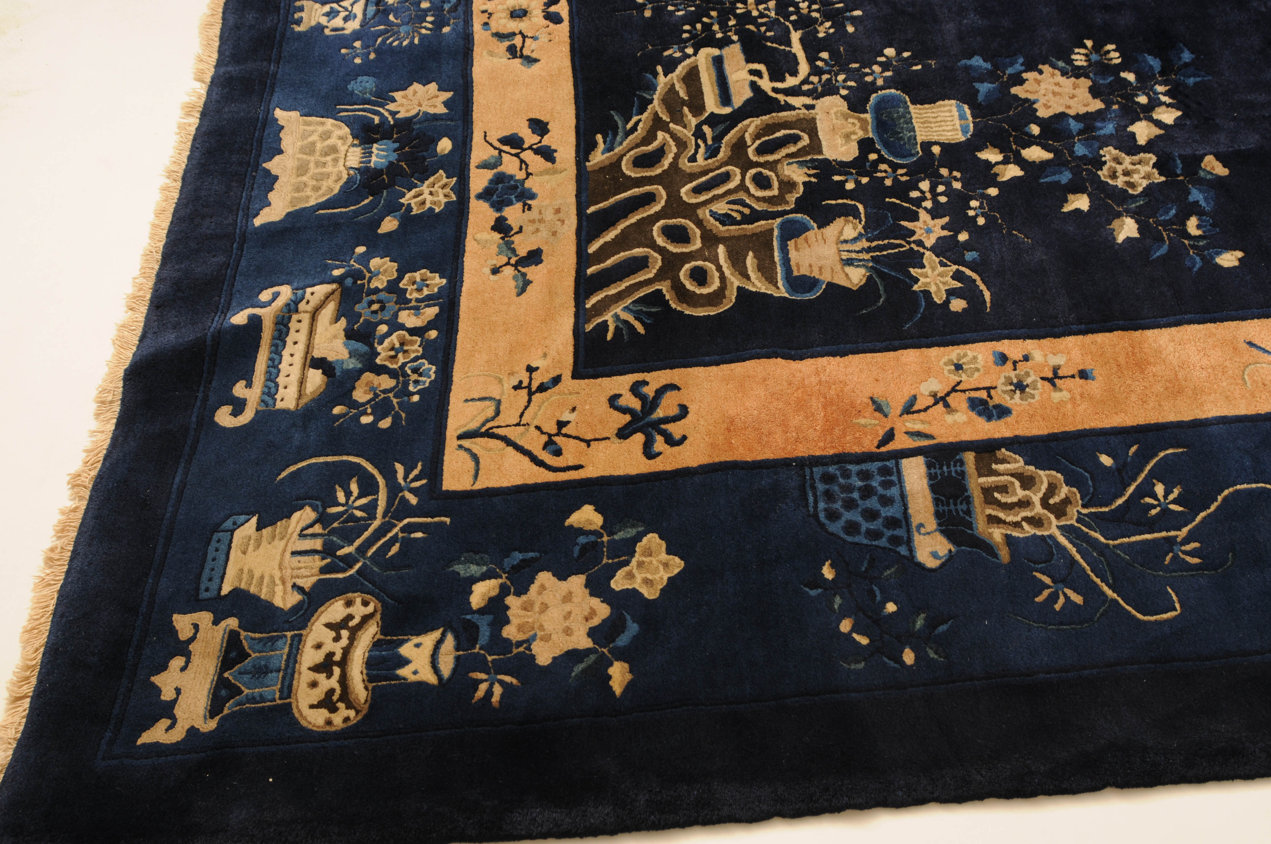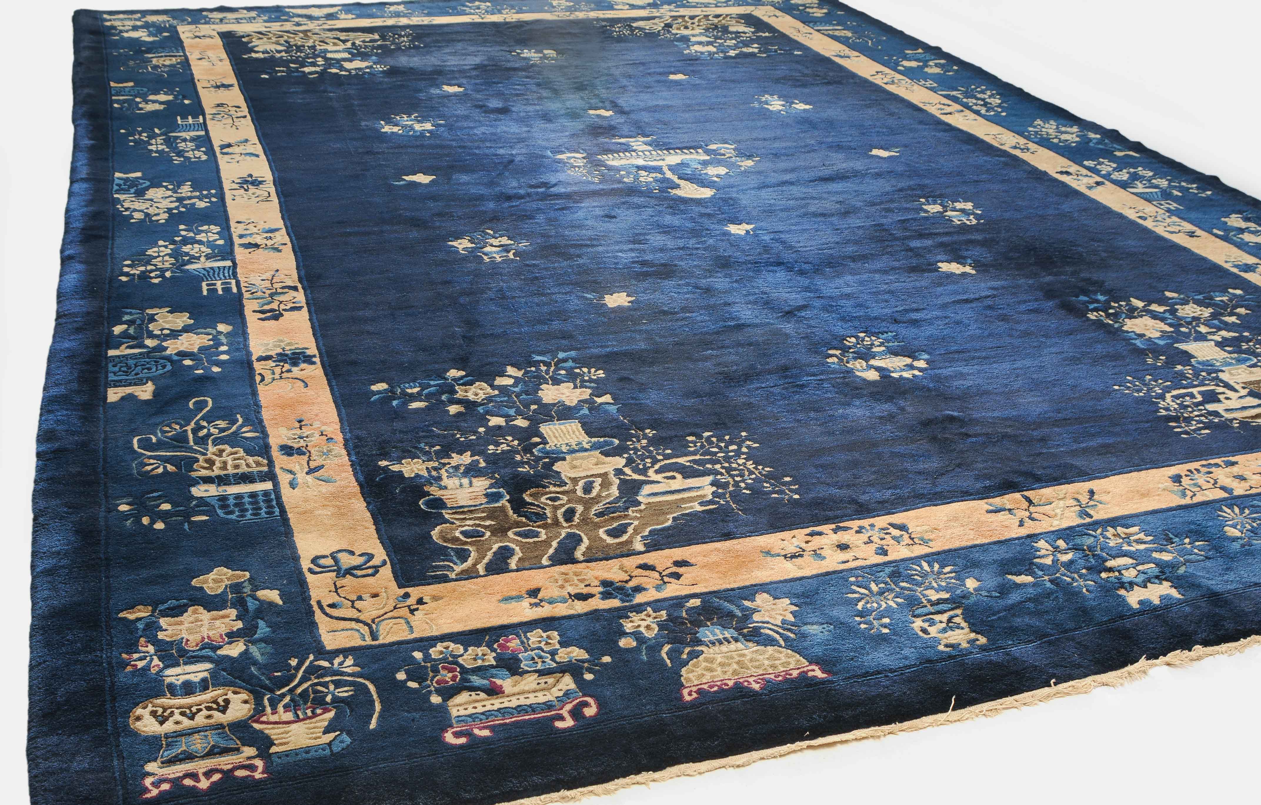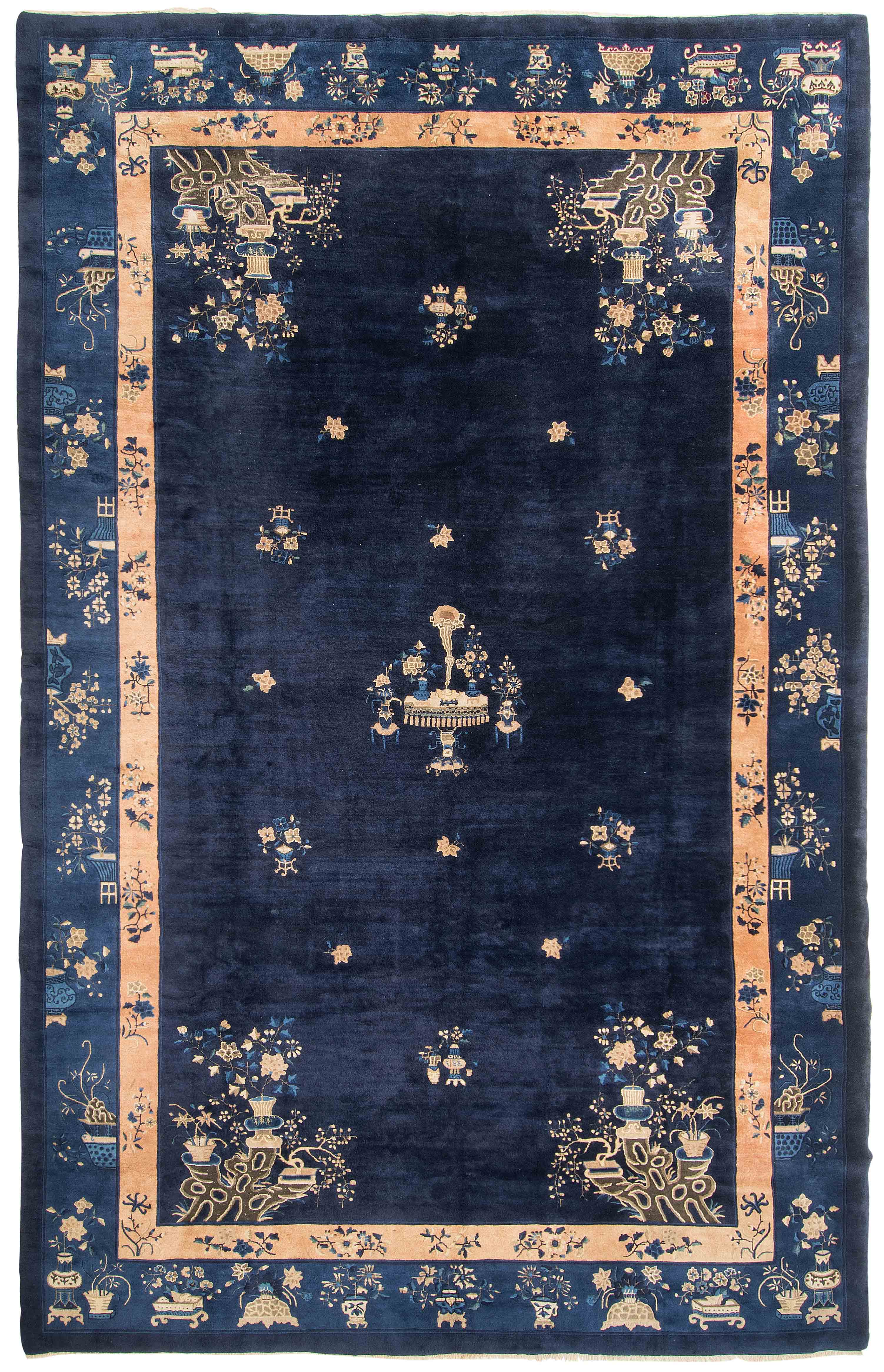China, um 1910. Auf nachtblauem Grund liegt im Zentrum ein Medaillon, bestehend aus Tischen und blumengefüllten Vasen, als Symbole für Frieden und innere Ruhe, dekorativ flankiert von Blütenranken und weiteren Vasen. Das Motiv wird in den 4 Ecken des Feldes wiederaufgenommen. Die elegant gezeichnete Hauptbordüre, im gleichen Ton gehalten wie das Feld, ist ebenfalls mit Vasen, Tischen und Blütenzweigen überzogen. Reparierte Stelle in der Bordüre, ansonsten sehr gute Erhaltung. 370x586 cm (ft. 12.2x19.3).