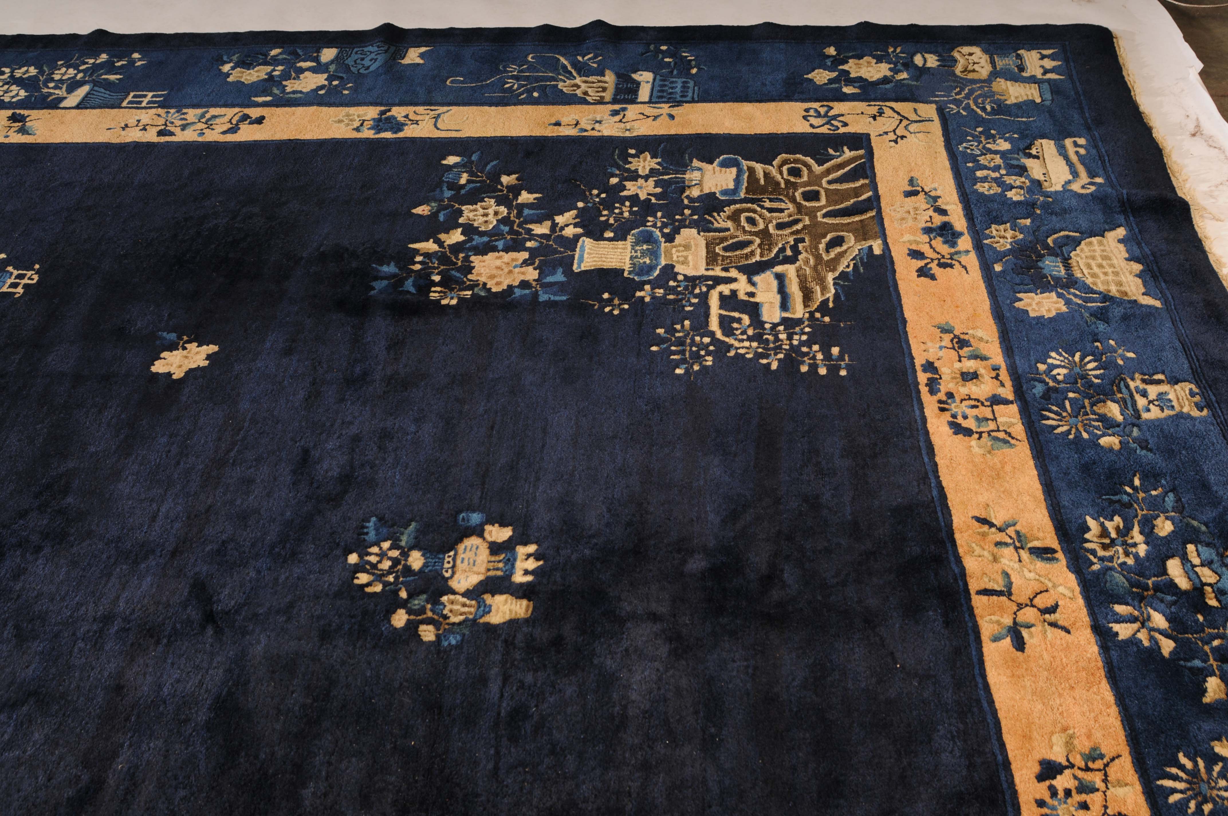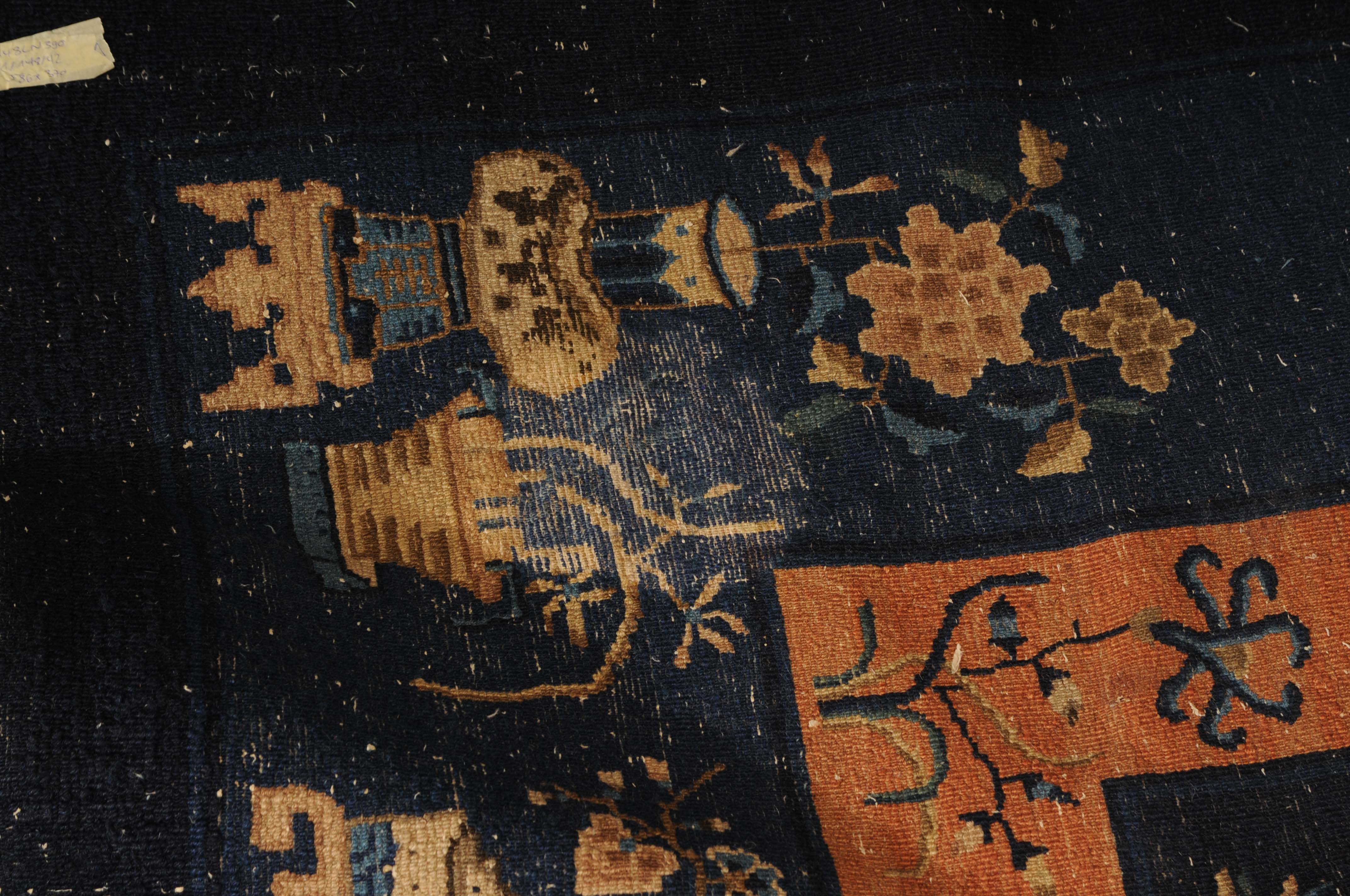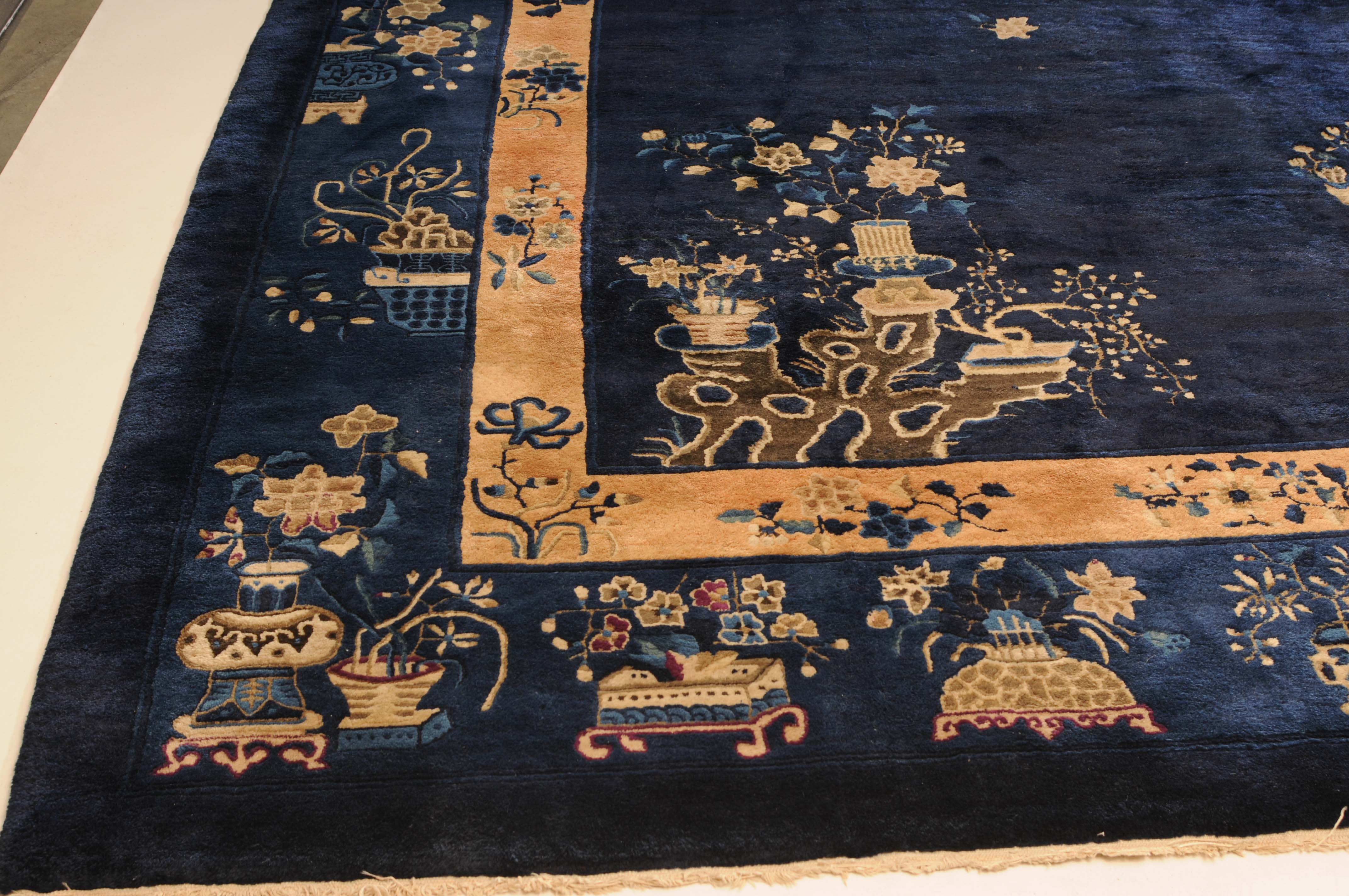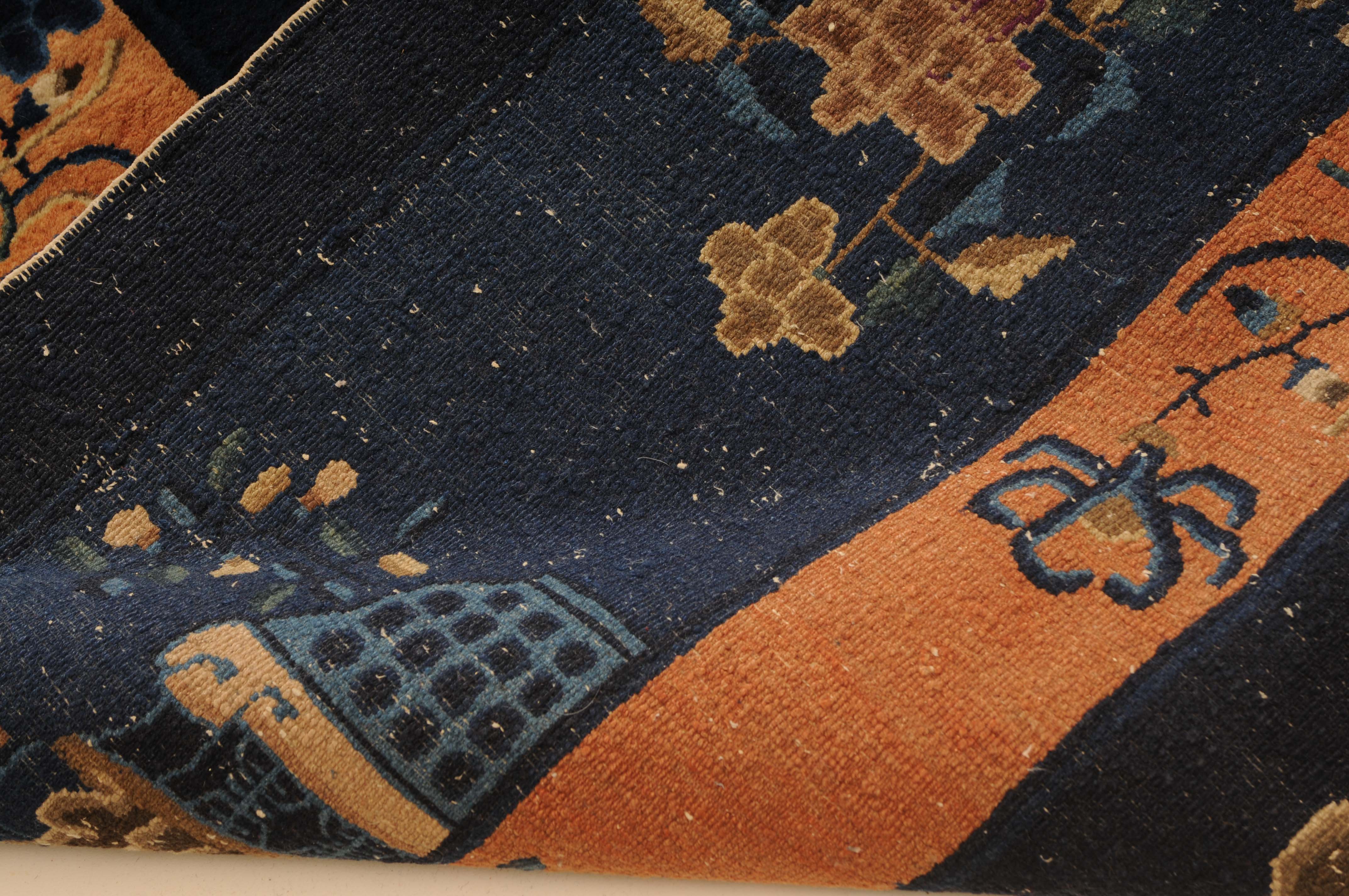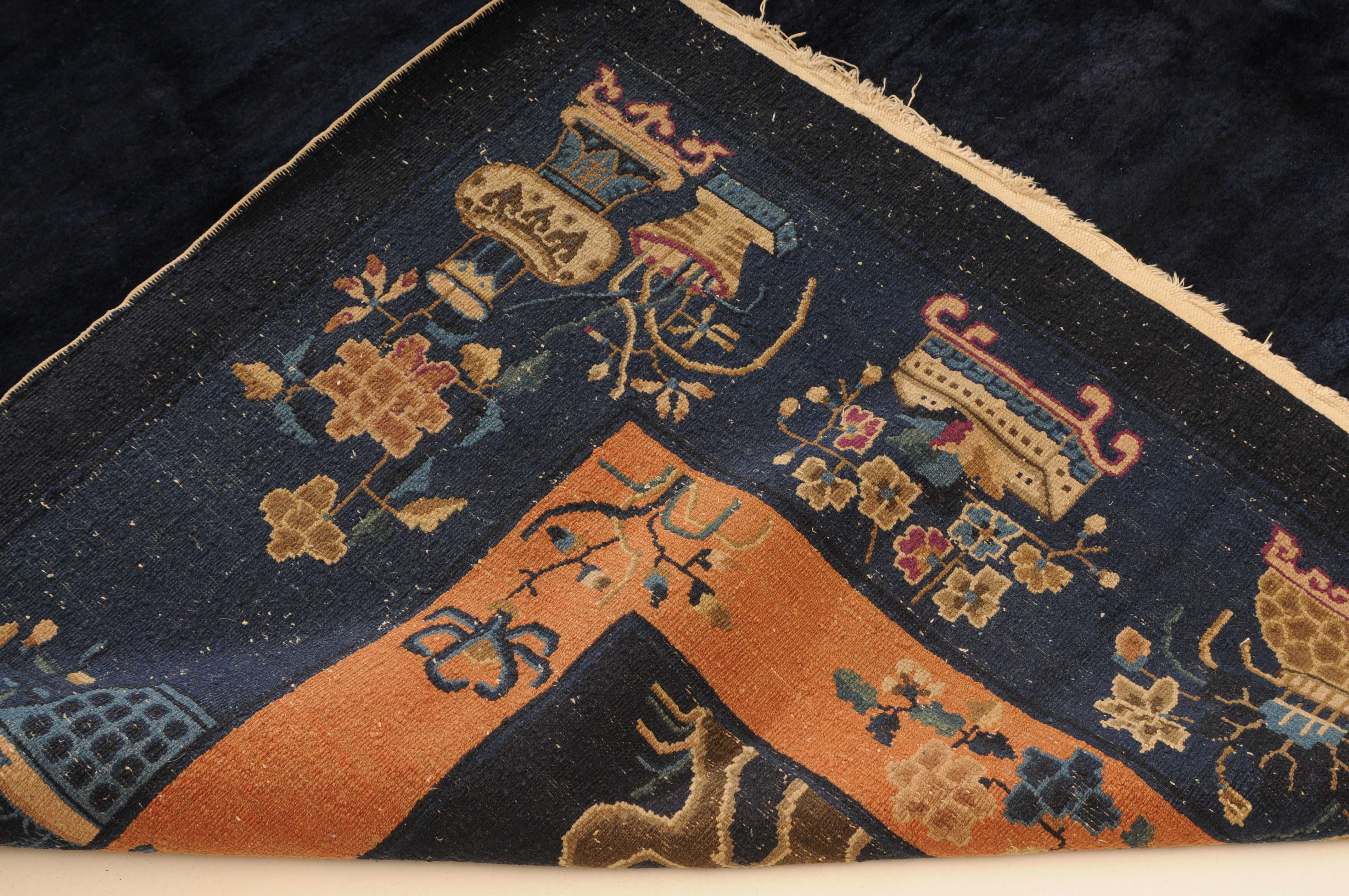 China, um 1910. Auf nachtblauem Grund liegt im Zentrum ein Medaillon, bestehend aus Tischen und blumengefüllten Vasen, als Symbole für Frieden und innere Ruhe, dekorativ flankiert von Blütenranken und weiteren Vasen. Das Motiv wird in den 4 Ecken des Feldes wiederaufgenommen. Die elegant gezeichnete Hauptbordüre, im gleichen Ton gehalten wie das Feld, ist ebenfalls mit Vasen, Tischen und Blütenzweigen überzogen. Reparierte Stelle in der Bordüre, ansonsten sehr gute Erhaltung. 370x586 cm (ft. 12.2x19.3).