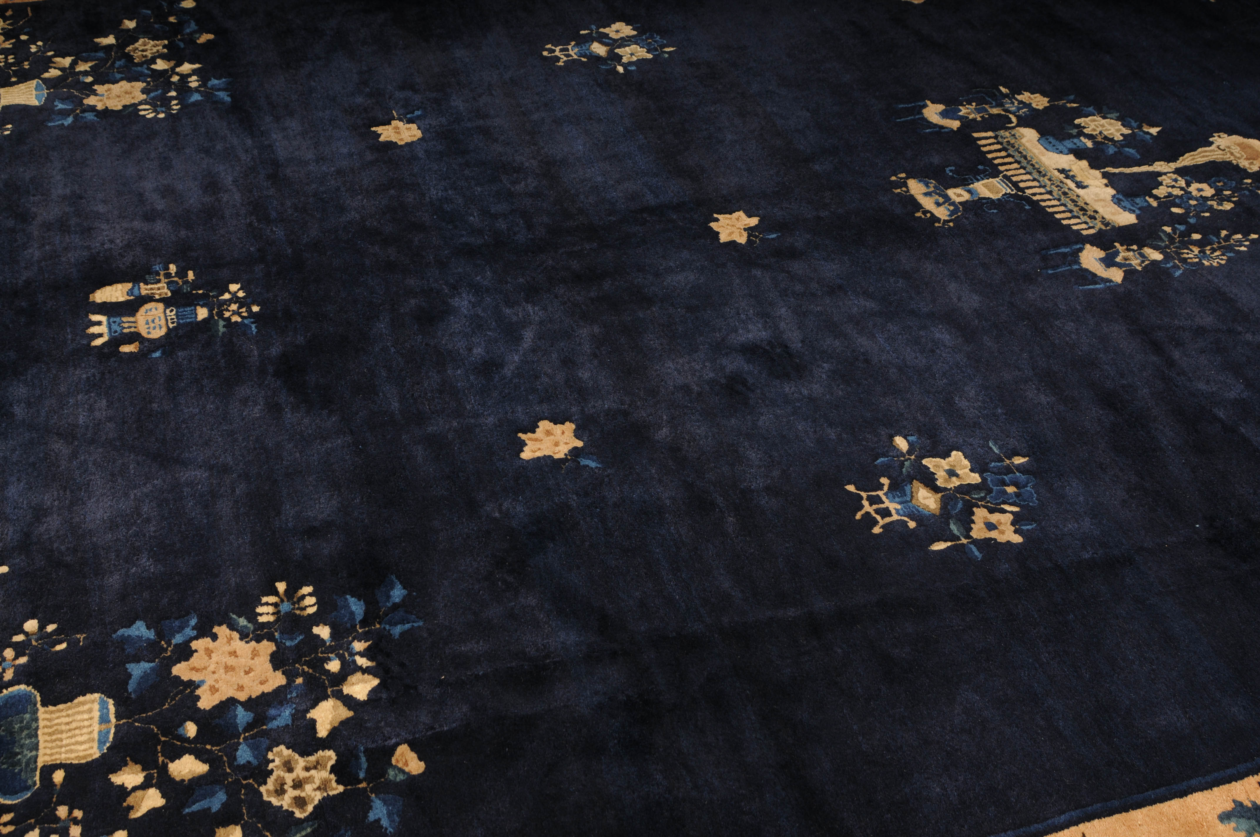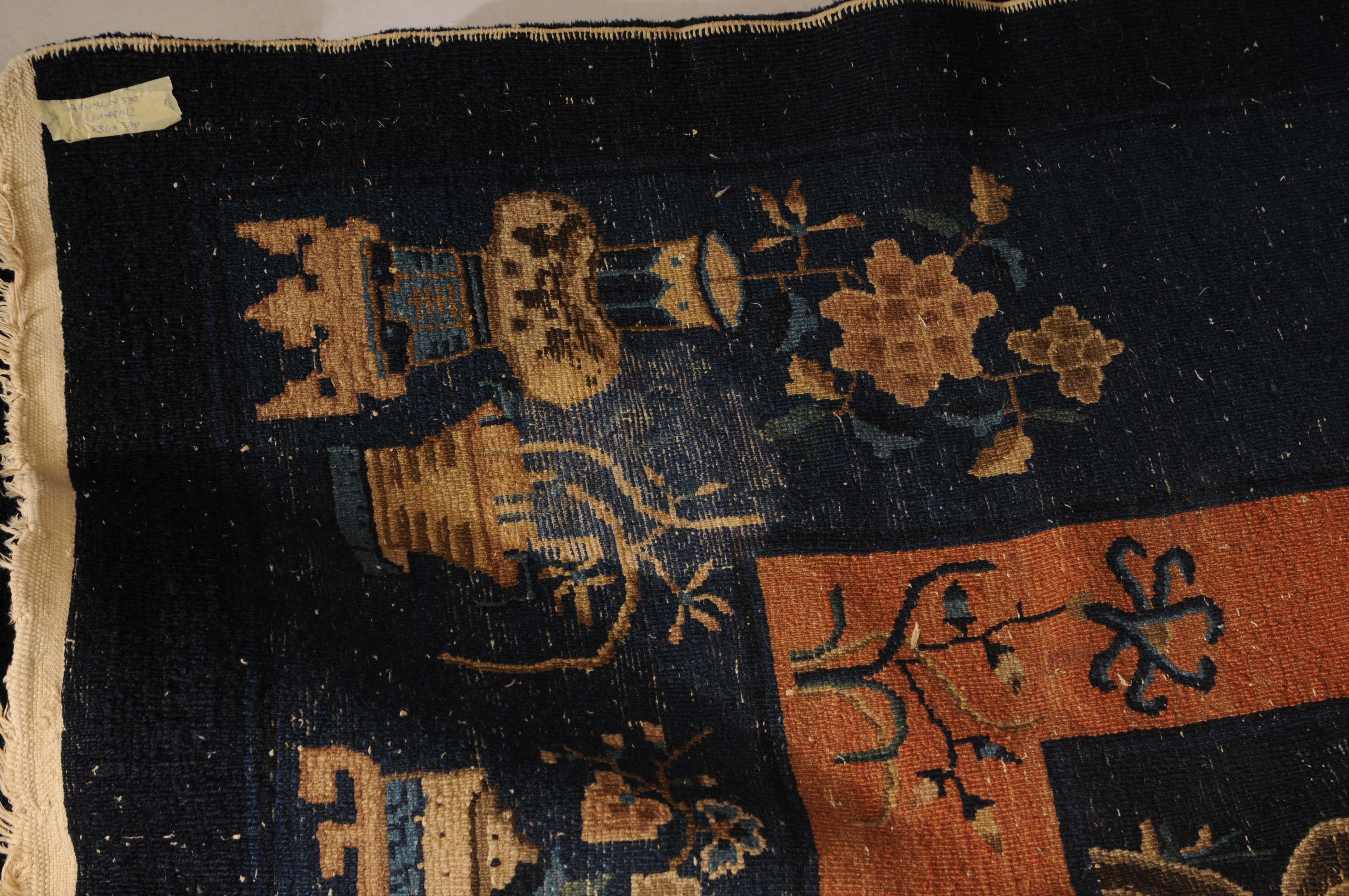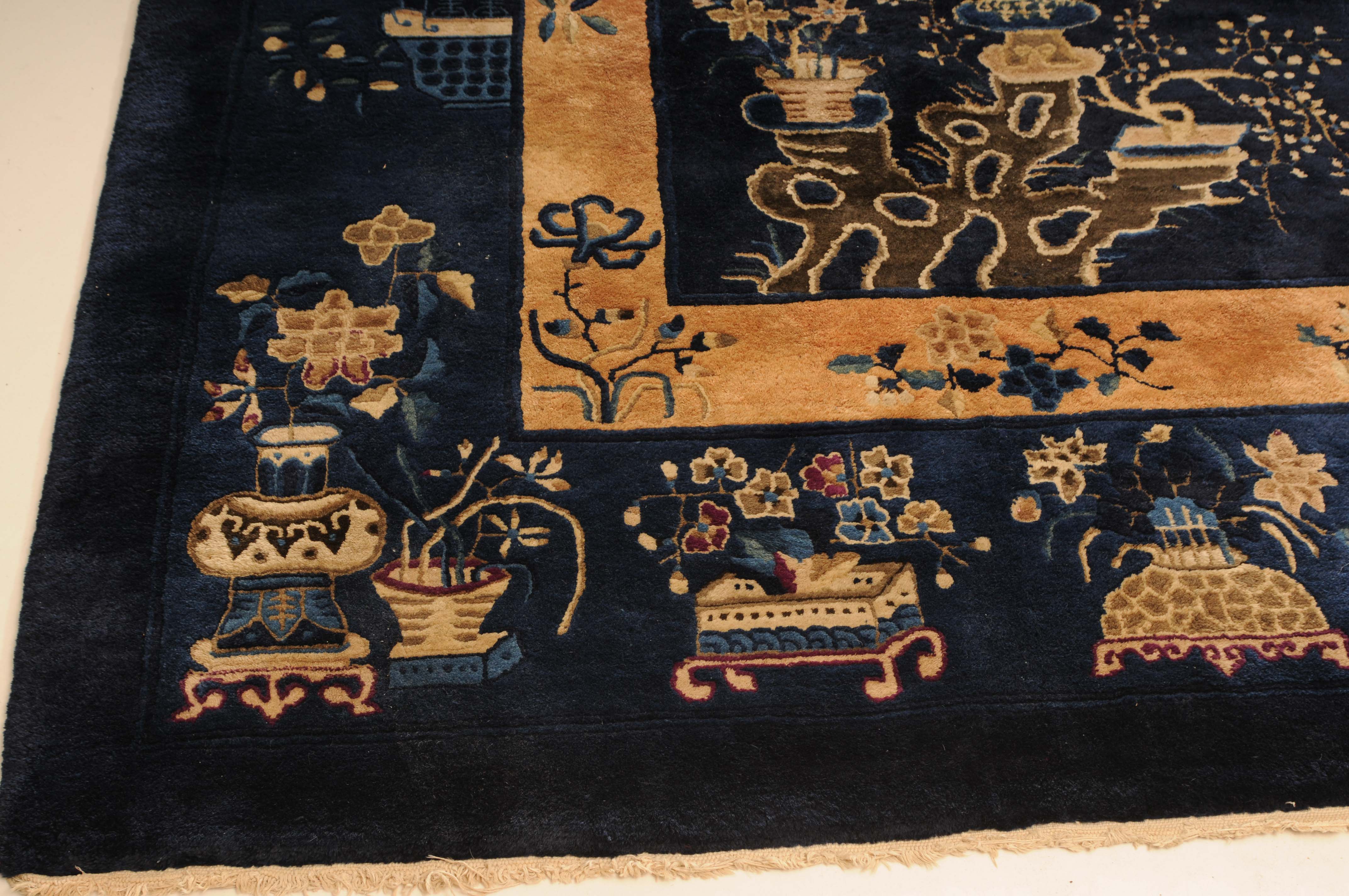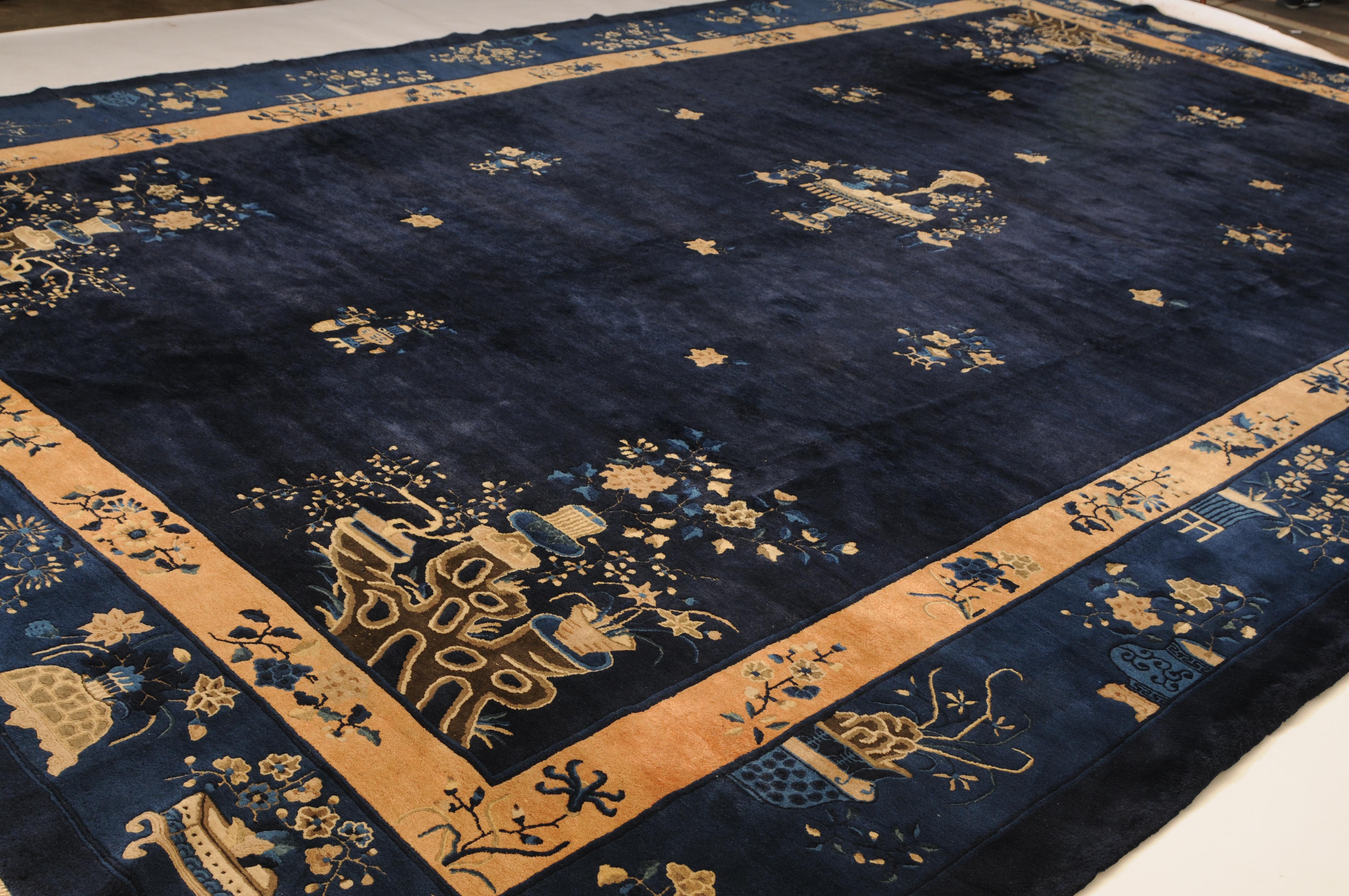 China, um 1910. Auf nachtblauem Grund liegt im Zentrum ein Medaillon, bestehend aus Tischen und blumengefüllten Vasen, als Symbole für Frieden und innere Ruhe, dekorativ flankiert von Blütenranken und weiteren Vasen. Das Motiv wird in den 4 Ecken des Feldes wiederaufgenommen. Die elegant gezeichnete Hauptbordüre, im gleichen Ton gehalten wie das Feld, ist ebenfalls mit Vasen, Tischen und Blütenzweigen überzogen. Reparierte Stelle in der Bordüre, ansonsten sehr gute Erhaltung. 370x586 cm (ft. 12.2x19.3).