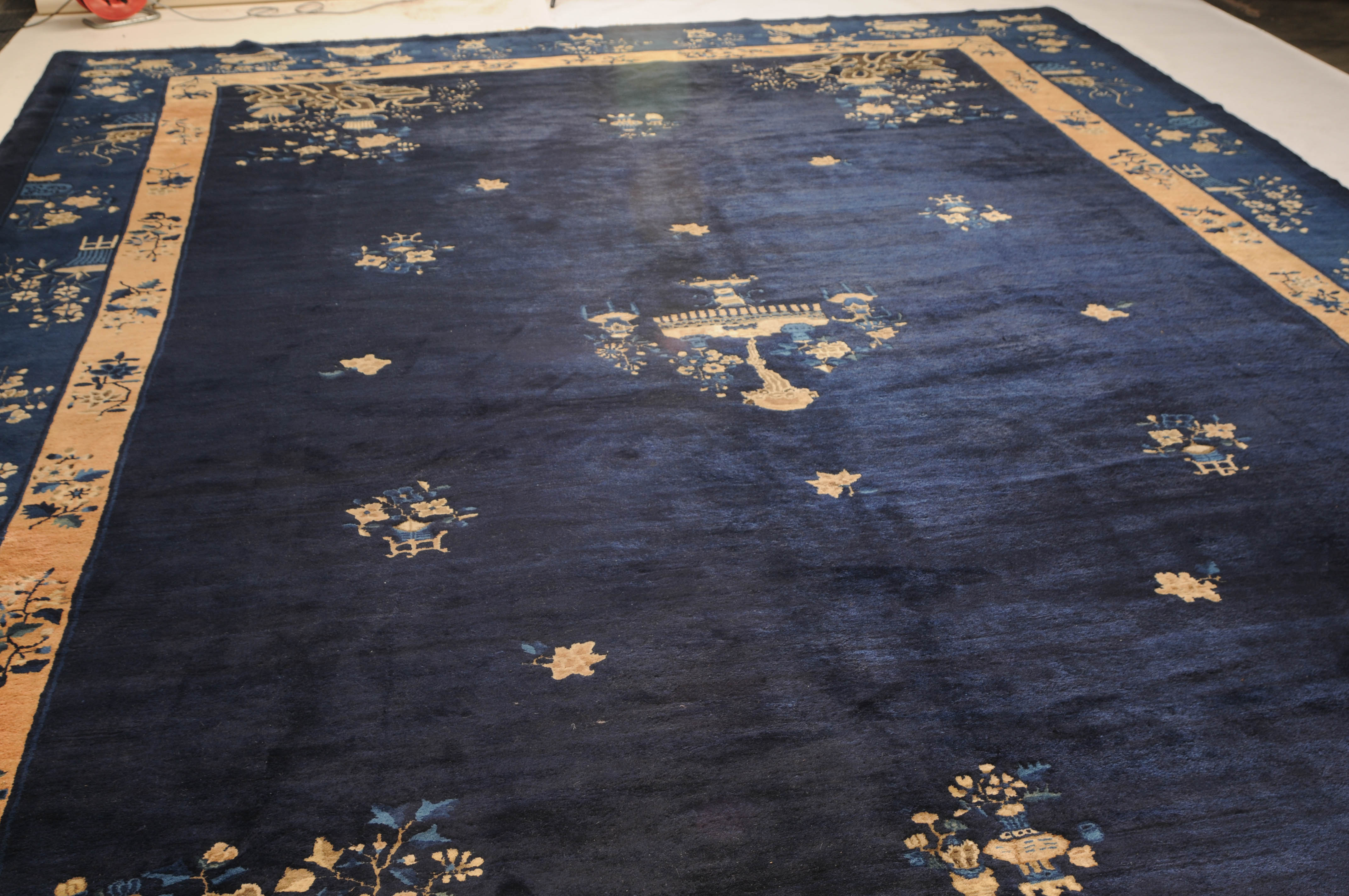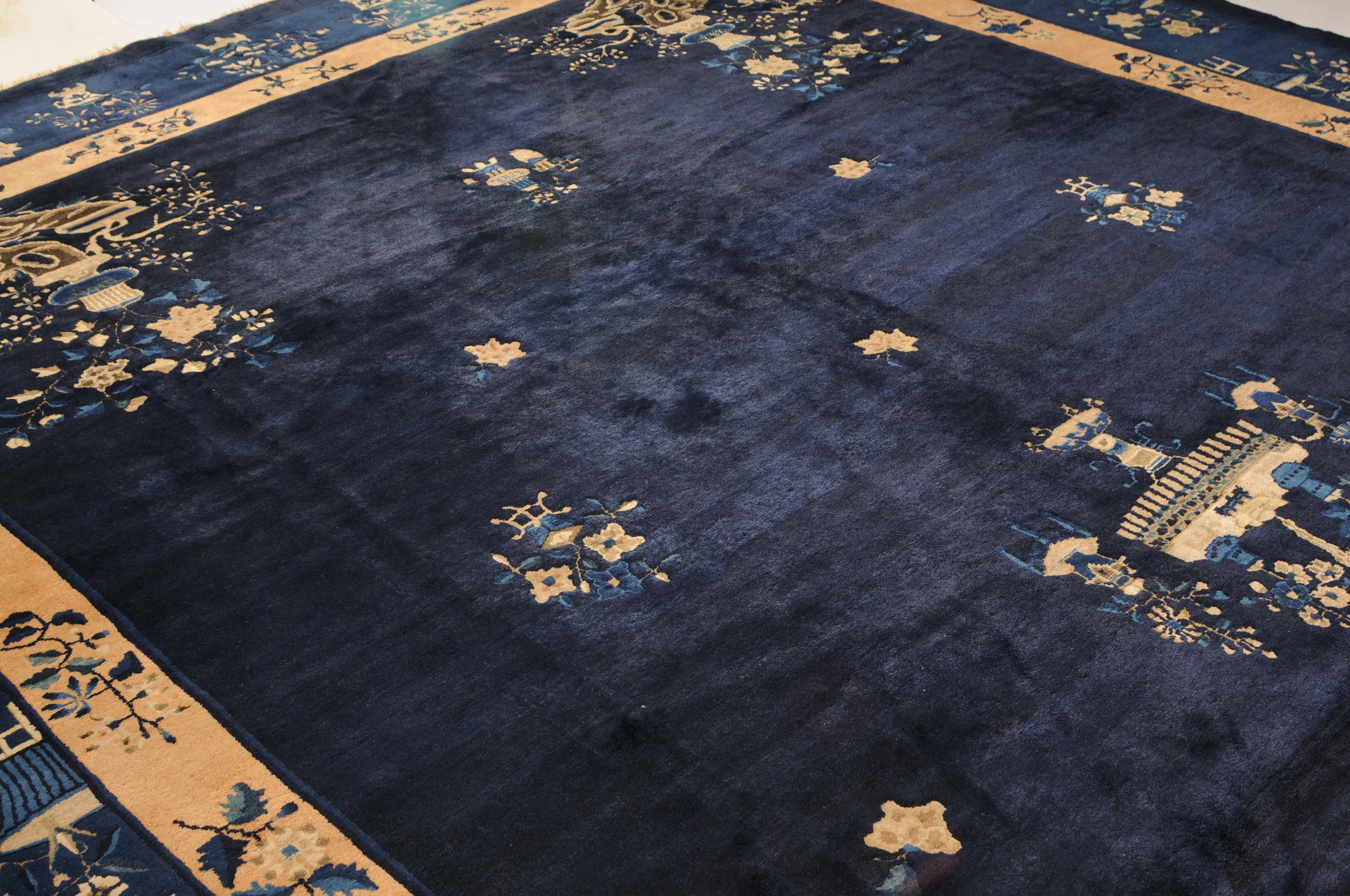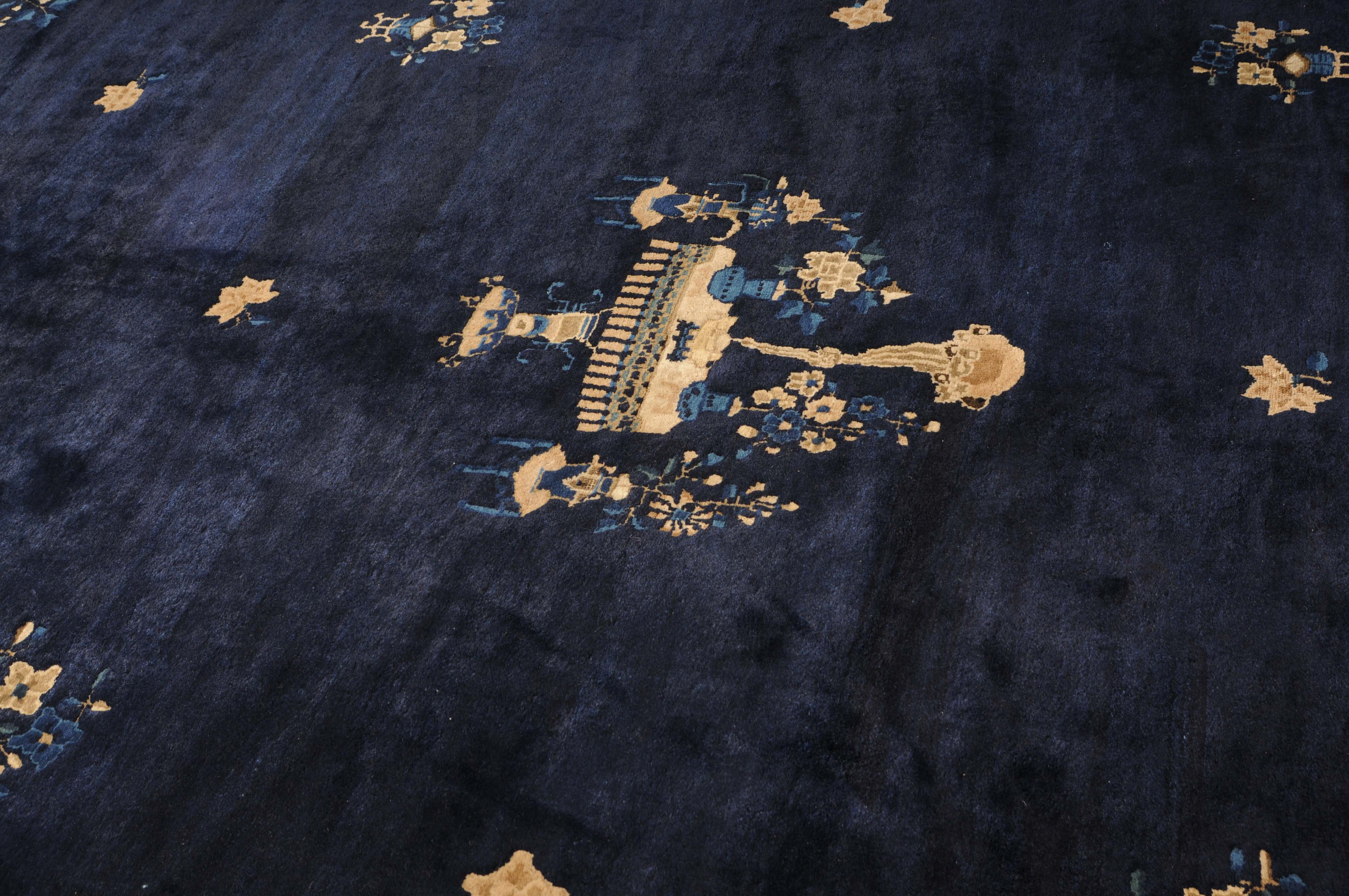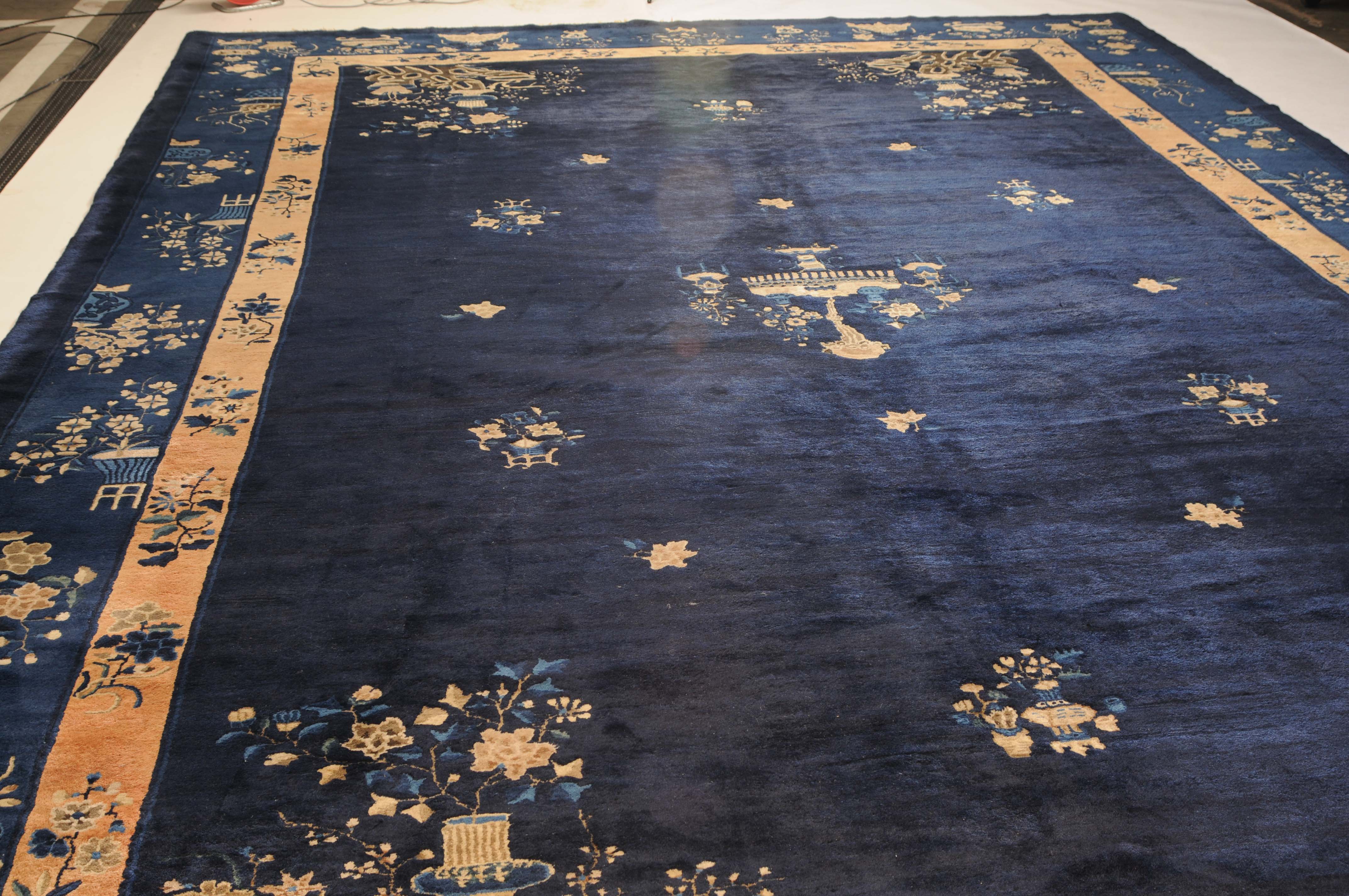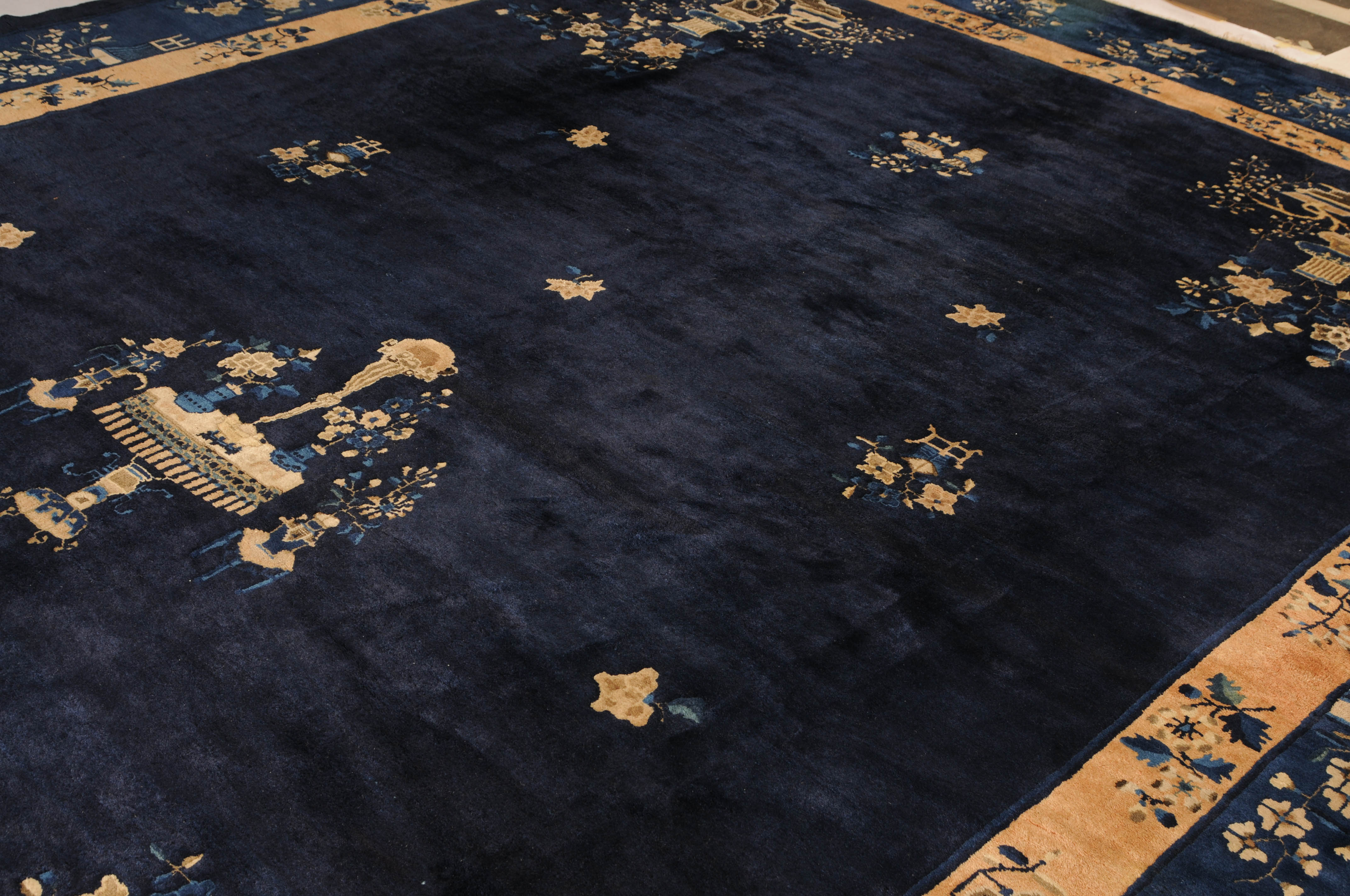 China, um 1910. Auf nachtblauem Grund liegt im Zentrum ein Medaillon, bestehend aus Tischen und blumengefüllten Vasen, als Symbole für Frieden und innere Ruhe, dekorativ flankiert von Blütenranken und weiteren Vasen. Das Motiv wird in den 4 Ecken des Feldes wiederaufgenommen. Die elegant gezeichnete Hauptbordüre, im gleichen Ton gehalten wie das Feld, ist ebenfalls mit Vasen, Tischen und Blütenzweigen überzogen. Reparierte Stelle in der Bordüre, ansonsten sehr gute Erhaltung. 370x586 cm (ft. 12.2x19.3).