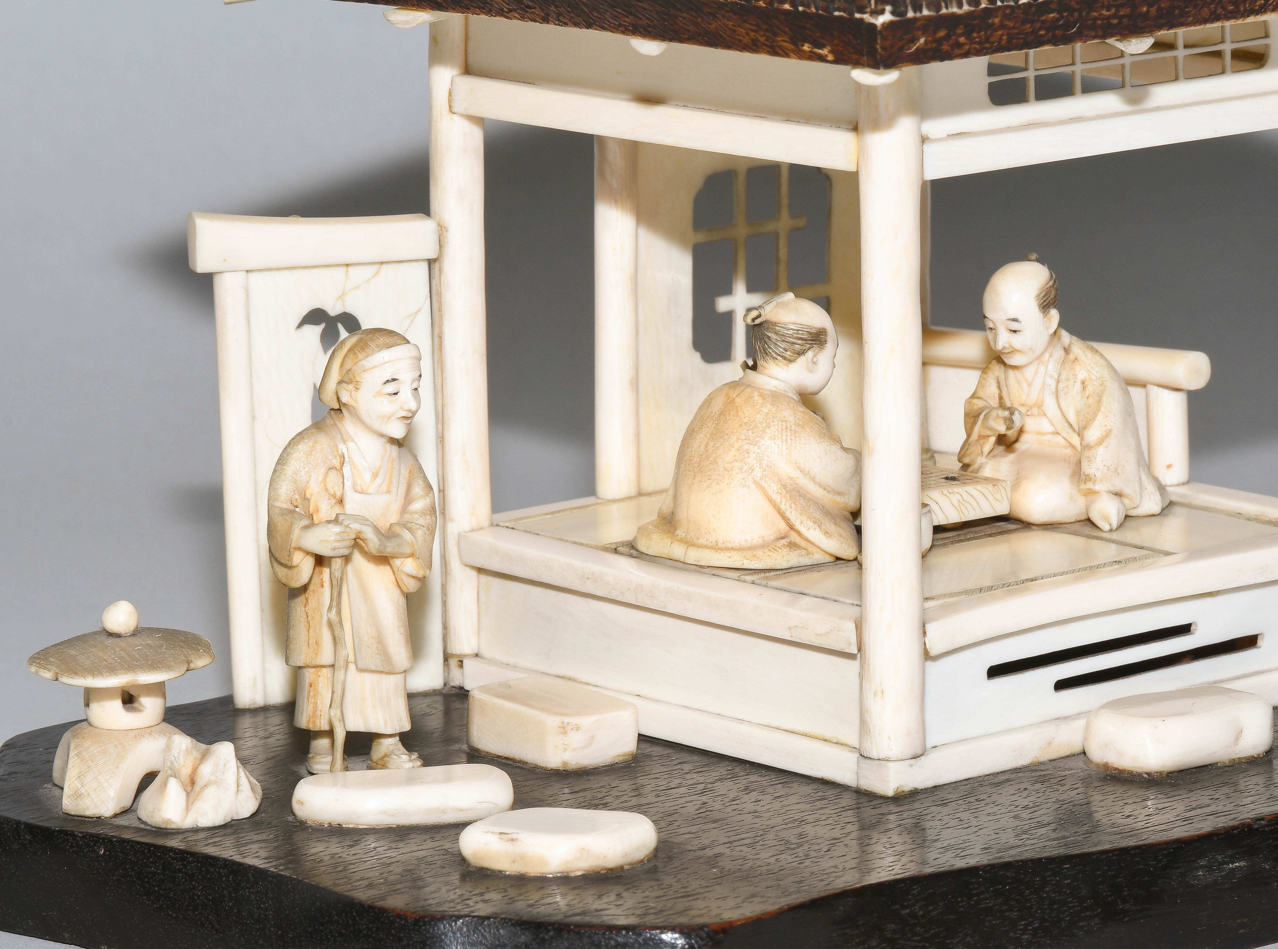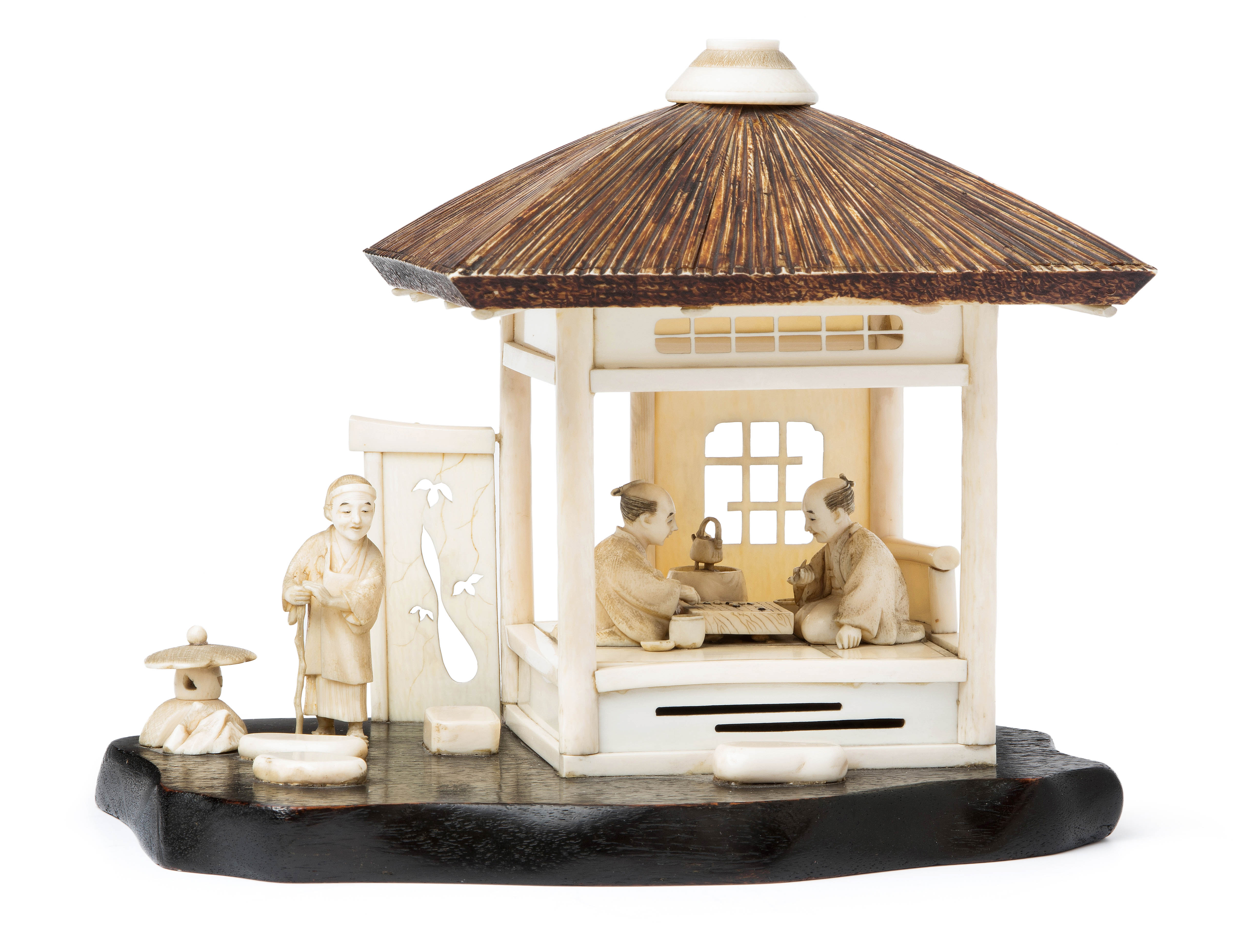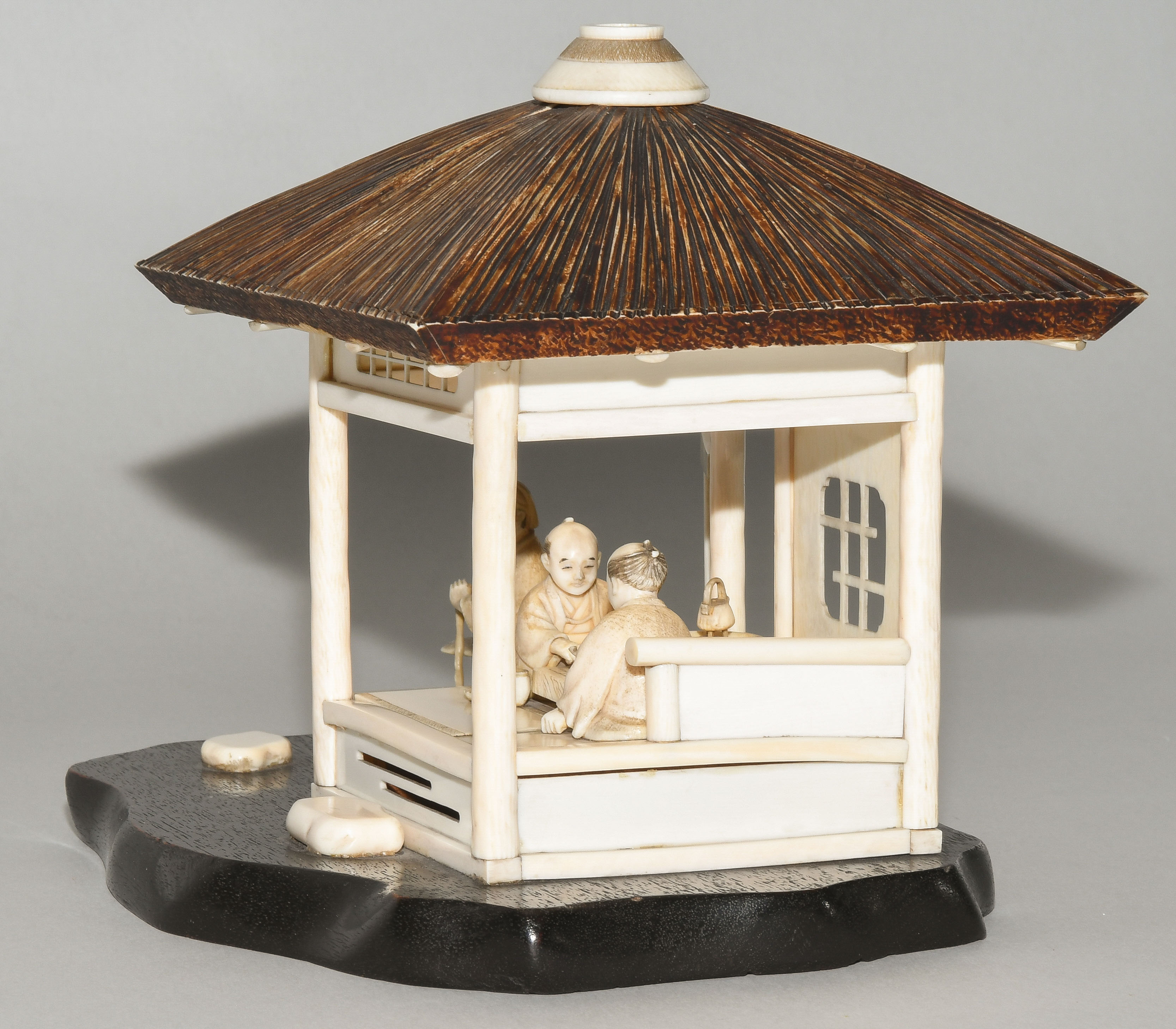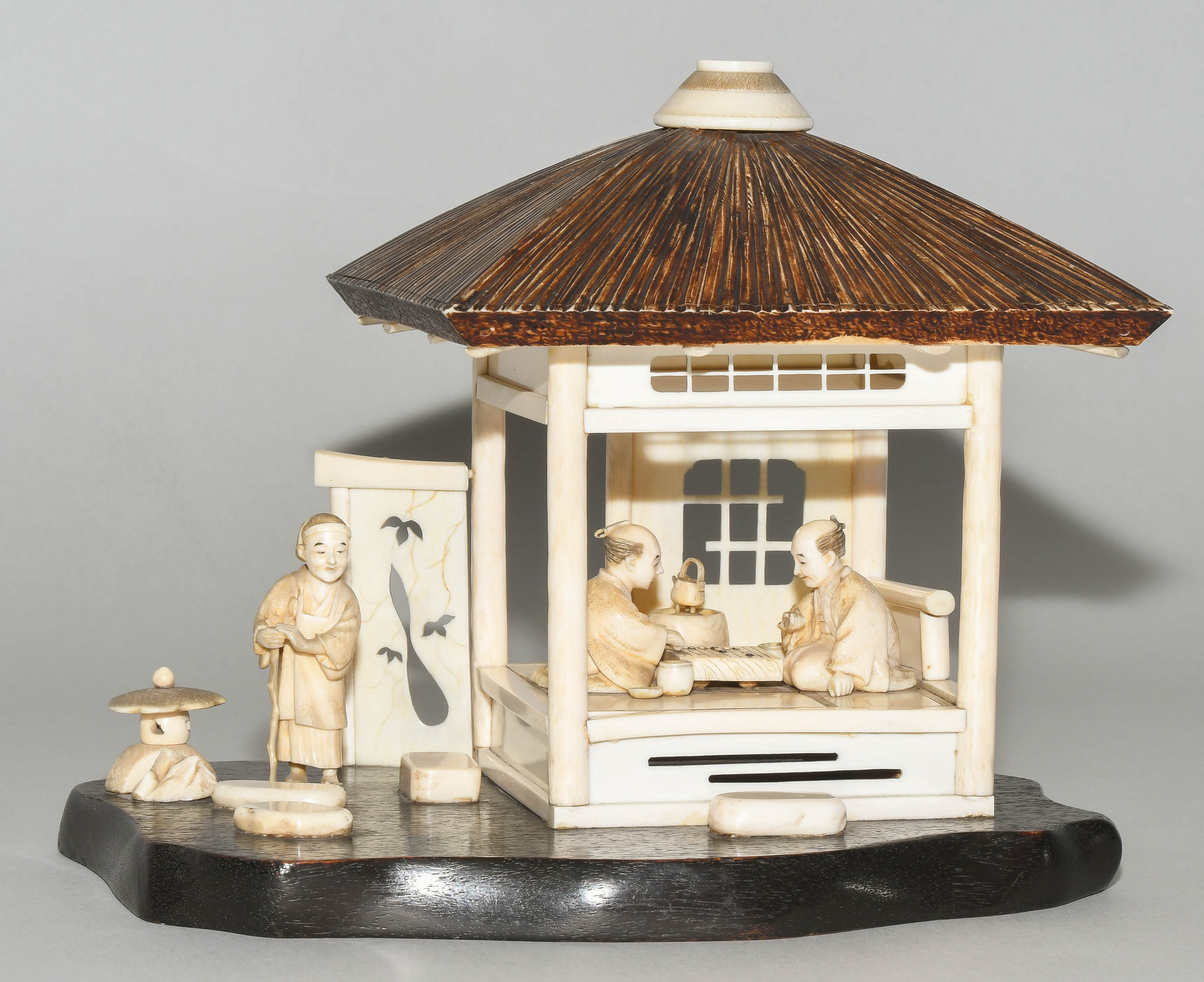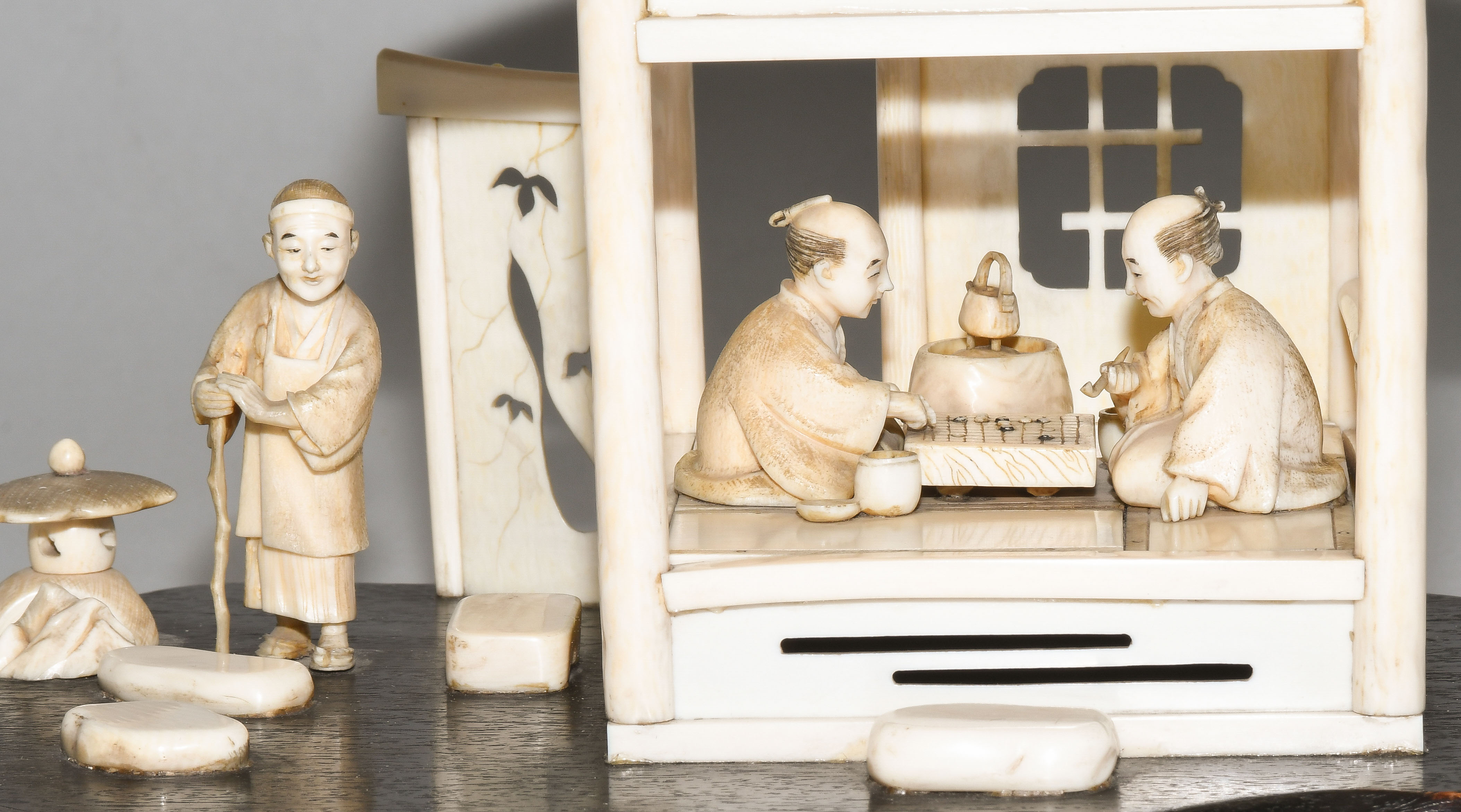 Japan. Elfenbein auf Holz montiert. Zwei Männer in Gartenpavillion geniessen ihre Zeit beim Go-Spiel. Ein dritter Mann mit Stock im Garten stehend. H 15,5, L 20,5 cm.