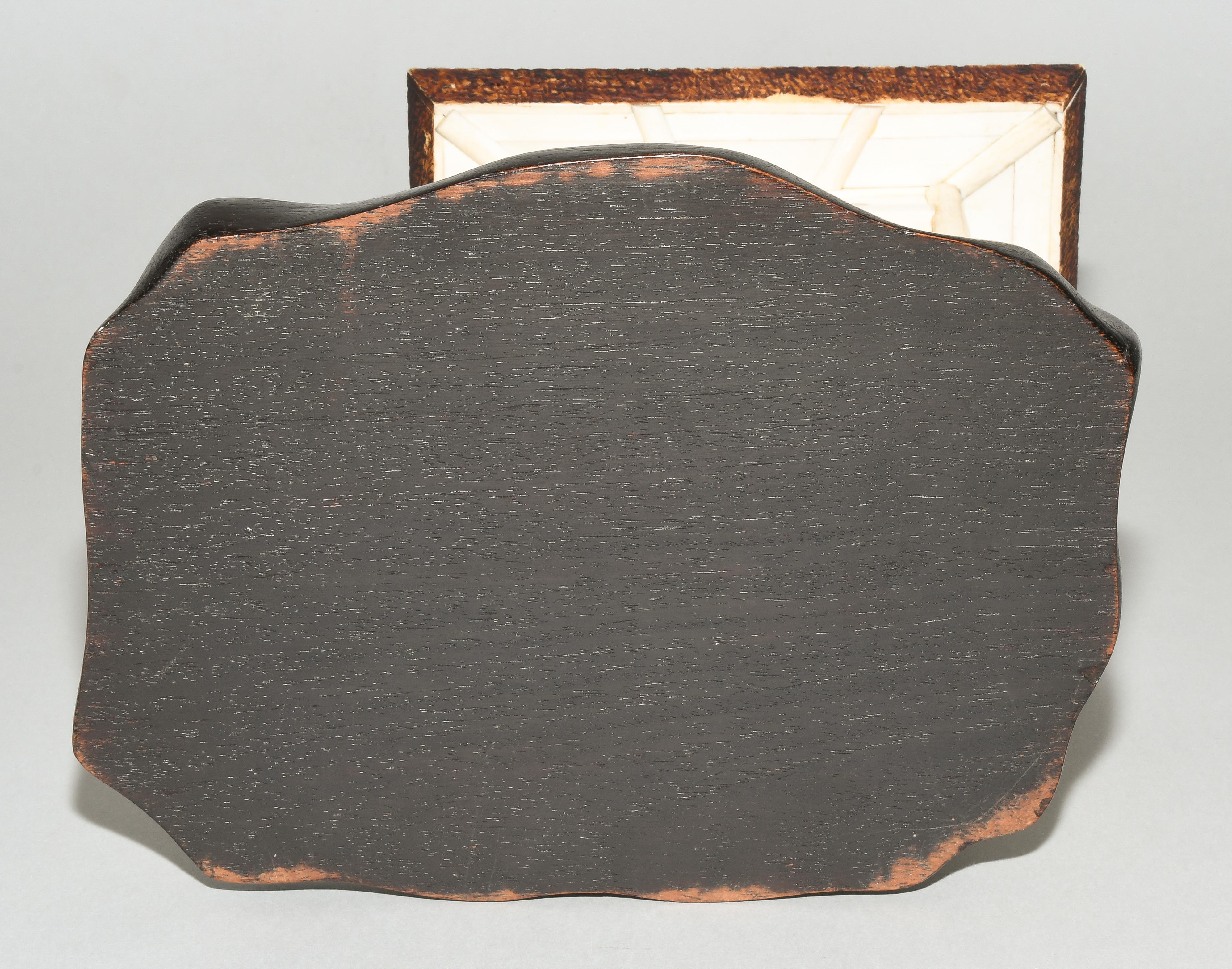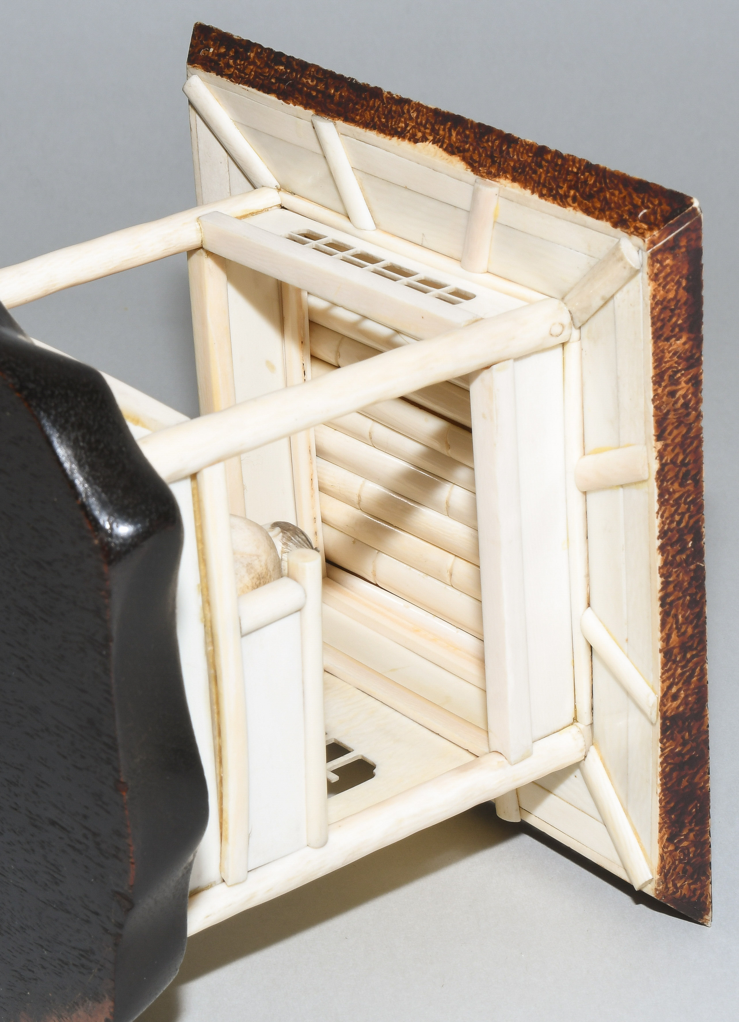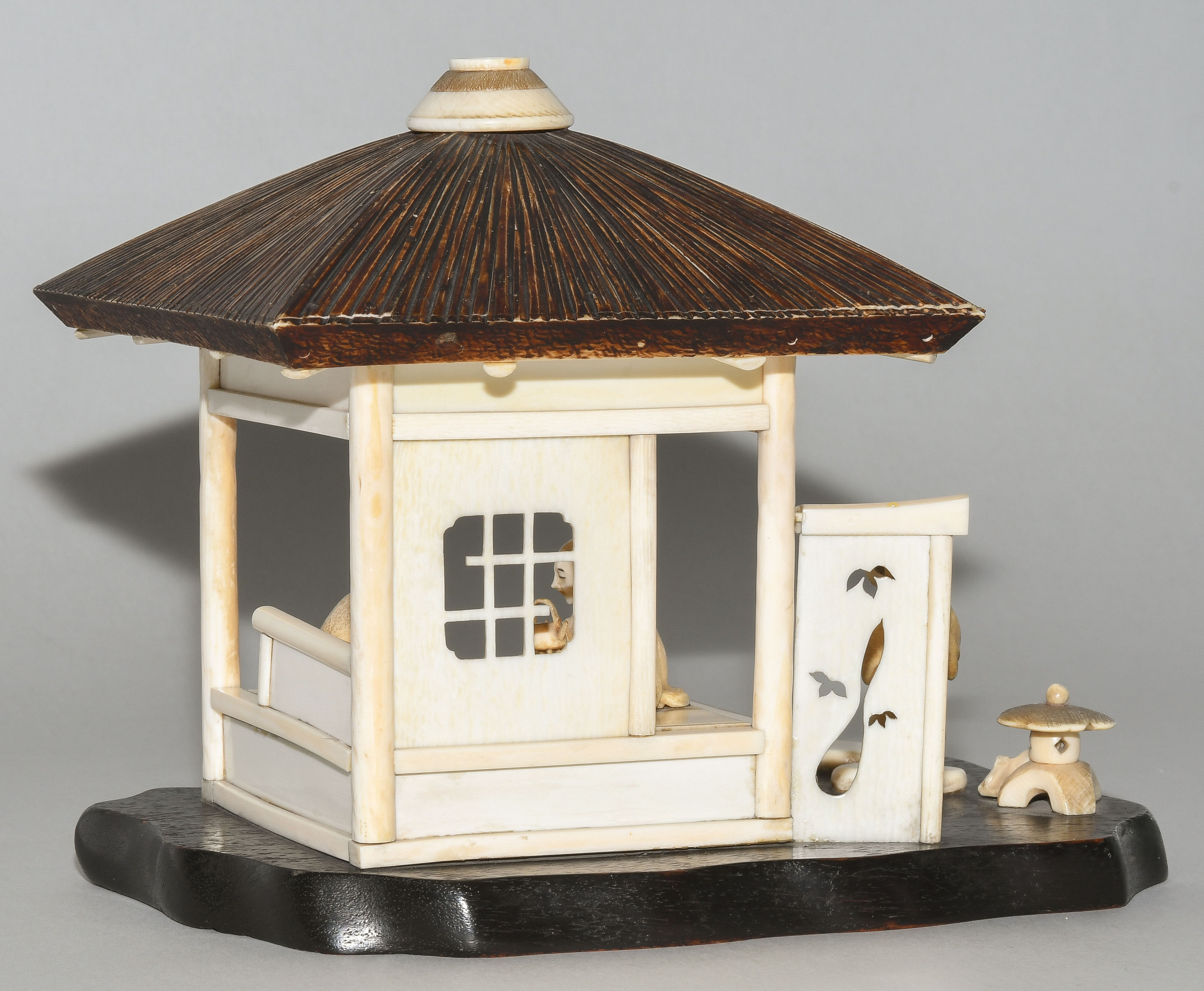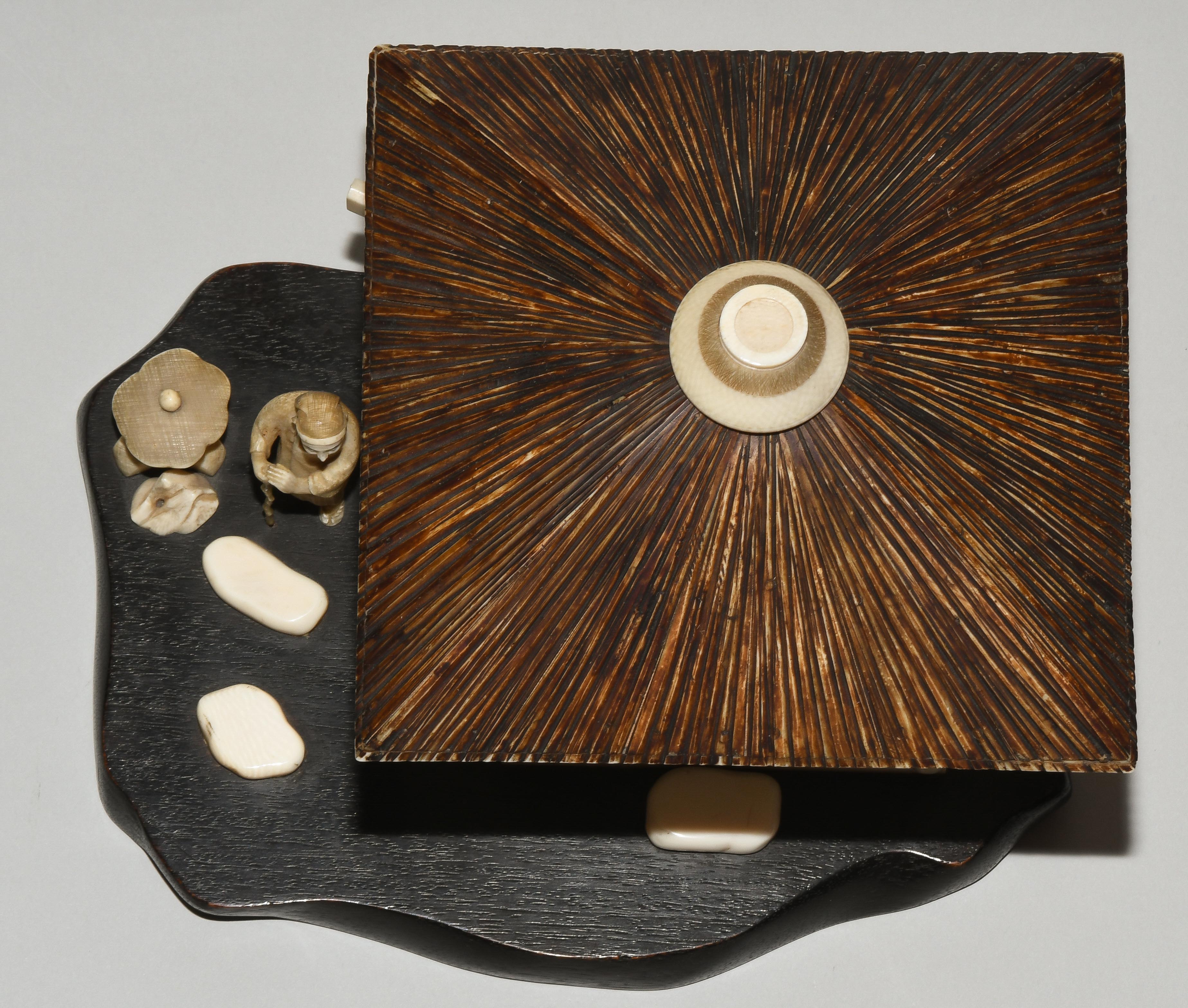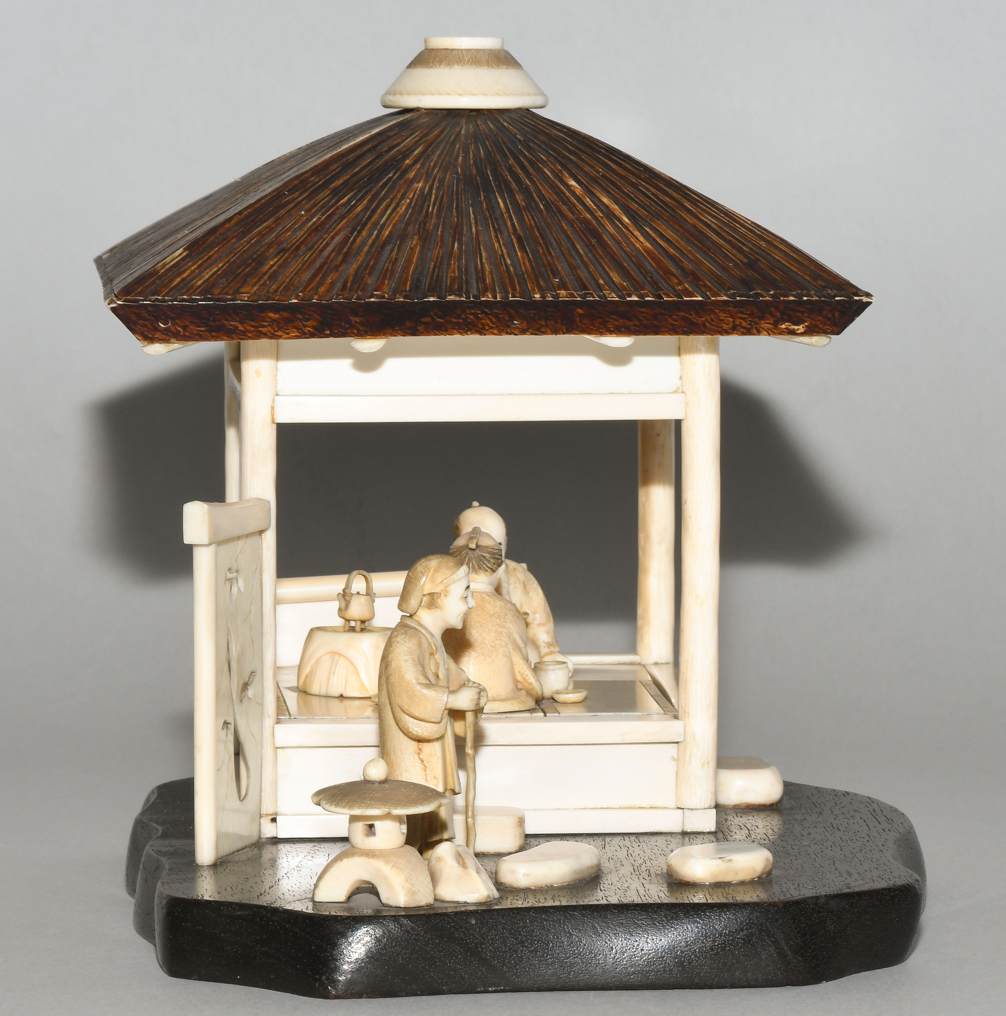 Japan. Elfenbein auf Holz montiert. Zwei Männer in Gartenpavillion geniessen ihre Zeit beim Go-Spiel. Ein dritter Mann mit Stock im Garten stehend. H 15,5, L 20,5 cm.