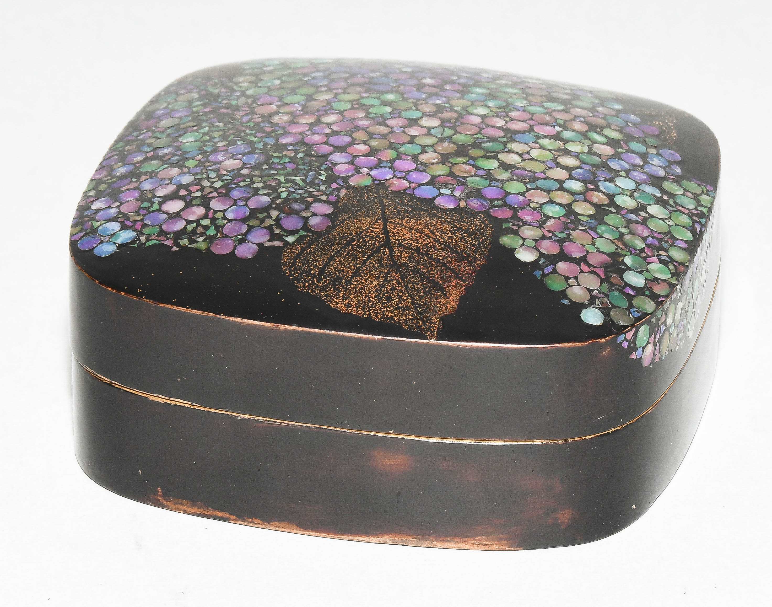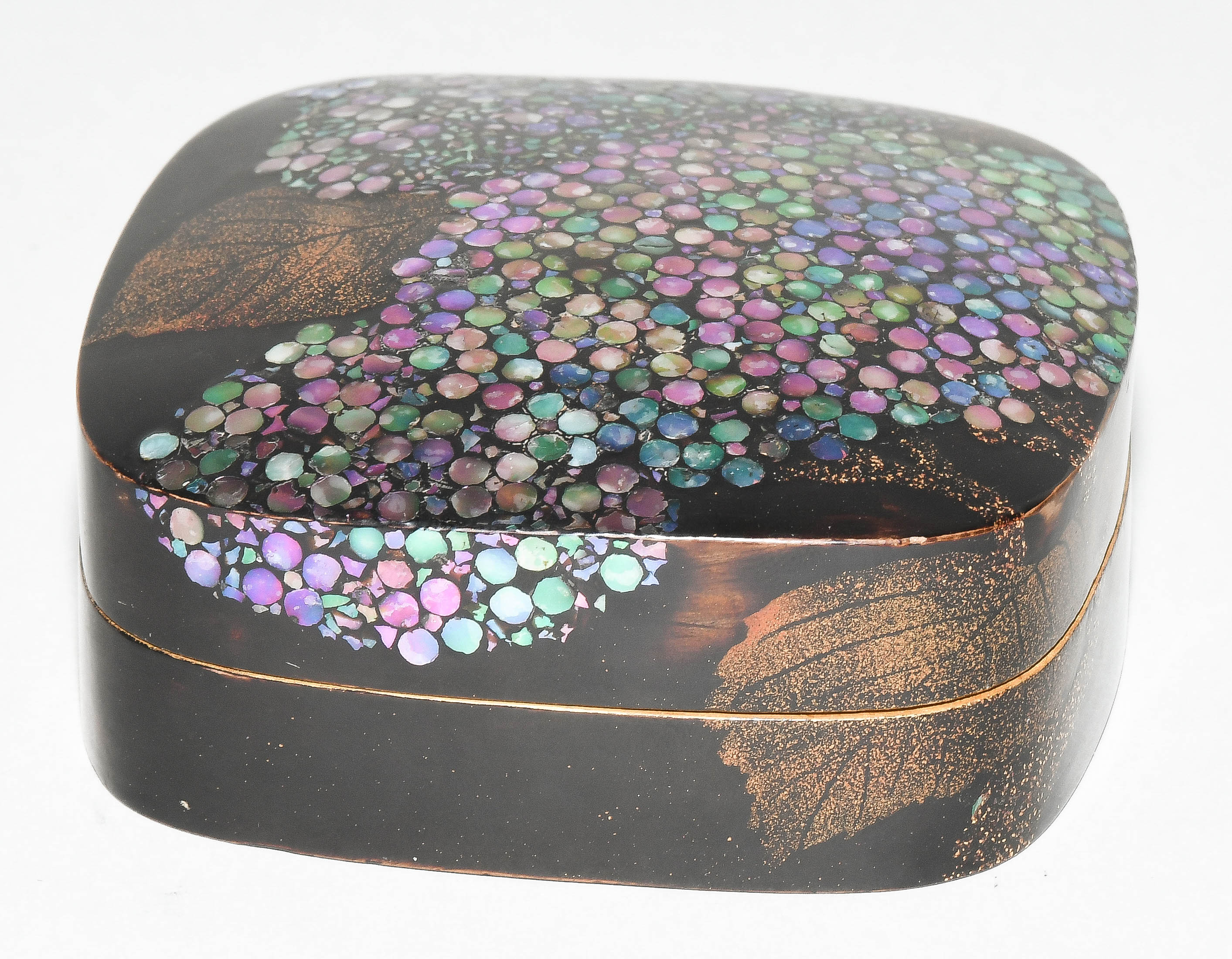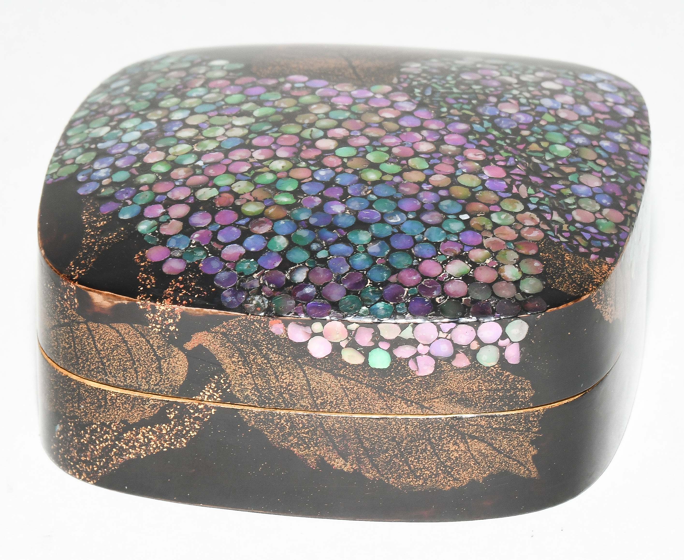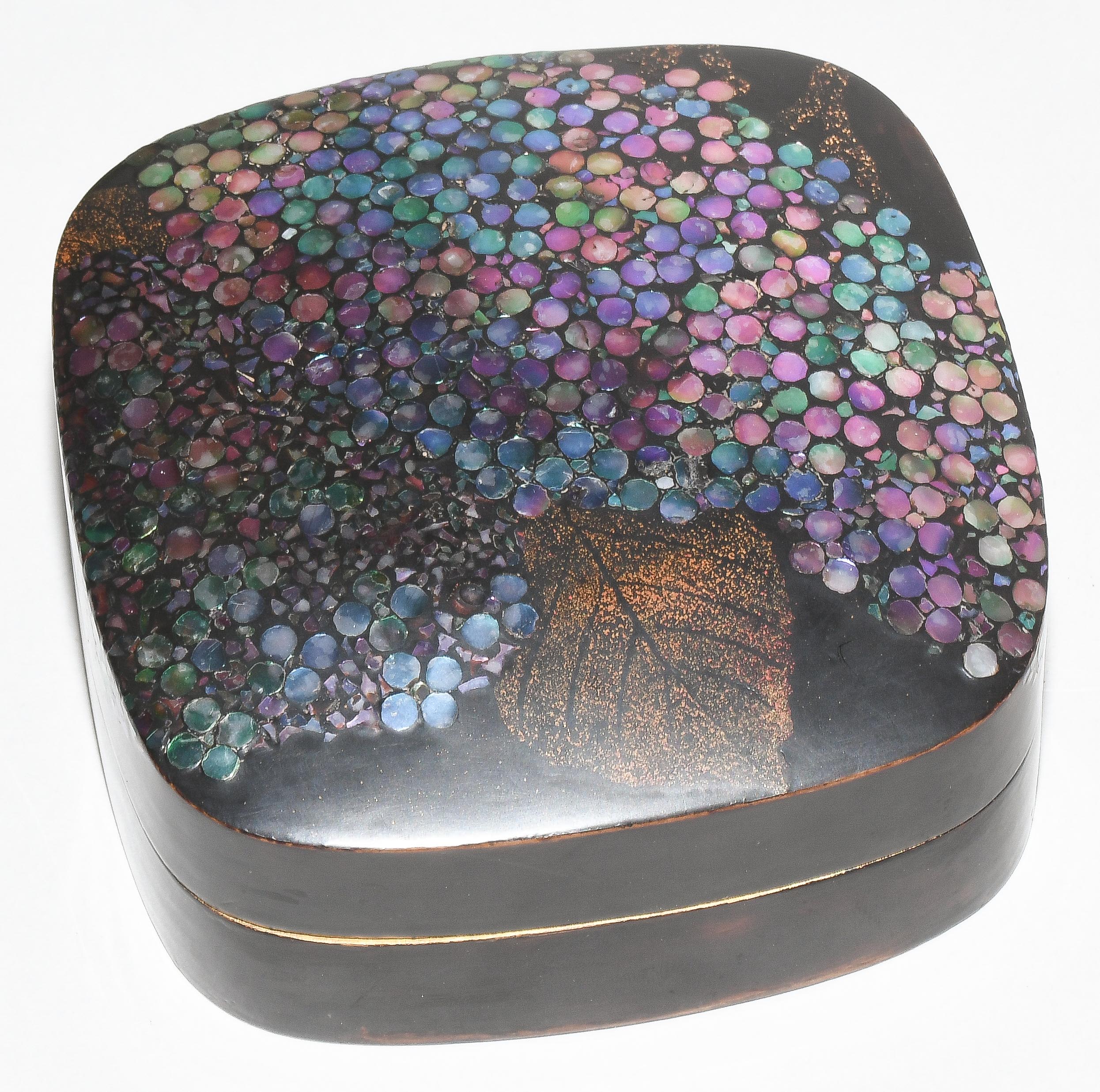 Japan, Mitte 20.Jh. Schwarzlack mit Perlmutt. Darstellung von Hortensien in "Raden". 7,5x7,5x2,8 cm. - Gebrauchsspuren.