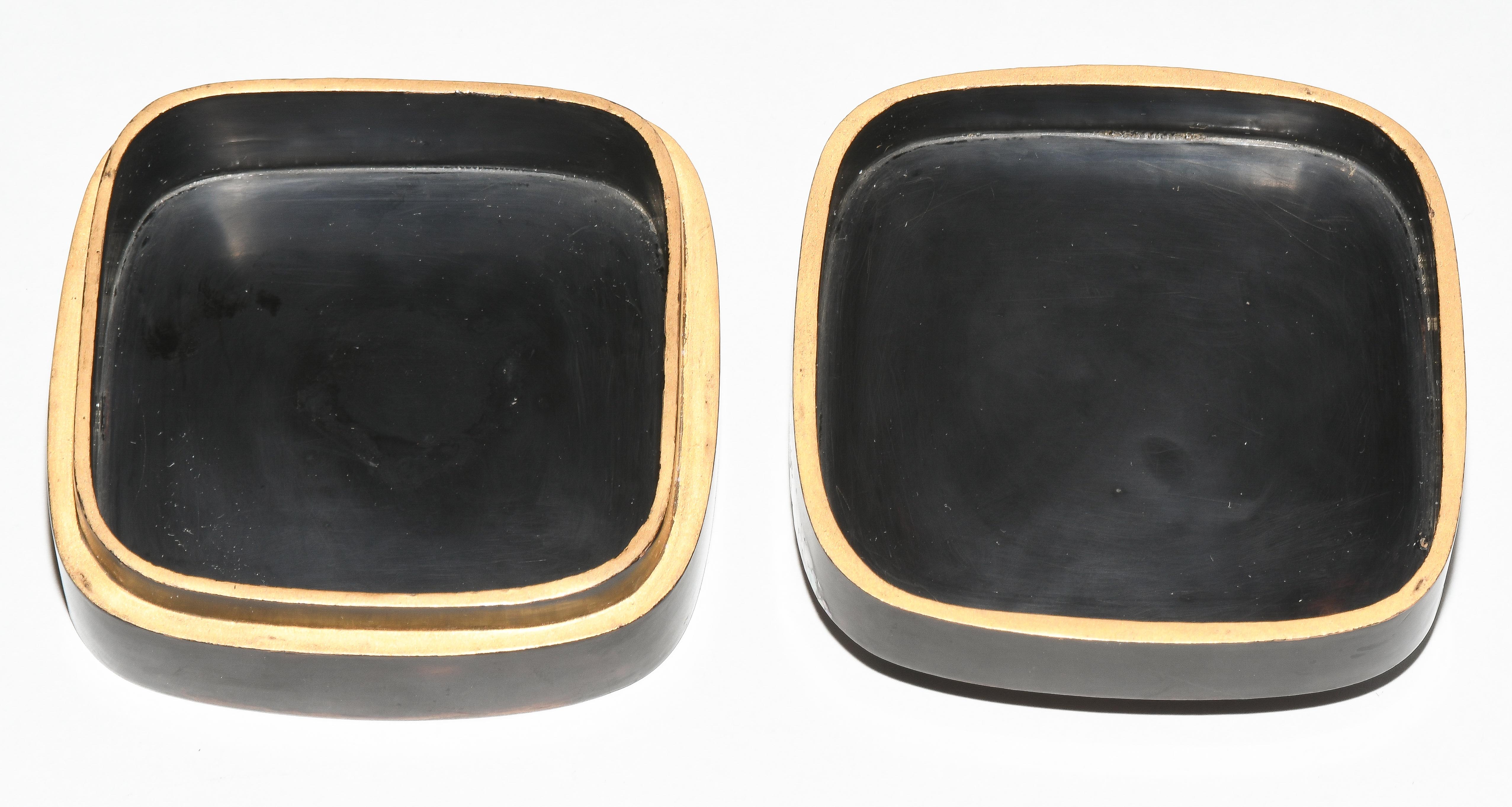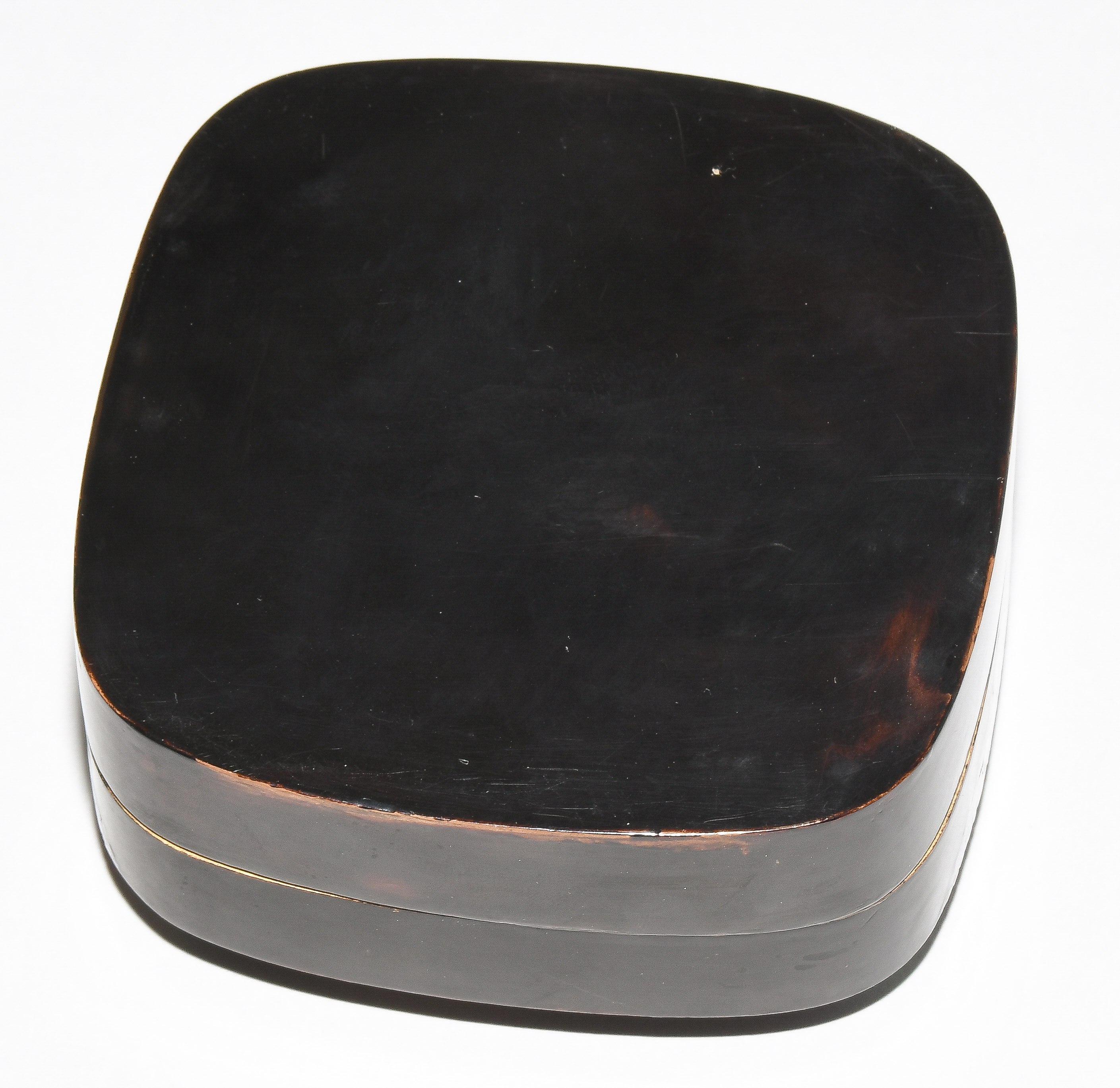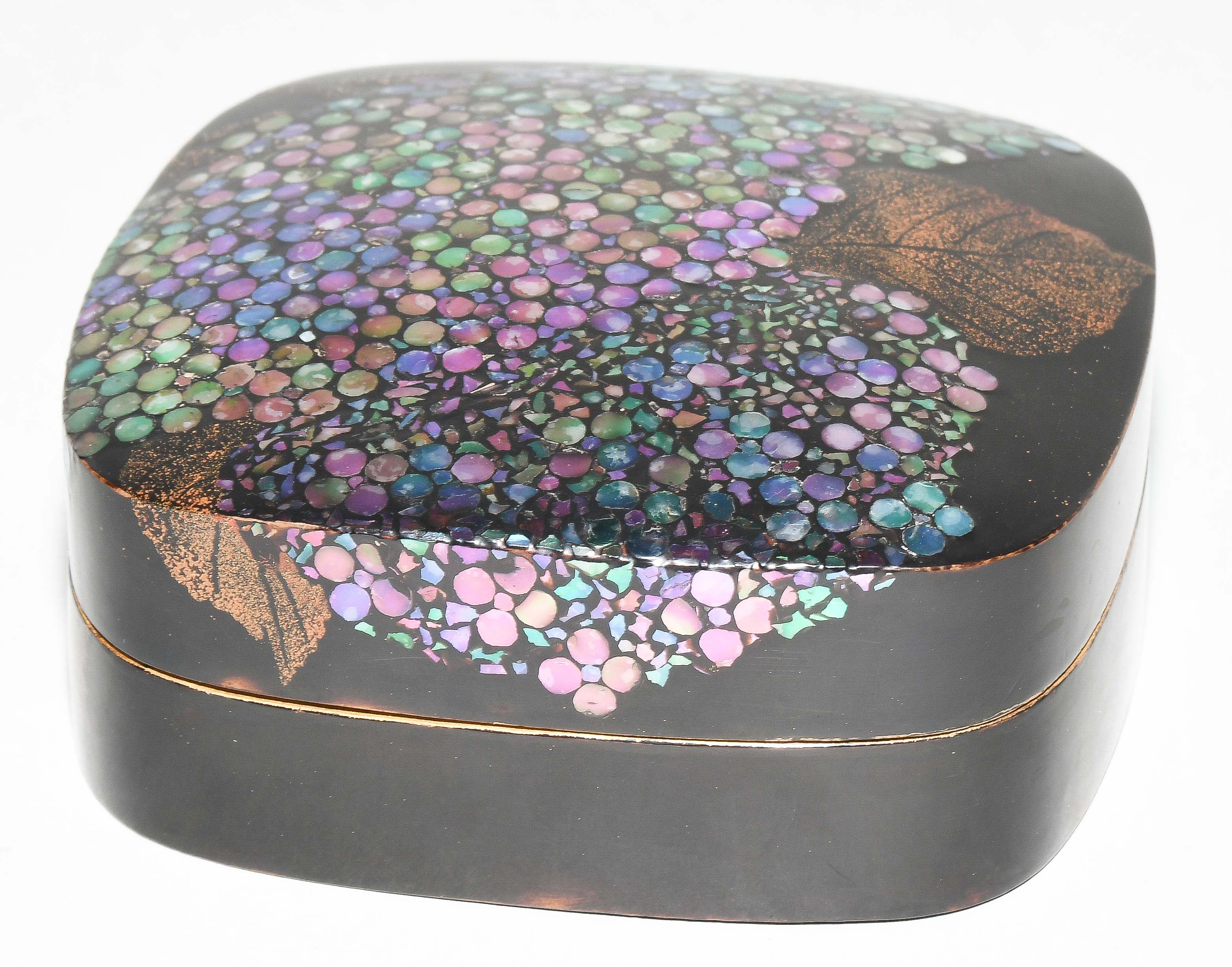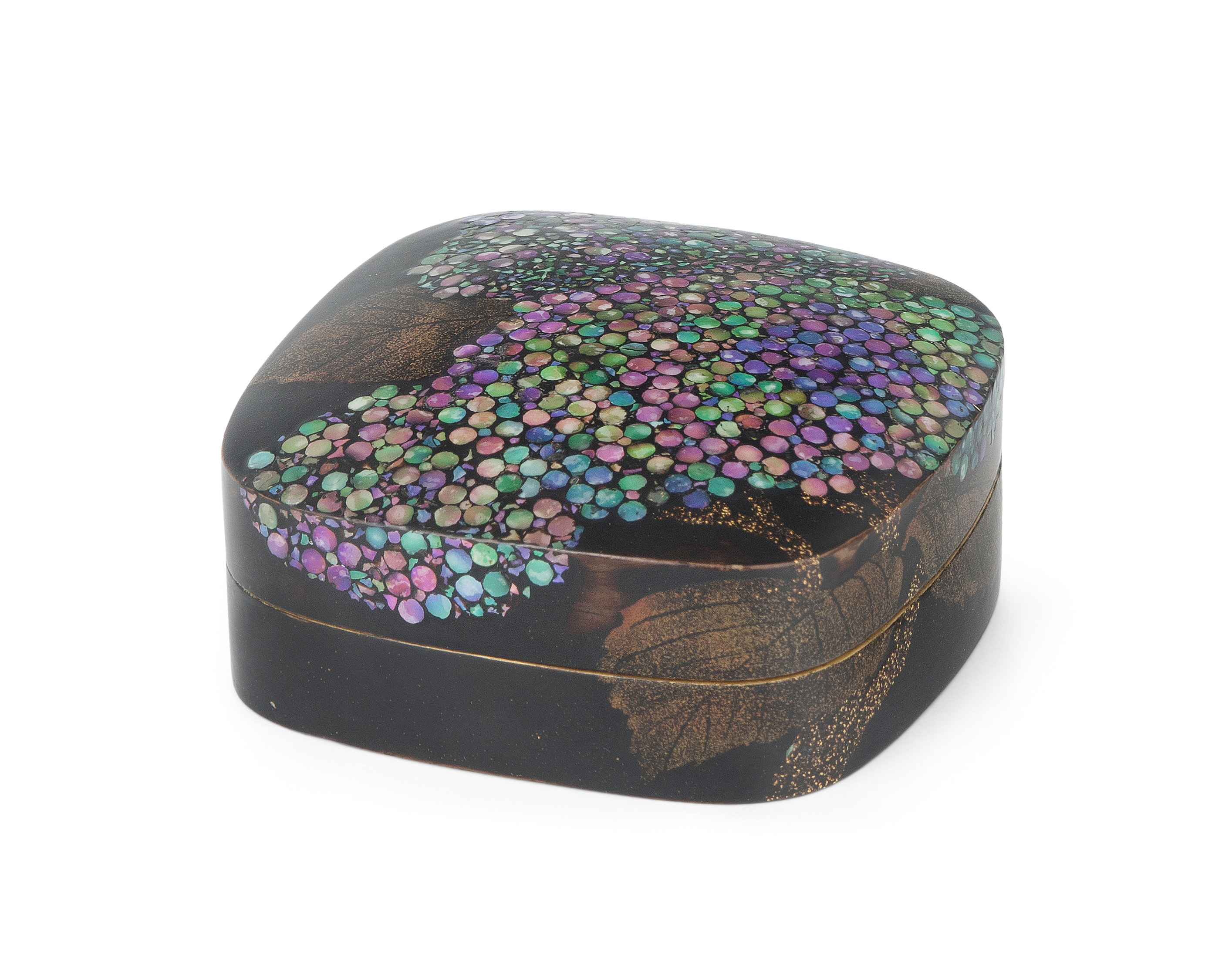 Japan, Mitte 20.Jh. Schwarzlack mit Perlmutt. Darstellung von Hortensien in "Raden". 7,5x7,5x2,8 cm. - Gebrauchsspuren.