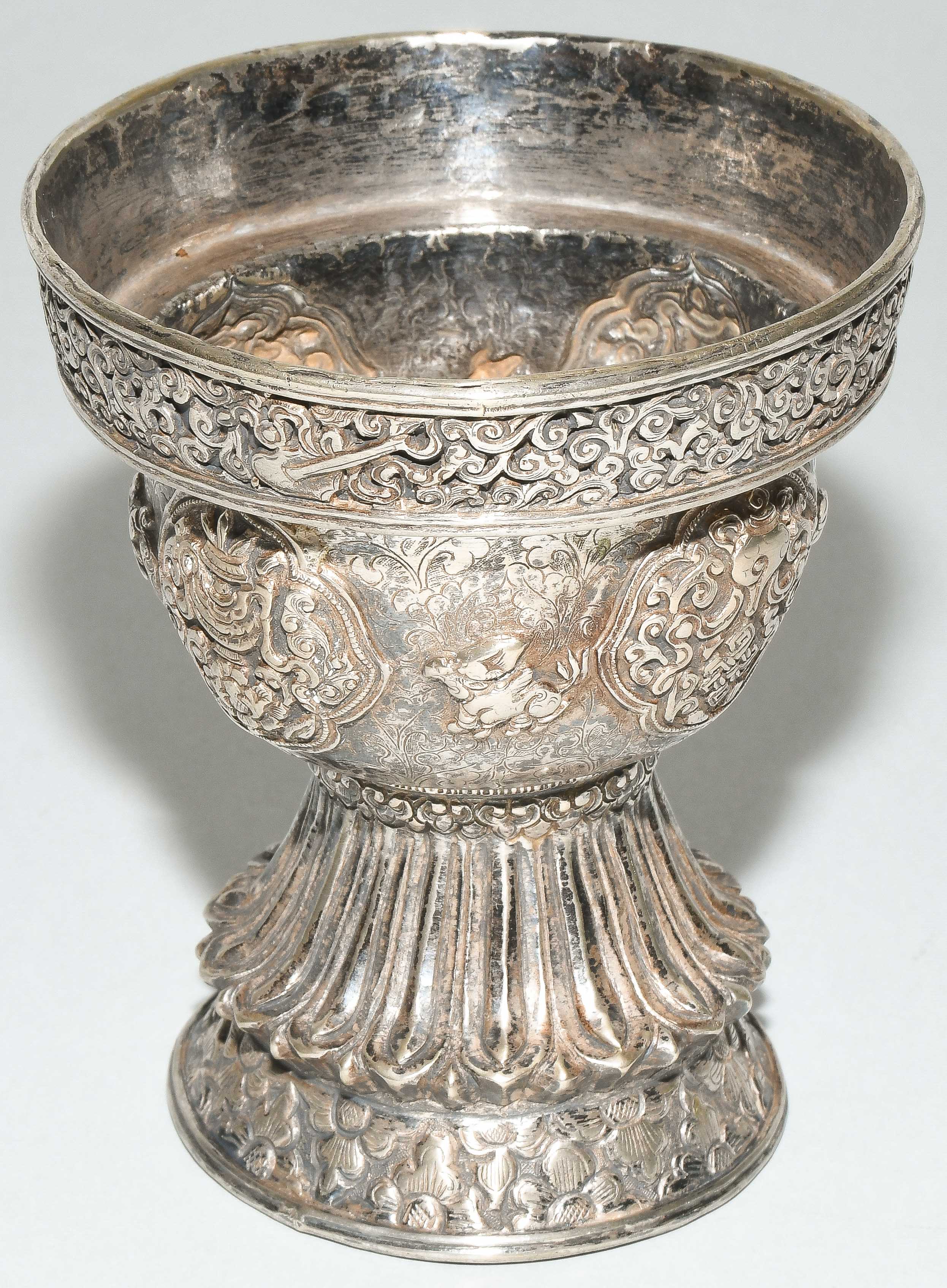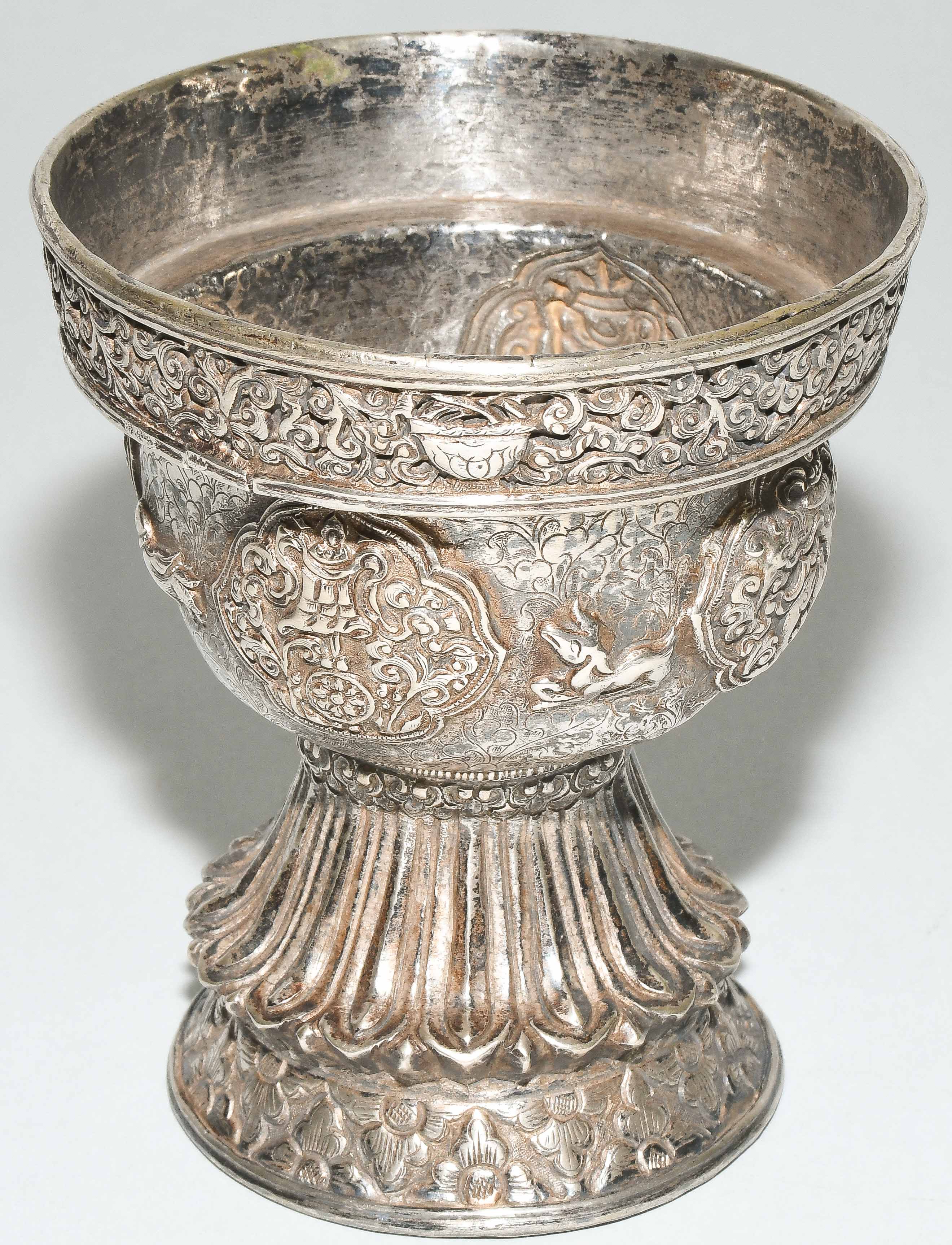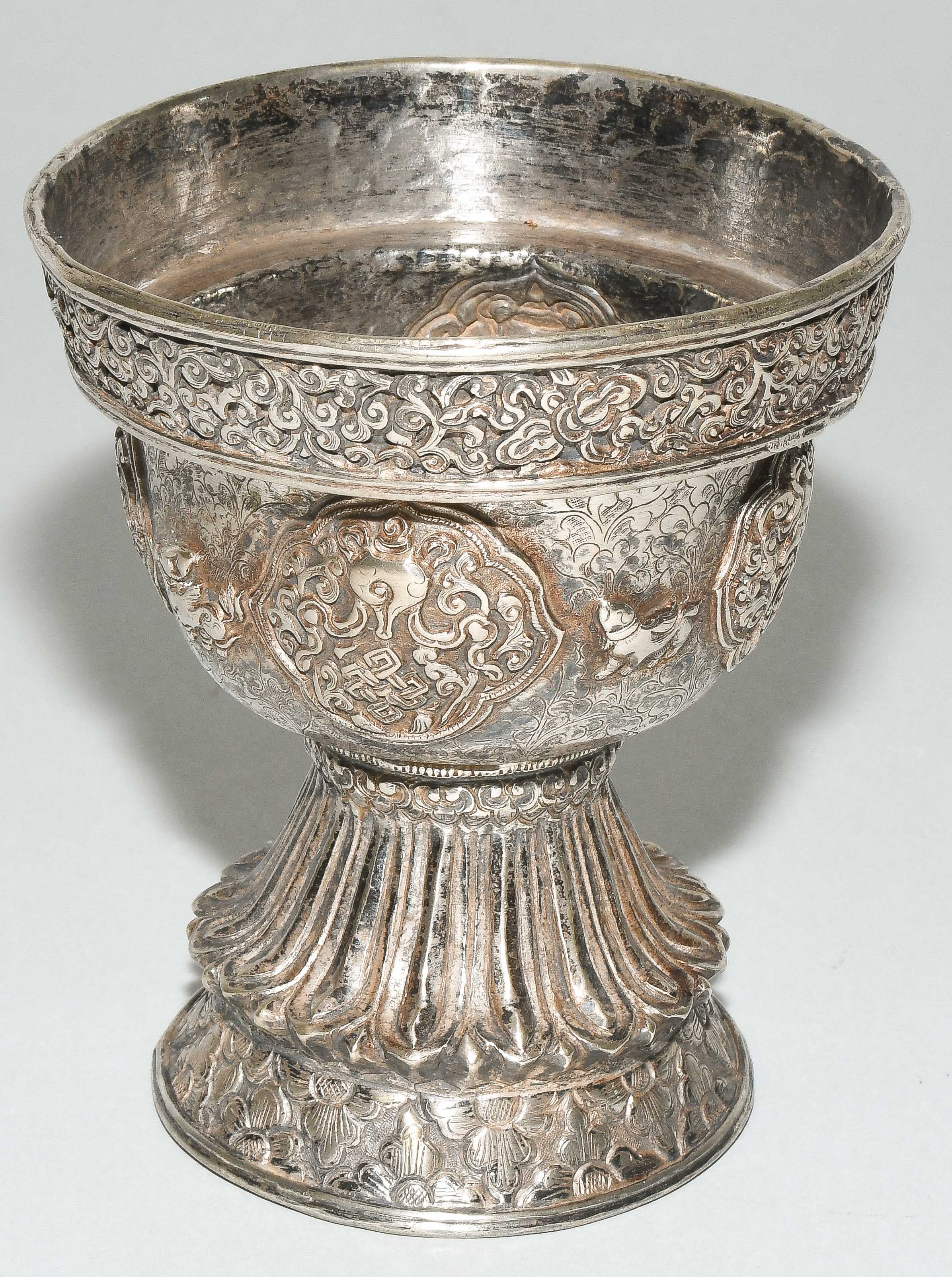 Tibet. Versilbert. Kelch graviert mit Blätterrankendekor, darauf reliefierte buddhistische Symbole in passigen Reserven. Abschluss mit etwas nach aussen versetzter Bordüre. Fuss reliefiert mit Lotosblätter. H 11,5, Ø 9,2 cm.