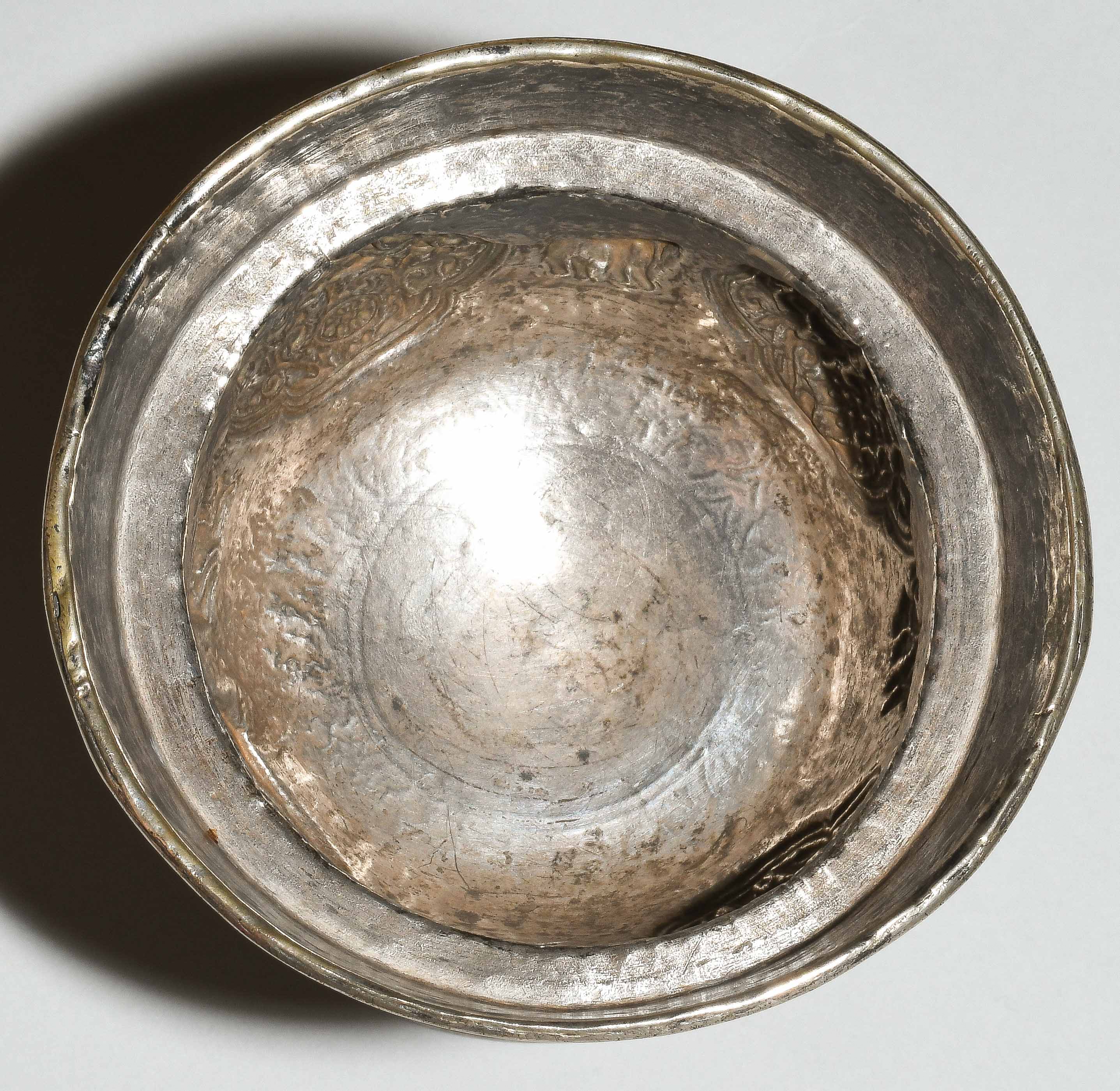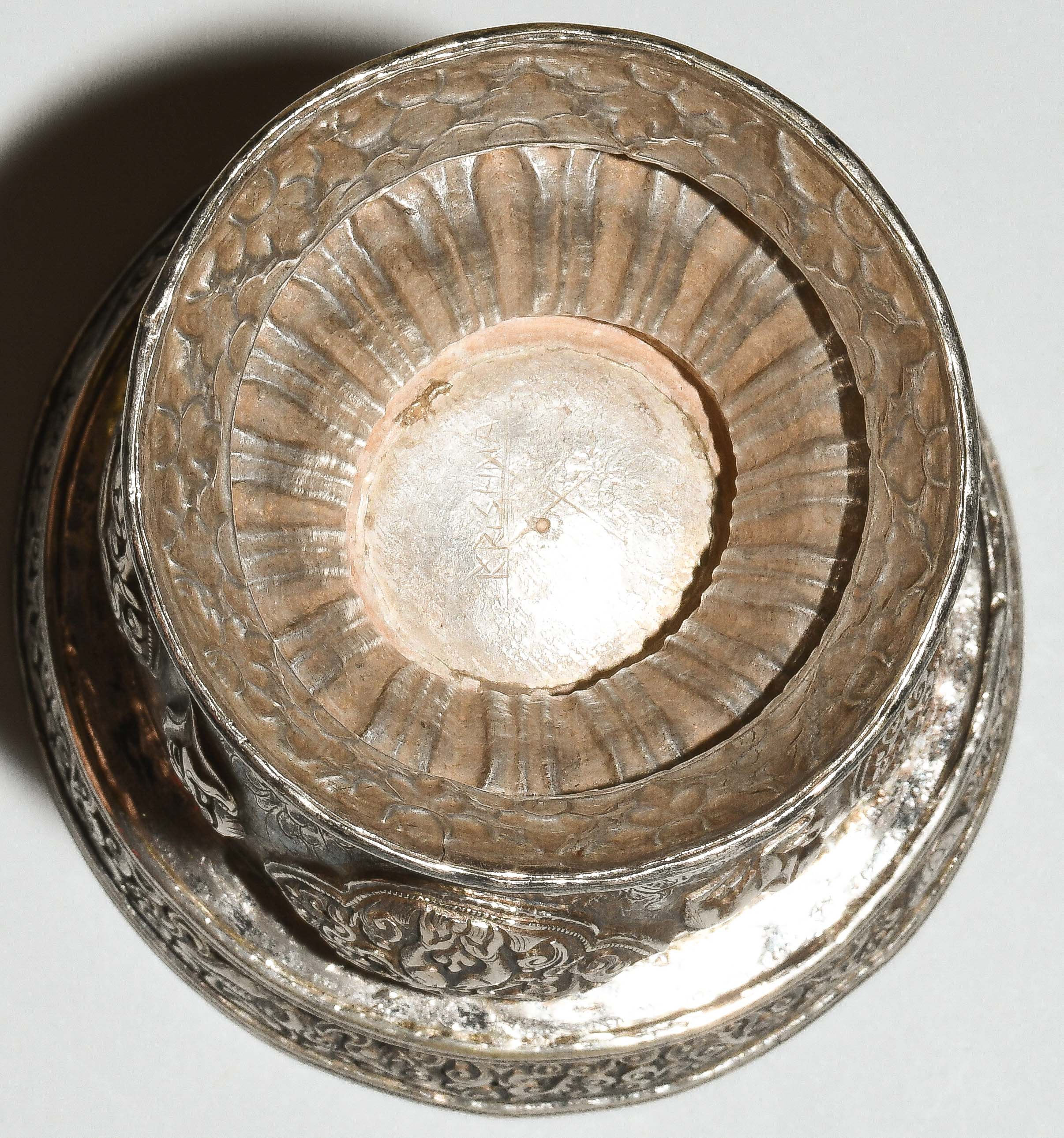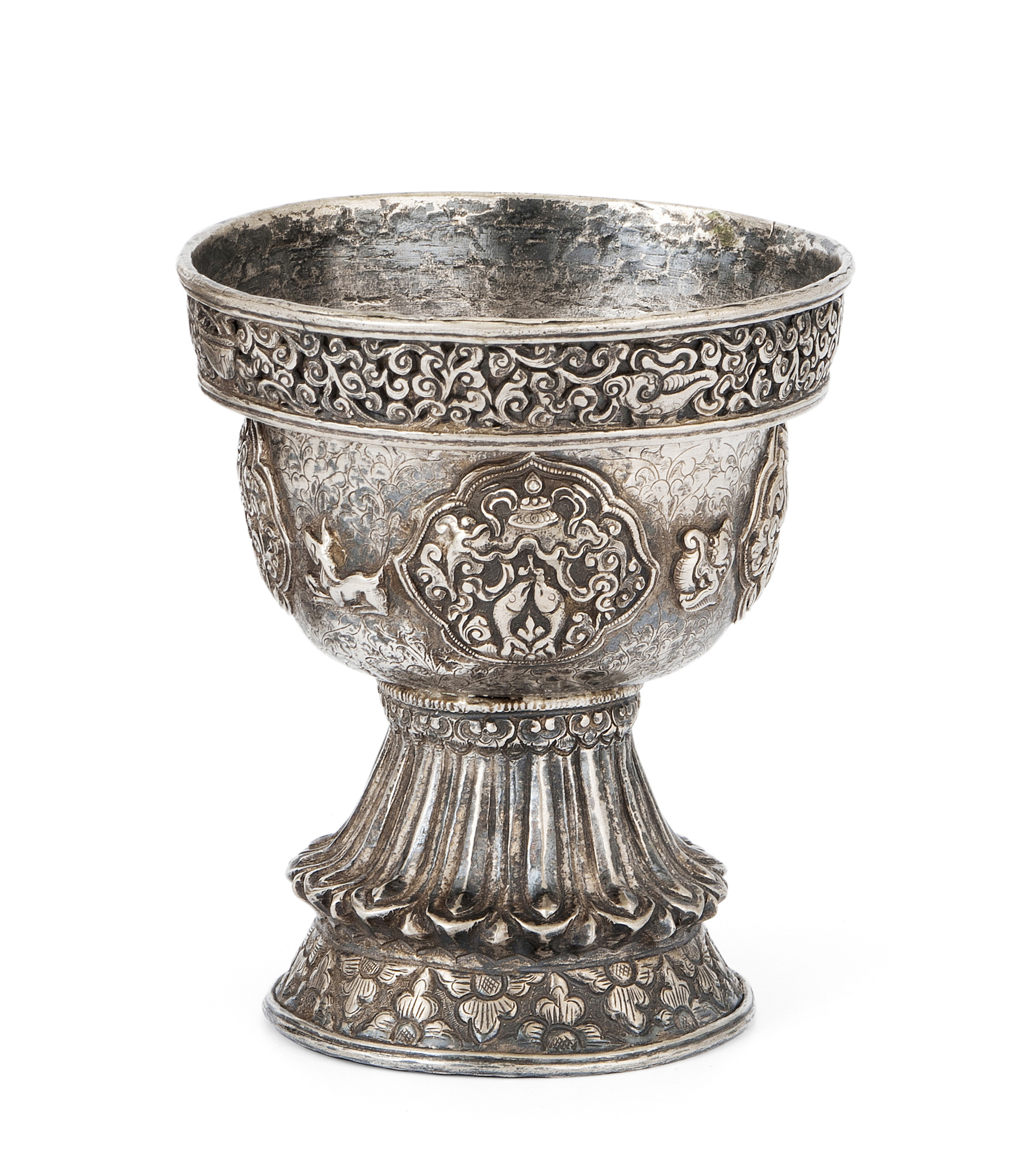 Tibet. Versilbert. Kelch graviert mit Blätterrankendekor, darauf reliefierte buddhistische Symbole in passigen Reserven. Abschluss mit etwas nach aussen versetzter Bordüre. Fuss reliefiert mit Lotosblätter. H 11,5, Ø 9,2 cm.