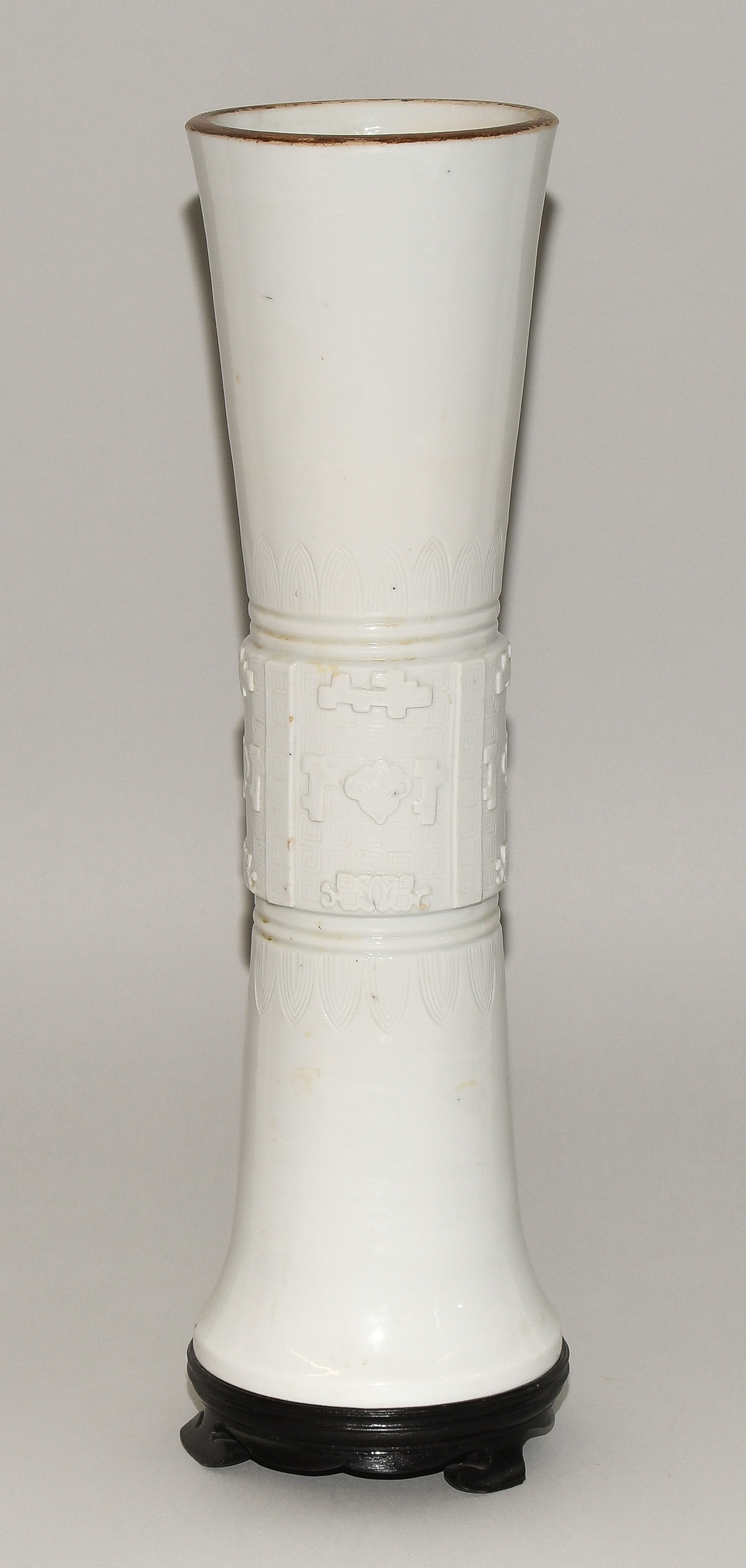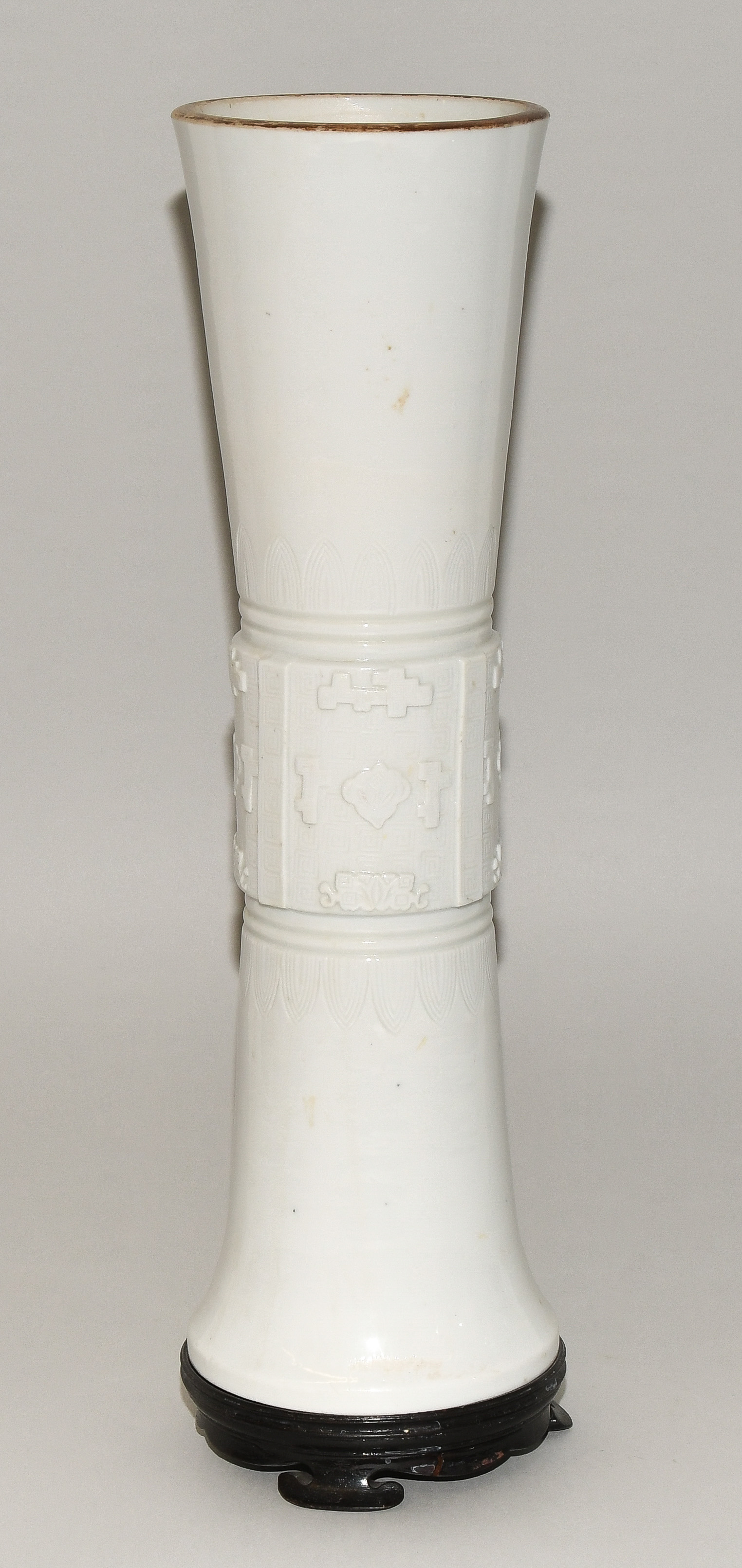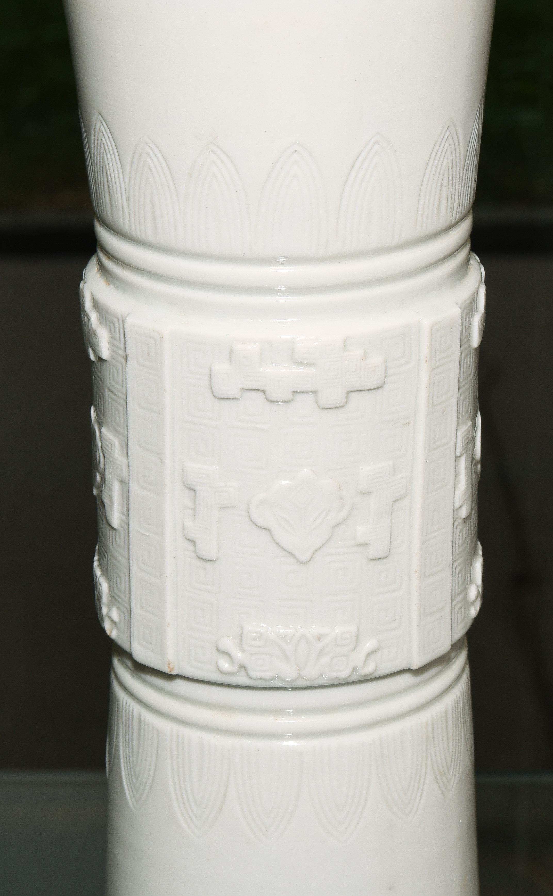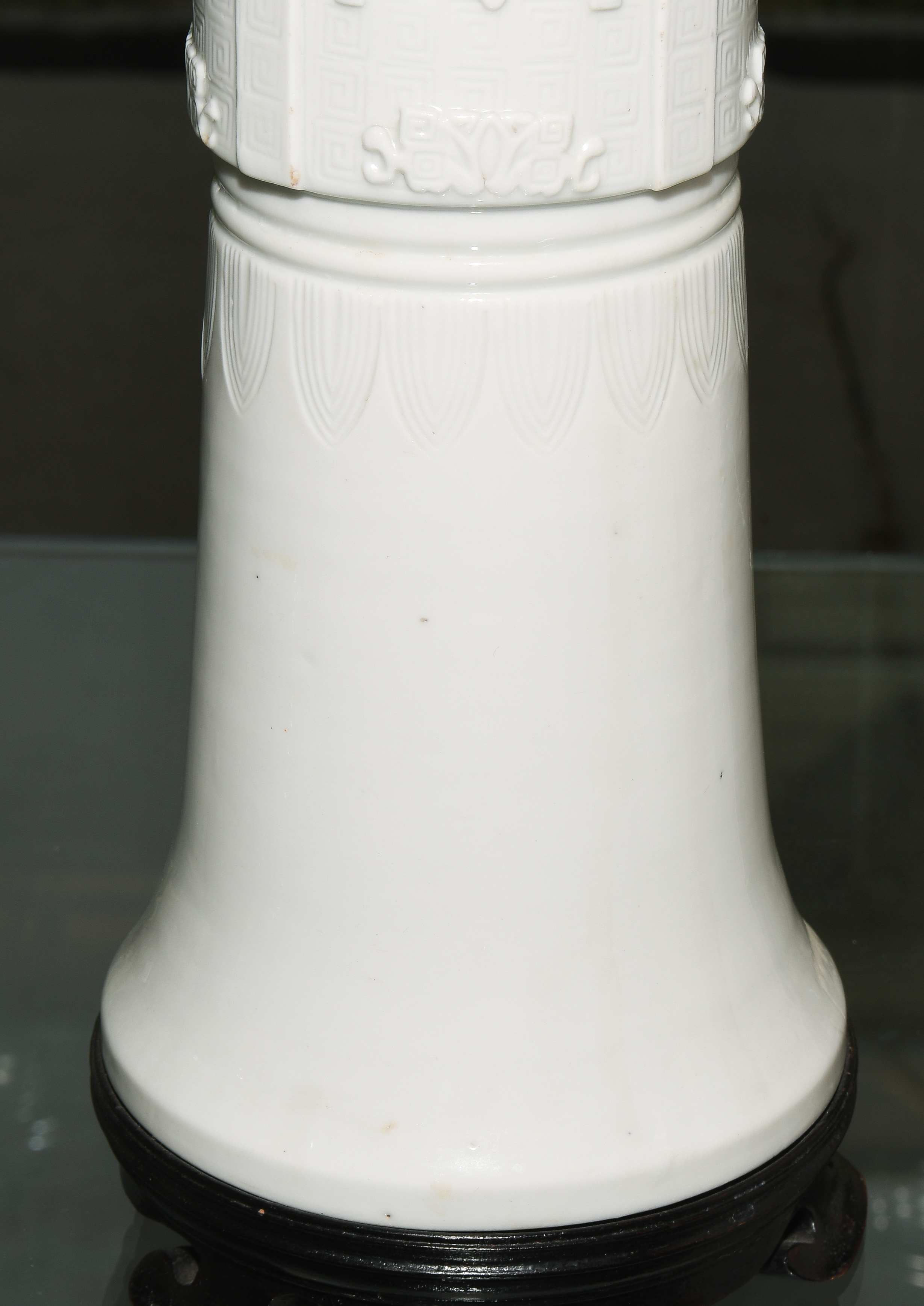 China, Qing-Dynastie. Porzellan. Blanc-de-Chine. Zentral verziert mit Tao-tie-Masken sowie geometrischem Dekor auf Mäander-Motiv. Mündung braun bemalt. Ca. H 39,5. Vase. / 42 cm. - Fest auf Holzsockel montiert.