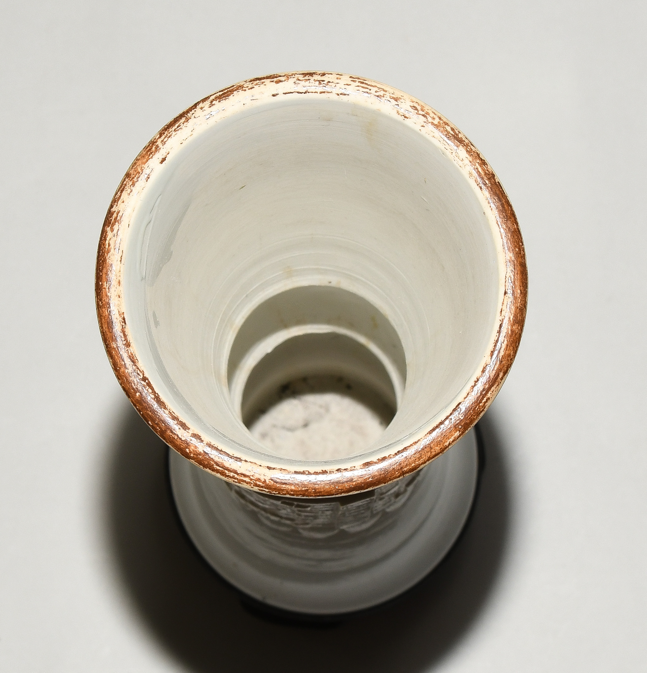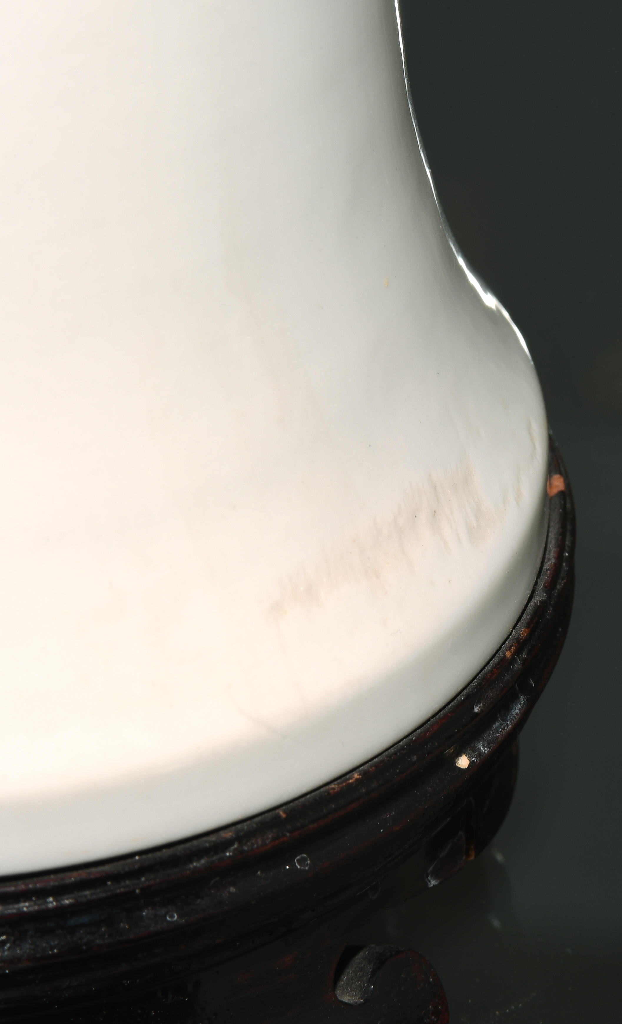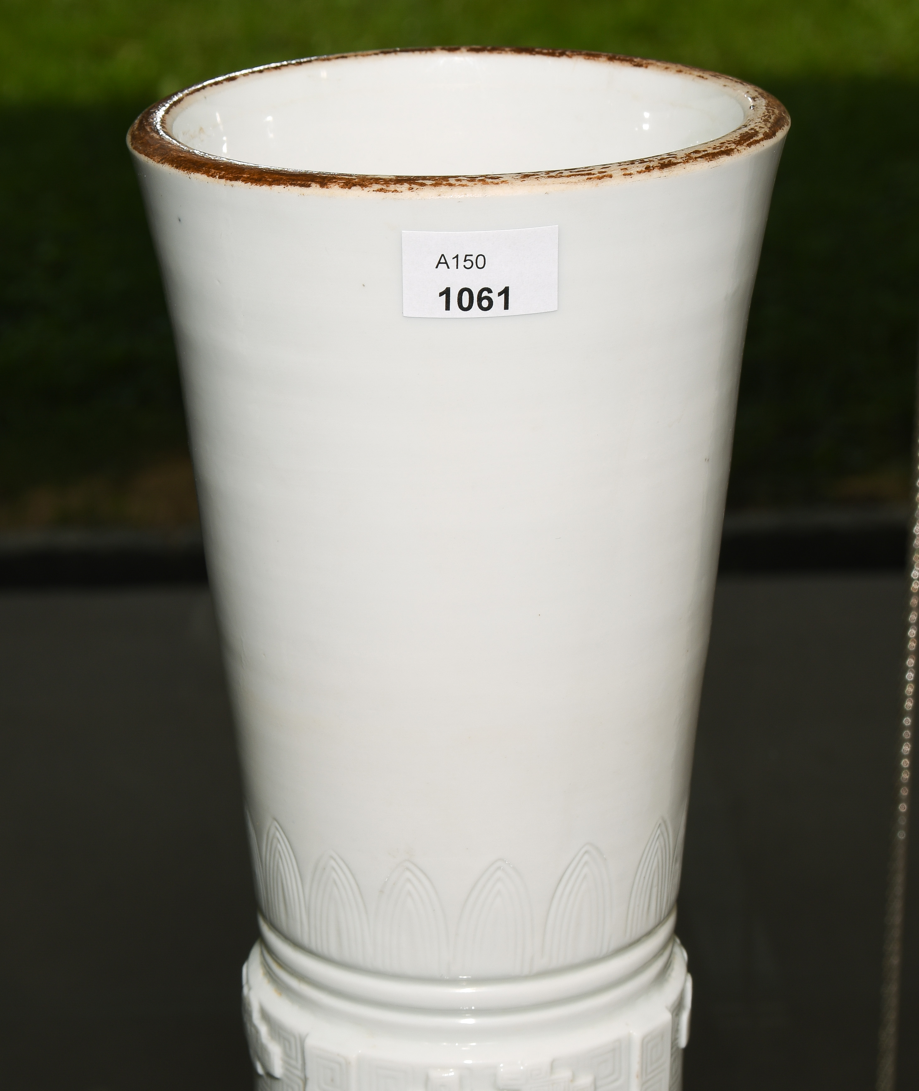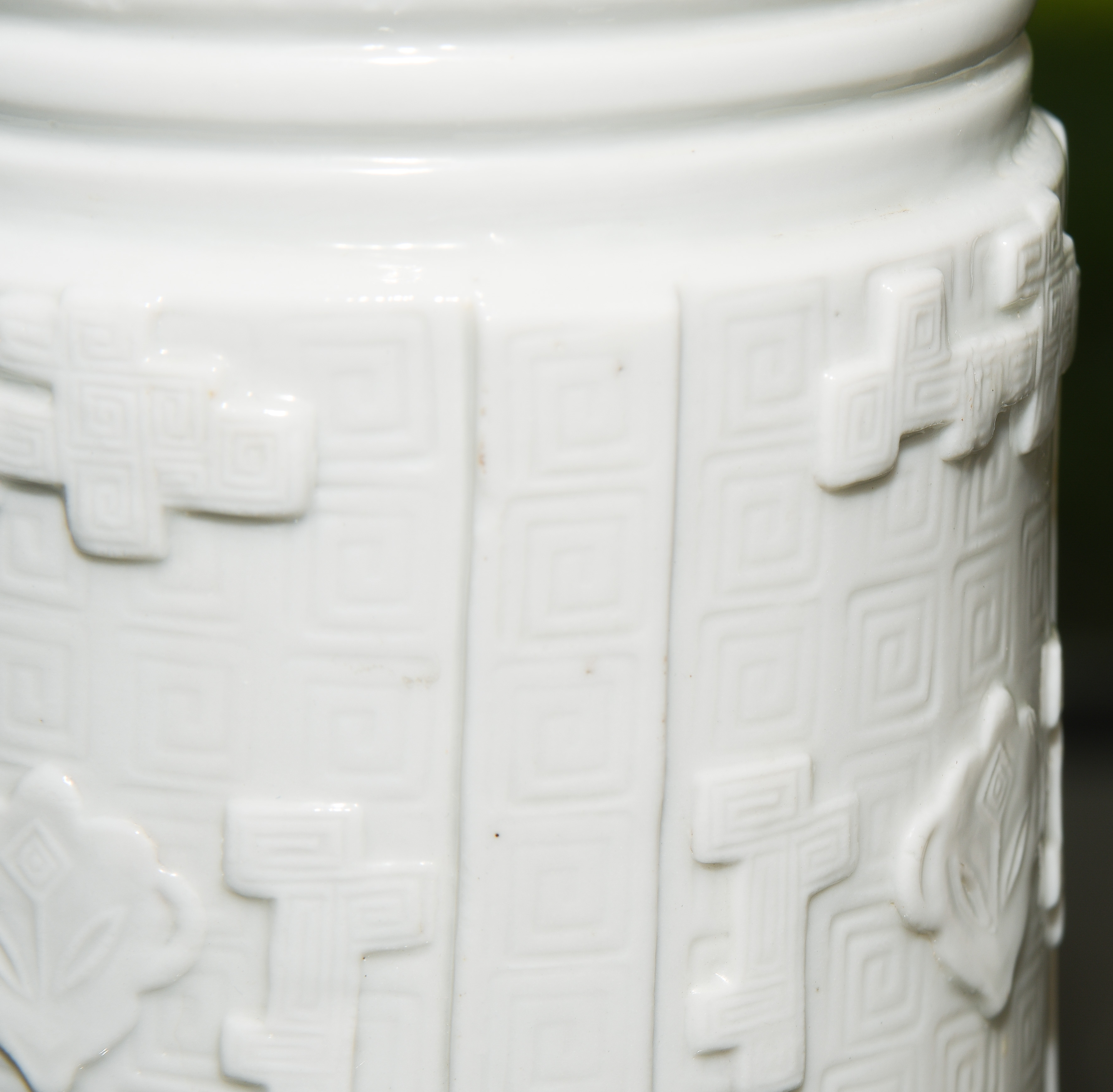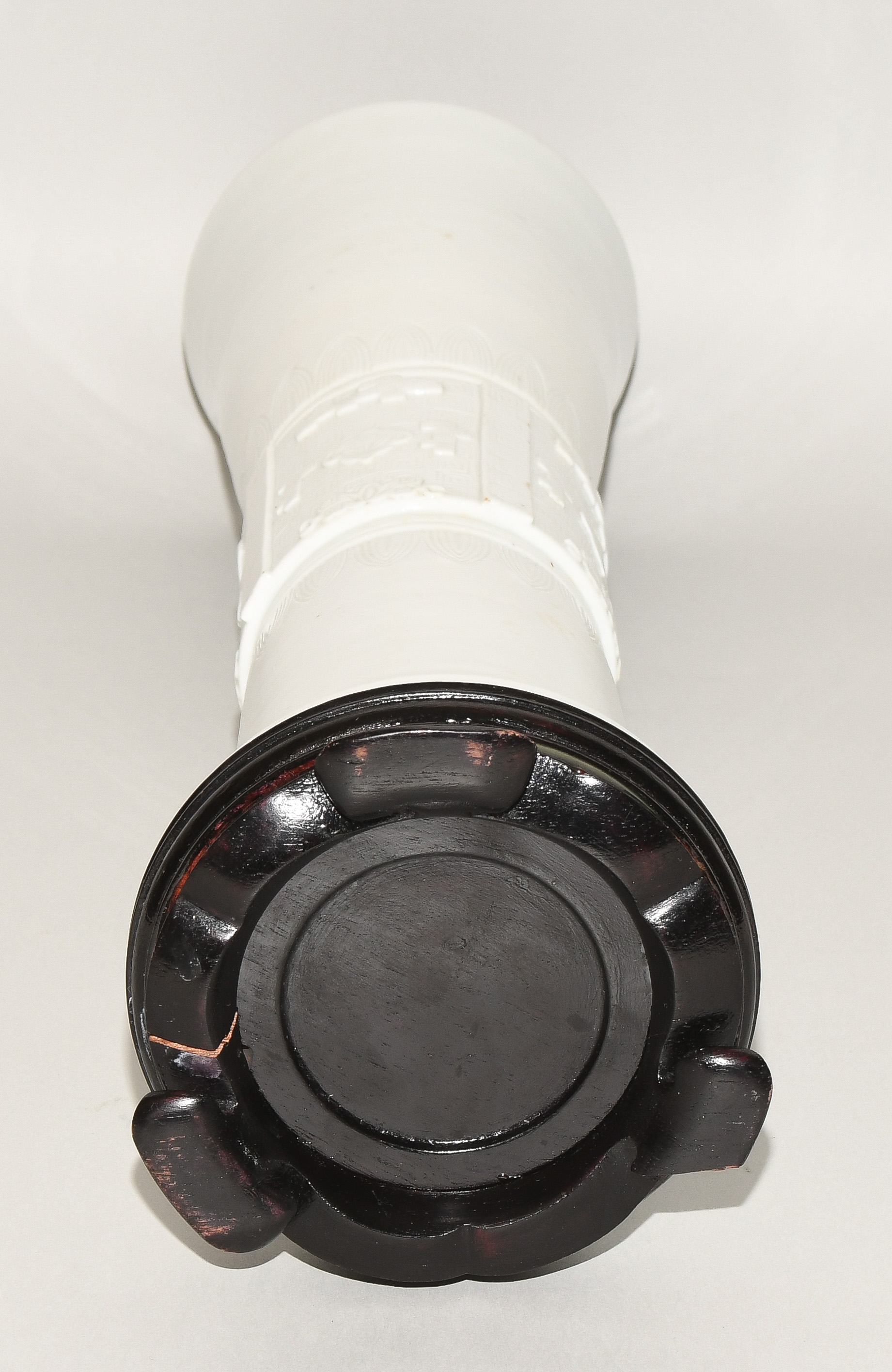 China, Qing-Dynastie. Porzellan. Blanc-de-Chine. Zentral verziert mit Tao-tie-Masken sowie geometrischem Dekor auf Mäander-Motiv. Mündung braun bemalt. Ca. H 39,5. Vase. / 42 cm. - Fest auf Holzsockel montiert.