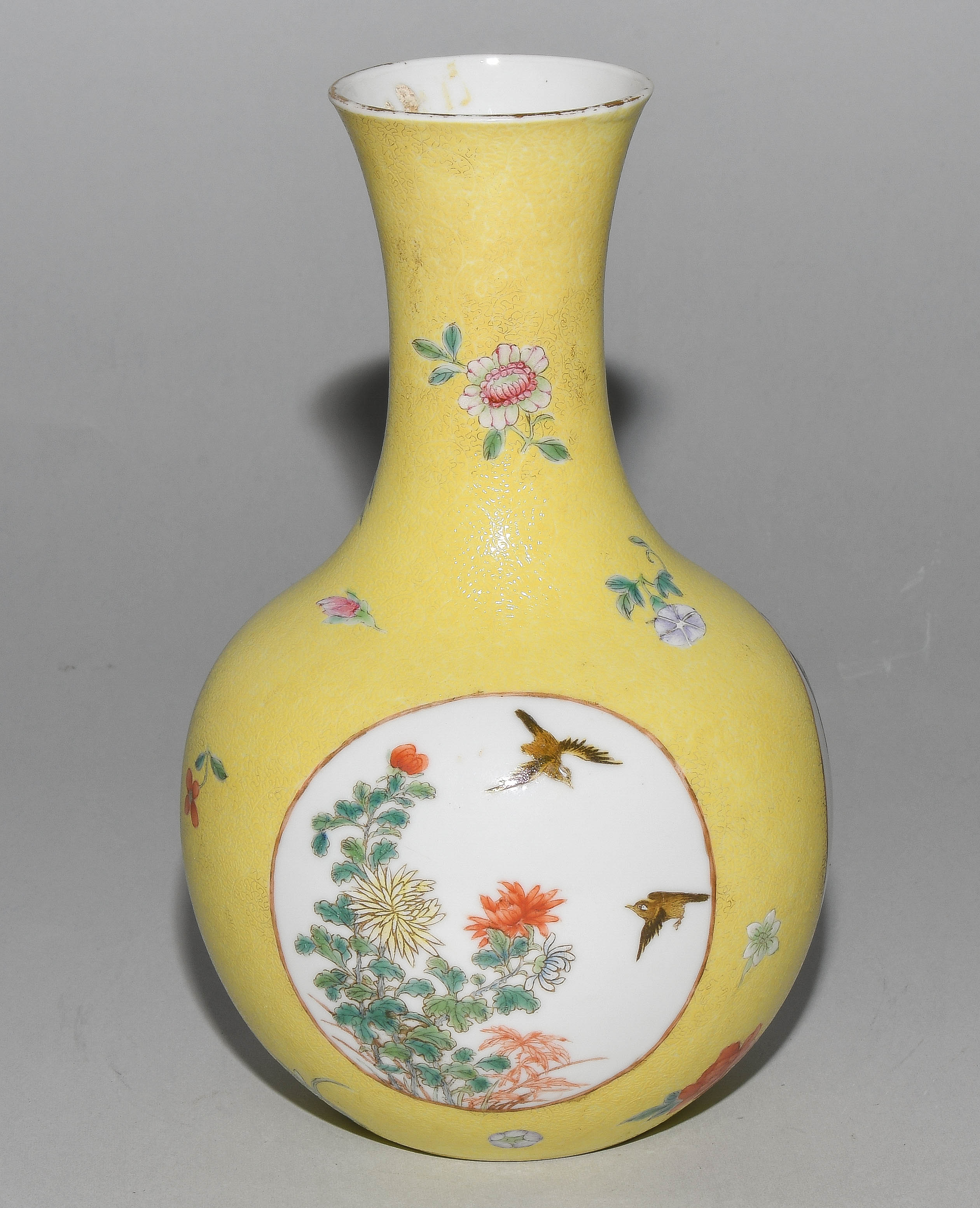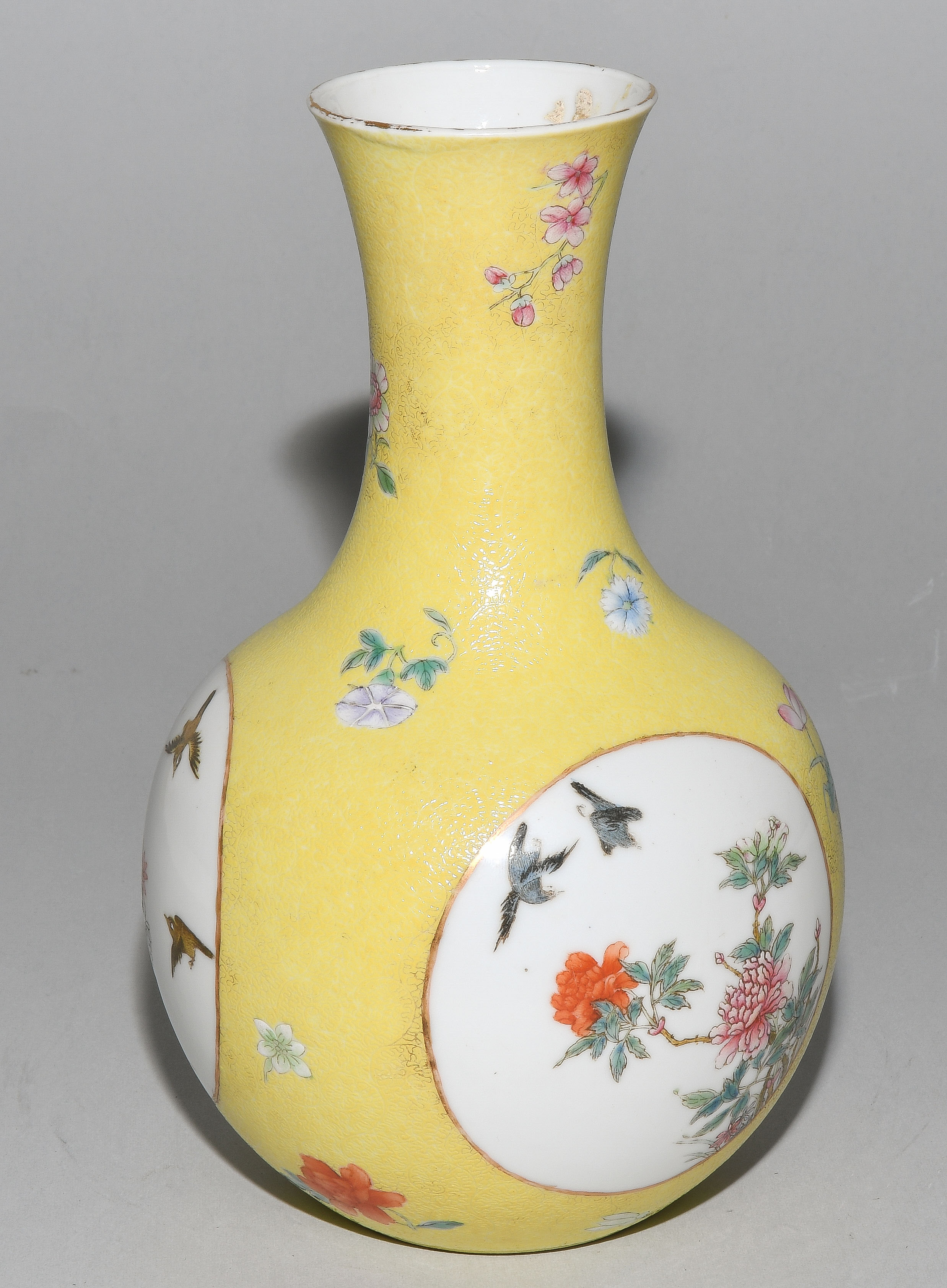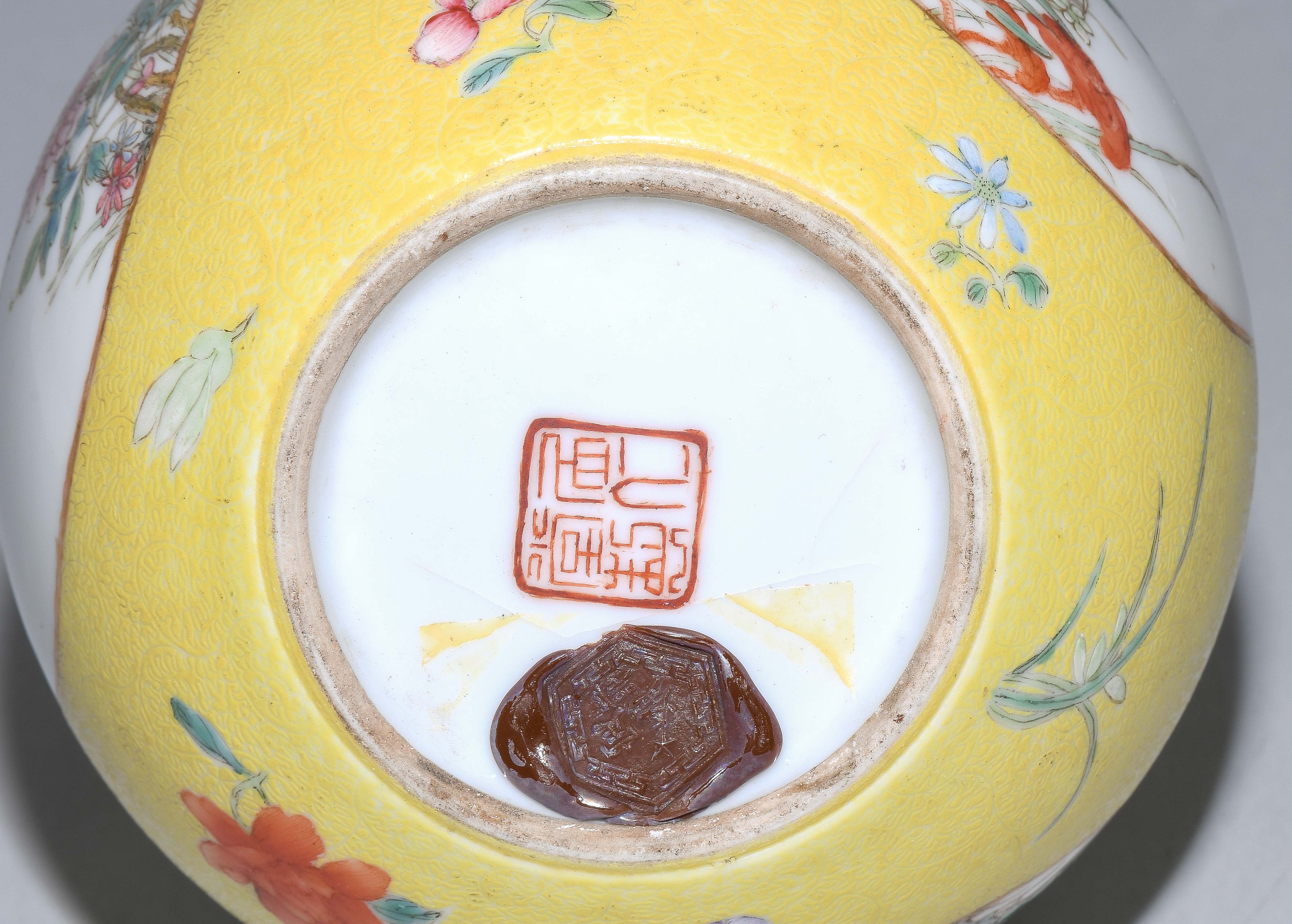 China. Porzellan. Kugeliger Körper mit ausladendem Hals. In den Reserven Blumen-/Vogeldekor in Famille rose. Fein gravierter Blätterrankendekor auf gelbem Fond. H 21 cm. Minime Schadstellen.
