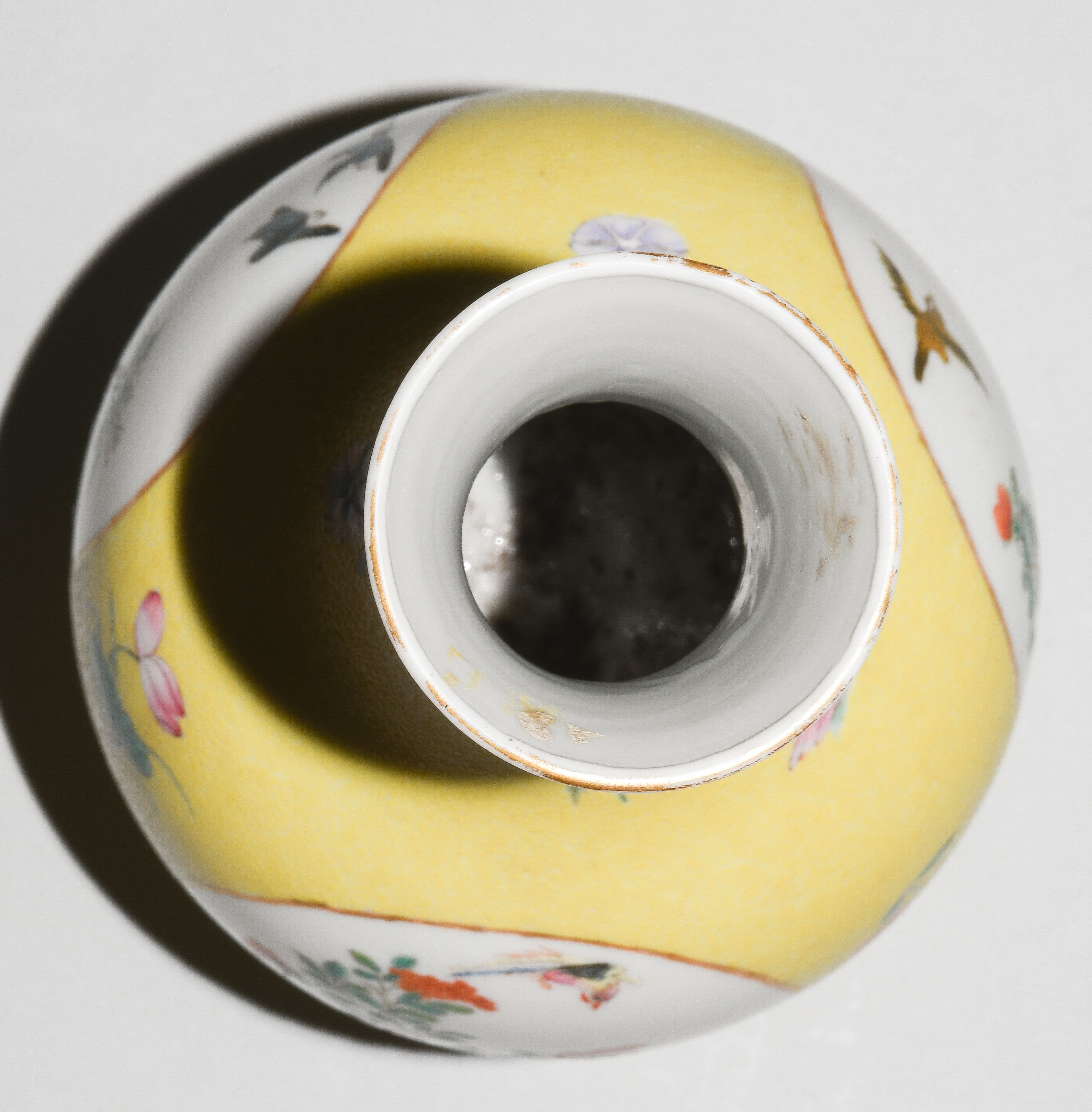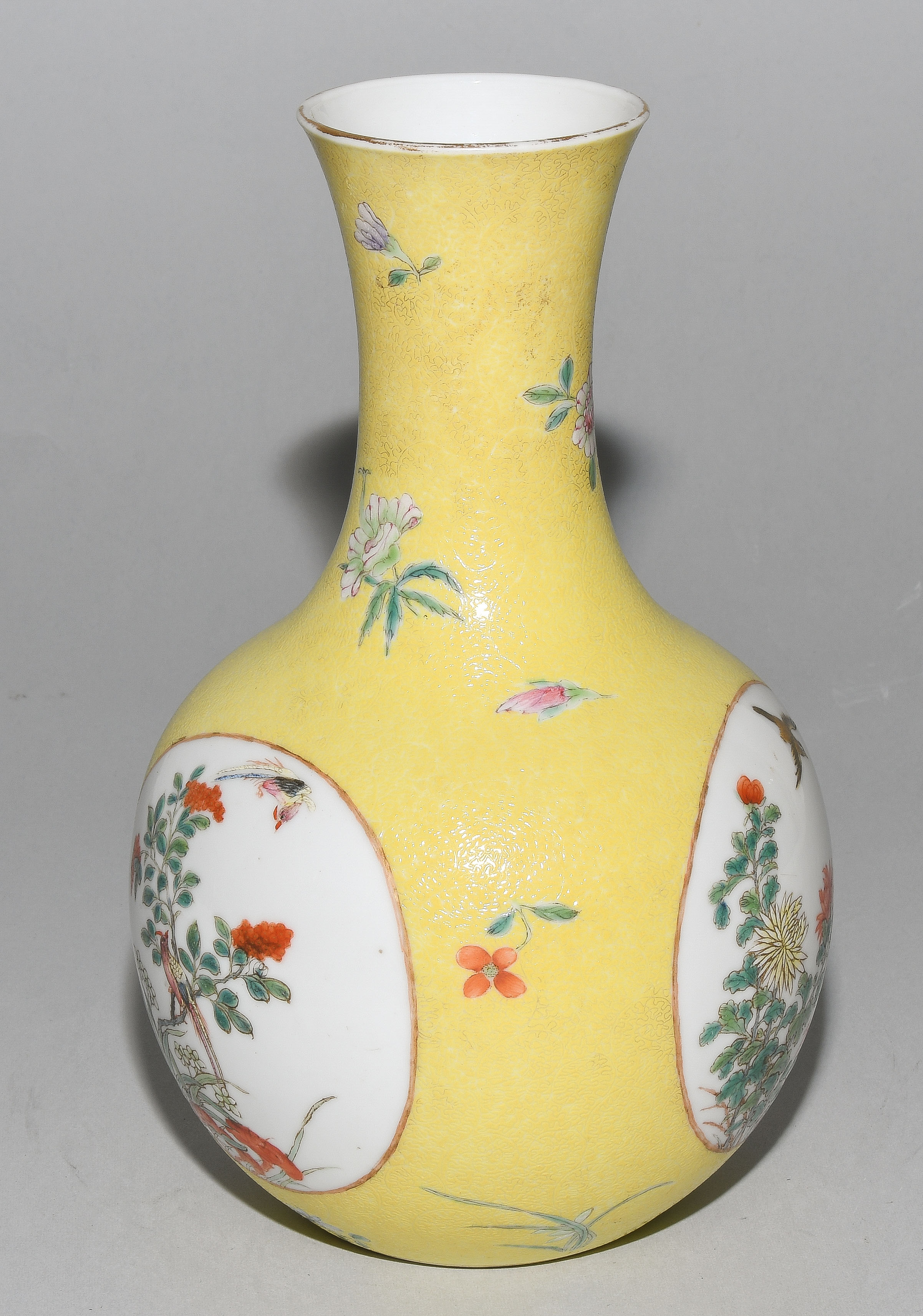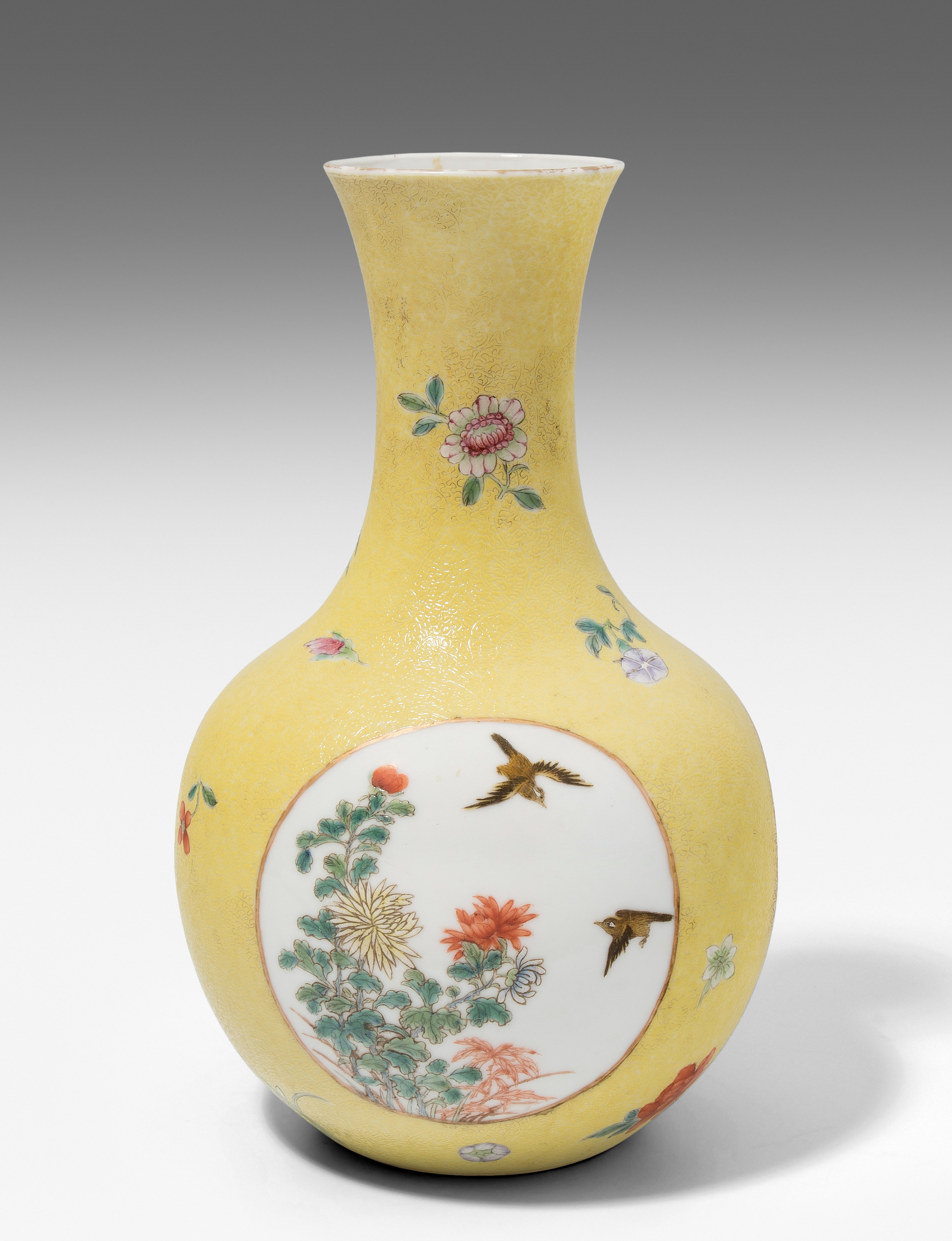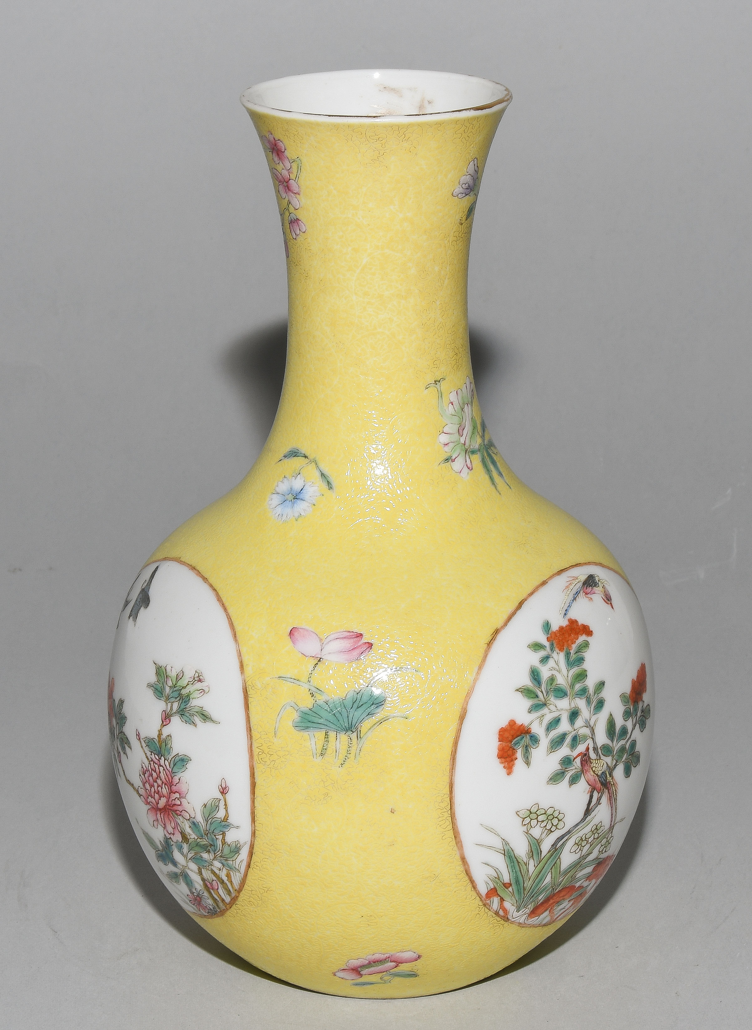 China. Porzellan. Kugeliger Körper mit ausladendem Hals. In den Reserven Blumen-/Vogeldekor in Famille rose. Fein gravierter Blätterrankendekor auf gelbem Fond. H 21 cm. Minime Schadstellen.