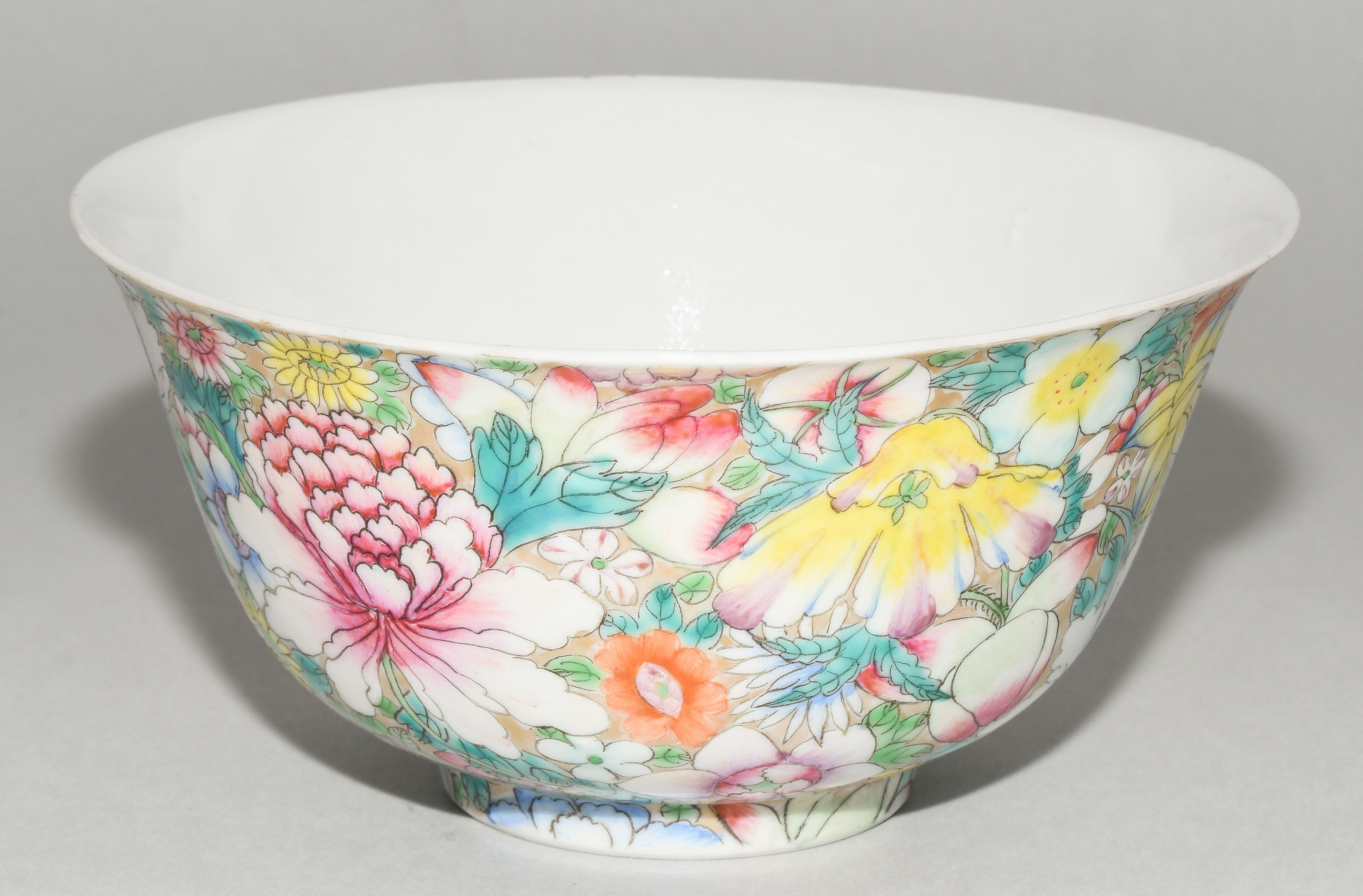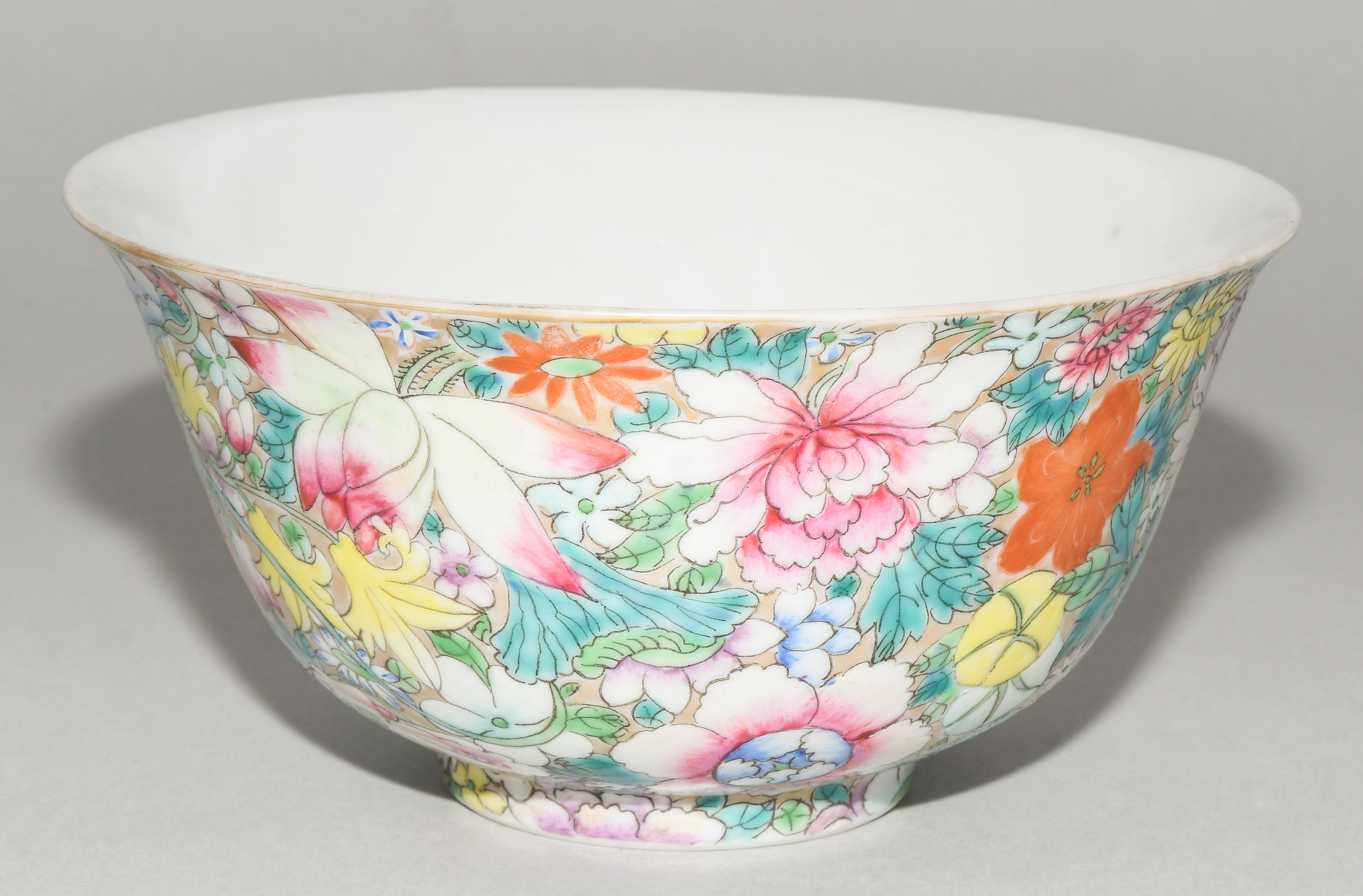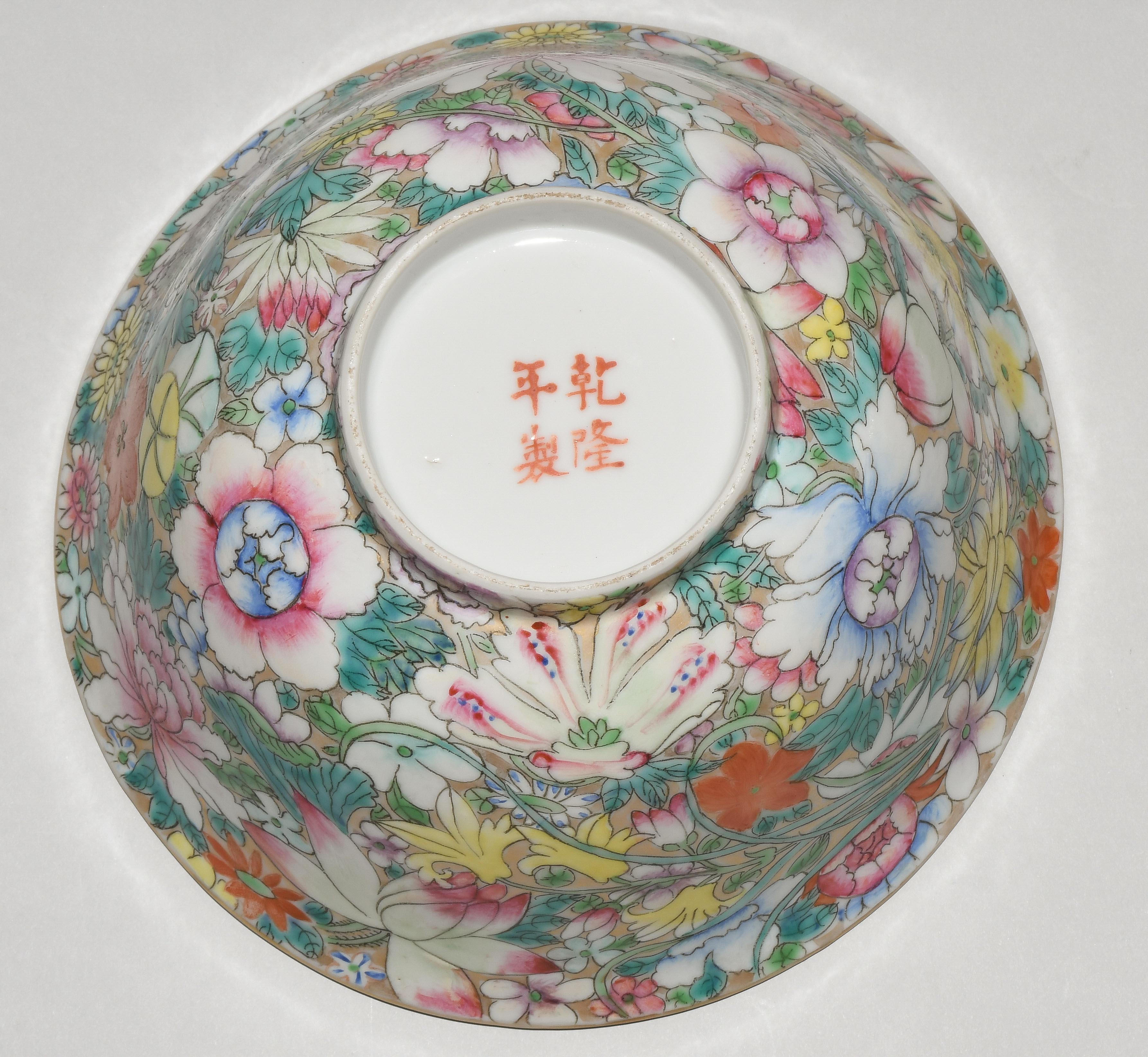 China, 20.Jh. Porzellan. Millefiori-Dekor in Famille rose auf goldenem Fond. Eisenrote, gedruckte Qianlong-Marke. H 8,5, Ø 17,7 cm. - Minime Schadstellen.