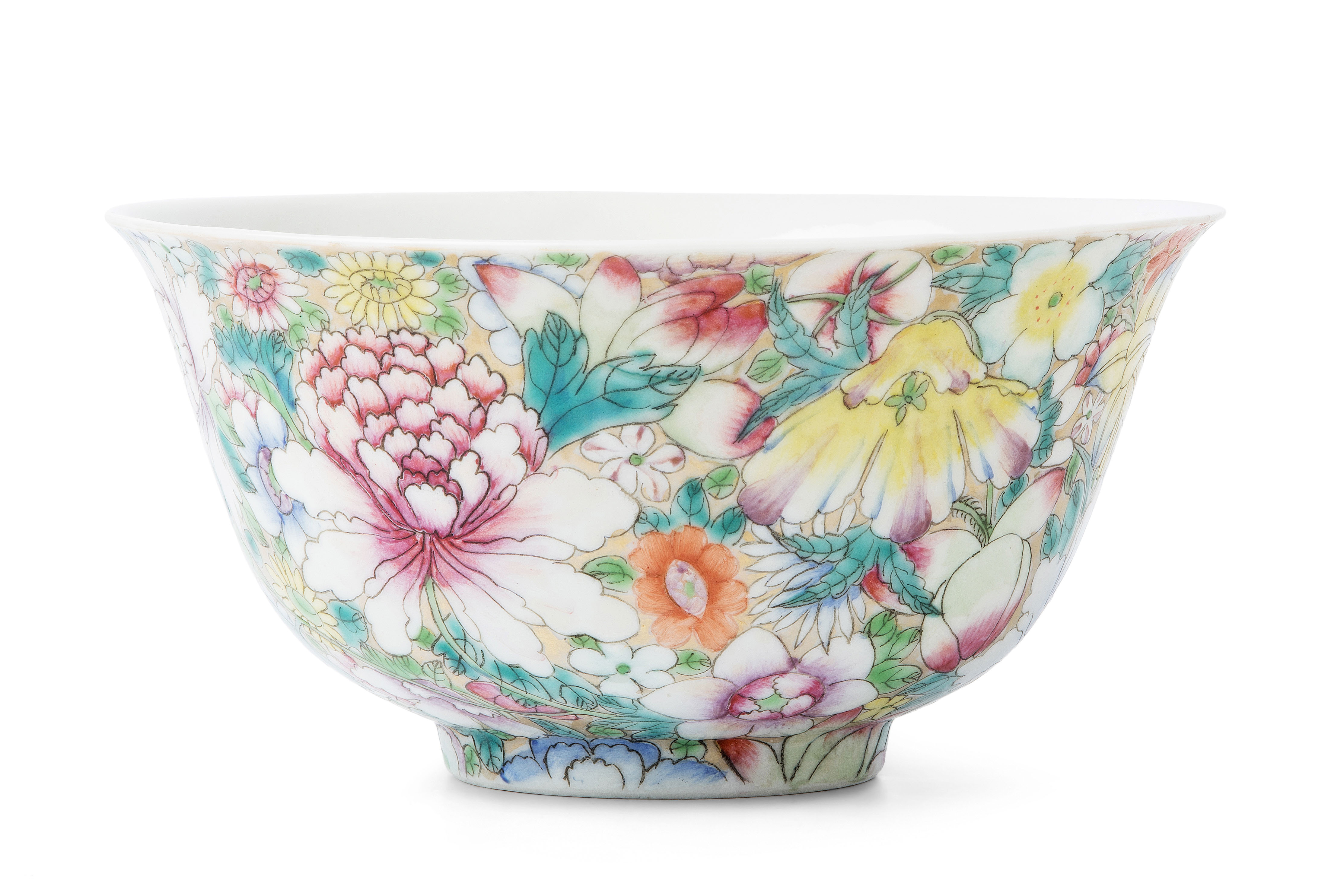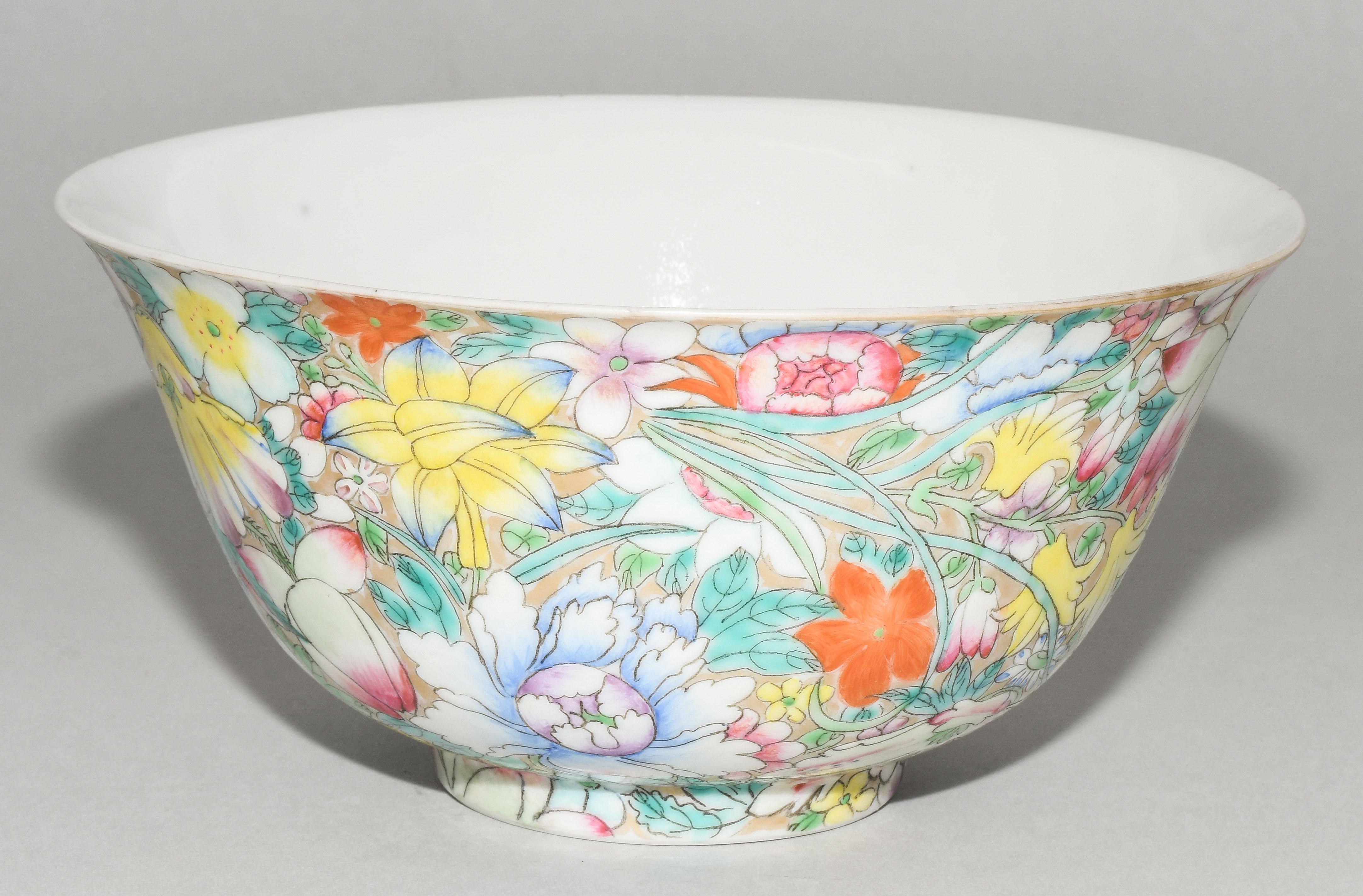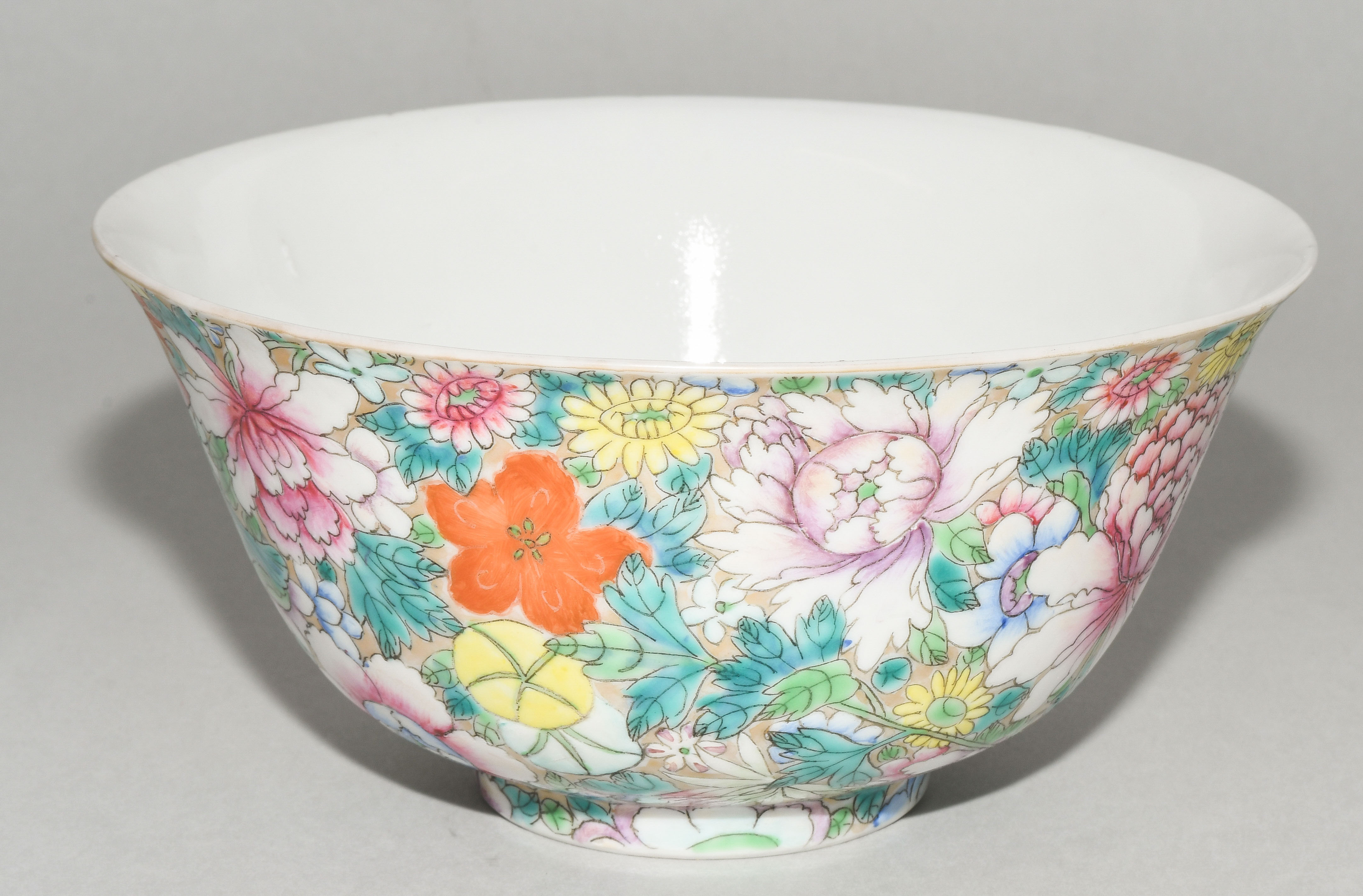 China, 20.Jh. Porzellan. Millefiori-Dekor in Famille rose auf goldenem Fond. Eisenrote, gedruckte Qianlong-Marke. H 8,5, Ø 17,7 cm. - Minime Schadstellen.