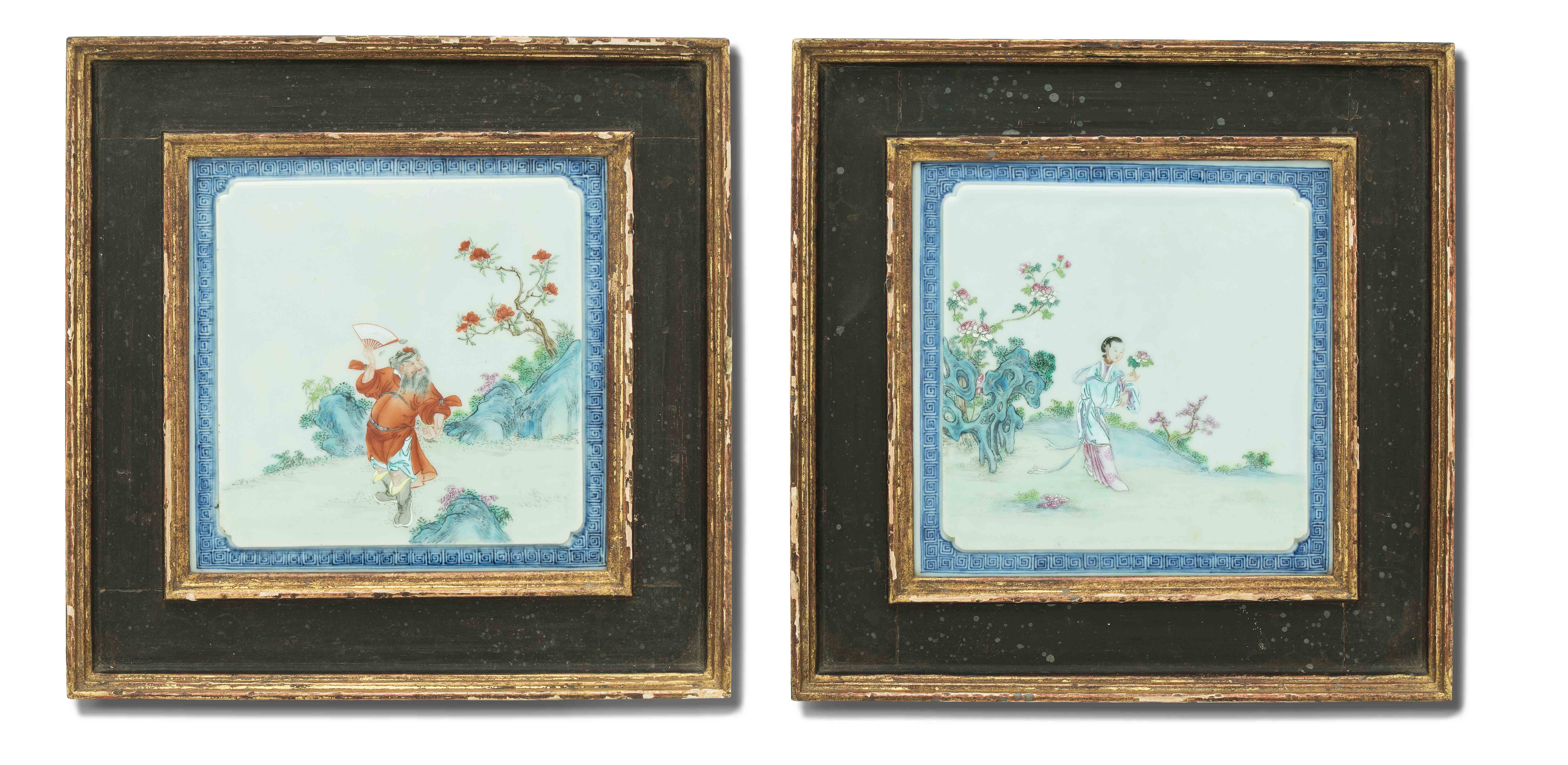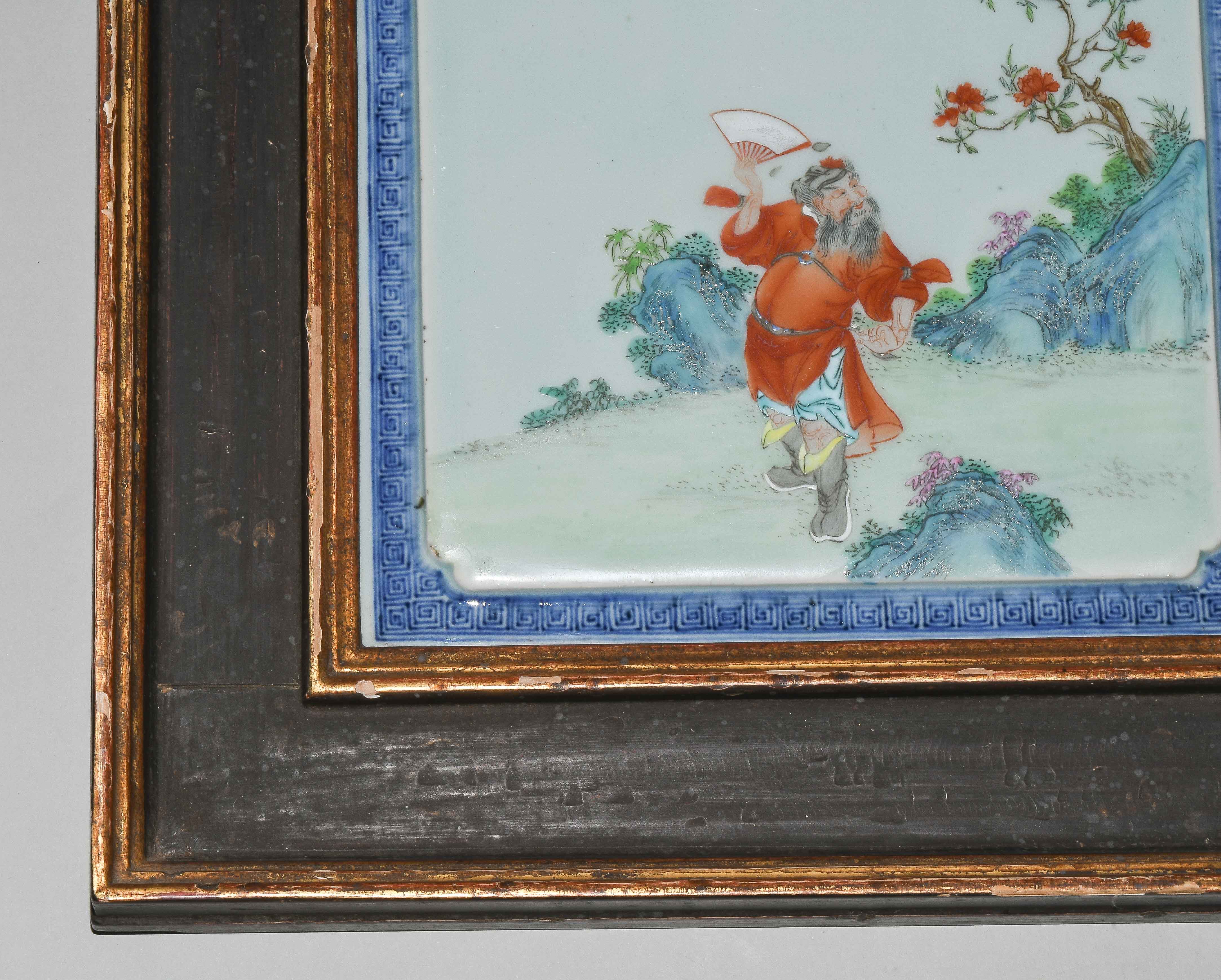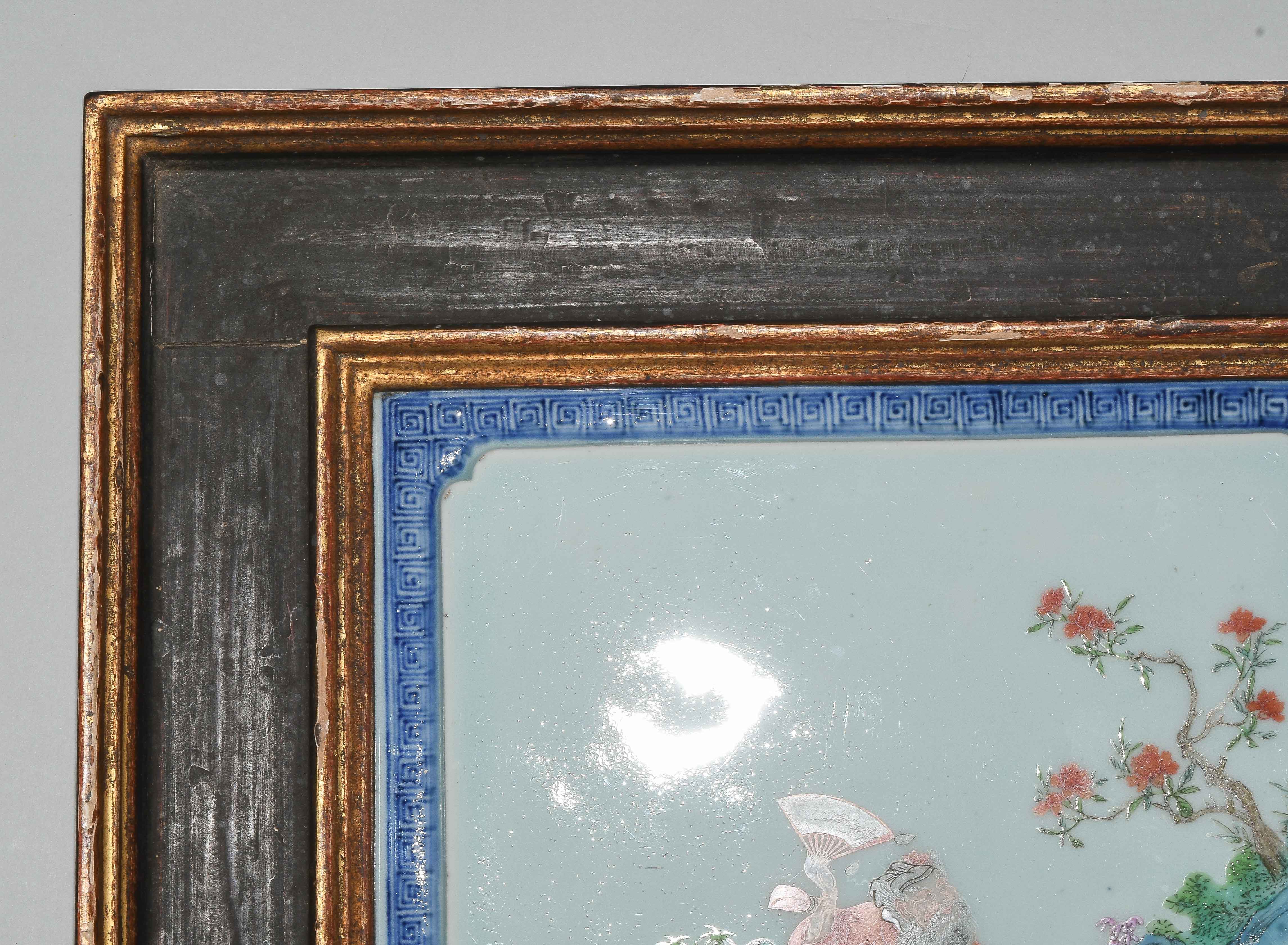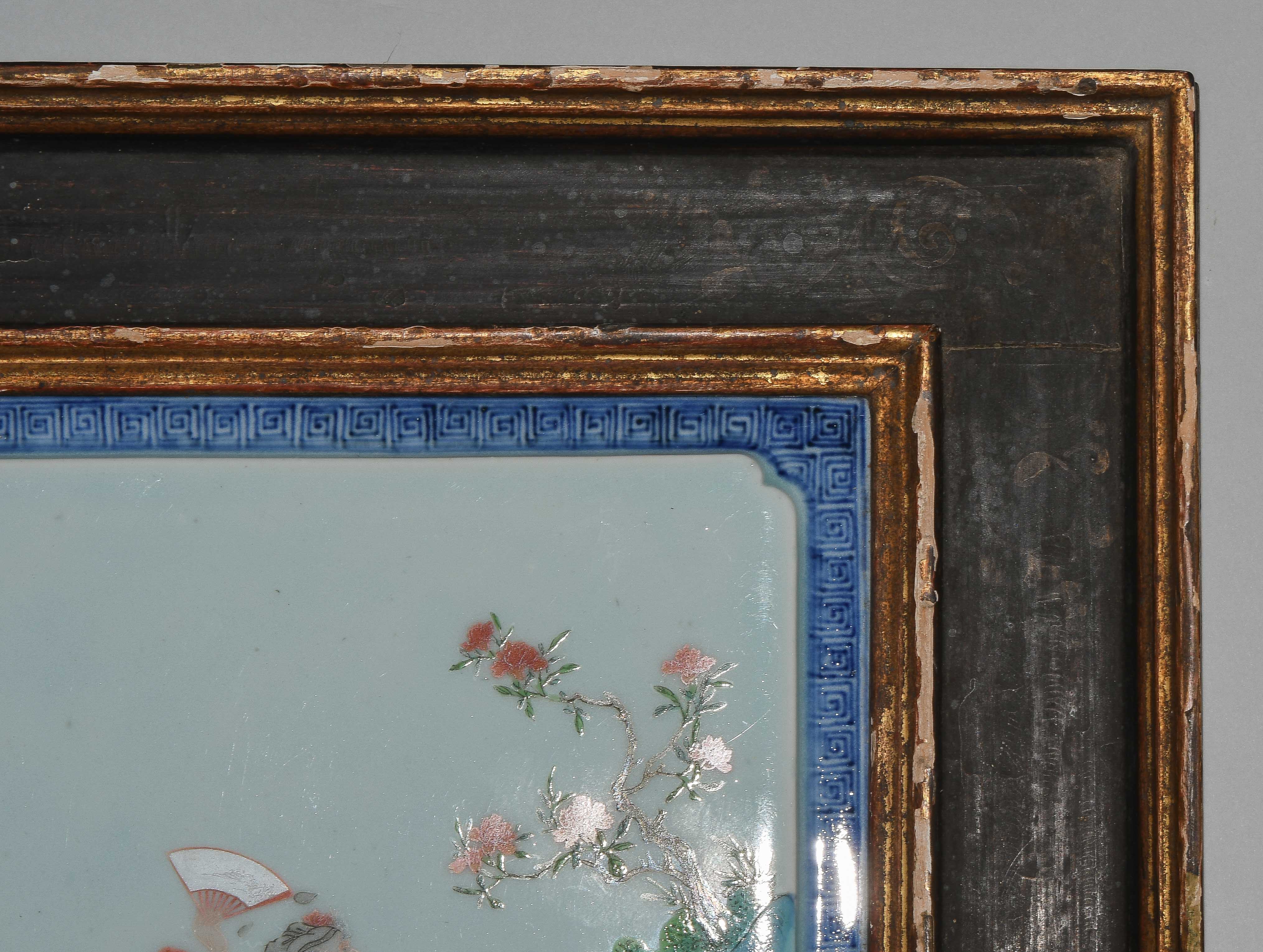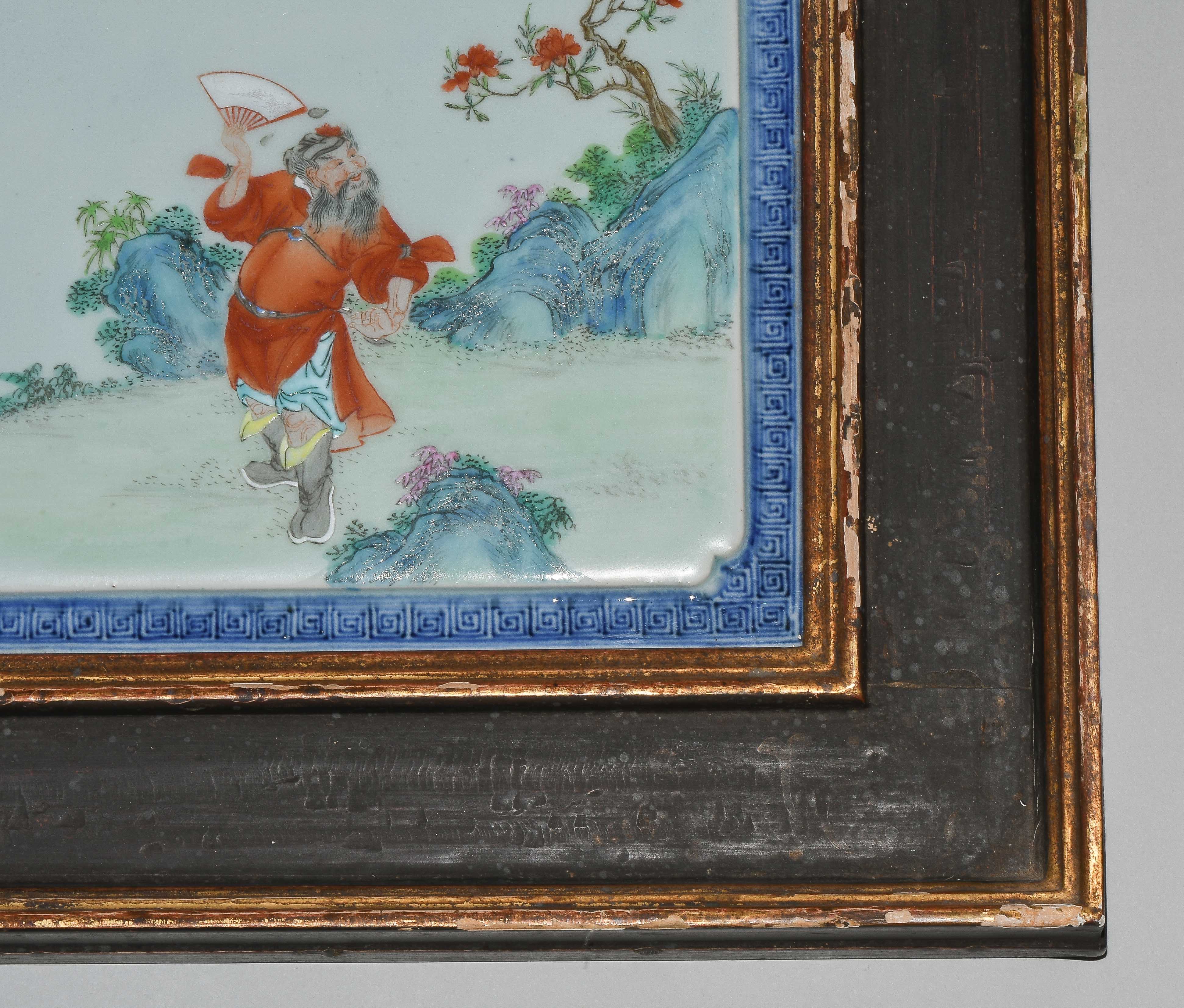 China, späte Qing-/ Republik-Zeit. Polychromer Dekor mit Zhongli Quan bzw. He Xiangu von den Acht Unsterblichen in blühendem Garten auf leicht erhöhtem, celadonfarbenem Grund. Rand mit Mäandermuster in Unterglasurblau. Ca. 24,5x24,5 cm. Gerahmt.