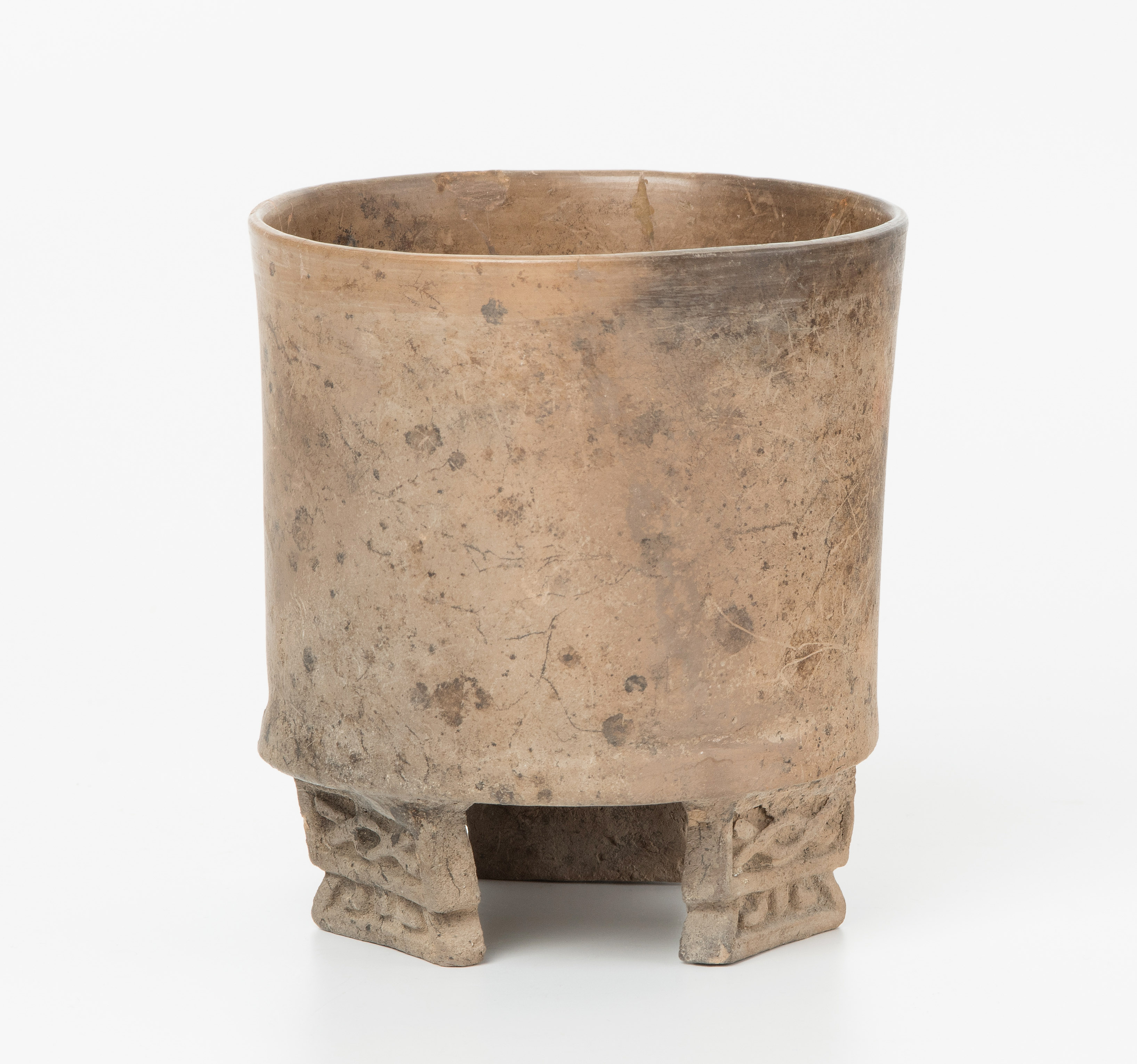 Mexico, vermutlich Teotihuacan, um 400–750 n.C. Ton. Zylindrischer Becher auf drei Füssen. H 11,5, D 10,5 cm. - Repariert.