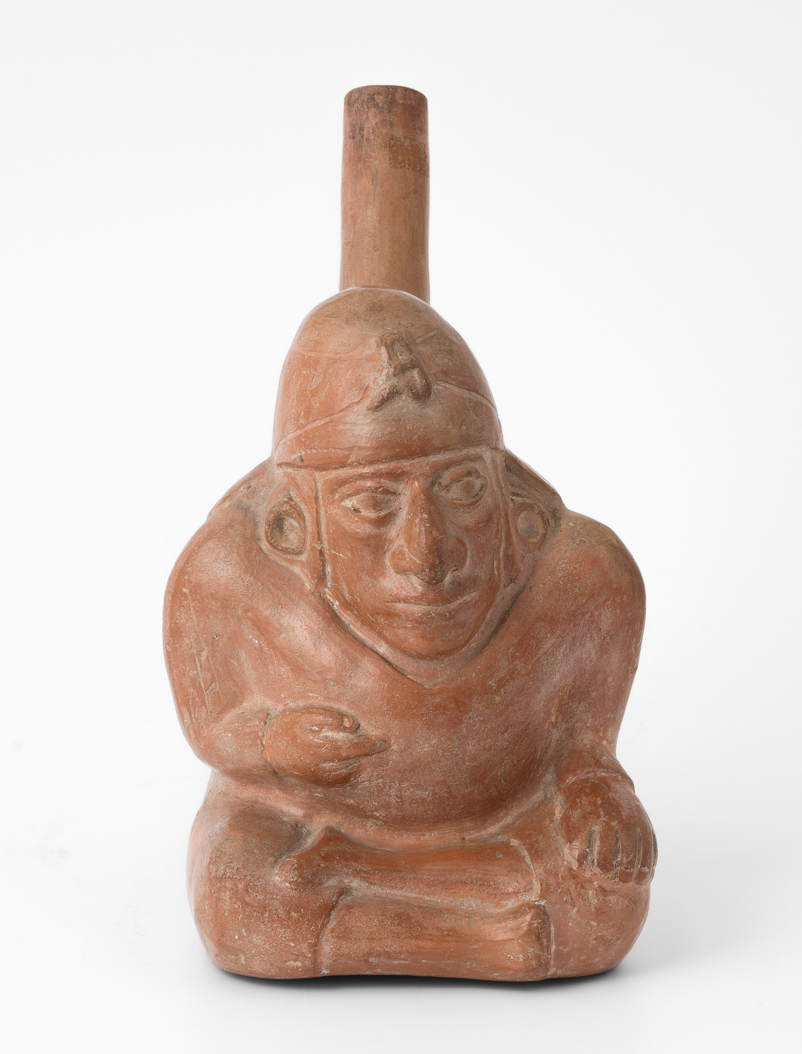 Peru, Moche, ca. 500–700 n.C. Rötlicher Ton, rotbraun bemalt. Gefäss in Form eines sitzenden Würdenträgers. H 22 cm.