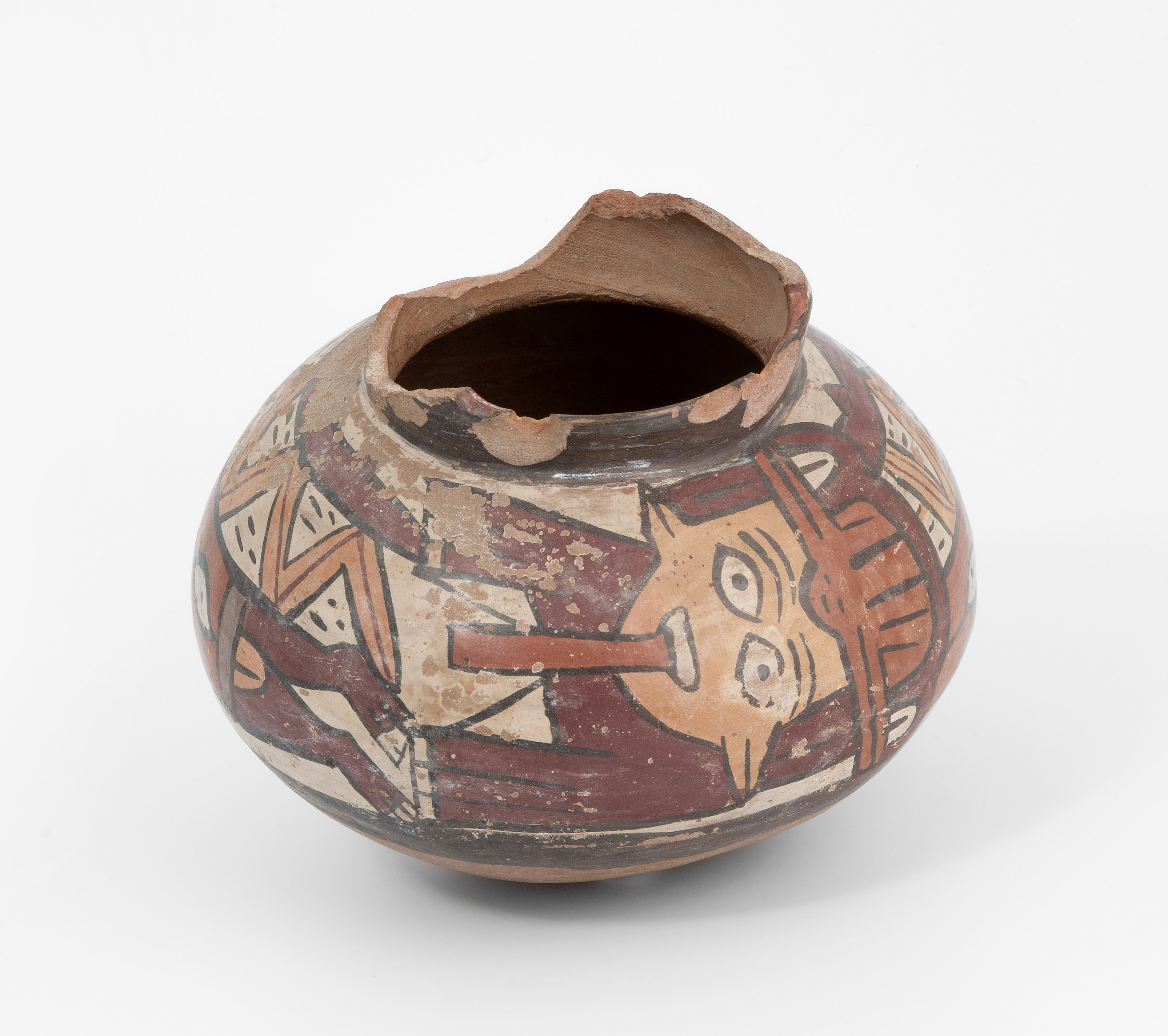 Peru, Nazca, 200–800 n.C. Rötlicher Ton, polychrom bemalt. Darstellung eines mythologischen Wesens mit grosser Maske und langem Körper. H 14 cm. - Rand mehrfach bestossen.