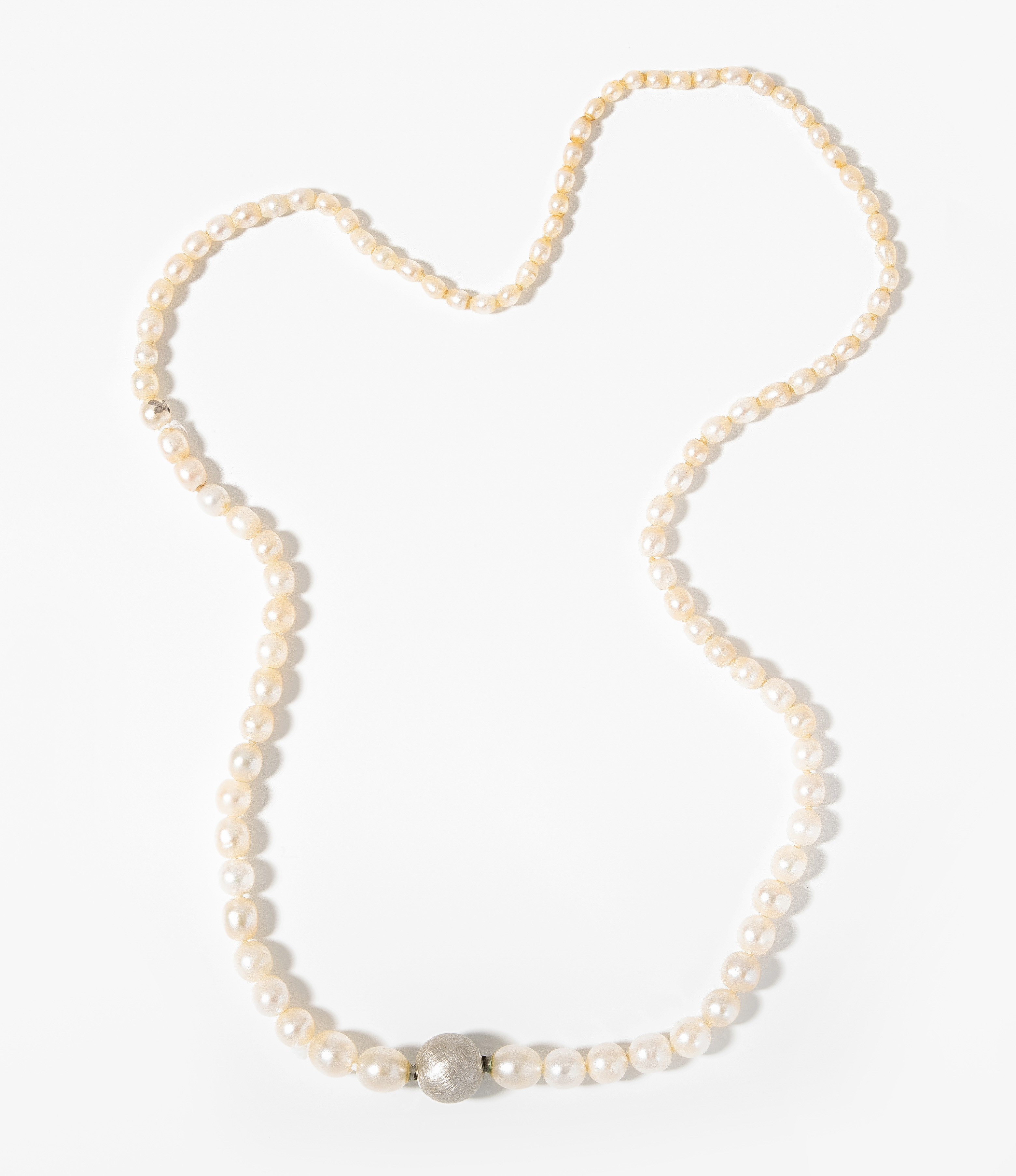750 Weissgold. Feines Salzwasser-Naturperlen-Collier, davon 1 Glasperle und 2 Kulturperlen, im Verlauf 3–6 mm Ø. Satinierter Bajonett-Verschluss. L 47 cm, 15,2 g. Prüfung durch GGTL.