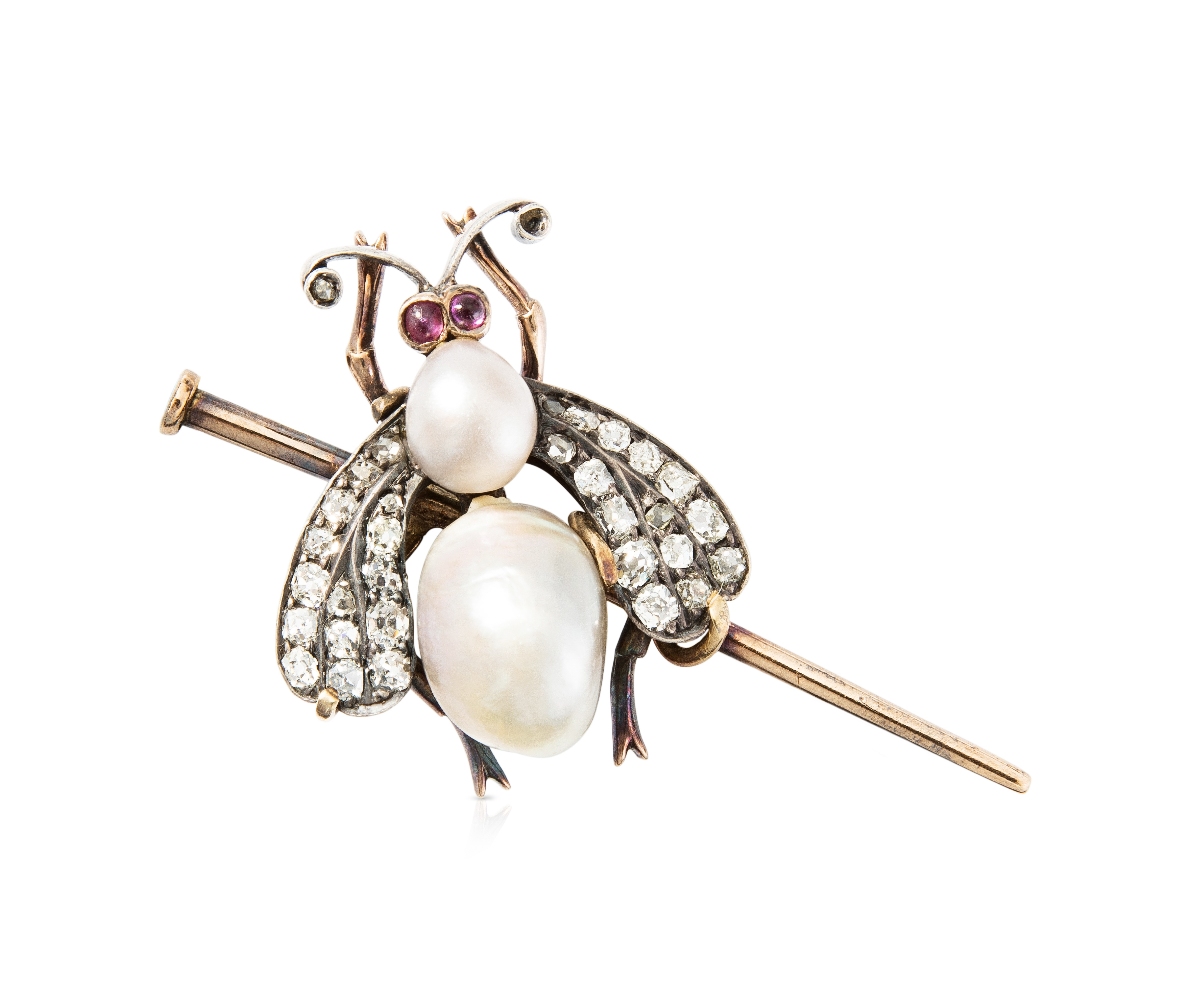 Ende 19.Jh. Silber/Gelbgold. Körper aus 2 Salzwasser-Naturperlen ca. 10x8/7x6 mm (Prüfung GGTL) Flügel und Fühler mit Altschliff-Diamanten bestückt, ca. 0.40 ct. 2 Rubinaugen. 2x2,5 cm. Nadel 4 cm. Broschierung später ers. 6,6 g.