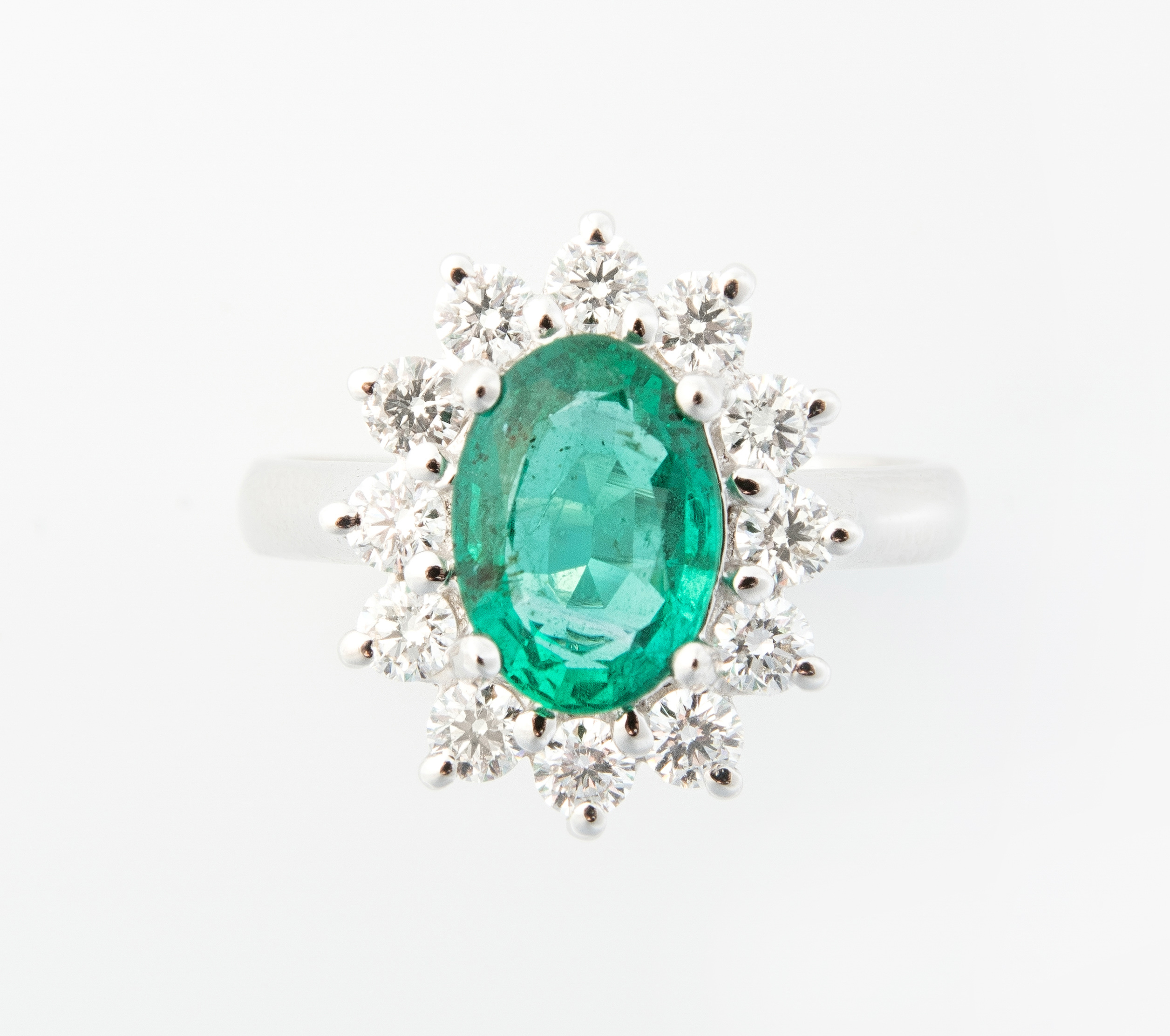 750 Weissgold. Entourage-Modell mit 1 oval fac. Smaragd von ca. 1.80 ct, umgeben von 12 Brillanten ca. 0.90 ct. Gr. 56, 6,8 g.