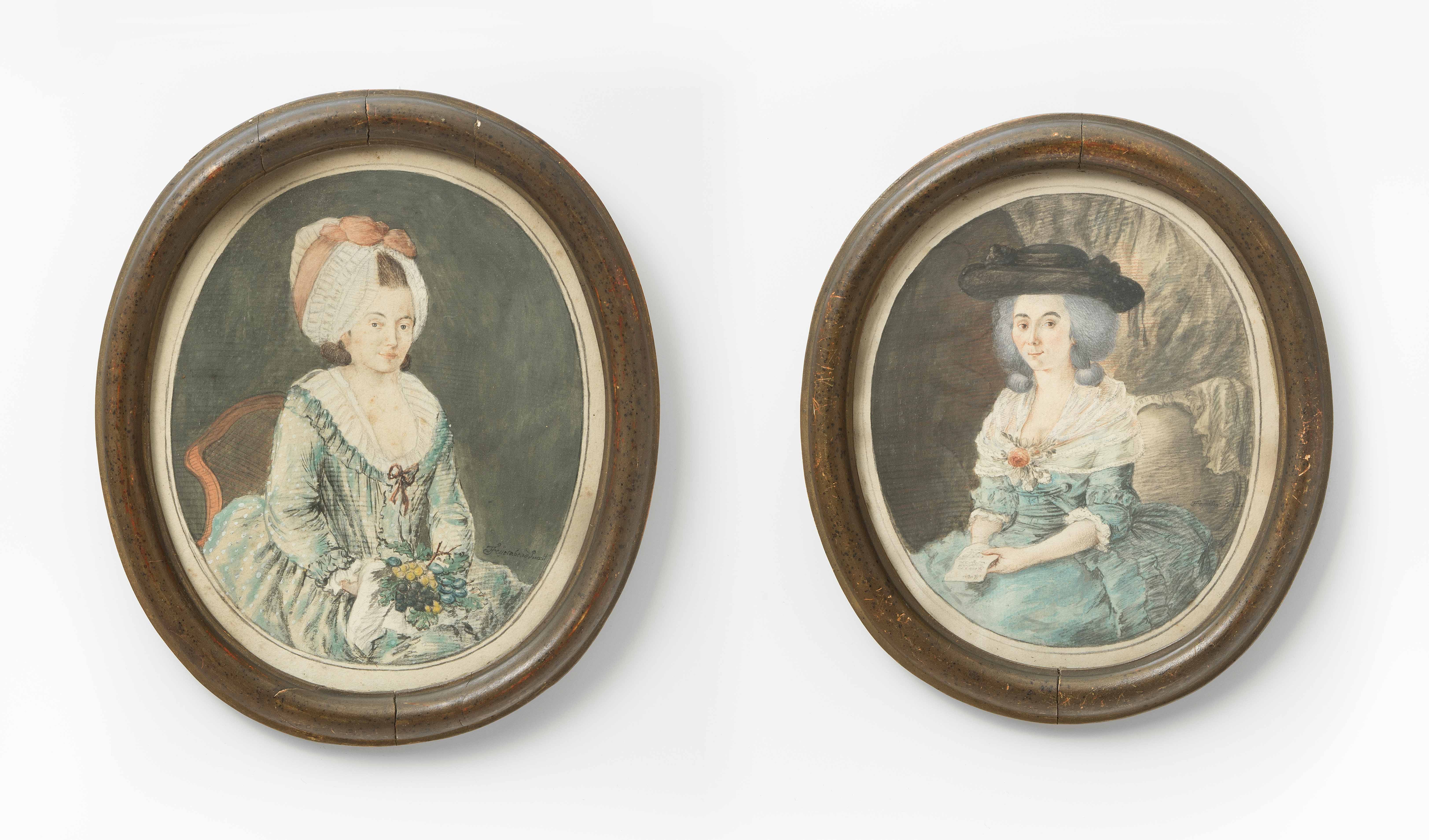 Basel, um 1780. Aquarell auf Papier, oval, signiert Franz Feyerabend (1755–1800). Darstellungen zweier Damen, beide in blauem dekolletiertem Kleid, die eine mit Hut, die andere mit Haube und Masche. Gerahmt. 15,2x18 und 16x19,6 cm.