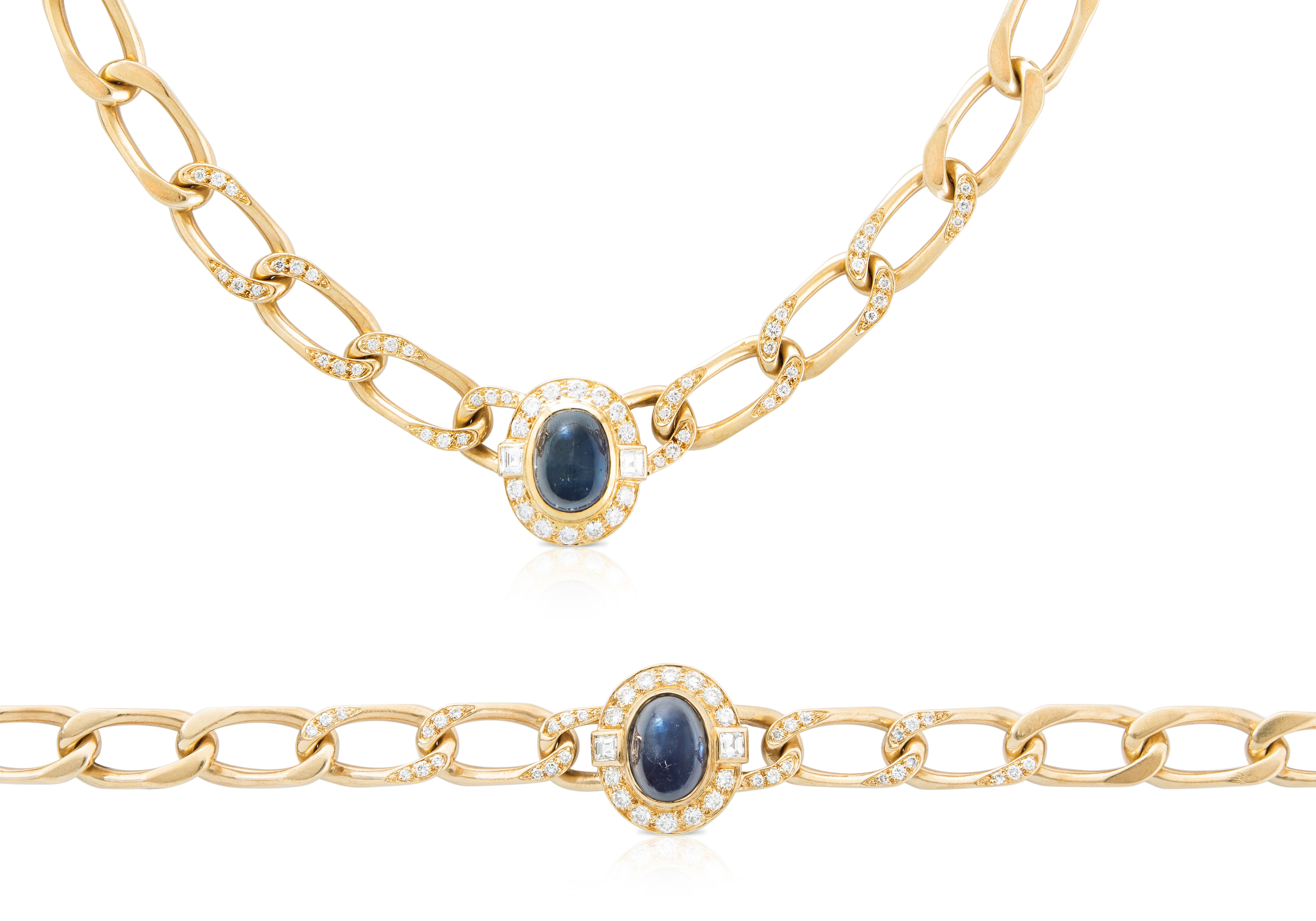 Frankreich, 1960er Jahre. 750 Gelbgold. Signiert und nummeriert "Cartier Paris 227863/228729". Collier und Bracelet aus Goldgliedern mit je 1 Saphir-Cabochon, zus. ca. 12 ct, unbehandelt. Verziert mit 100 Brillanten ca. 1.60 ct und 4 Diamant-Carrés zus. ca. 0.50 ct. L 38,5/19 cm. Gesamtgewicht 107,5 g.