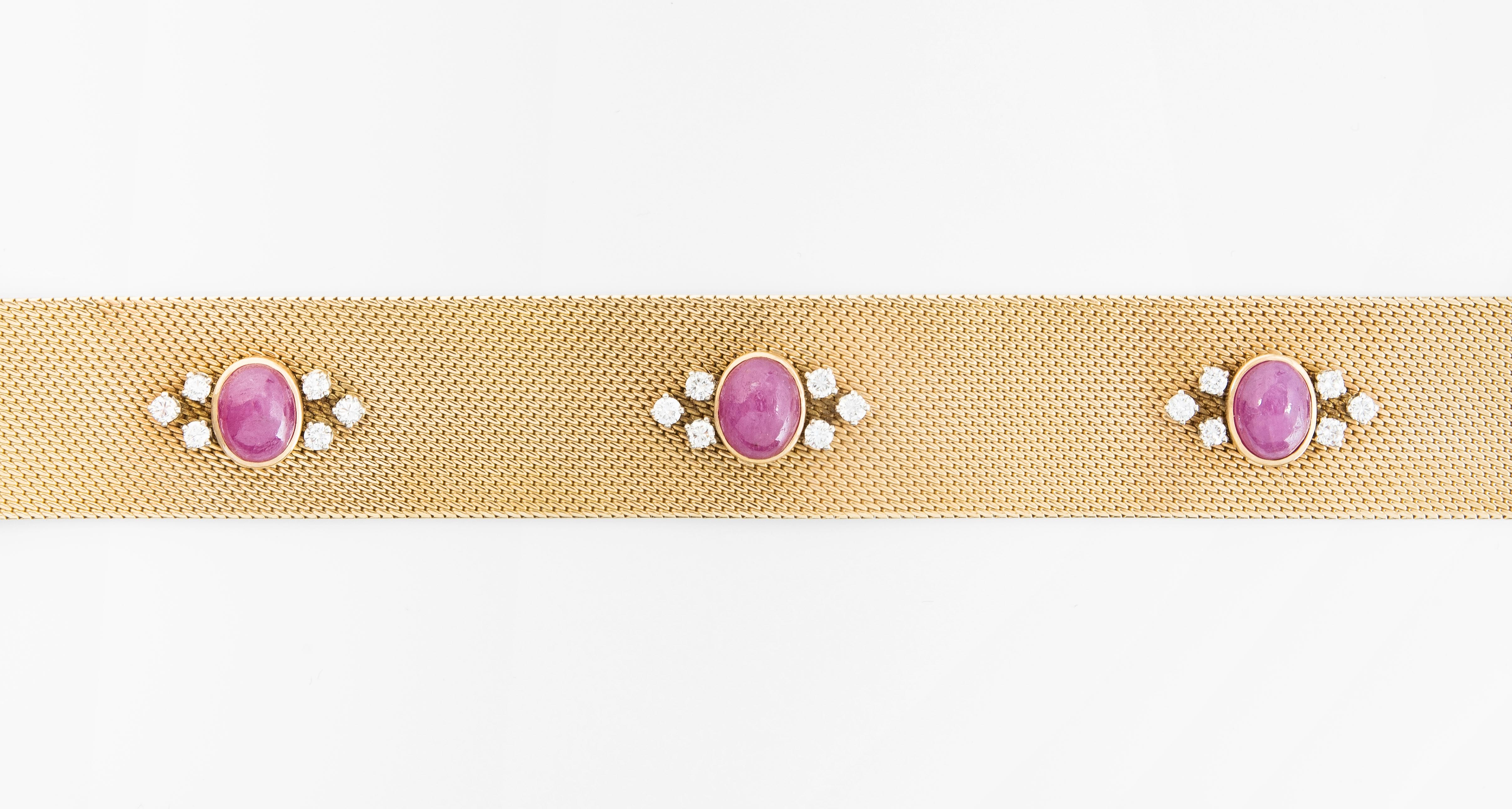 750 Gelbgold. Flaches Milanaiseband mit 3 ovalen Rubin-Cabochons ca. 7.50 ct in Zargen gefasst. Umgeben von 18 Brillanten ca. 1.10 ct. L 18 cm, B 2 cm, 60,2 g.