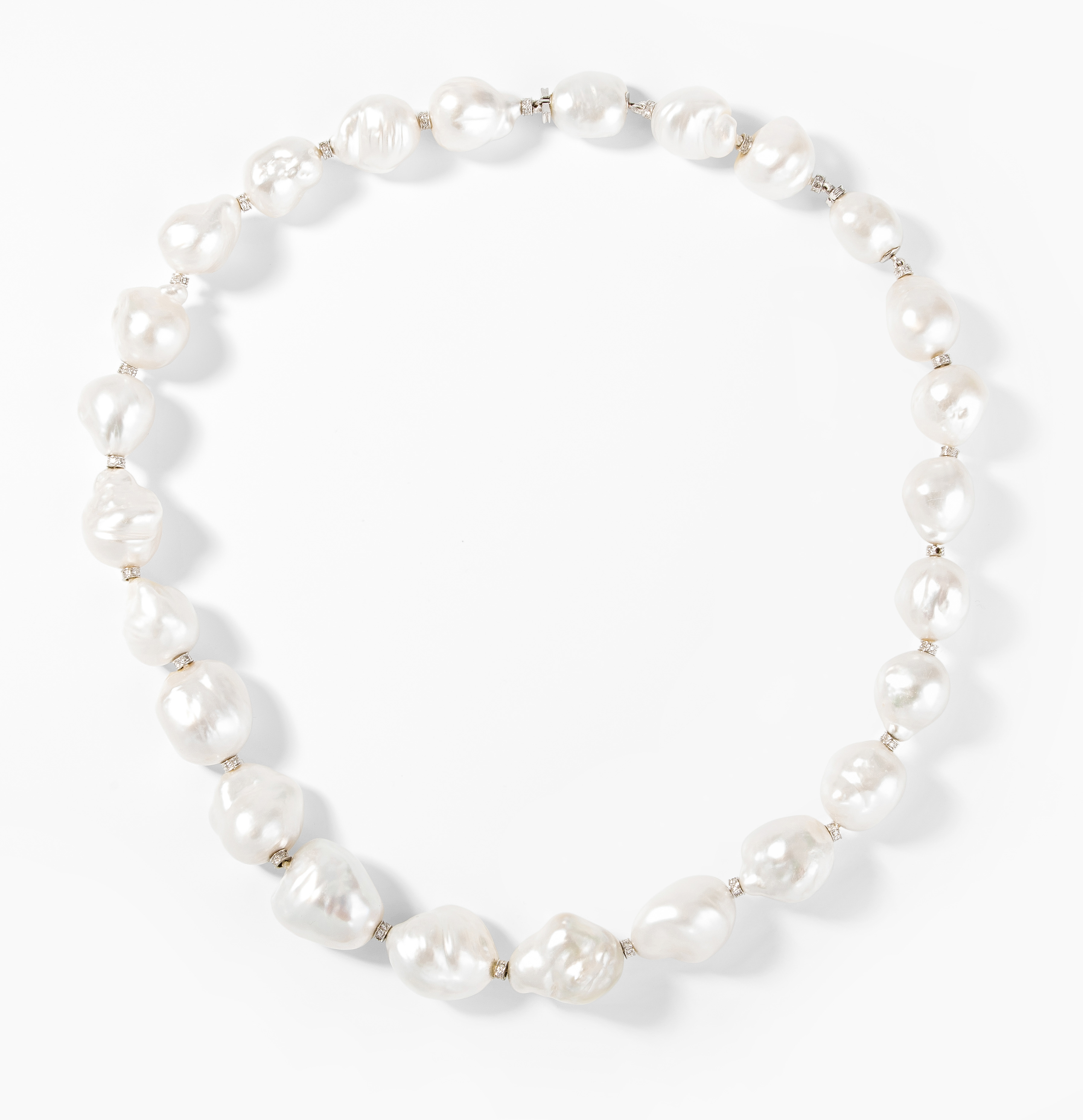 750 Weissgold. Sehr schöne barocke Südseeperlen im Verlauf von ca. 10–16 mm Ø. Dazwischen kl. Brillantrondellen ca. 1 ct. Bajonettverschluss, L 41/47 cm.