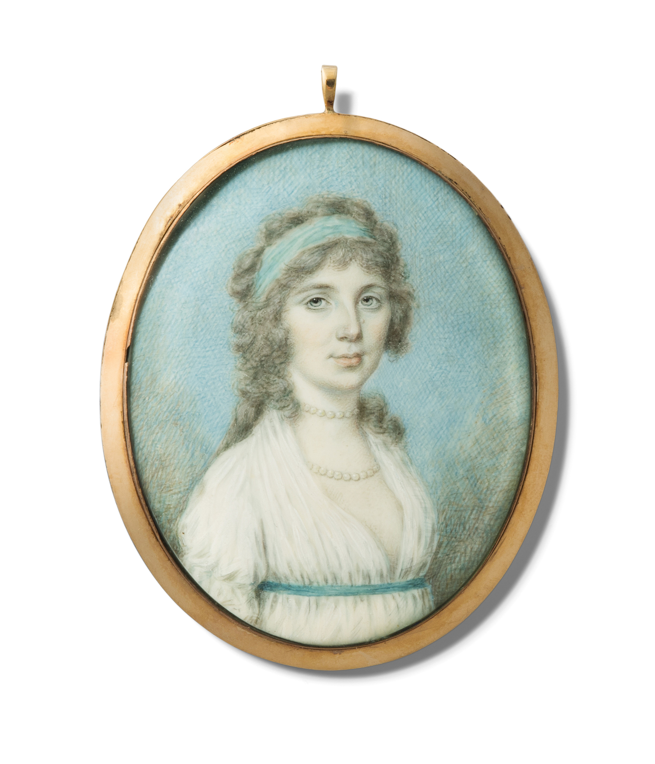 Englische Schule, um 1800. Gouachemalerei auf Elfenbein, oval. Darstellung einer jungen Dame mit langer Lockenfrisur und blauem Haarband, in weissem Kleid und Perlencollier. Vor Himmelshintergrund. Rückseitig verglast. Goldfassung mit Öse. 5,4x6,9 cm.