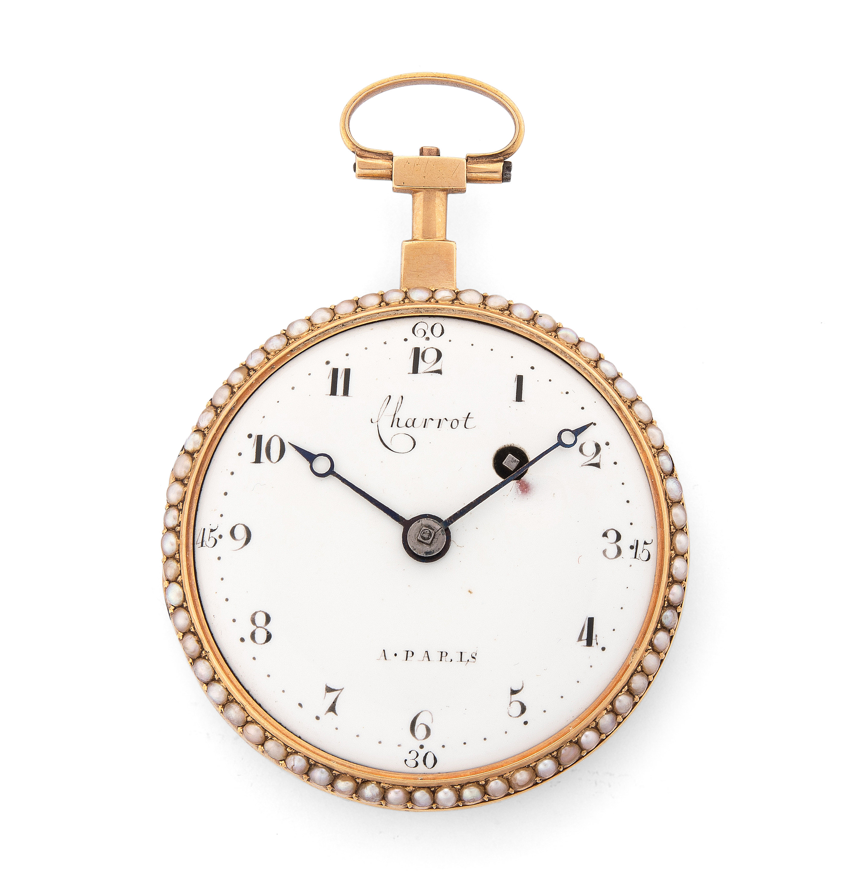 Runde, mechanische Spindeltaschenuhr um 1835 mit Schlüsselaufzug in 750 Gelbgoldgehäuse ca. 15 g. Lünette mit Perlenverzierung, Rückendeckel mit Email und Perlen. Fein gearbeitetes Messing-Uhrwerk, signiert Charrot à Paris 2189, Kette, Schnecke, und grosse Unruhe unter durchbrochenem, verzierten Coq, D 44 mm. Weisses Emailzifferblatt mit schwarzen, arabischen Stundenzahlen und -indizes, Breguet-Zeiger, Aufzugsloch bei 2 Uhr mit Schadstelle, Bügel bei 12 Uhr. Gebrauchsspuren. Schlüssel beigegeben.