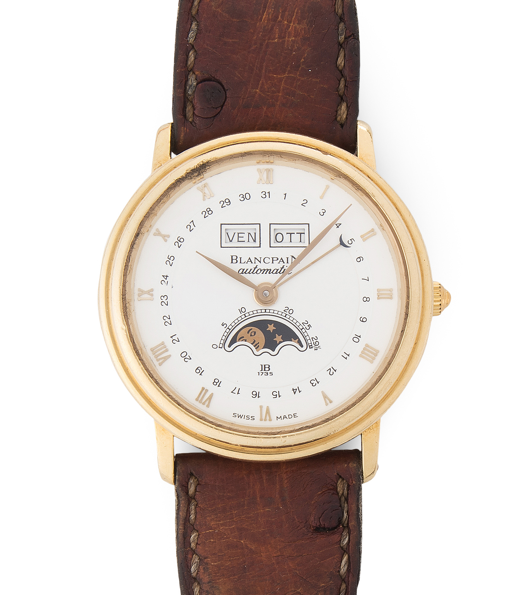 Runde, automatische Armbanduhr 80er Jahre mit Vollkalender in 750 Gelbgoldgehäuse ca. 30 g. Boden gedrückt, Kaliber 95, Referenznummer 1240, D 33 mm. Weisses Zifferblatt mit aufgesetzten, goldfarbenen, römischen Stundenzahlen, schwarzer, arabischer Datumsring. Goldfarbene Stab-Zeiger, zentraler Datumszeiger. Tages- und Monatsfenster bei 12 Uhr, Mondphasenanzeige bei 6 Uhr. Krone bei 3 Uhr, Drücker für die Kalendereinstellungen bei 2, 4, 8 und 10 Uhr. Dunkelbraunes Original Lederarmband mit 750 Gelbgolddornschliesse. Gebrauchsspuren.
