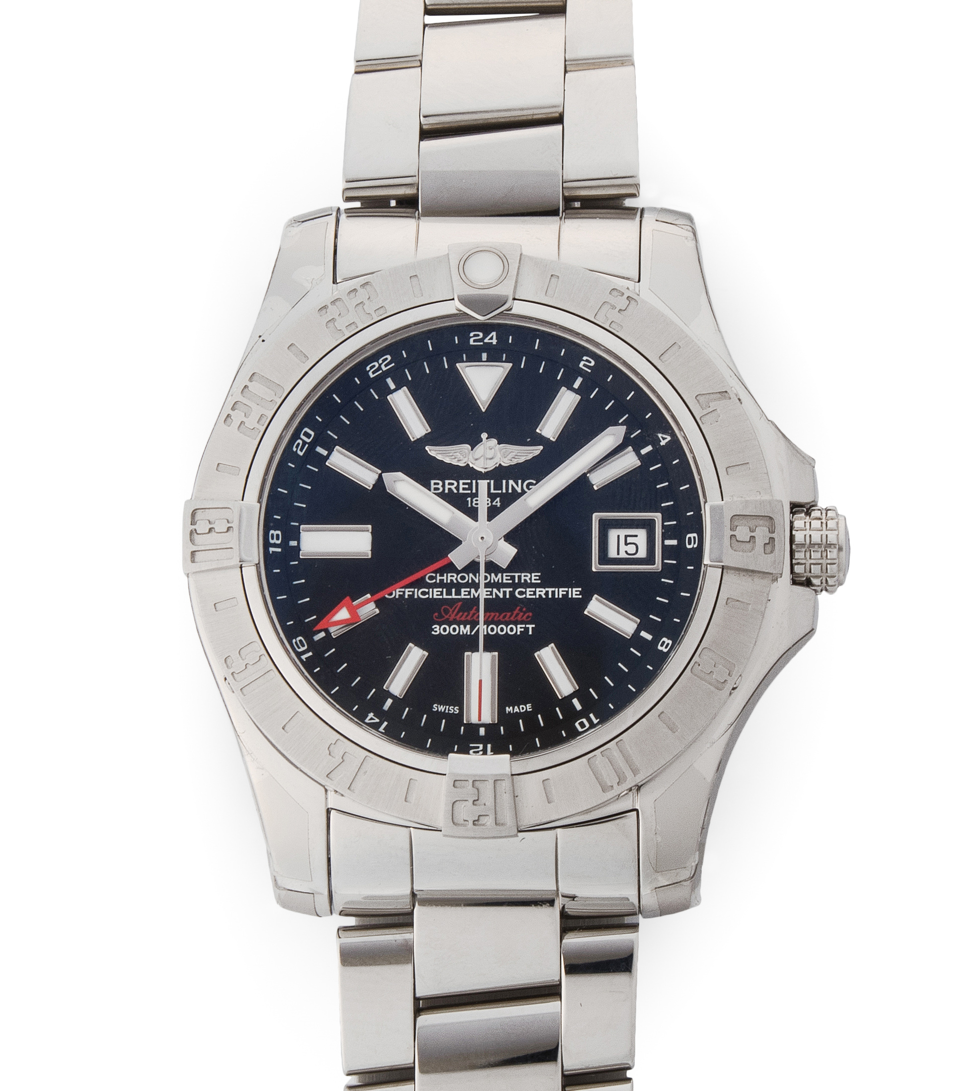 Runder, automatischer Chronometer 90er Jahre in Stahlgehäuse. Boden verschraubt, Gehäusenummer 1619295, Referenznummer A32390, D 43 mm. Schwarzes Zifferblatt mit weissen Stundenindizes, weisse Minuten-, Sekundenindizes, Silberfarbene Stab-Zeiger, zentraler GMT- und Sekundenzeiger, Datumsfenster und verschraubte Krone bei 3 Uhr. Drehbare Lünette mit 24er Einteilung. Stahlarmband mit einseitiger Faltschliesse und Sicherungsbügel, Umfang 20 cm. Box und Papiere beigegeben. Ungetragen, keine Gebrauchsspuren.