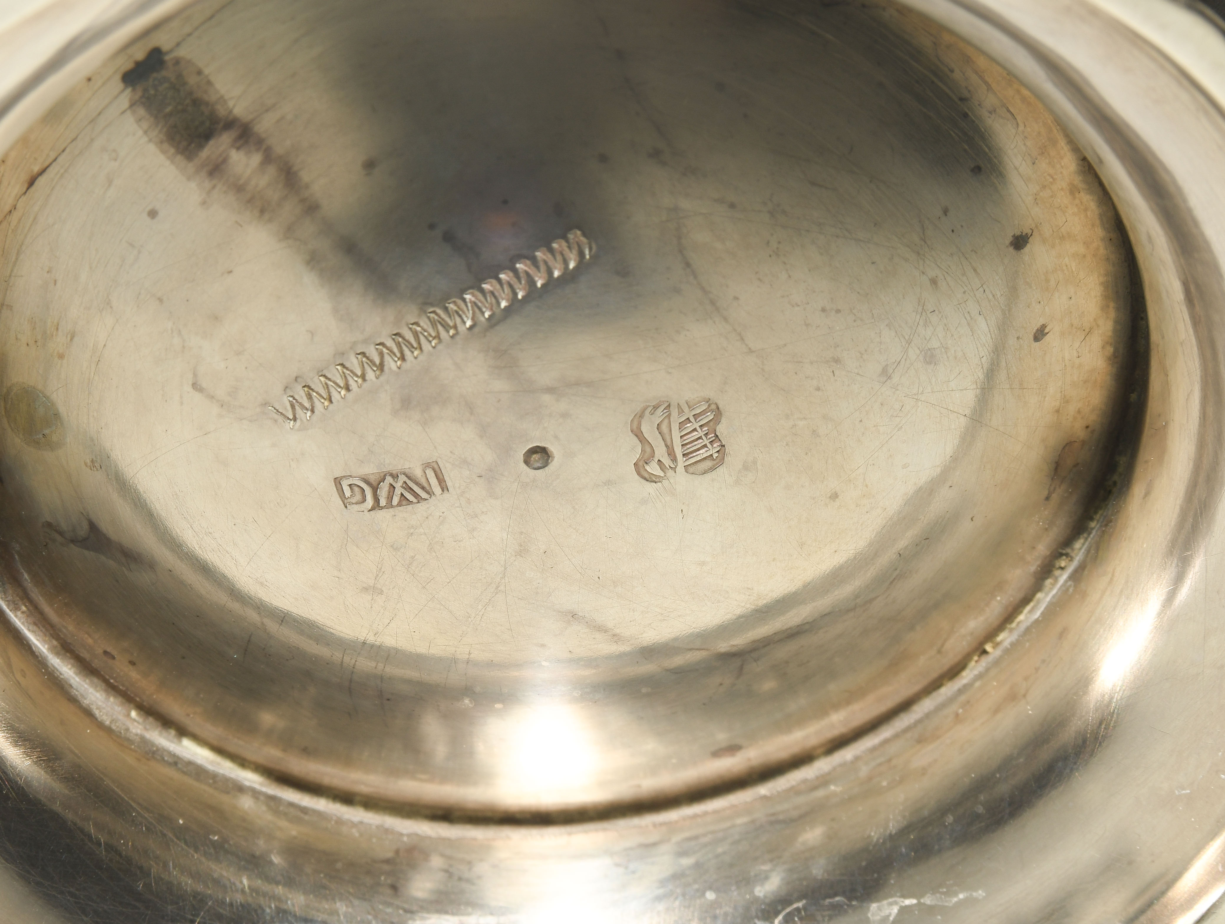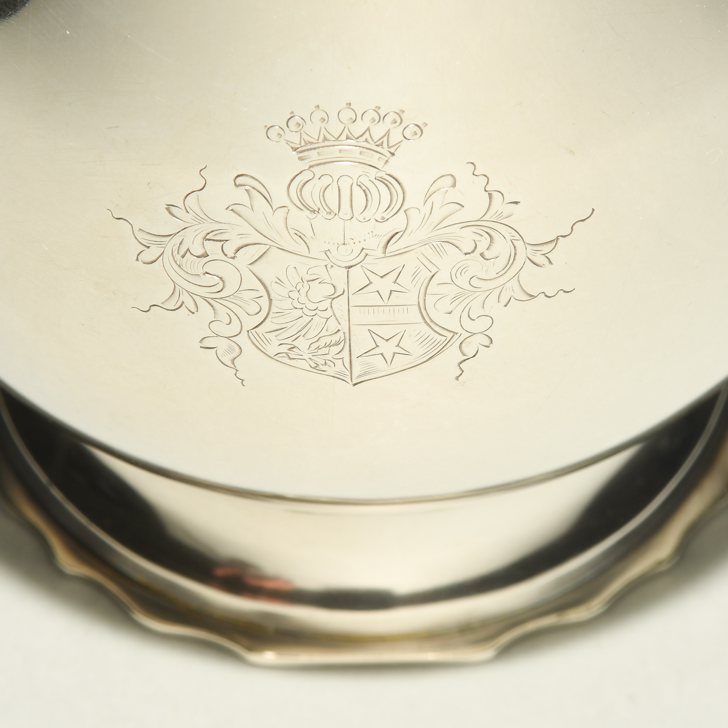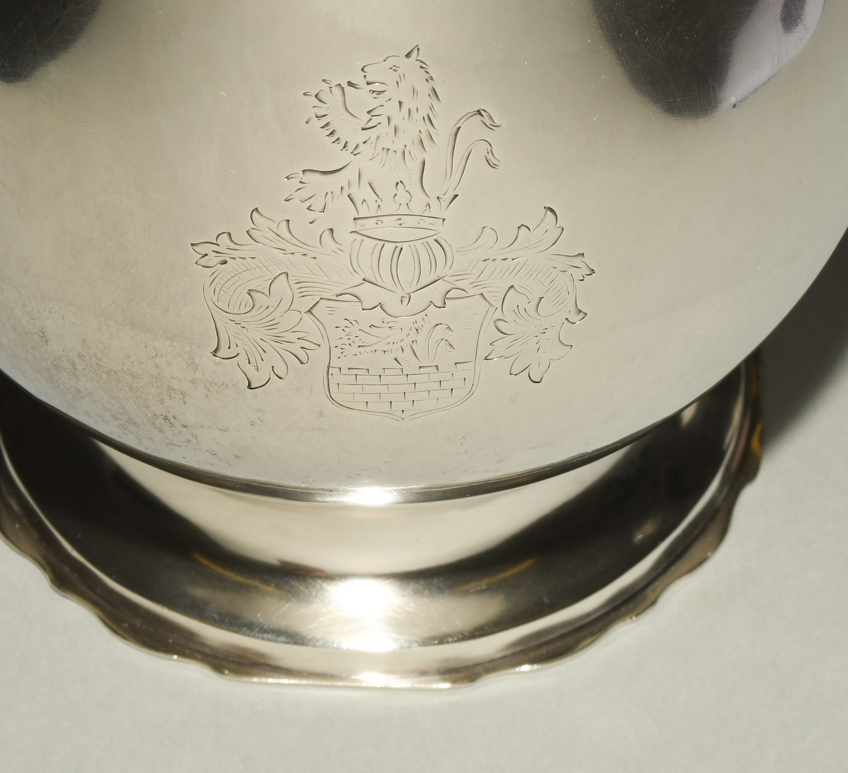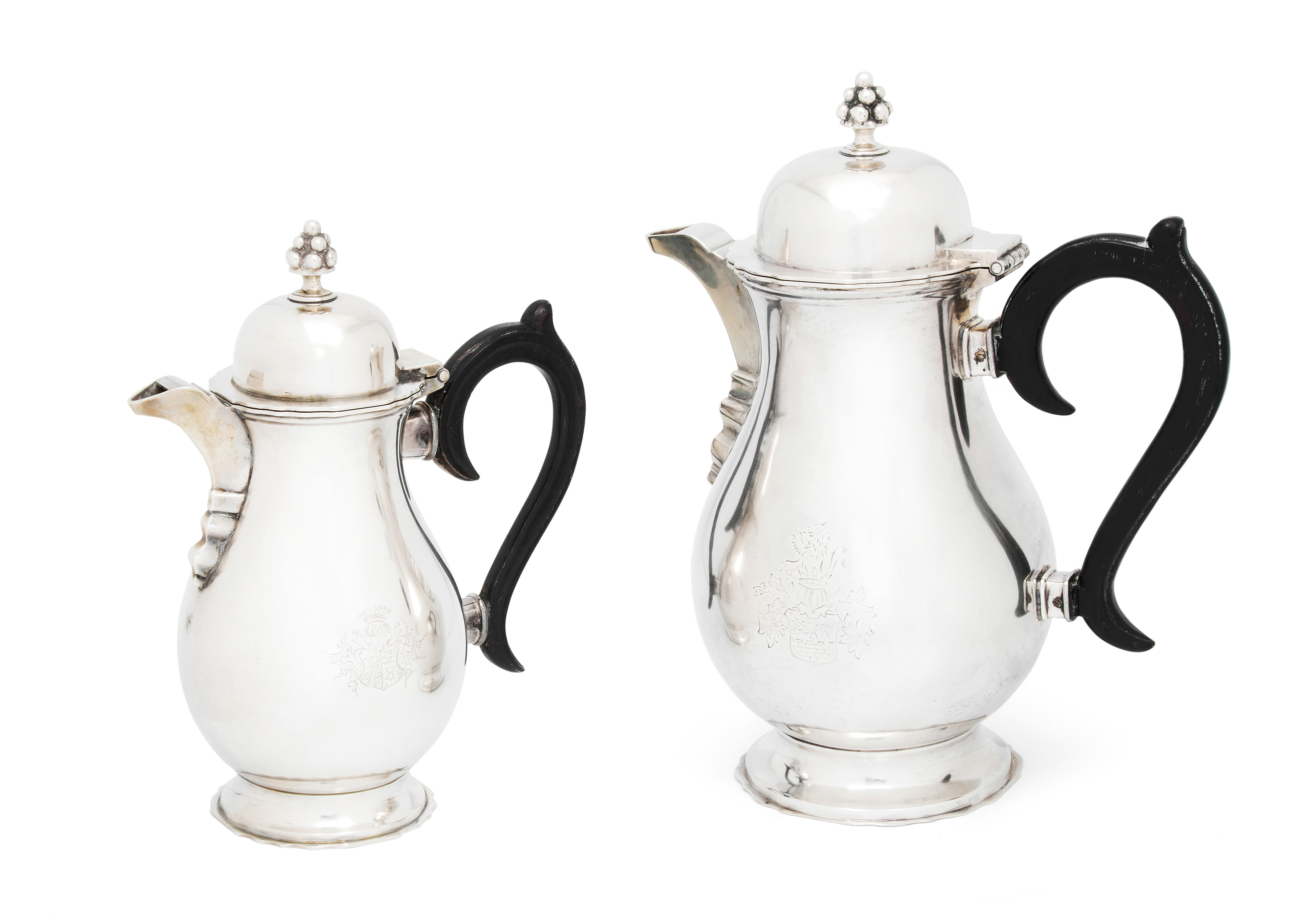 Otterndorf (Niedersachsen), 3. Drittel 18.Jh. Silber. Meistermarke Jonas Wiengreen (Scheffler 2057 und 2058). Runde, glatte Form über eingezogenem Fuss, gewölbter Deckel mit Knospenknauf, Schnabelausguss und S-Henkel aus Holz. Wandung mit graviertem Wappendekor. Stadt-, Meistermarke. H 21 und 25 cm, ca. 1290 g.