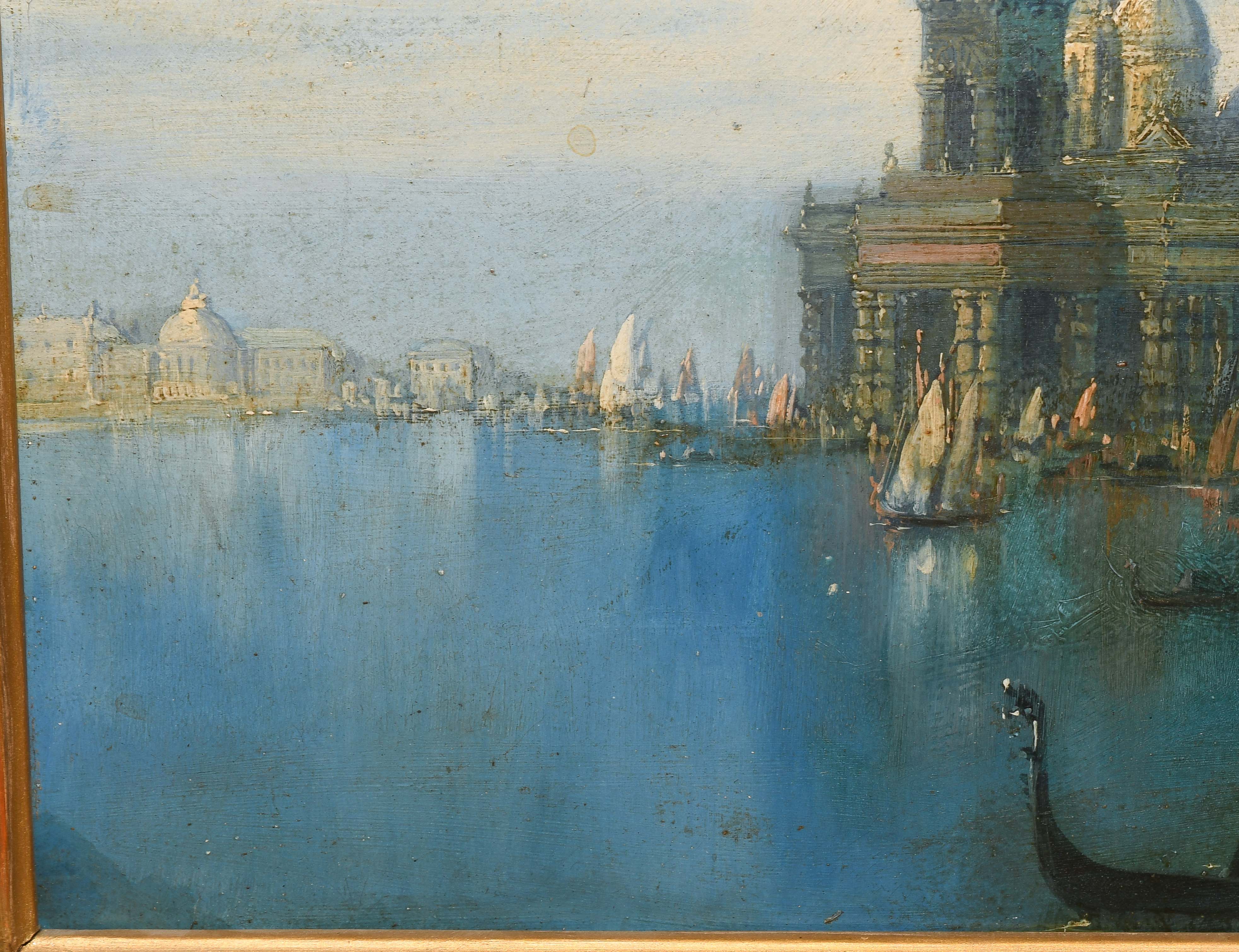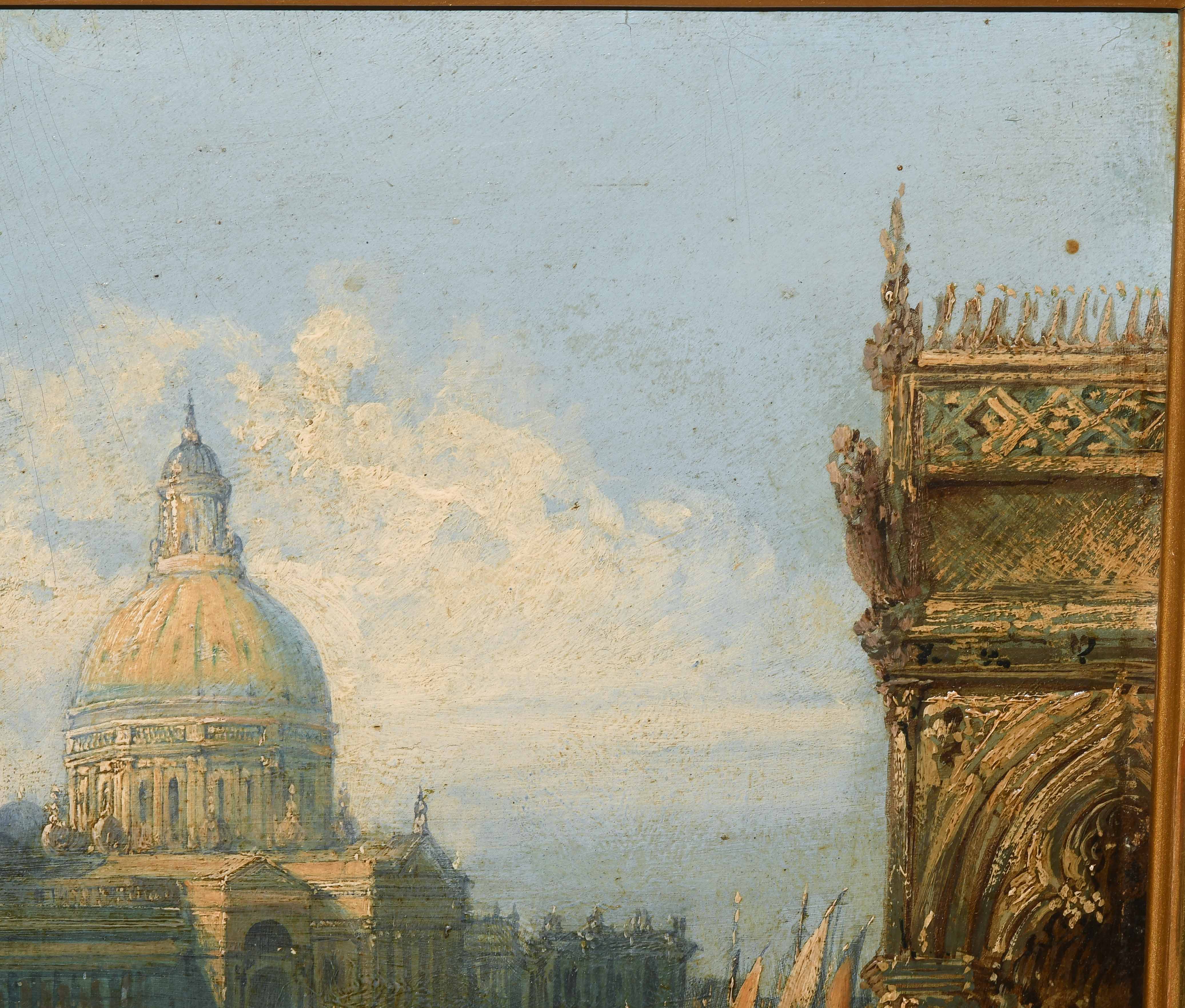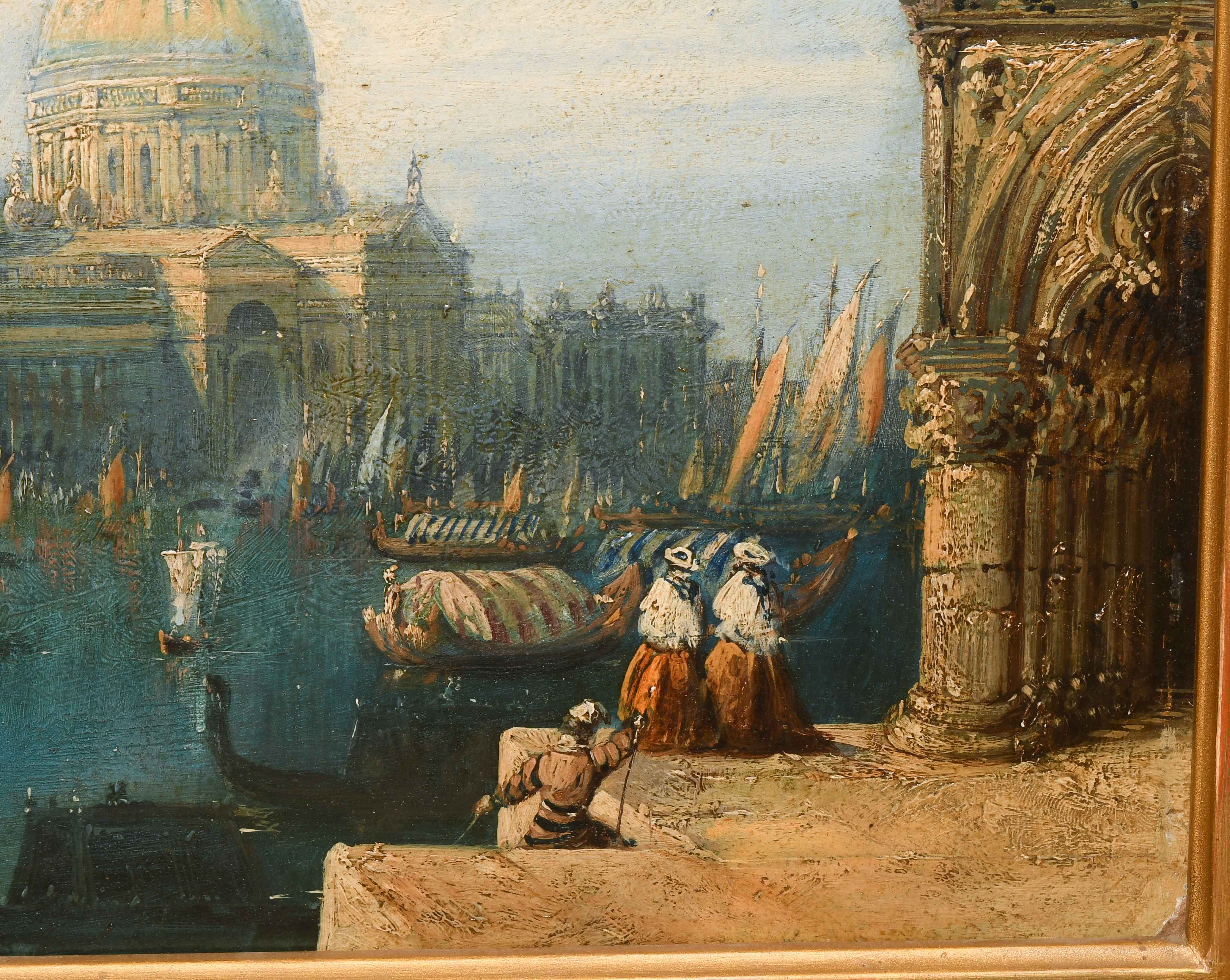 Die Ankunft der Gäste zum Maskenball, im Hintergrund Santa Maria della Salute. Öl auf Karton. 28,5x40,2 cm.