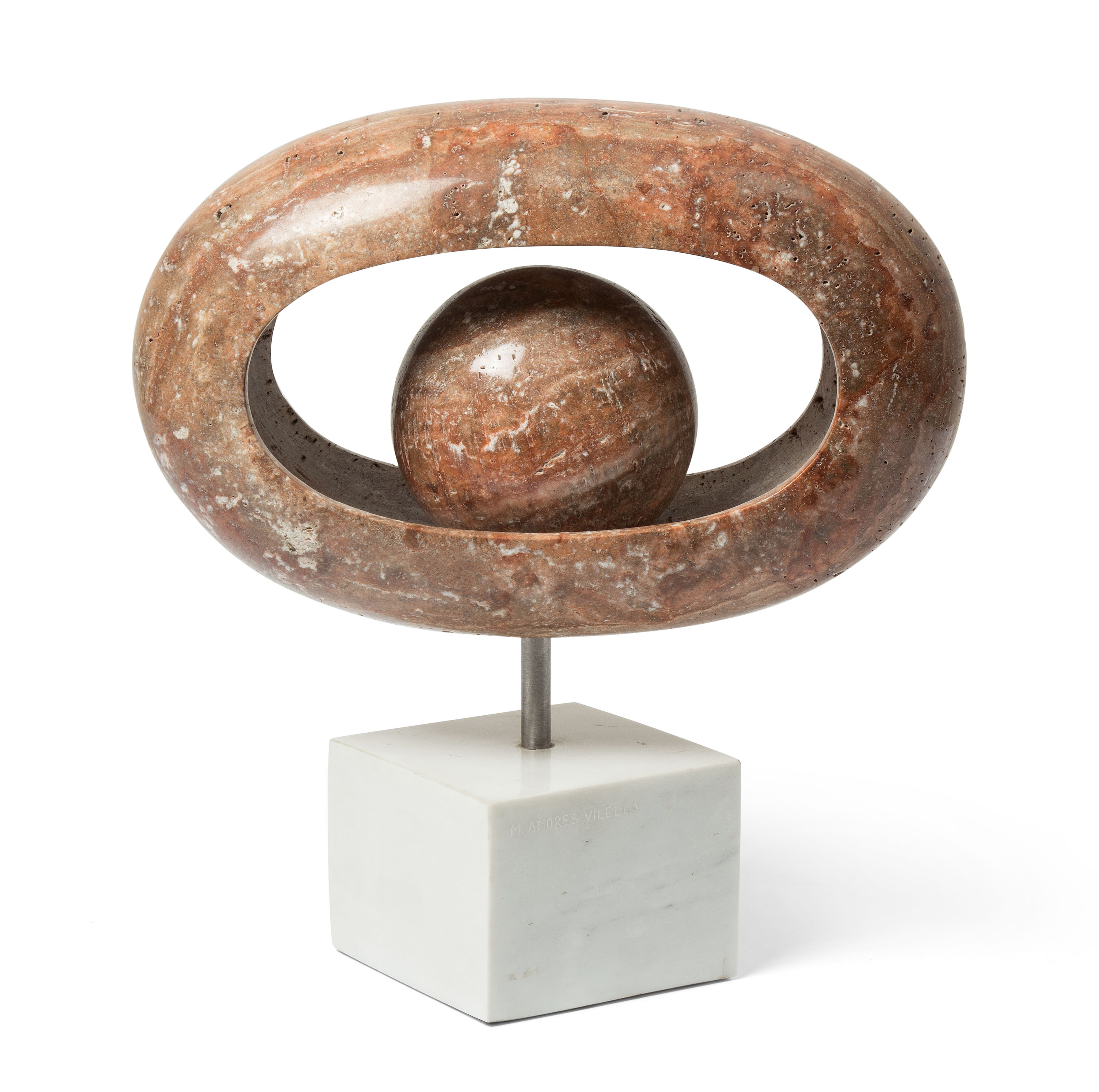 Ohne Titel. Marmor Travertin rot, Almeria. Auf dem weissen Marmorsockel signiert. H 24 auf Marmorsockel 40 cm. -Patina. Wenige Kratzer. Sockel mit leicht bestossener Ecke und Sprung.