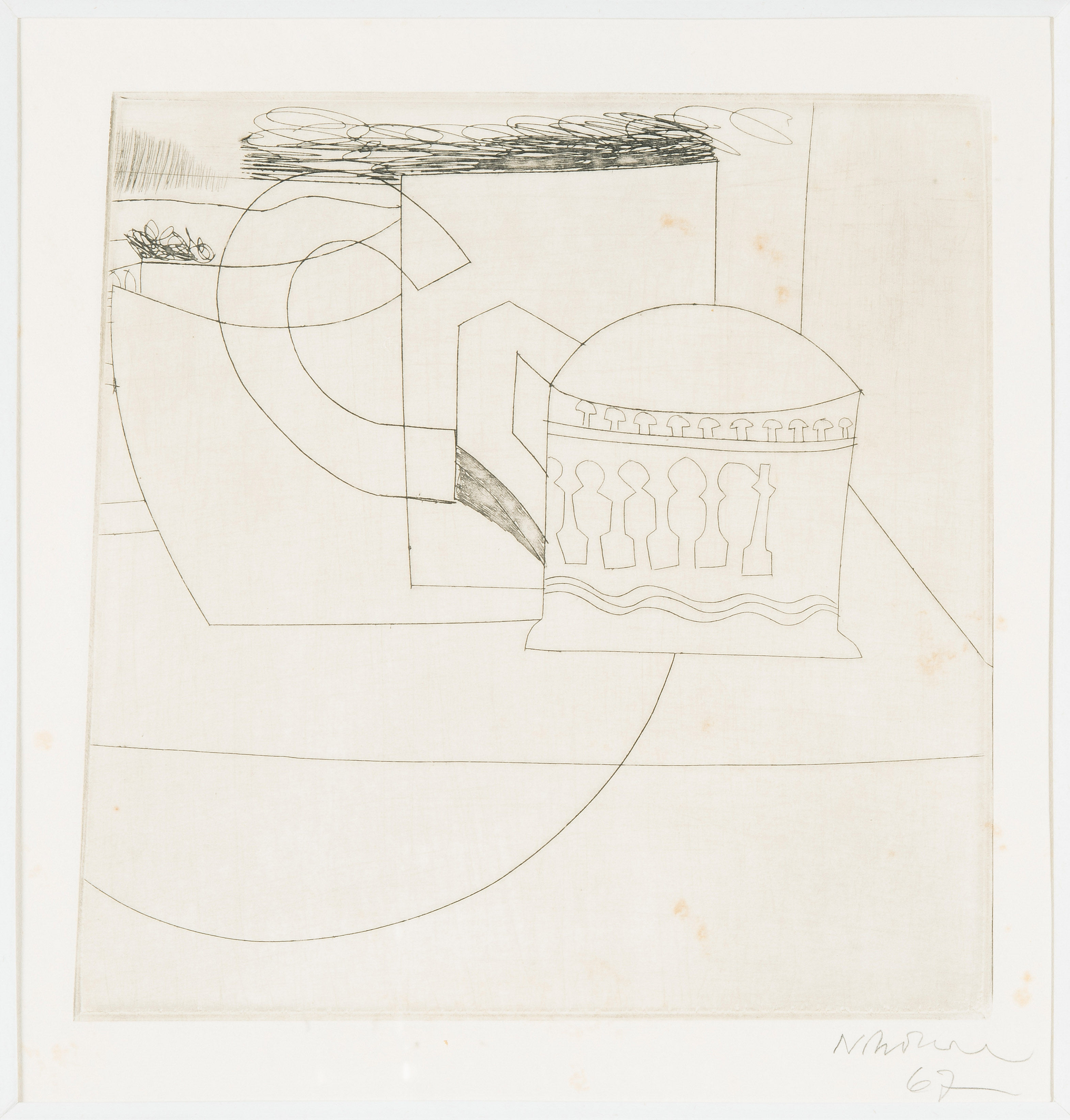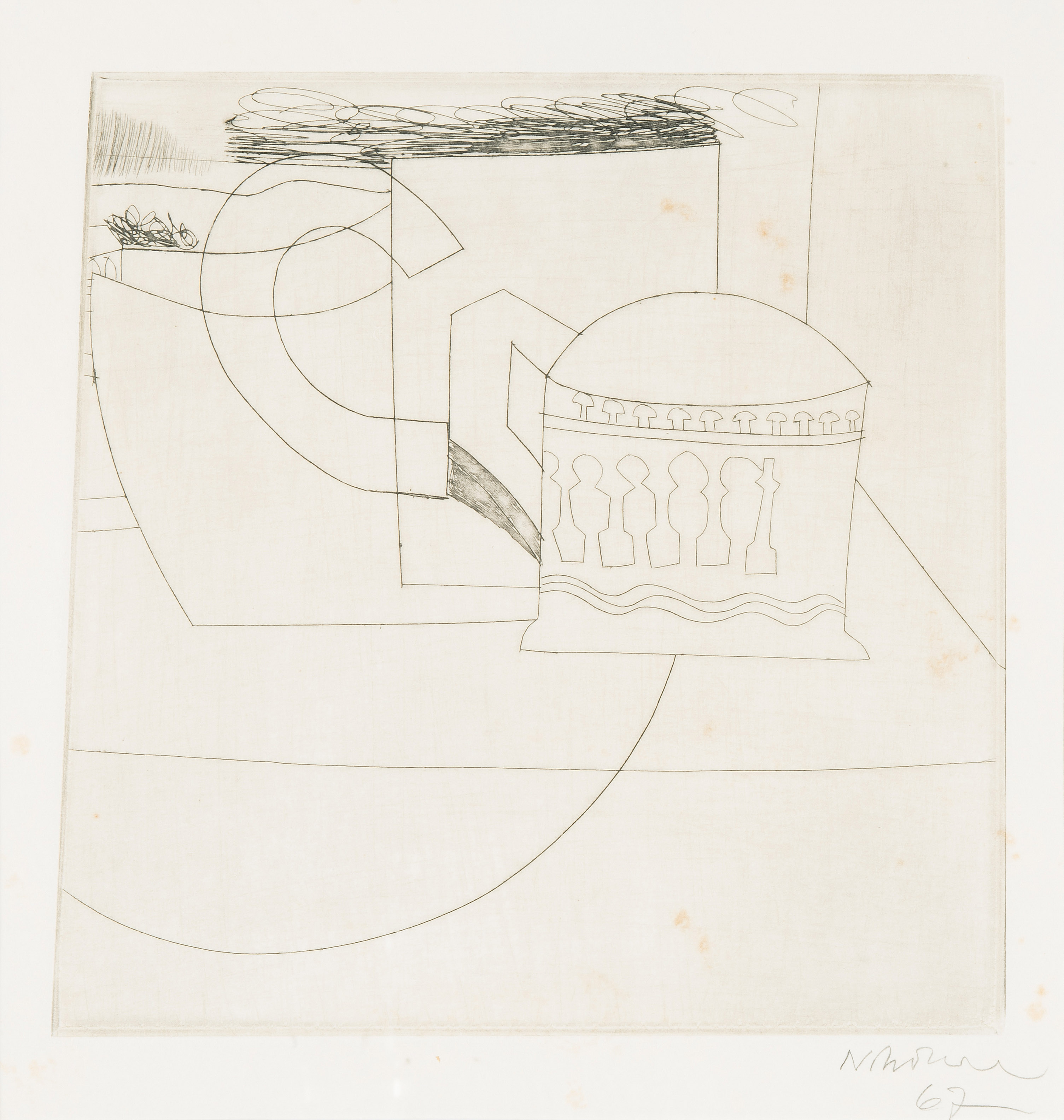 "Small Still Life". 1967. Radierung. 2/25. Unten rechts in Bleistift signiert und datiert. Verso betitelt. Plattengrösse 20,5x19,5-20,5 cm. Gerahmt. -Blatt braunfleckig und leicht gebräunt. Hellerer Lichtrand. Wenige Knitter. Verso am oberen Rand partiell an Passepartout montiert.