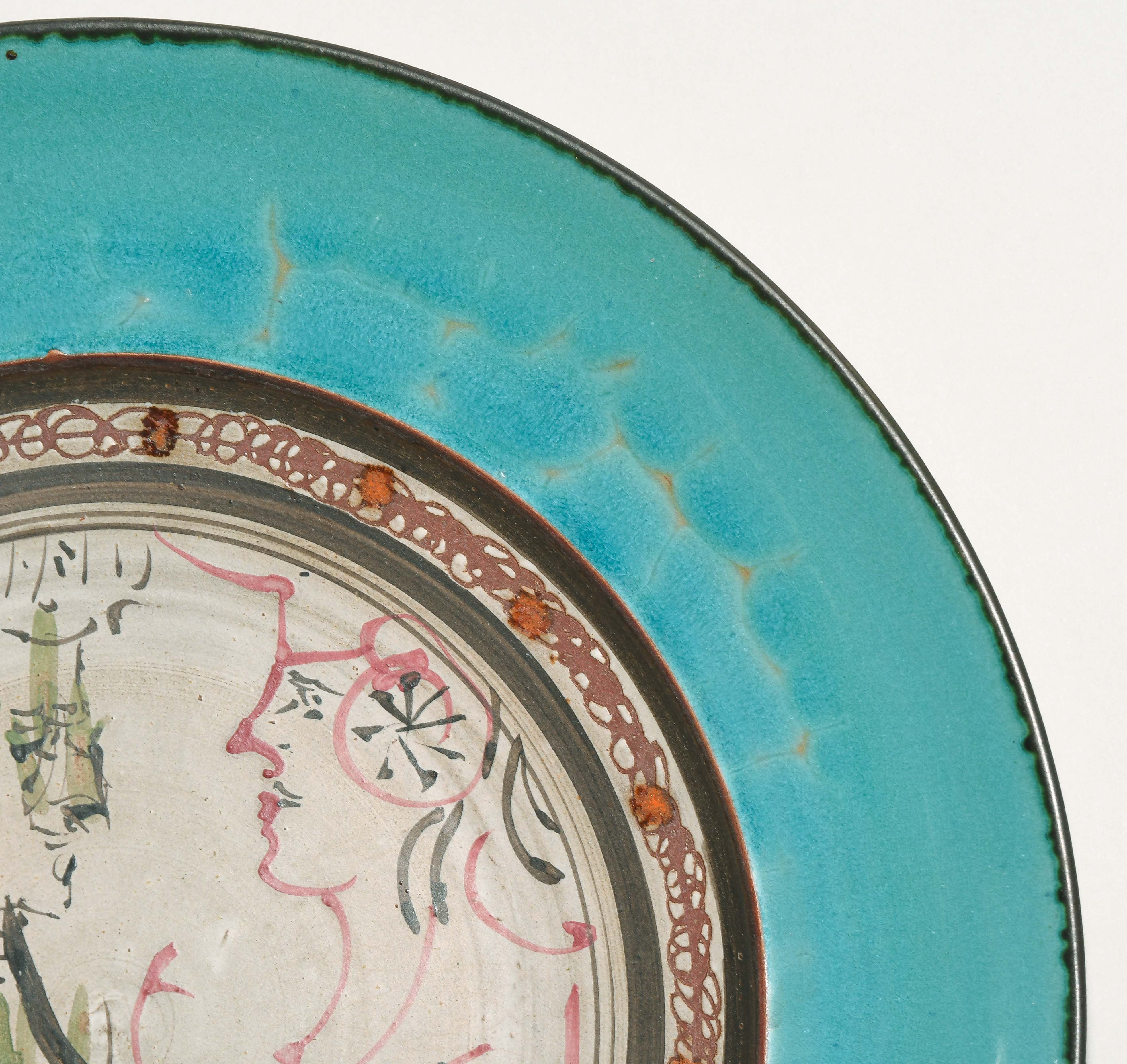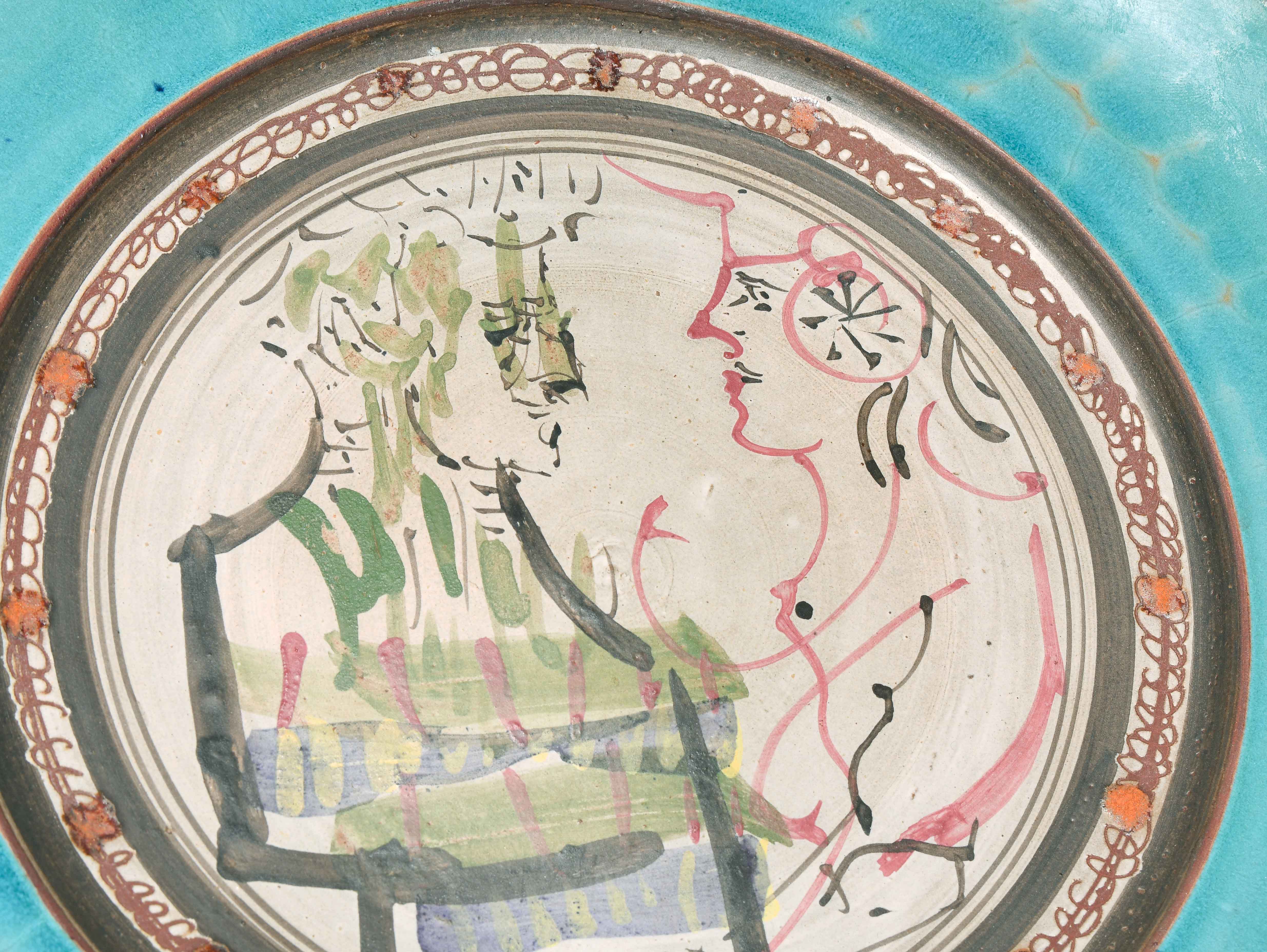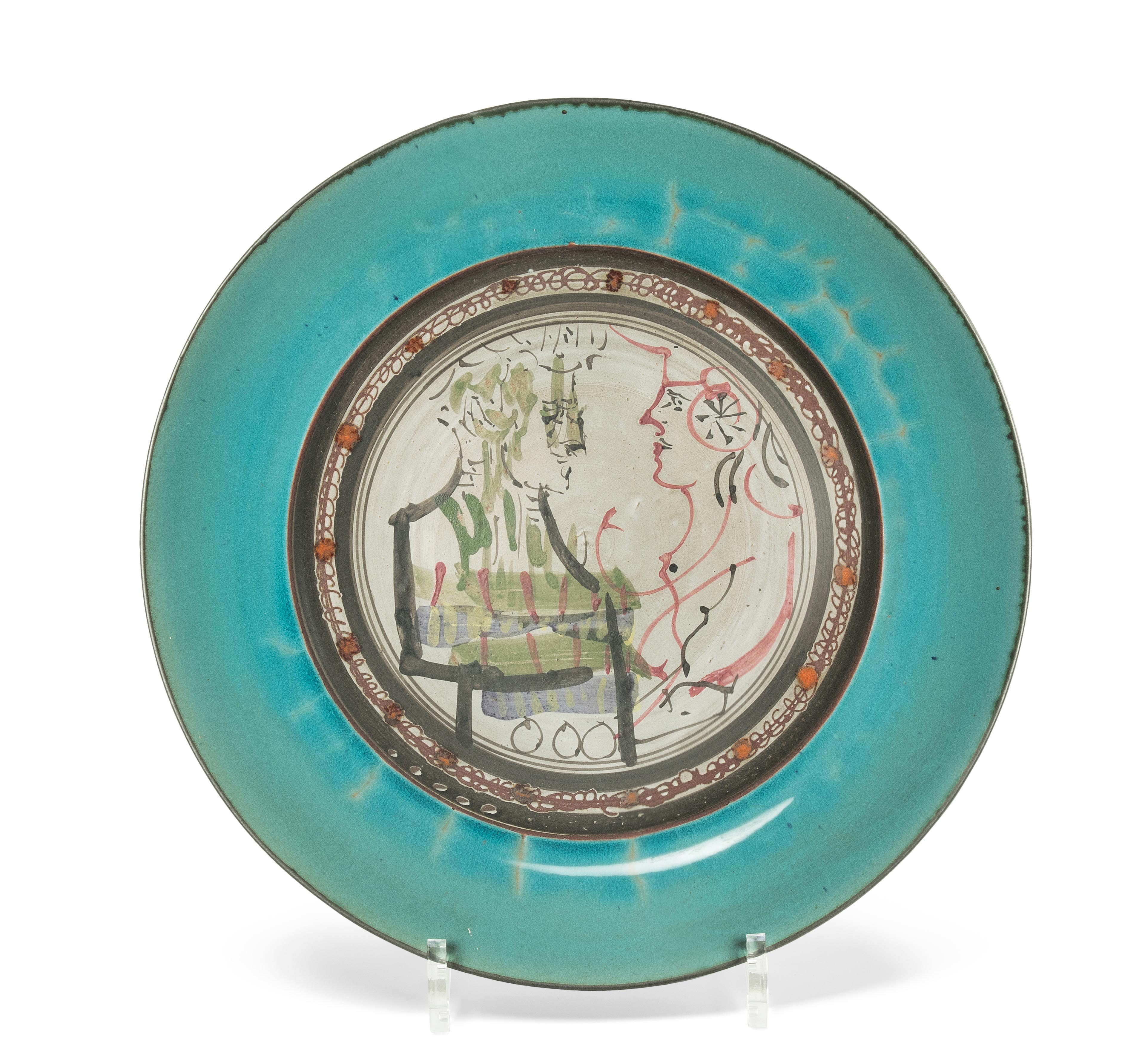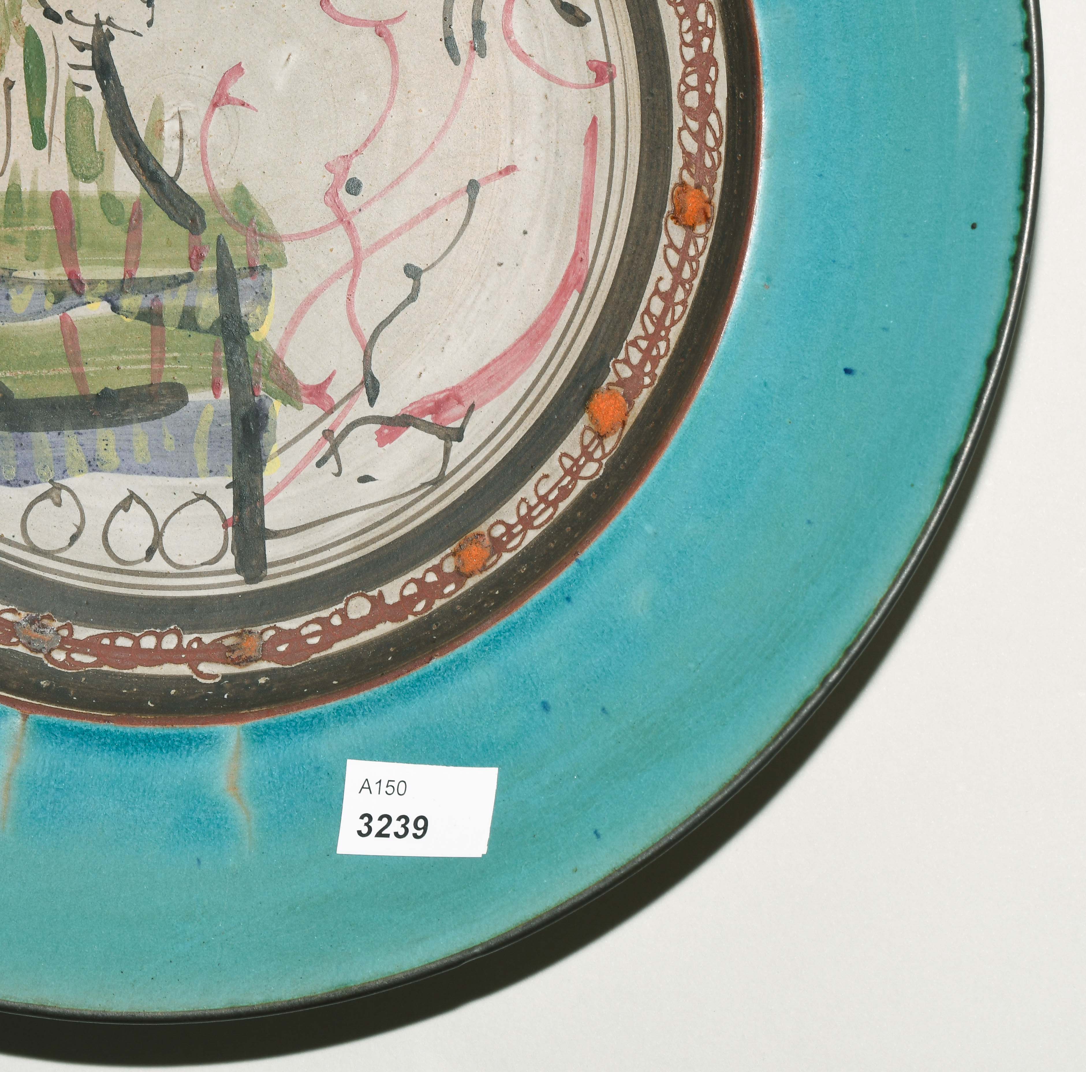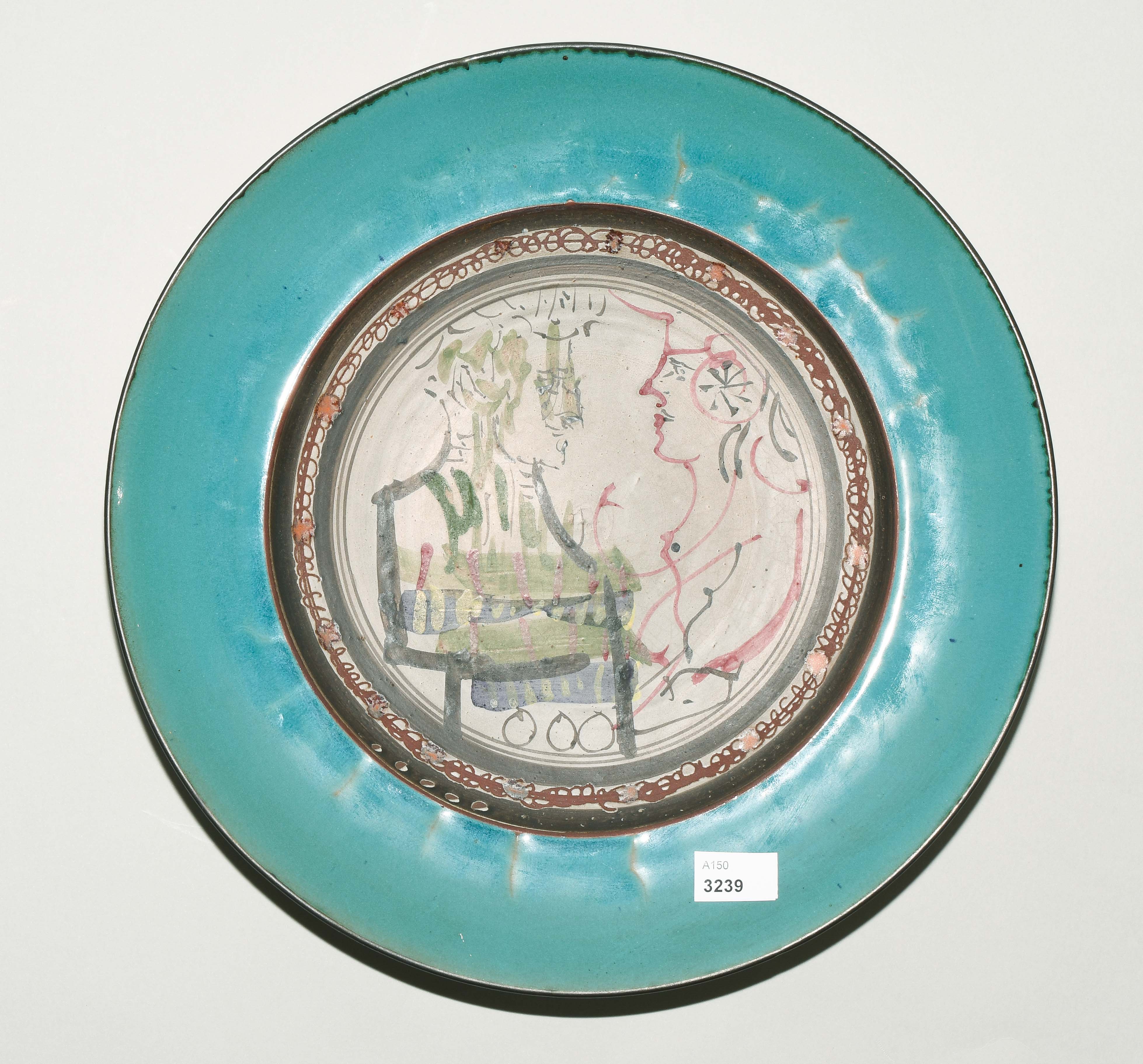 Frau vor einer Büste. Keramikteller, bemalt und glasiert. D 29 cm. -Minimst berieben.