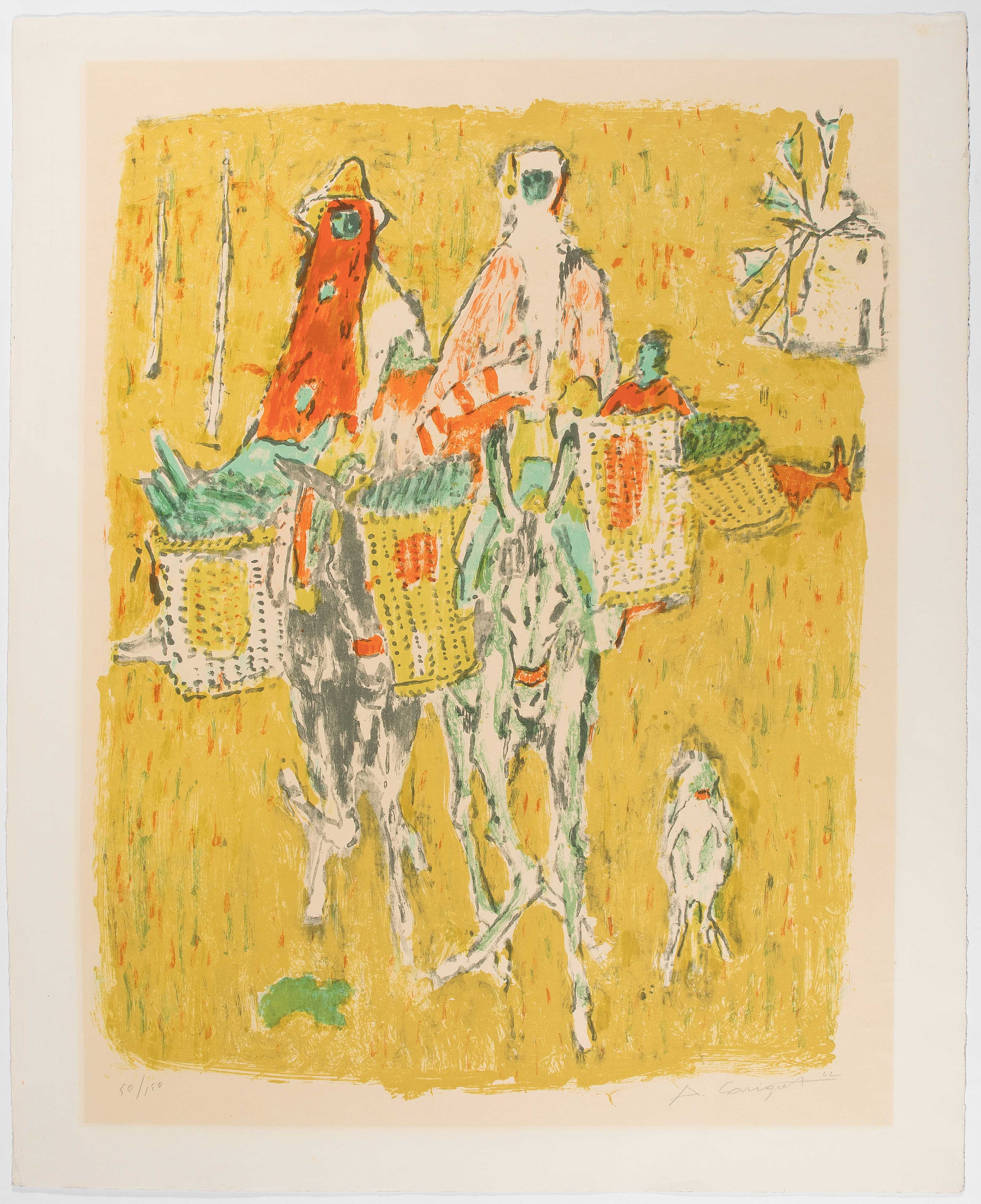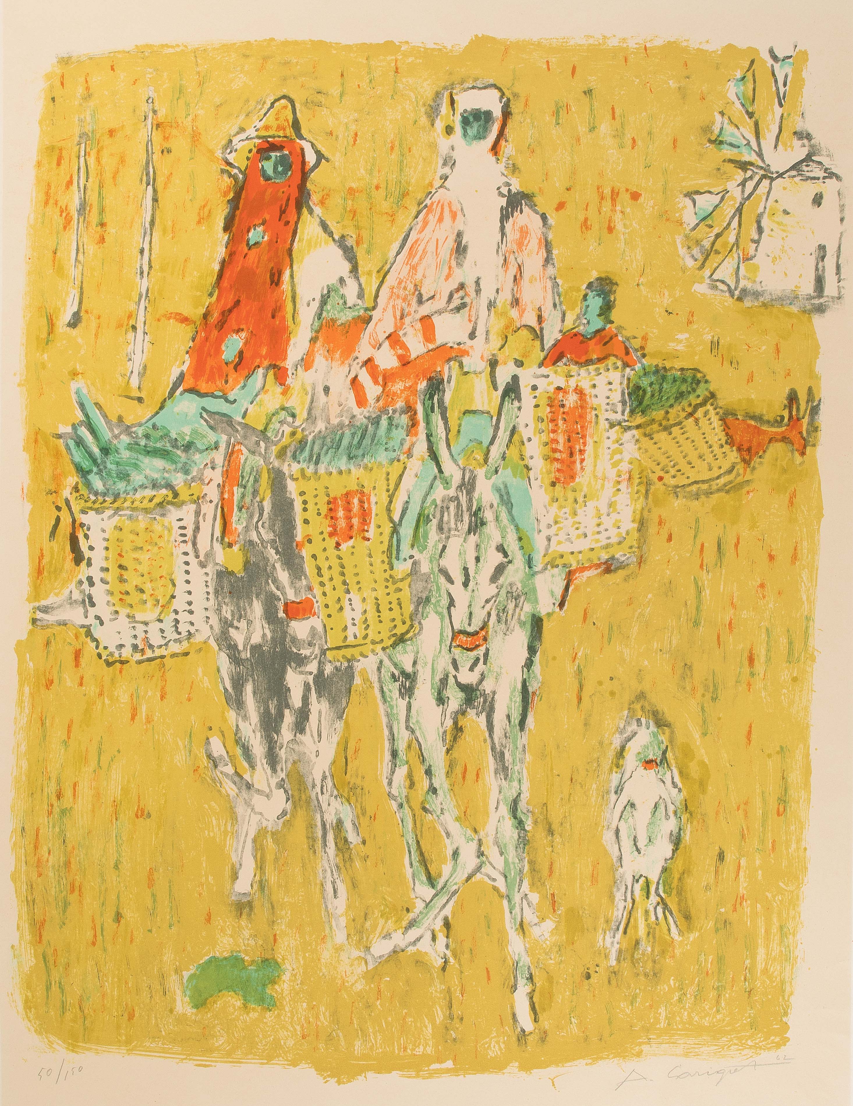 "Begegnung auf Kos". 1962. Farblithographie. 50/150. Unten rechts in Bleistift signiert und datiert. Blattgrösse 76x64 cm. -Blatt gebräunt. Heller Lichtrand. Wenige Knitter. Ränder und Ecken minimst bestossen.